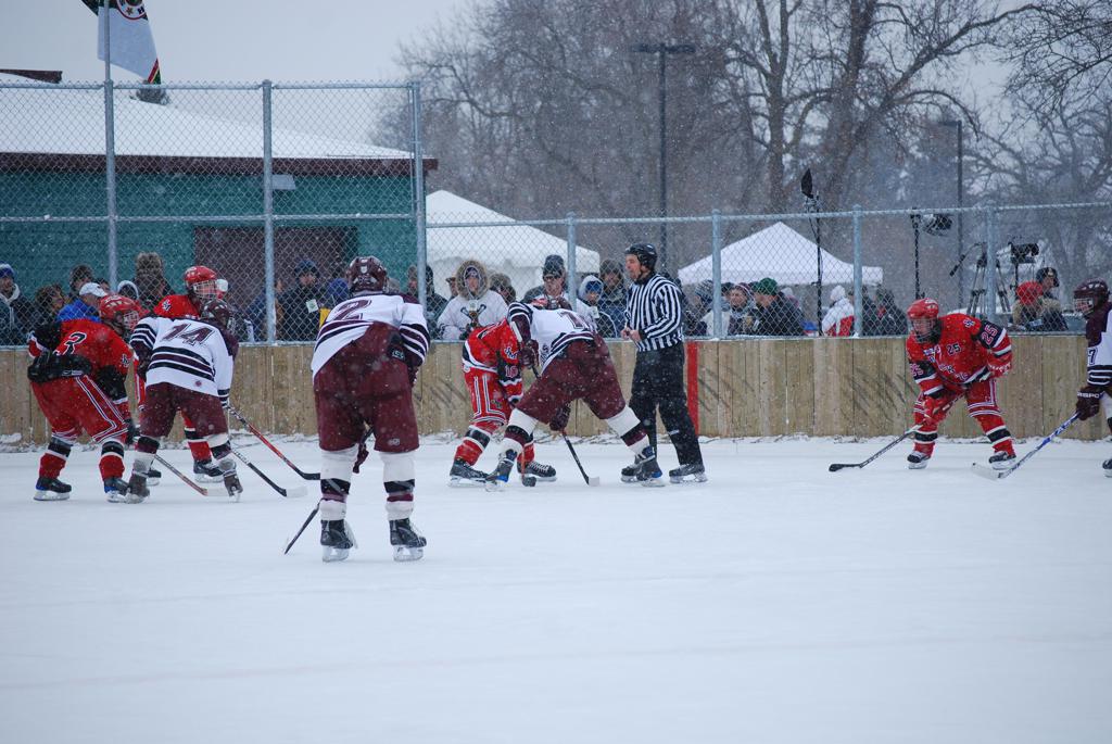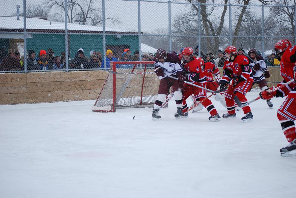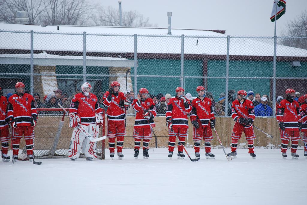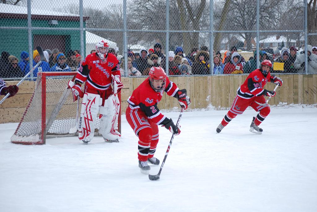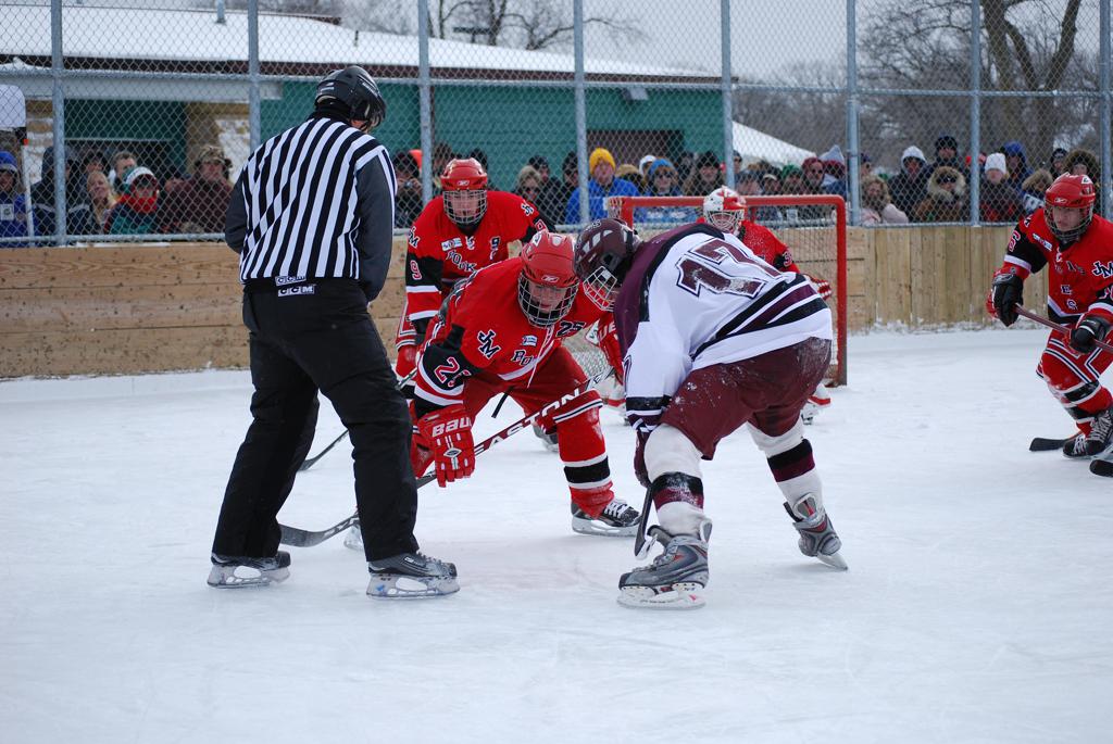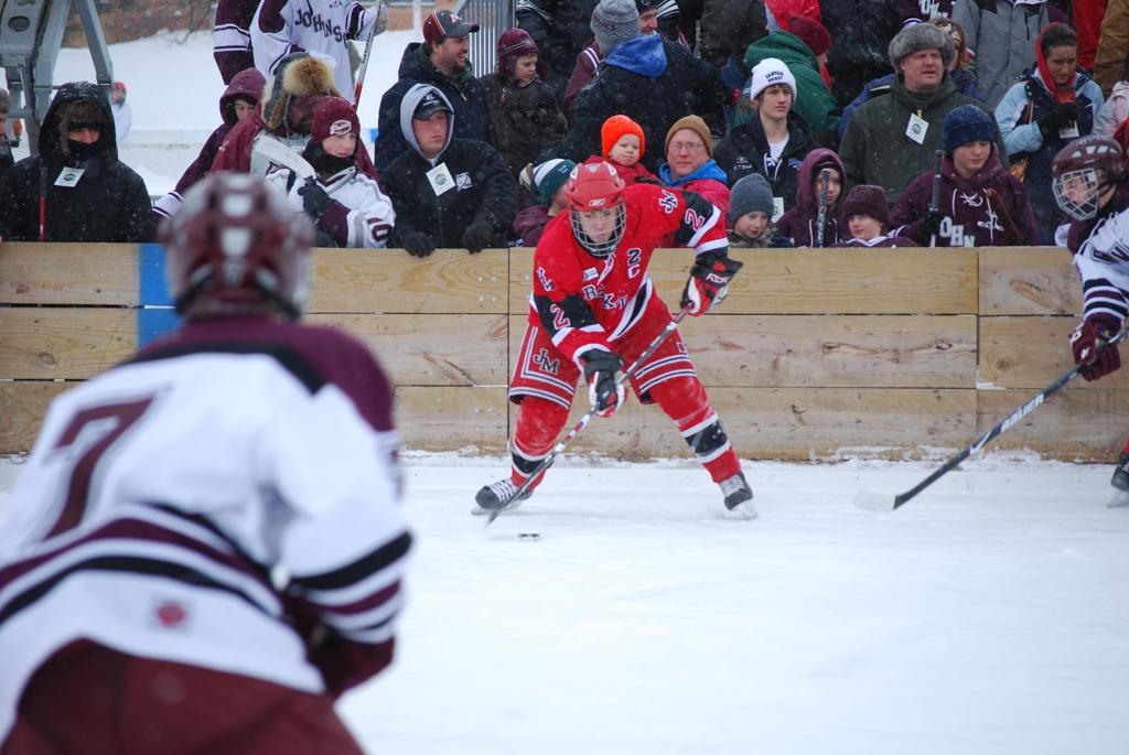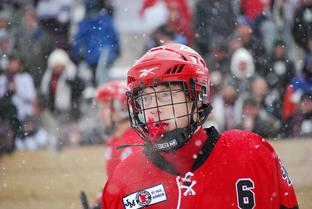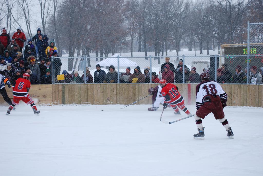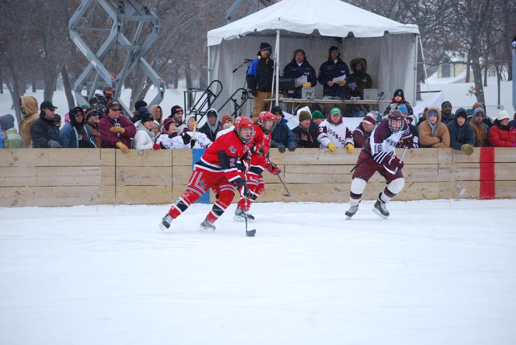 After northern Minnesota Baudette Bay was host to first x2 HDM, this was the perfect location for the Twin Cities first ever Hockey Day Minnesota, hosted at the beautiful outdoor refrigerated ice sheet within historic Phalen Park - where a young Herb Brooks learned to play hockey in eastside St. Paul. The beautiful warming house alongside the chain linked fence rink on the net ends added to the vintage nature of outdoor hockey, prior to the fully enclosed glass rinks now seen yearly at HDM. With light snow that fell during the games, and fans packing into the 'arena' for the marquee game featuring home-town St. Paul Johnson Governors vs. southern Minnesota Rochester John Marshall Rockets - it made for some amazing photos in stunning red (Rockets) and white/maroon (Governors) uniforms.