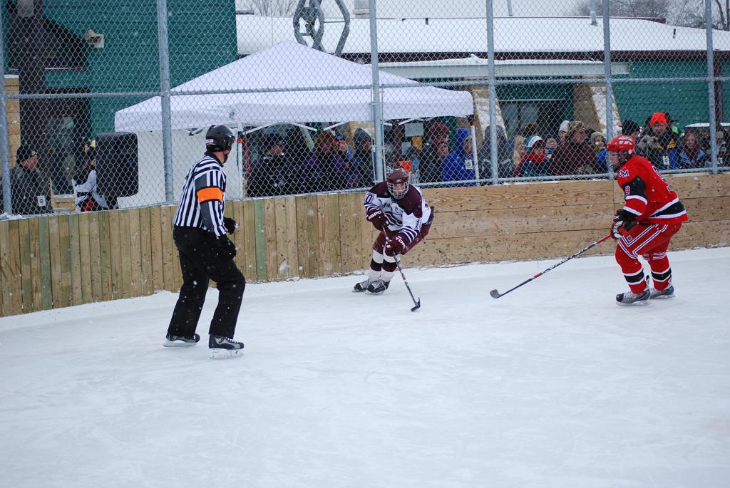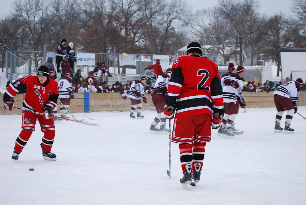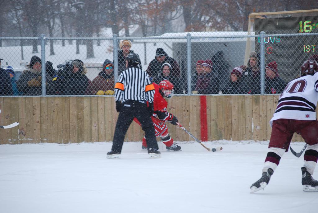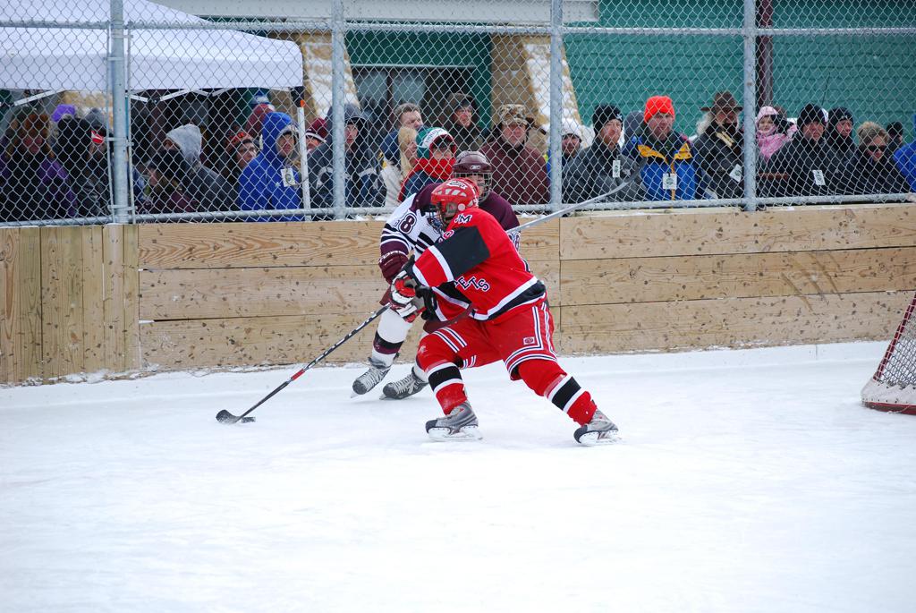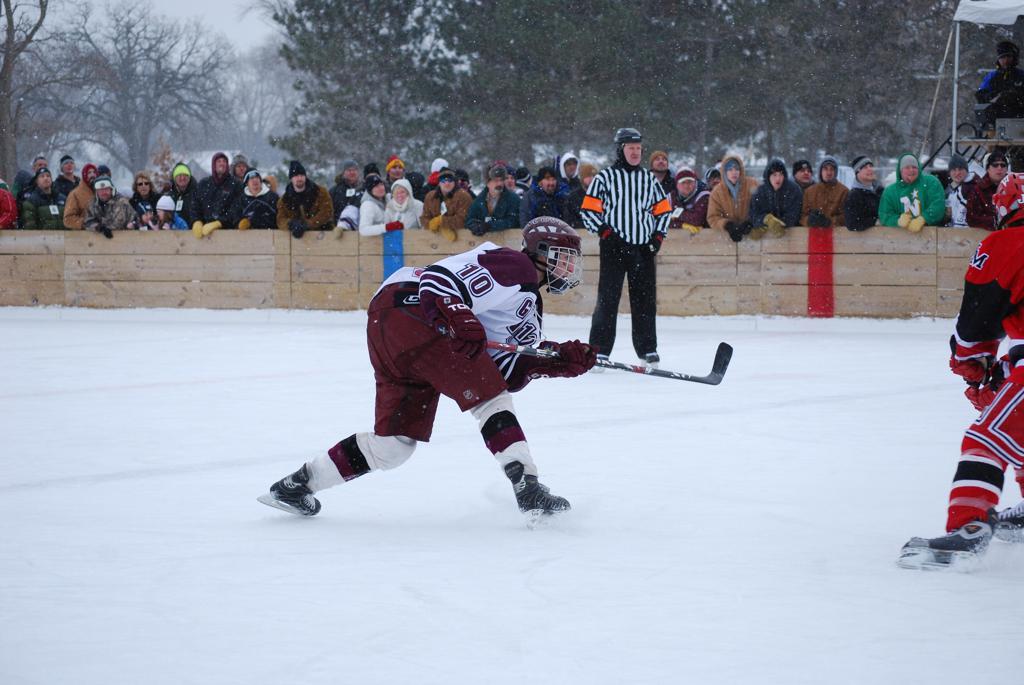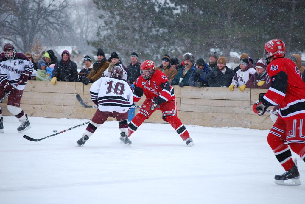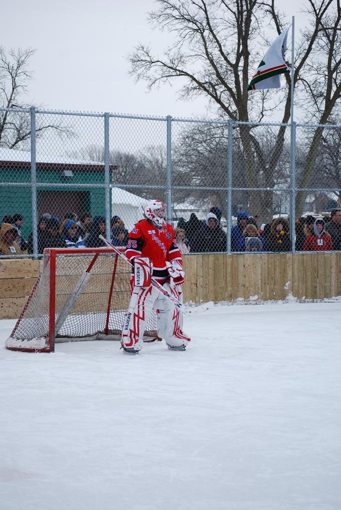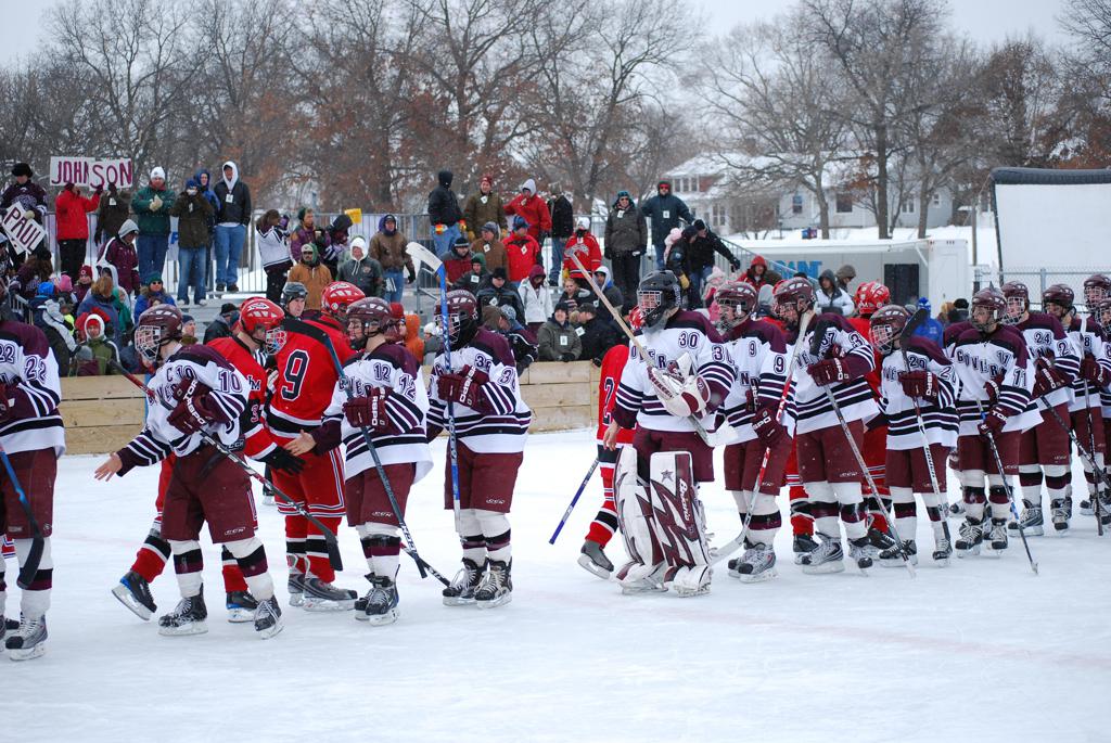 After northern Minnesota Baudette Bay was host to first x2 HDM, this was the perfect location for the Twin Cities first ever Hockey Day Minnesota, hosted at the beautiful outdoor refrigerated ice sheet within historic Phalen Park - where a young Herb Brooks learned to play hockey in eastside St. Paul. The beautiful warming house alongside the chain linked fence rink on the net ends added to the vintage nature of outdoor hockey, prior to the fully enclosed glass rinks now seen yearly at HDM. With light snow that fell during the games, and fans packing into the 'arena' for the marquee game featuring home-town St. Paul Johnson Governors vs. southern Minnesota Rochester John Marshall Rockets - it made for some amazing photos in stunning red (Rockets) and white/maroon (Governors) uniforms.