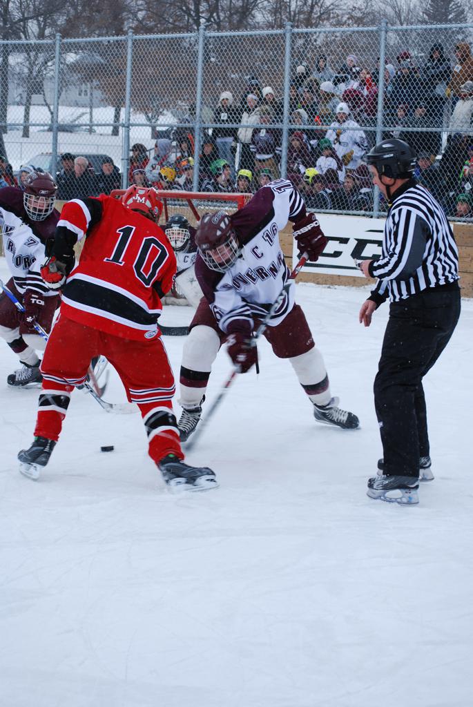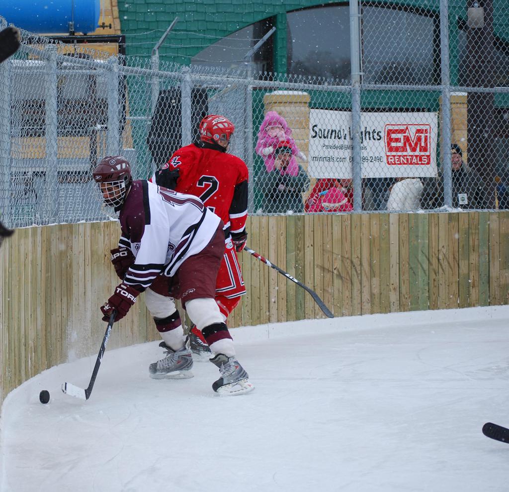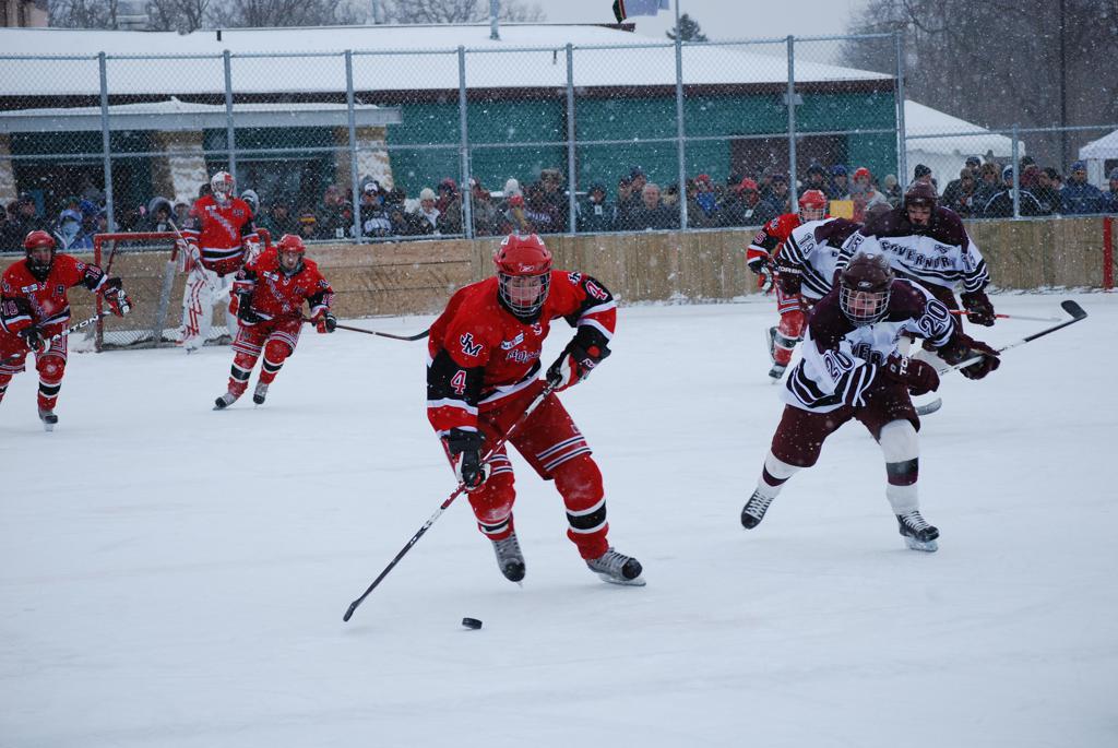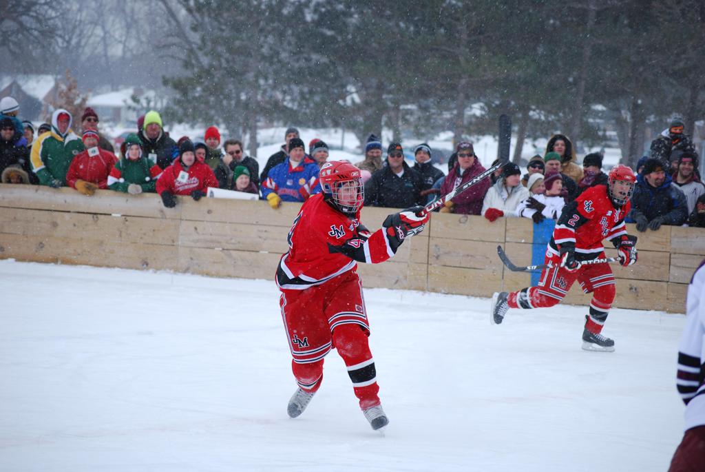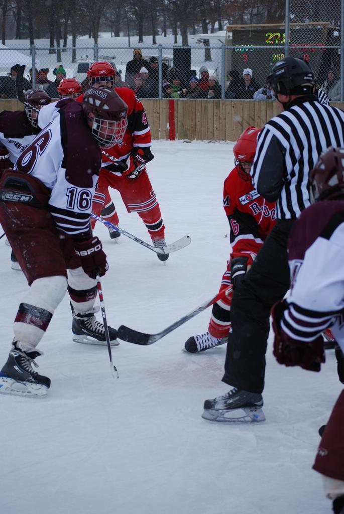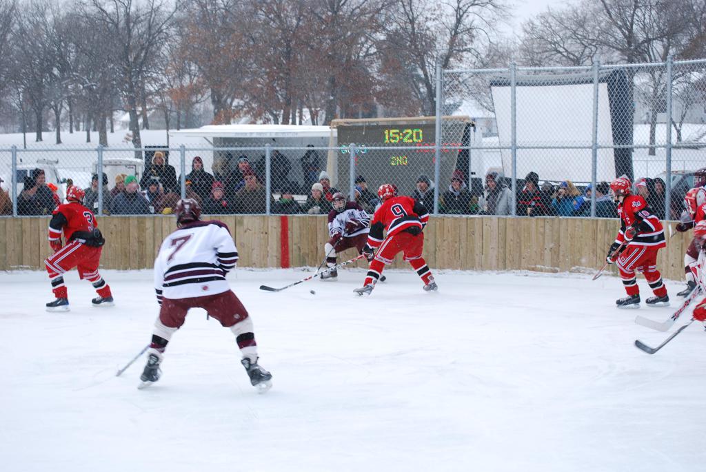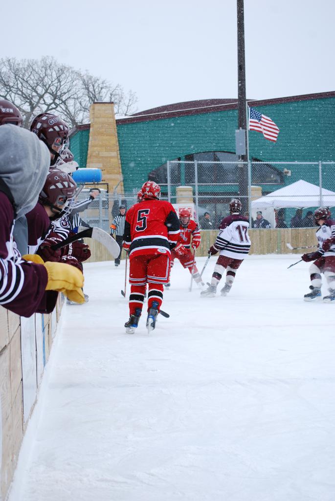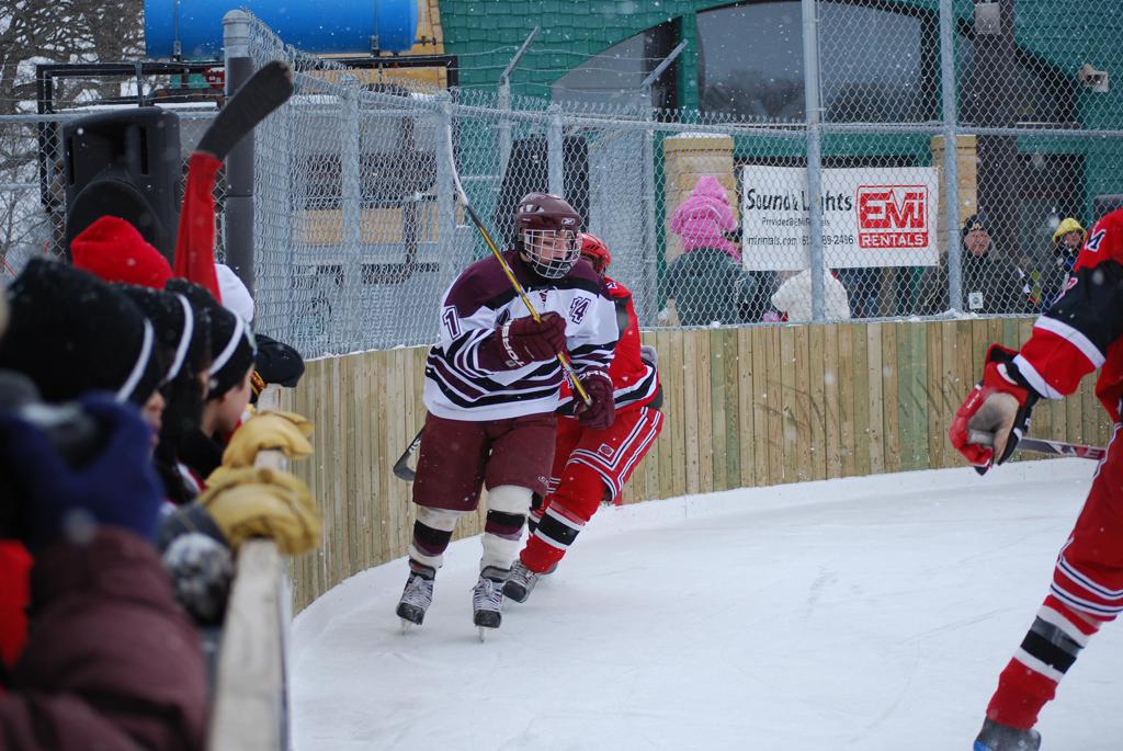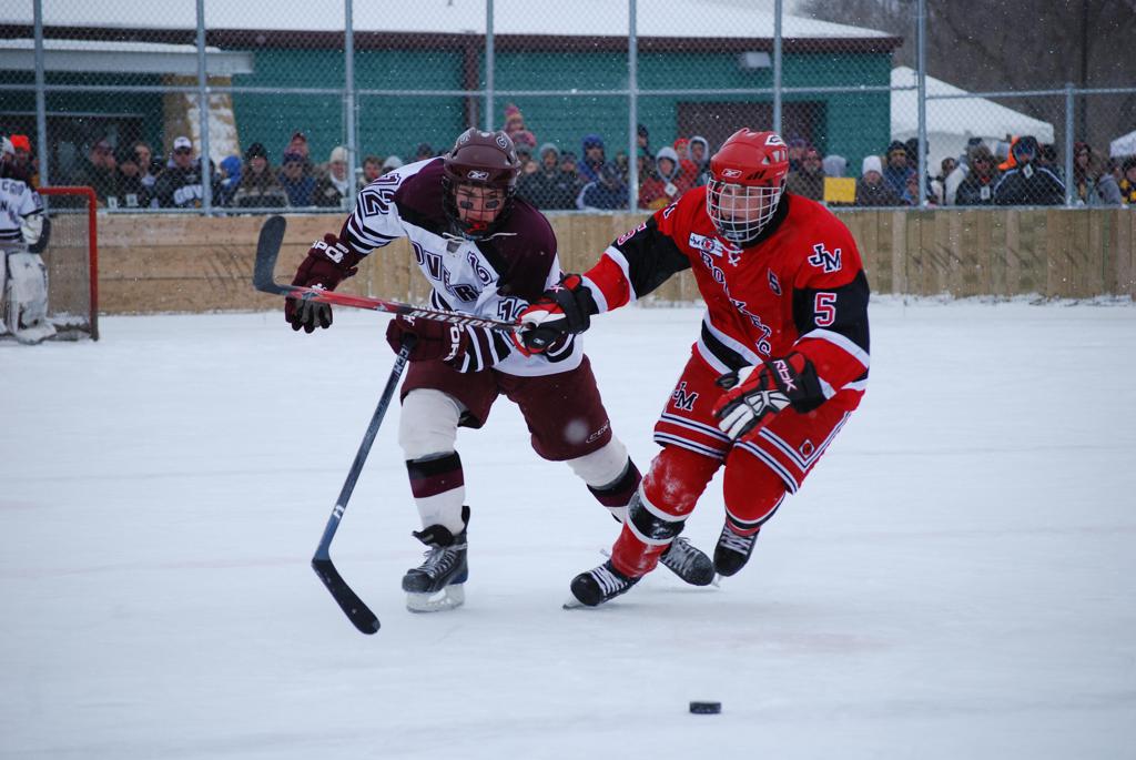 After northern Minnesota Baudette Bay was host to first x2 HDM, this was the perfect location for the Twin Cities first ever Hockey Day Minnesota, hosted at the beautiful outdoor refrigerated ice sheet within historic Phalen Park - where a young Herb Brooks learned to play hockey in eastside St. Paul. The beautiful warming house alongside the chain linked fence rink on the net ends added to the vintage nature of outdoor hockey, prior to the fully enclosed glass rinks now seen yearly at HDM. With light snow that fell during the games, and fans packing into the 'arena' for the marquee game featuring home-town St. Paul Johnson Governors vs. southern Minnesota Rochester John Marshall Rockets - it made for some amazing photos in stunning red (Rockets) and white/maroon (Governors) uniforms.
