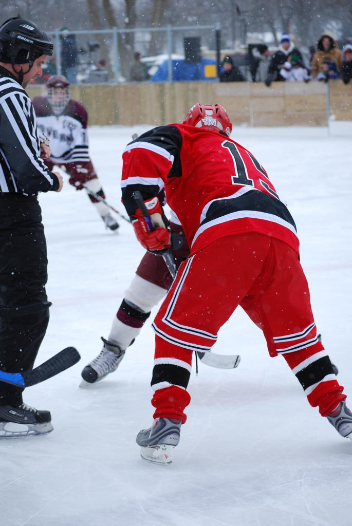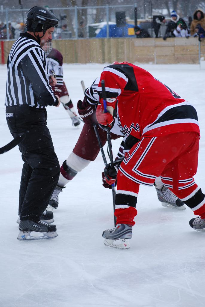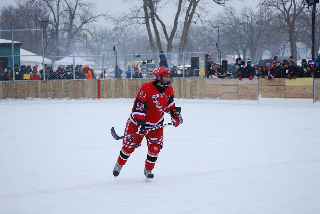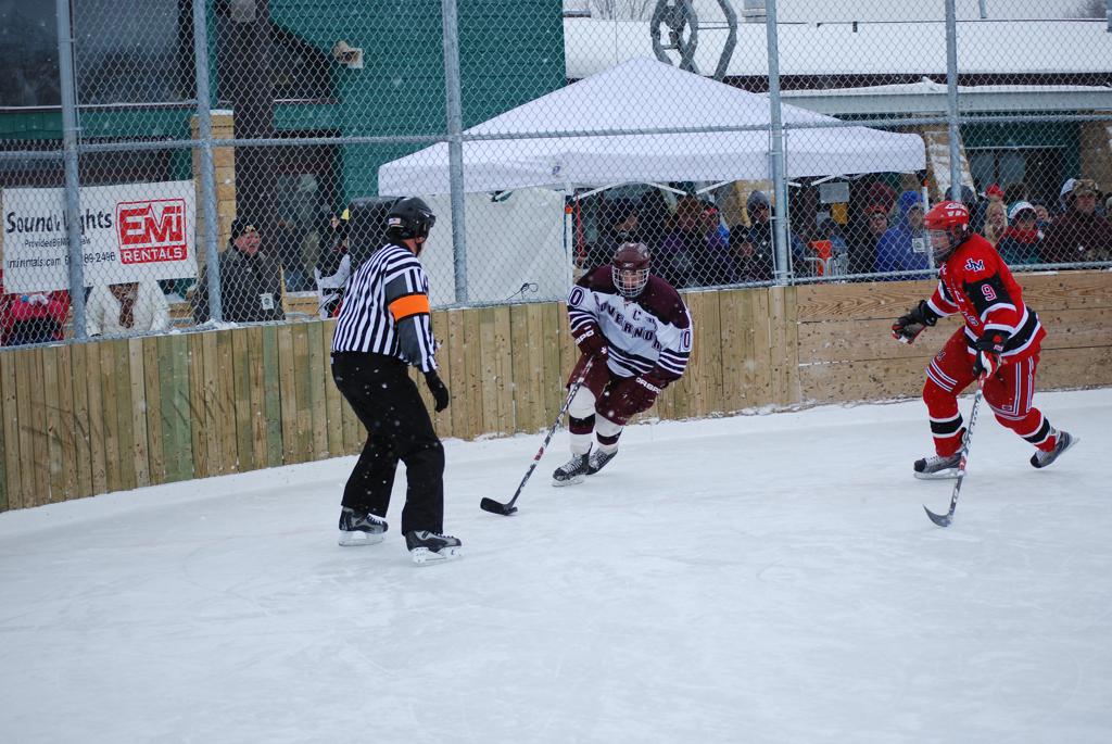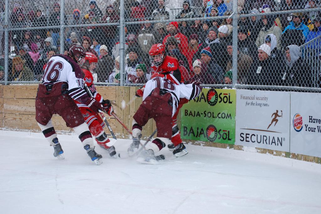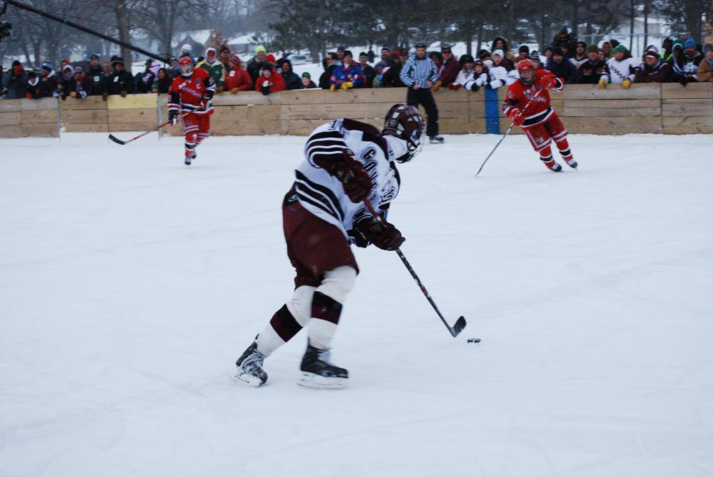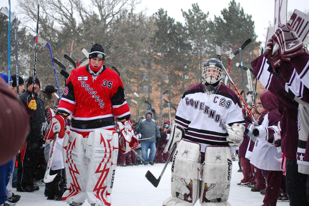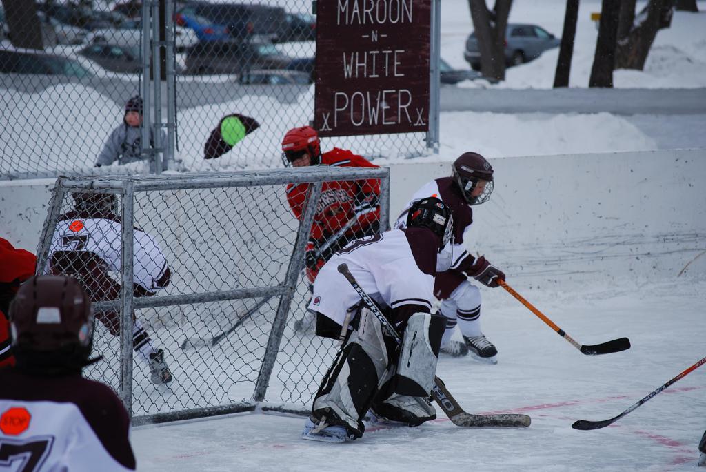 After northern Minnesota Baudette Bay was host to first x2 HDM, this was the perfect location for the Twin Cities first ever Hockey Day Minnesota, hosted at the beautiful outdoor refrigerated ice sheet within historic Phalen Park - where a young Herb Brooks learned to play hockey in eastside St. Paul. The beautiful warming house alongside the chain linked fence rink on the net ends added to the vintage nature of outdoor hockey, prior to the fully enclosed glass rinks now seen yearly at HDM. With light snow that fell during the games, and fans packing into the 'arena' for the marquee game featuring home-town St. Paul Johnson Governors vs. southern Minnesota Rochester John Marshall Rockets - it made for some amazing photos in stunning red (Rockets) and white/maroon (Governors) uniforms.