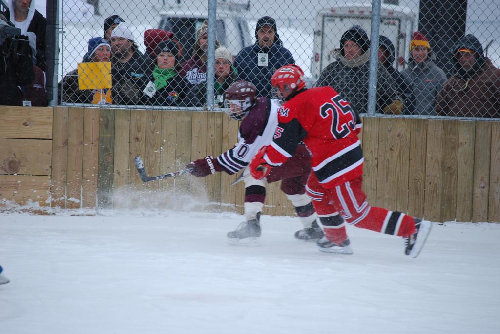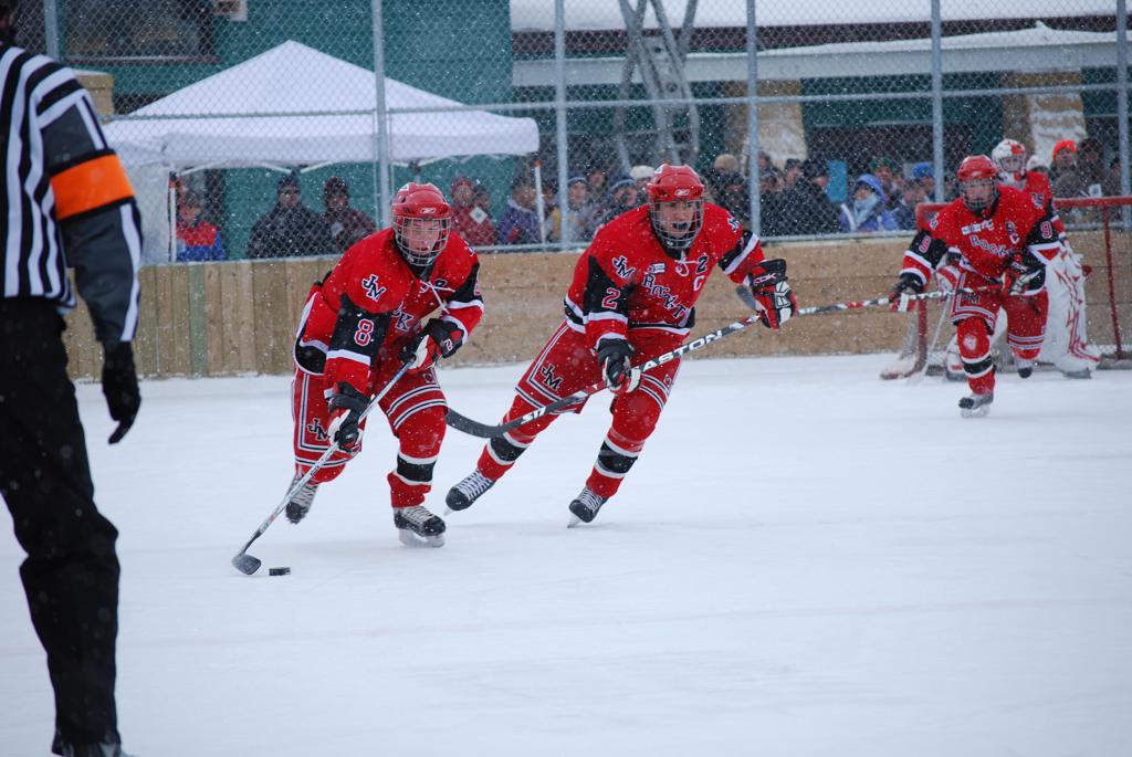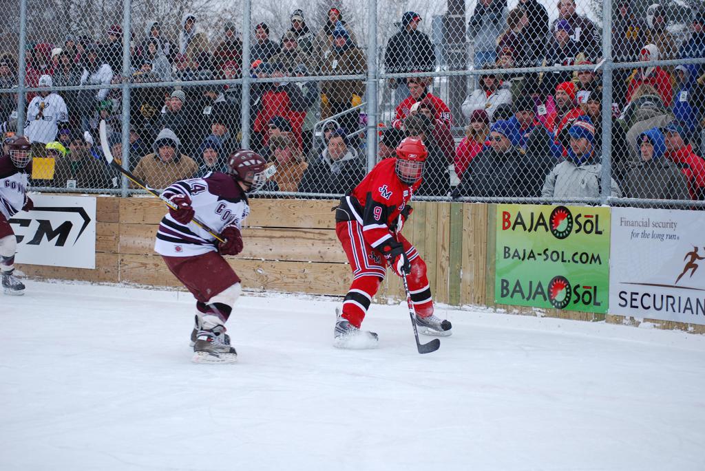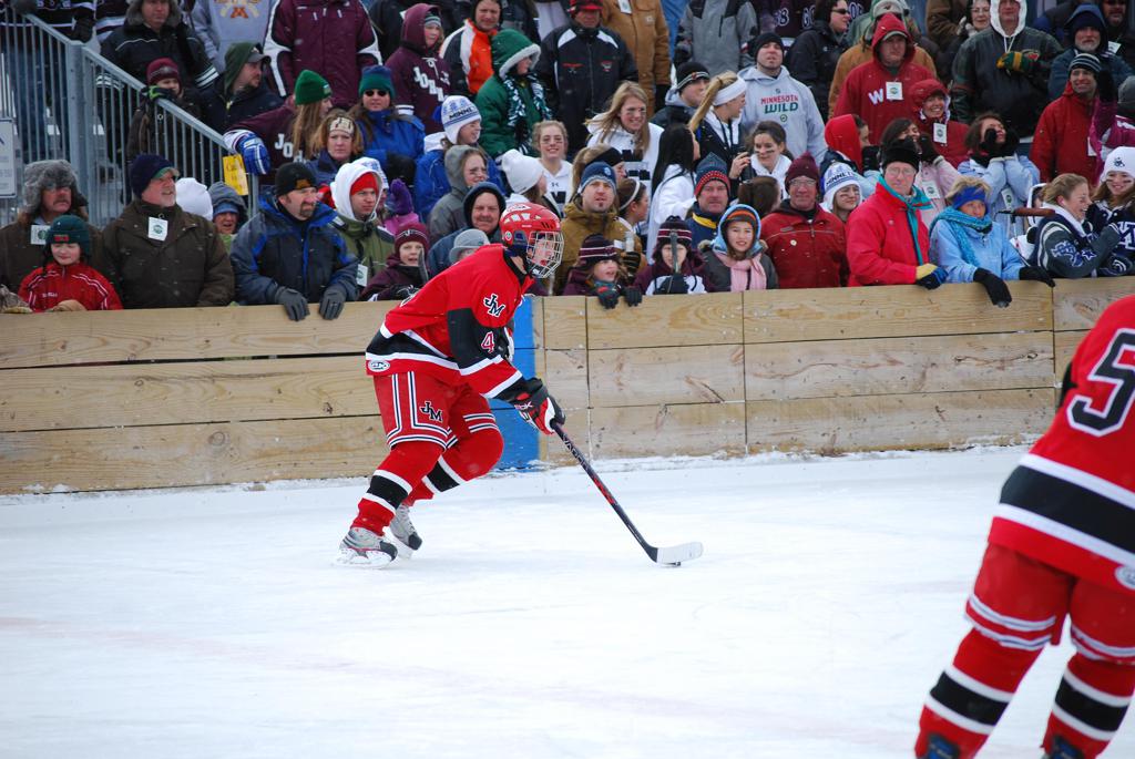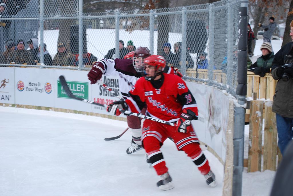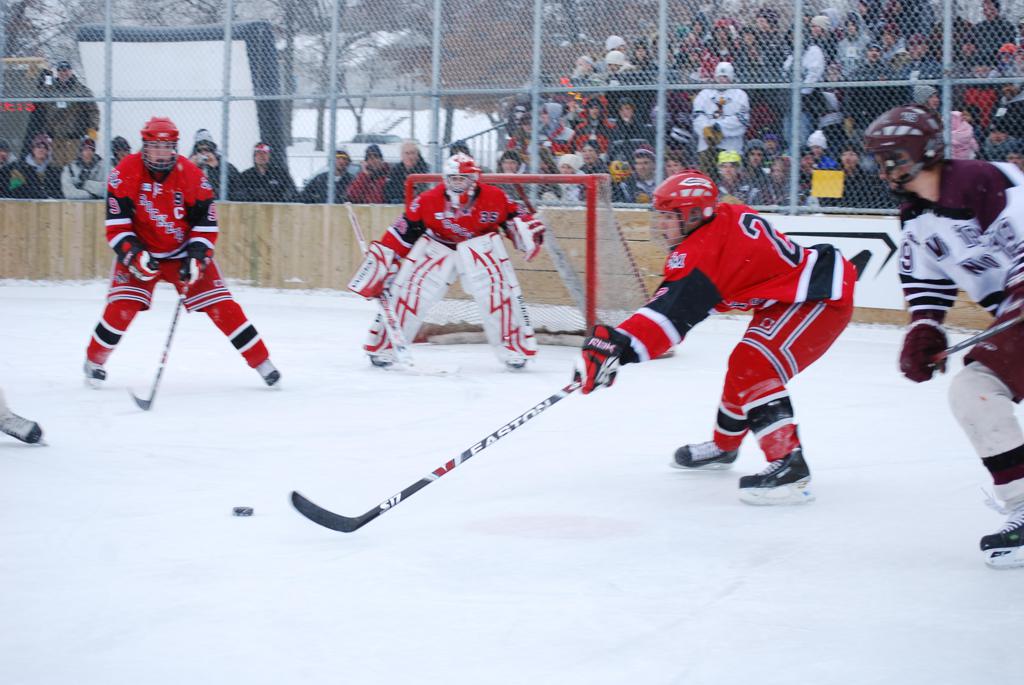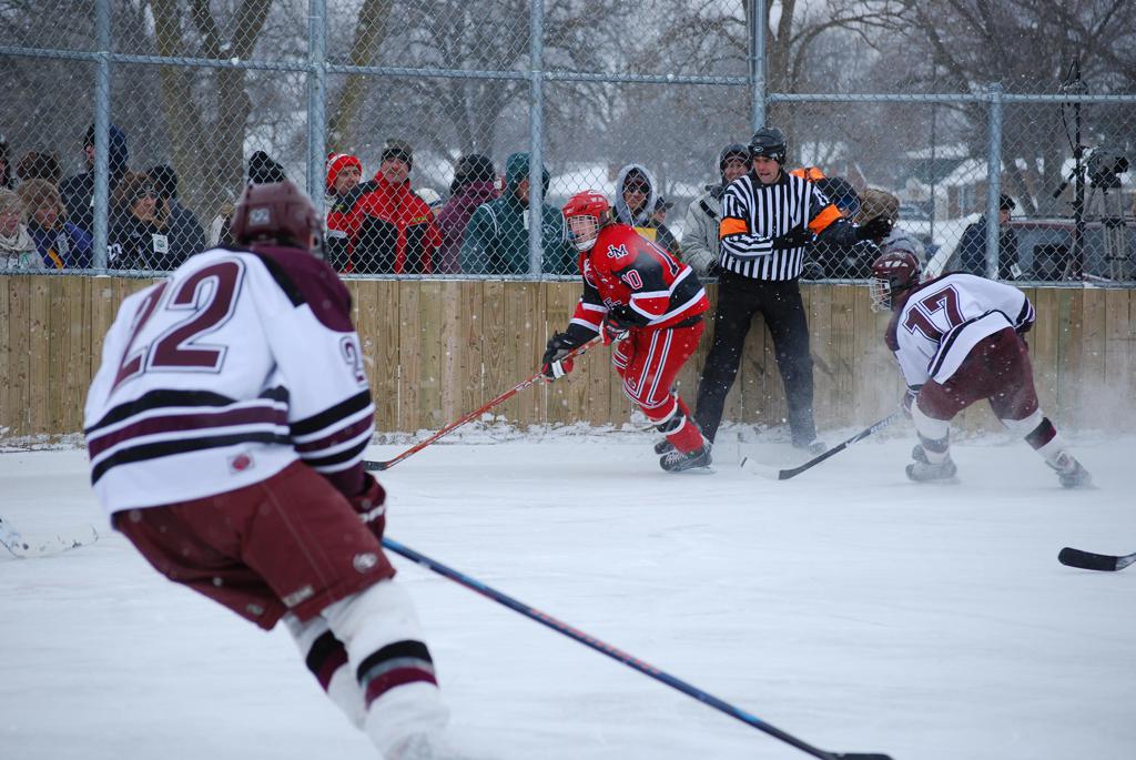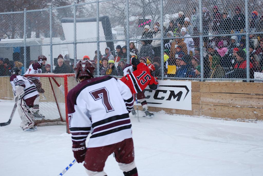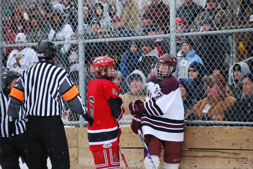 After northern Minnesota Baudette Bay was host to first x2 HDM, this was the perfect location for the Twin Cities first ever Hockey Day Minnesota, hosted at the beautiful outdoor refrigerated ice sheet within historic Phalen Park - where a young Herb Brooks learned to play hockey in eastside St. Paul. The beautiful warming house alongside the chain linked fence rink on the net ends added to the vintage nature of outdoor hockey, prior to the fully enclosed glass rinks now seen yearly at HDM. With light snow that fell during the games, and fans packing into the 'arena' for the marquee game featuring home-town St. Paul Johnson Governors vs. southern Minnesota Rochester John Marshall Rockets - it made for some amazing photos in stunning red (Rockets) and white/maroon (Governors) uniforms.