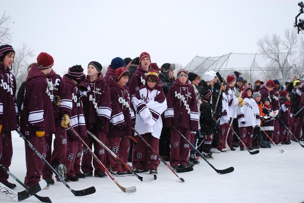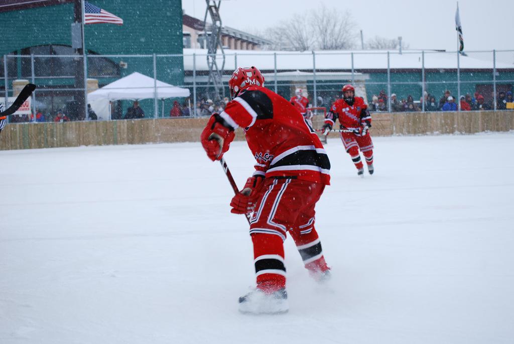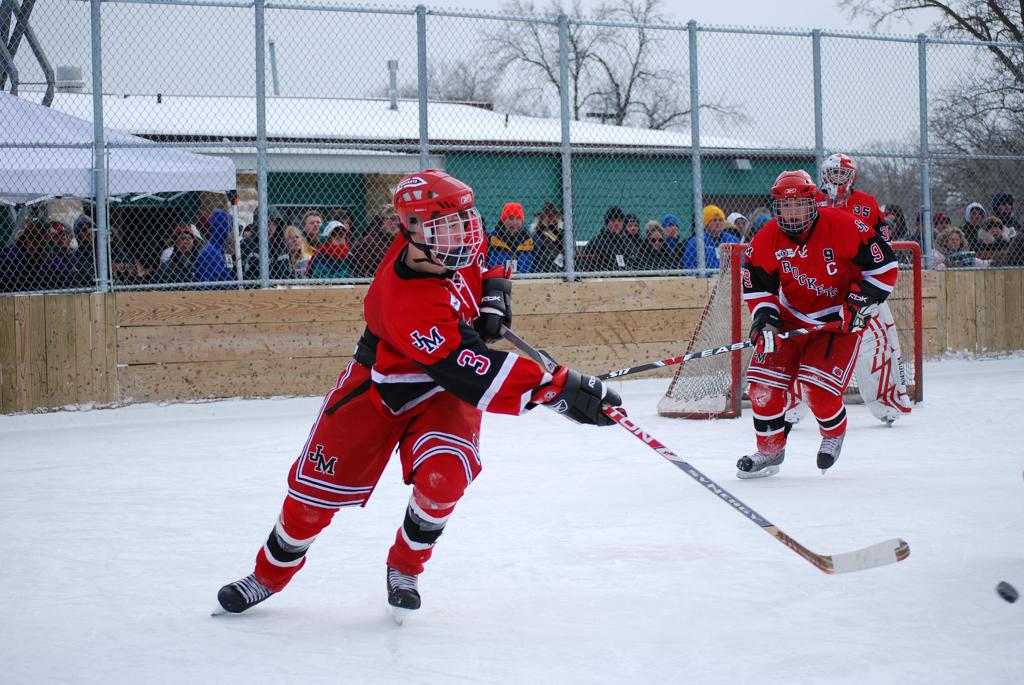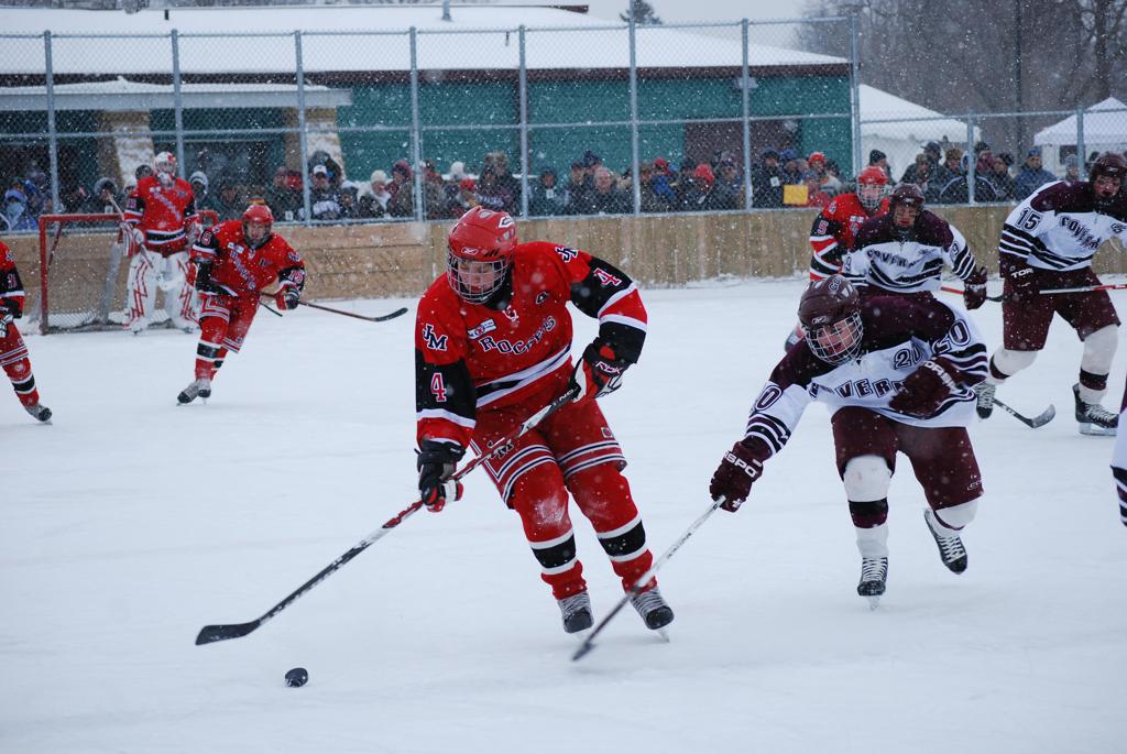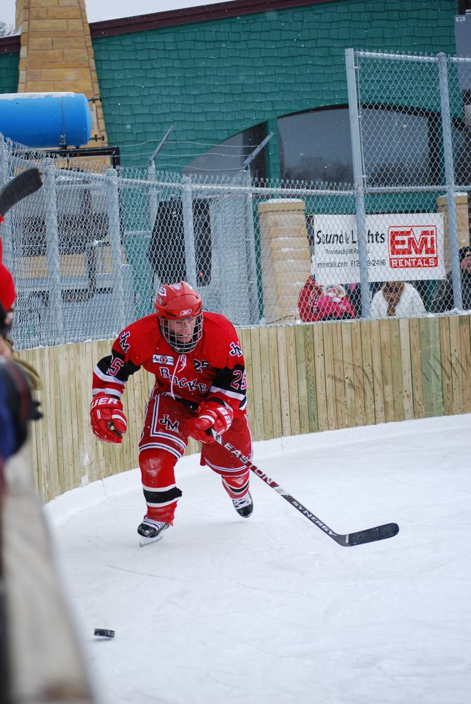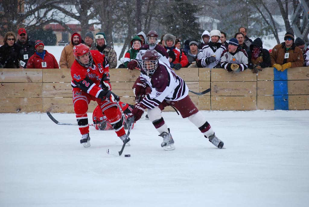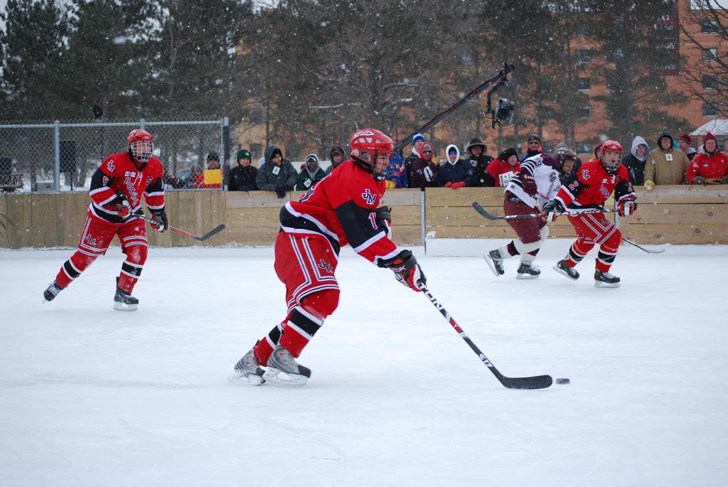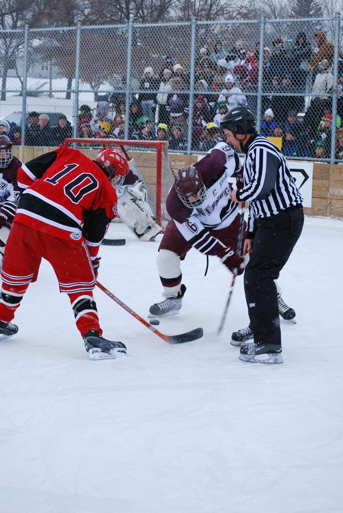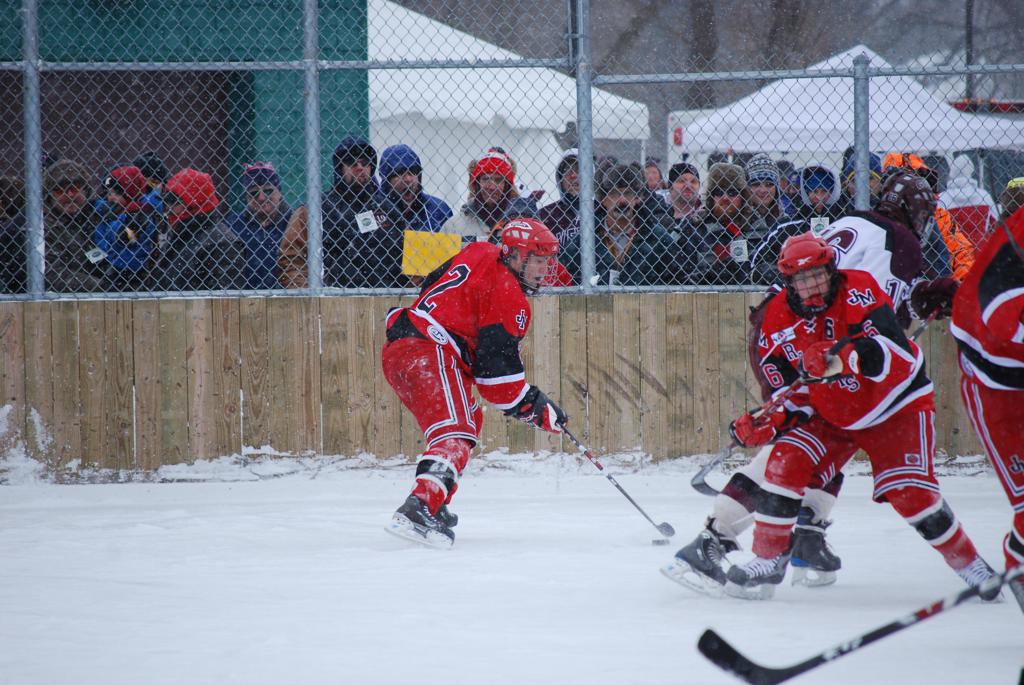 After northern Minnesota Baudette Bay was host to first x2 HDM, this was the perfect location for the Twin Cities first ever Hockey Day Minnesota, hosted at the beautiful outdoor refrigerated ice sheet within historic Phalen Park - where a young Herb Brooks learned to play hockey in eastside St. Paul. The beautiful warming house alongside the chain linked fence rink on the net ends added to the vintage nature of outdoor hockey, prior to the fully enclosed glass rinks now seen yearly at HDM. With light snow that fell during the games, and fans packing into the 'arena' for the marquee game featuring home-town St. Paul Johnson Governors vs. southern Minnesota Rochester John Marshall Rockets - it made for some amazing photos in stunning red (Rockets) and white/maroon (Governors) uniforms.