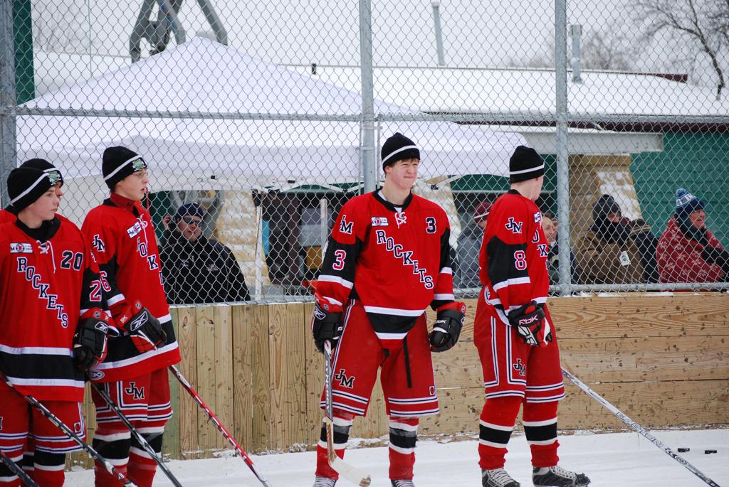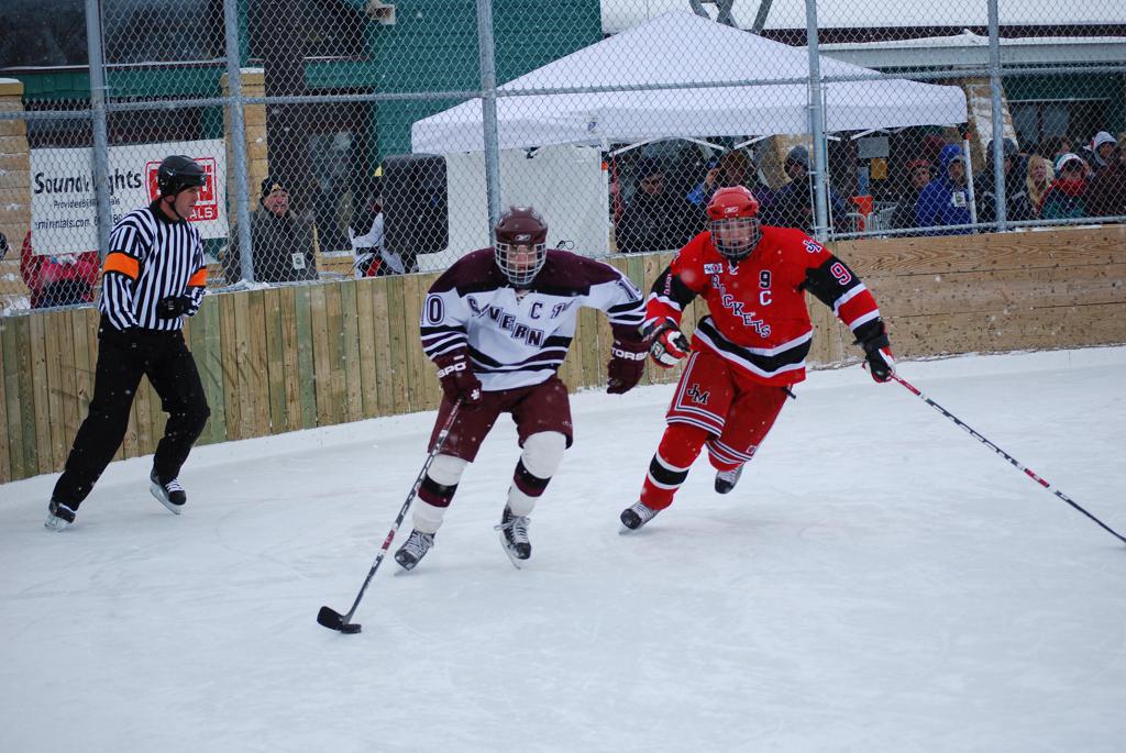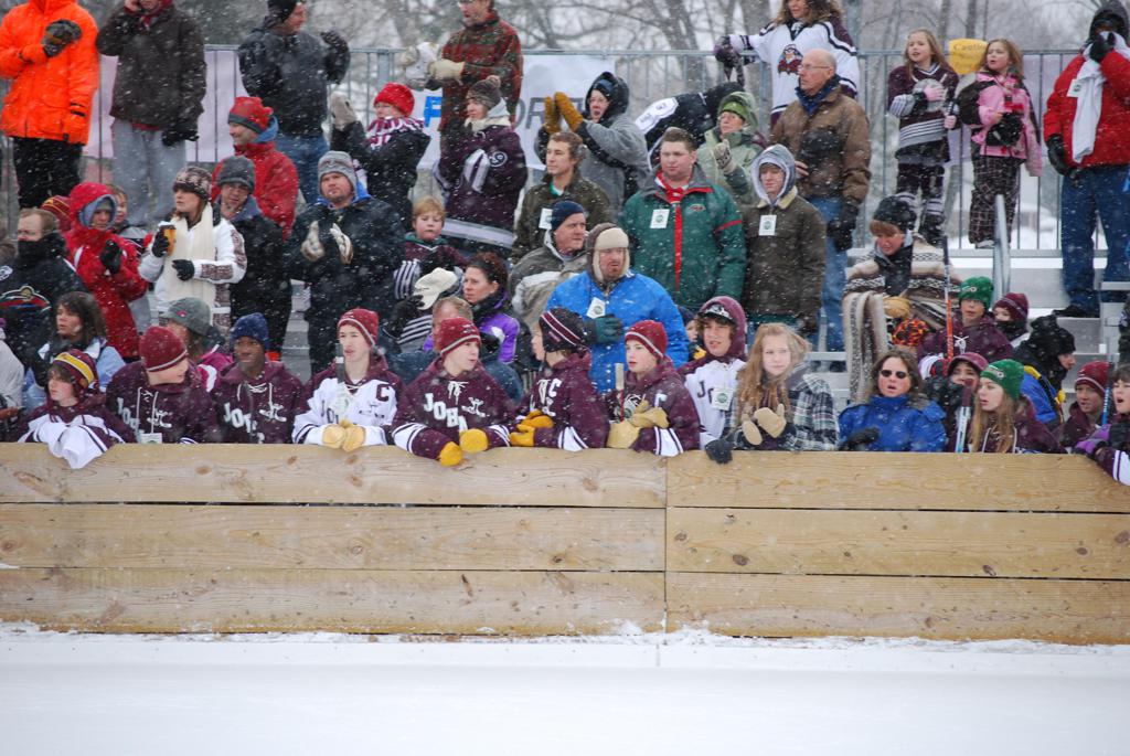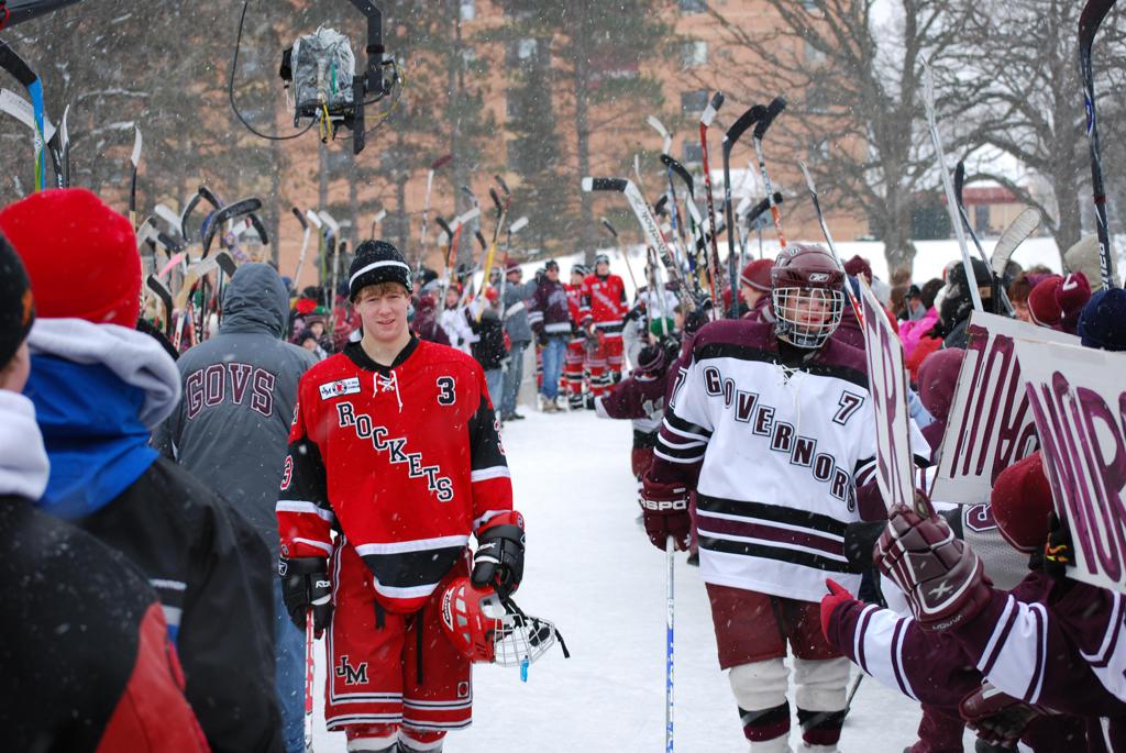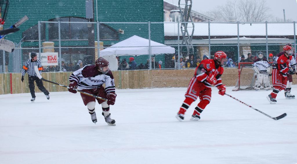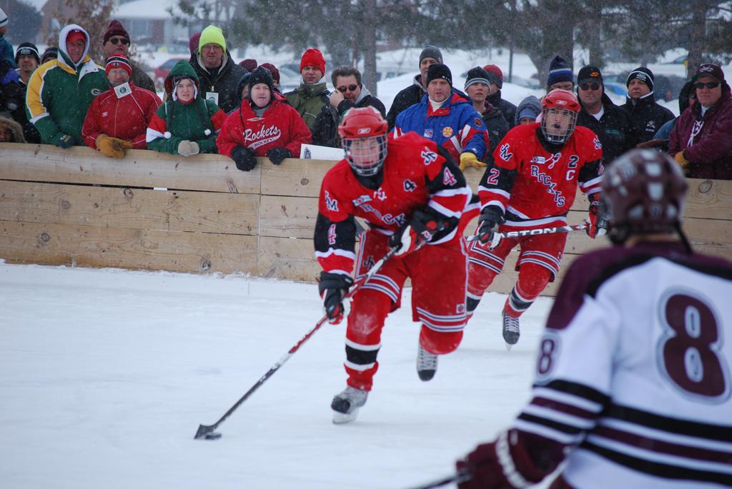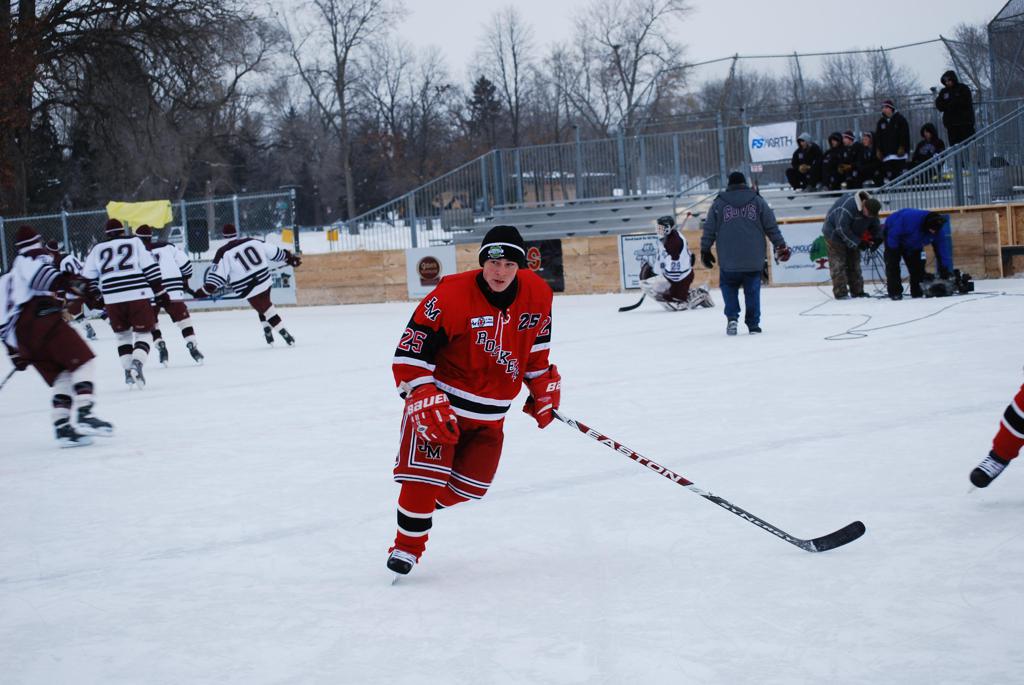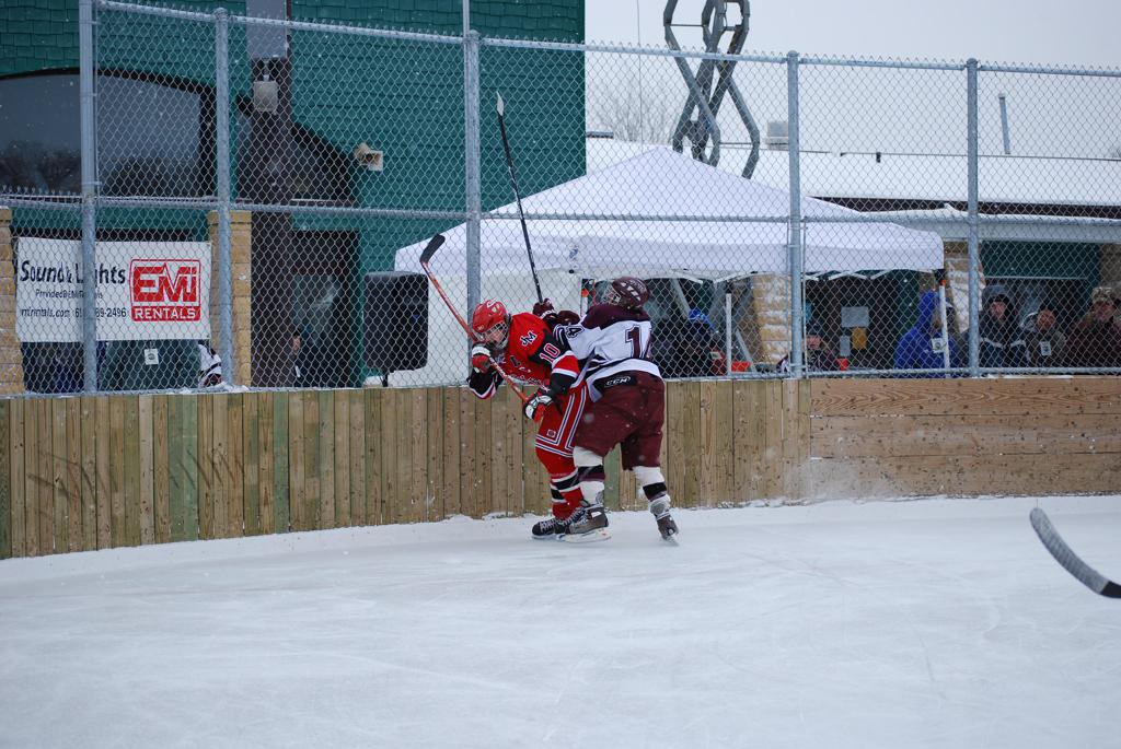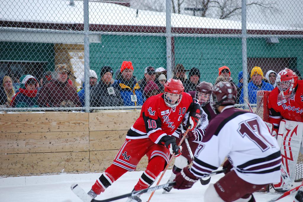 After northern Minnesota Baudette Bay was host to first x2 HDM, this was the perfect location for the Twin Cities first ever Hockey Day Minnesota, hosted at the beautiful outdoor refrigerated ice sheet within historic Phalen Park - where a young Herb Brooks learned to play hockey in eastside St. Paul. The beautiful warming house alongside the chain linked fence rink on the net ends added to the vintage nature of outdoor hockey, prior to the fully enclosed glass rinks now seen yearly at HDM. With light snow that fell during the games, and fans packing into the 'arena' for the marquee game featuring home-town St. Paul Johnson Governors vs. southern Minnesota Rochester John Marshall Rockets - it made for some amazing photos in stunning red (Rockets) and white/maroon (Governors) uniforms.
