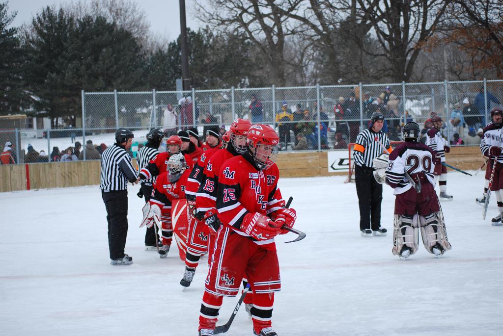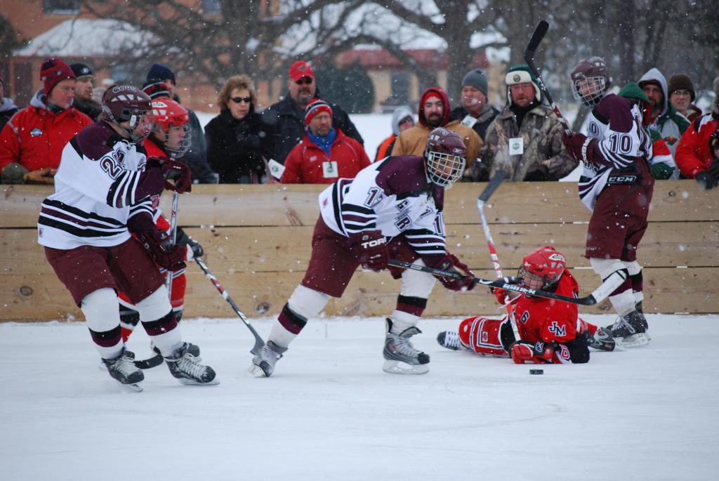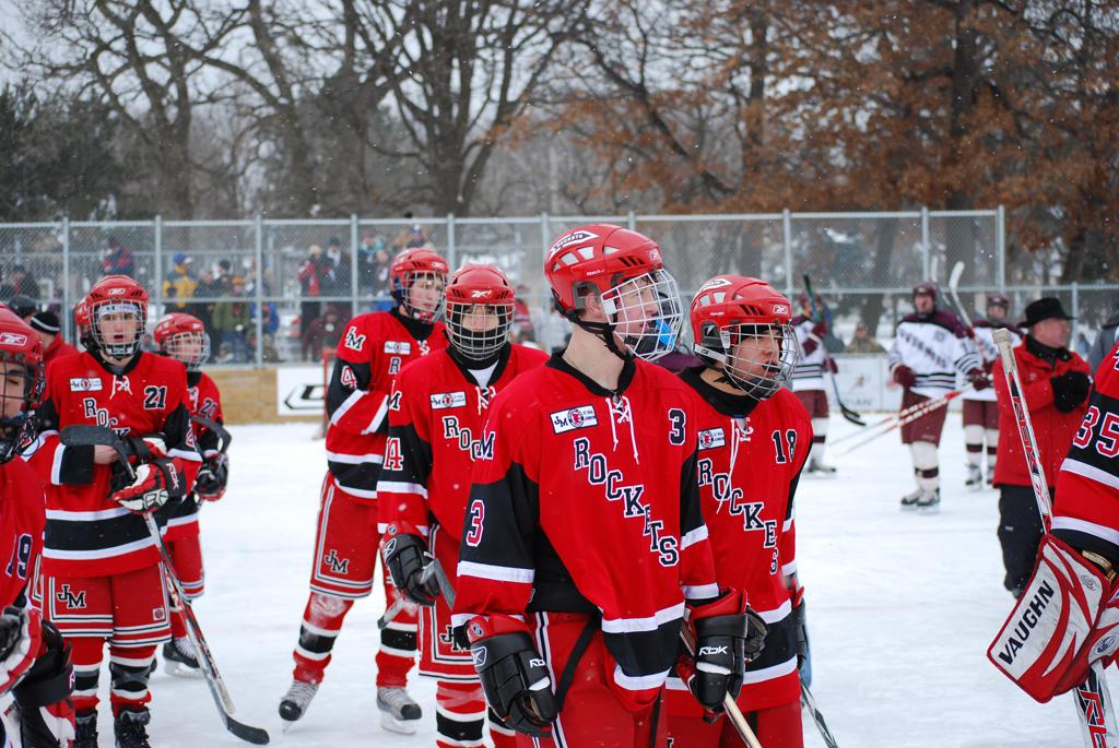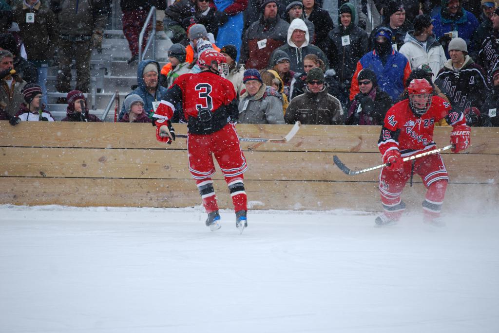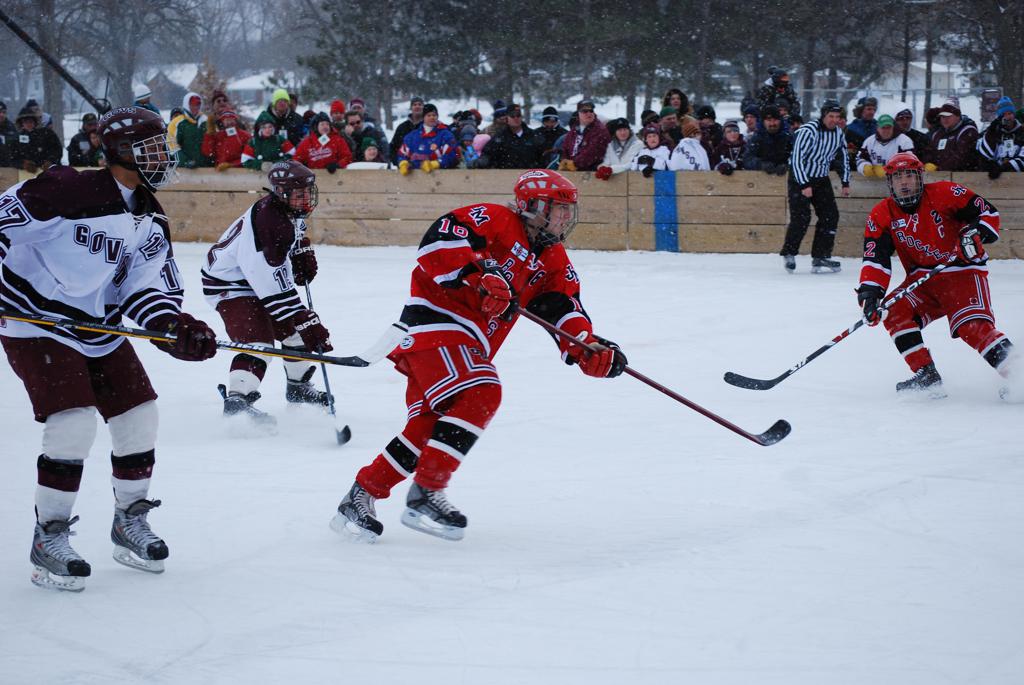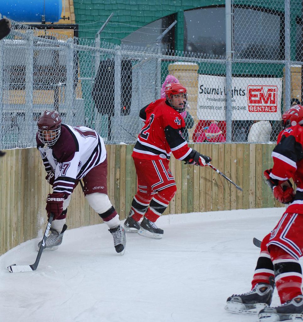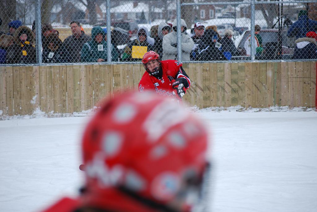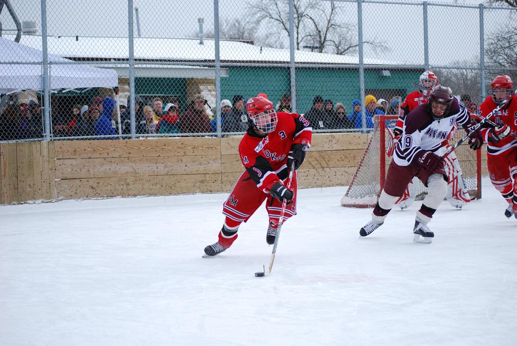 After northern Minnesota Baudette Bay was host to first x2 HDM, this was the perfect location for the Twin Cities first ever Hockey Day Minnesota, hosted at the beautiful outdoor refrigerated ice sheet within historic Phalen Park - where a young Herb Brooks learned to play hockey in eastside St. Paul. The beautiful warming house alongside the chain linked fence rink on the net ends added to the vintage nature of outdoor hockey, prior to the fully enclosed glass rinks now seen yearly at HDM. With light snow that fell during the games, and fans packing into the 'arena' for the marquee game featuring home-town St. Paul Johnson Governors vs. southern Minnesota Rochester John Marshall Rockets - it made for some amazing photos in stunning red (Rockets) and white/maroon (Governors) uniforms.