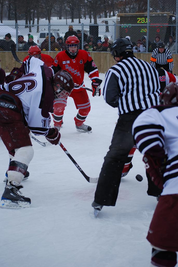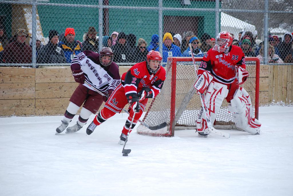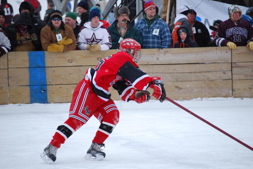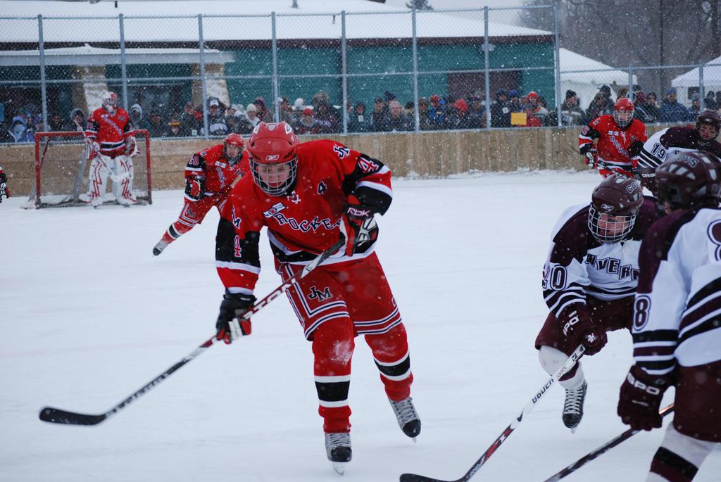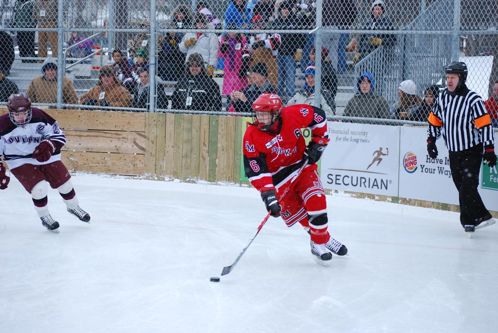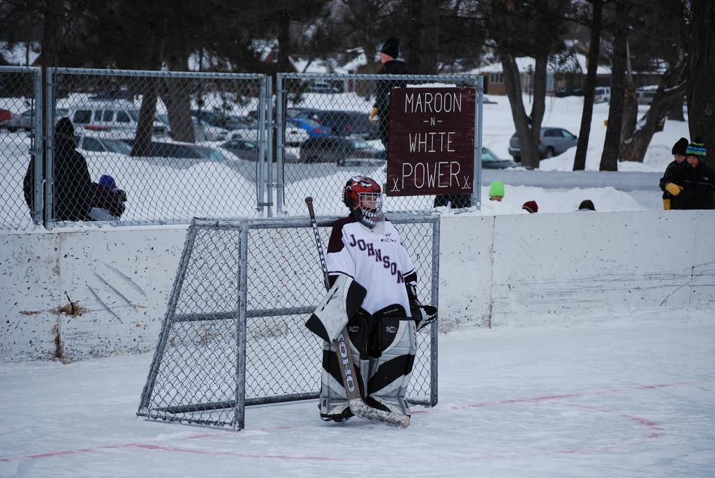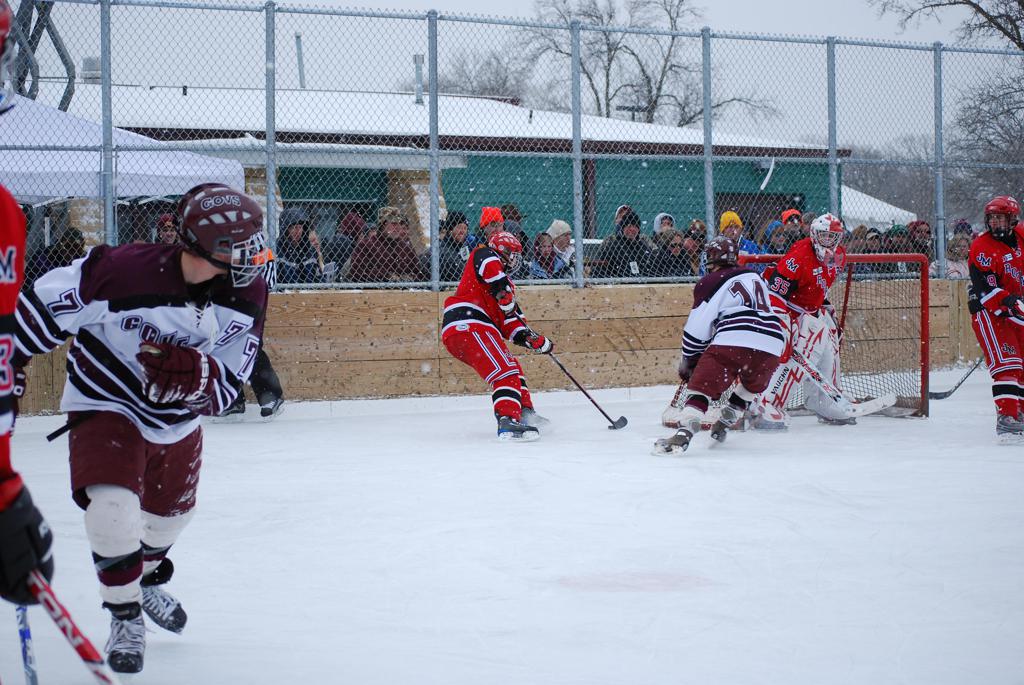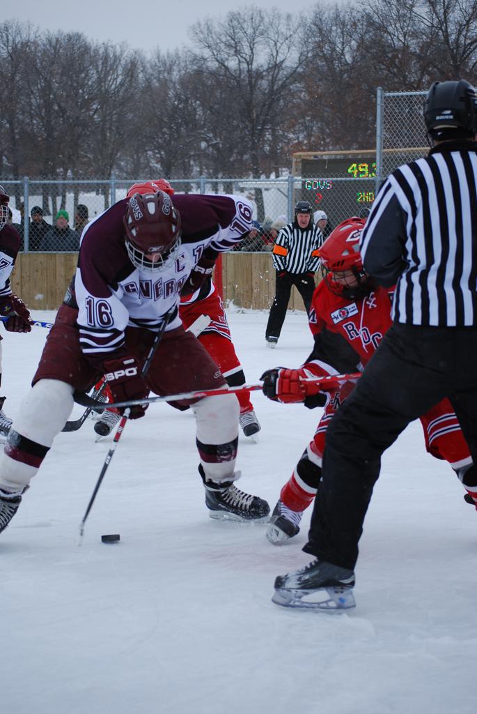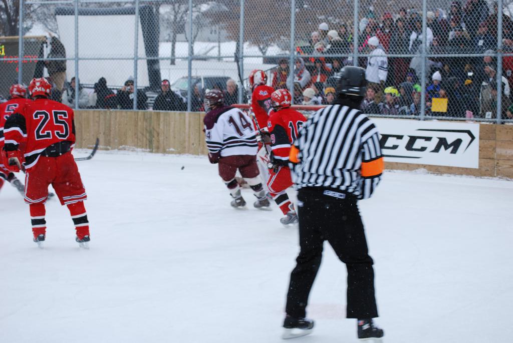 After northern Minnesota Baudette Bay was host to first x2 HDM, this was the perfect location for the Twin Cities first ever Hockey Day Minnesota, hosted at the beautiful outdoor refrigerated ice sheet within historic Phalen Park - where a young Herb Brooks learned to play hockey in eastside St. Paul. The beautiful warming house alongside the chain linked fence rink on the net ends added to the vintage nature of outdoor hockey, prior to the fully enclosed glass rinks now seen yearly at HDM. With light snow that fell during the games, and fans packing into the 'arena' for the marquee game featuring home-town St. Paul Johnson Governors vs. southern Minnesota Rochester John Marshall Rockets - it made for some amazing photos in stunning red (Rockets) and white/maroon (Governors) uniforms.