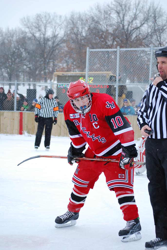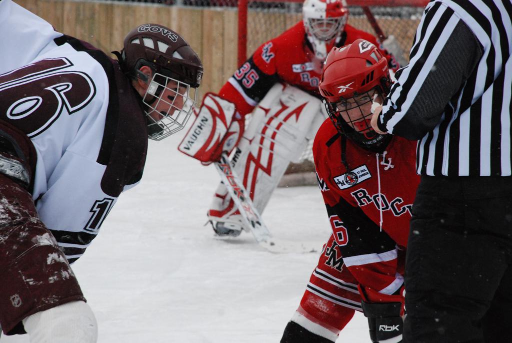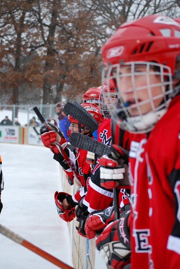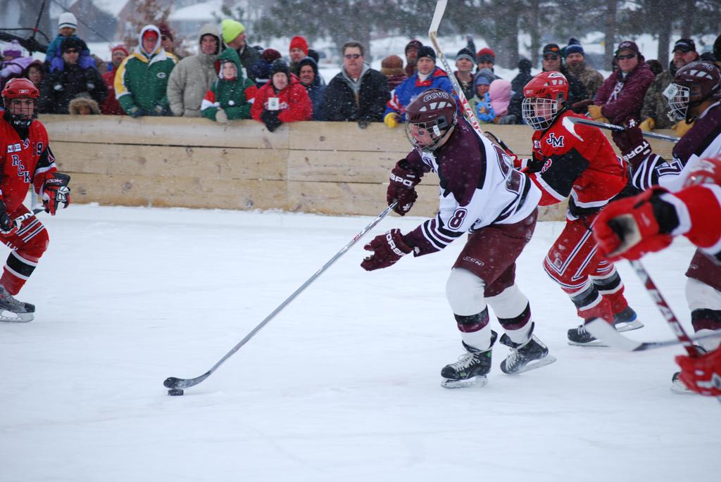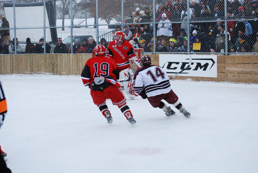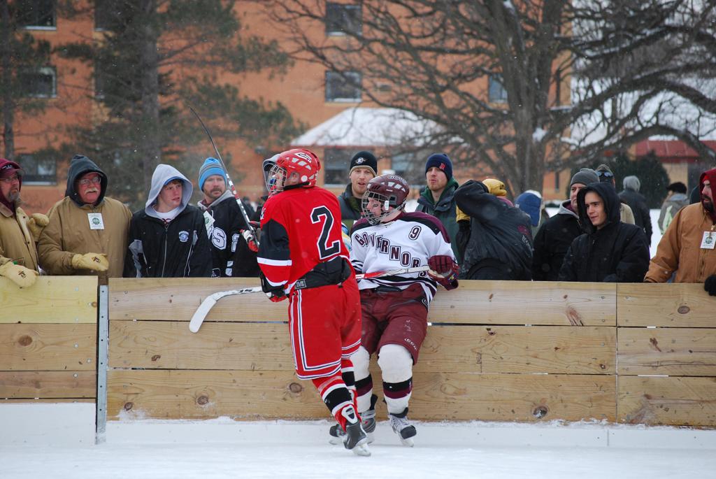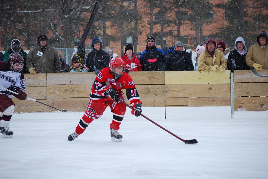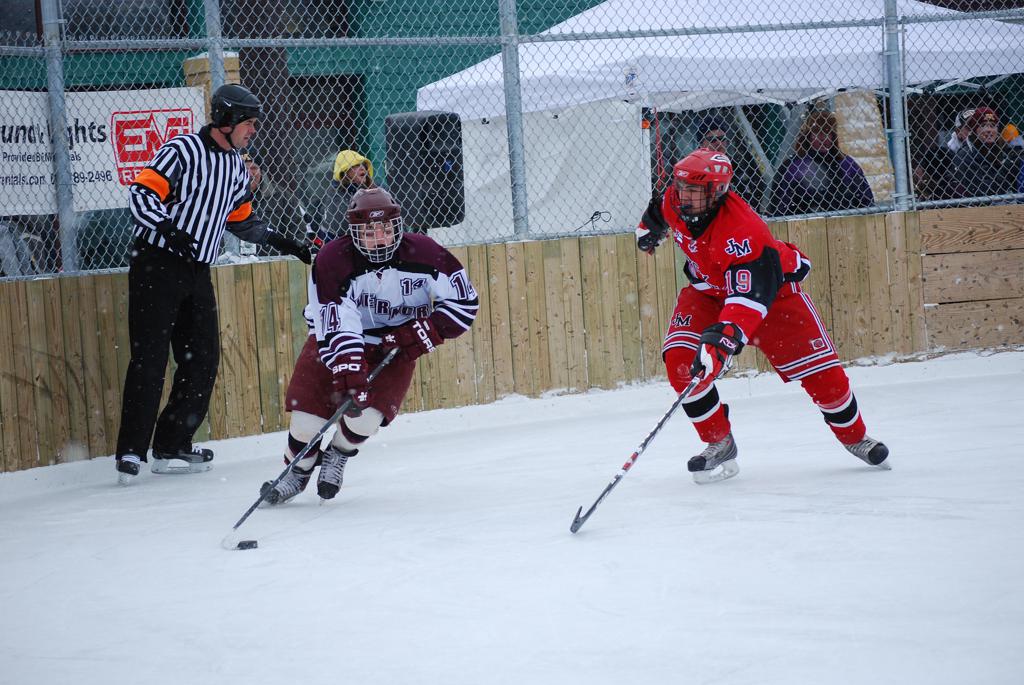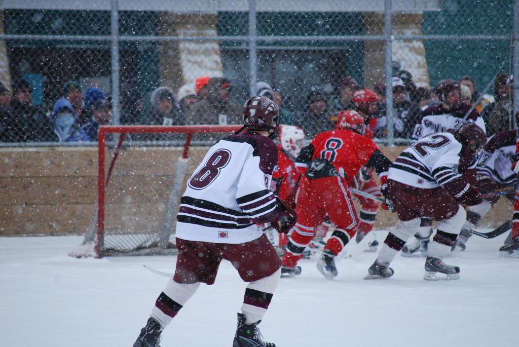 After northern Minnesota Baudette Bay was host to first x2 HDM, this was the perfect location for the Twin Cities first ever Hockey Day Minnesota, hosted at the beautiful outdoor refrigerated ice sheet within historic Phalen Park - where a young Herb Brooks learned to play hockey in eastside St. Paul. The beautiful warming house alongside the chain linked fence rink on the net ends added to the vintage nature of outdoor hockey, prior to the fully enclosed glass rinks now seen yearly at HDM. With light snow that fell during the games, and fans packing into the 'arena' for the marquee game featuring home-town St. Paul Johnson Governors vs. southern Minnesota Rochester John Marshall Rockets - it made for some amazing photos in stunning red (Rockets) and white/maroon (Governors) uniforms.