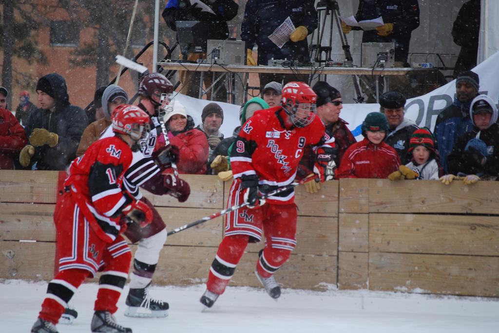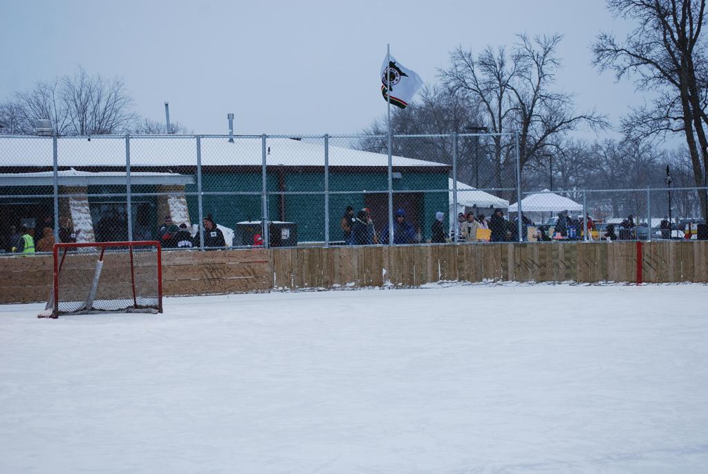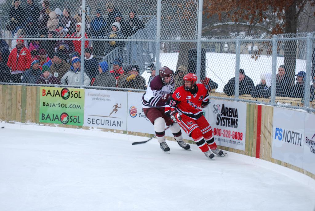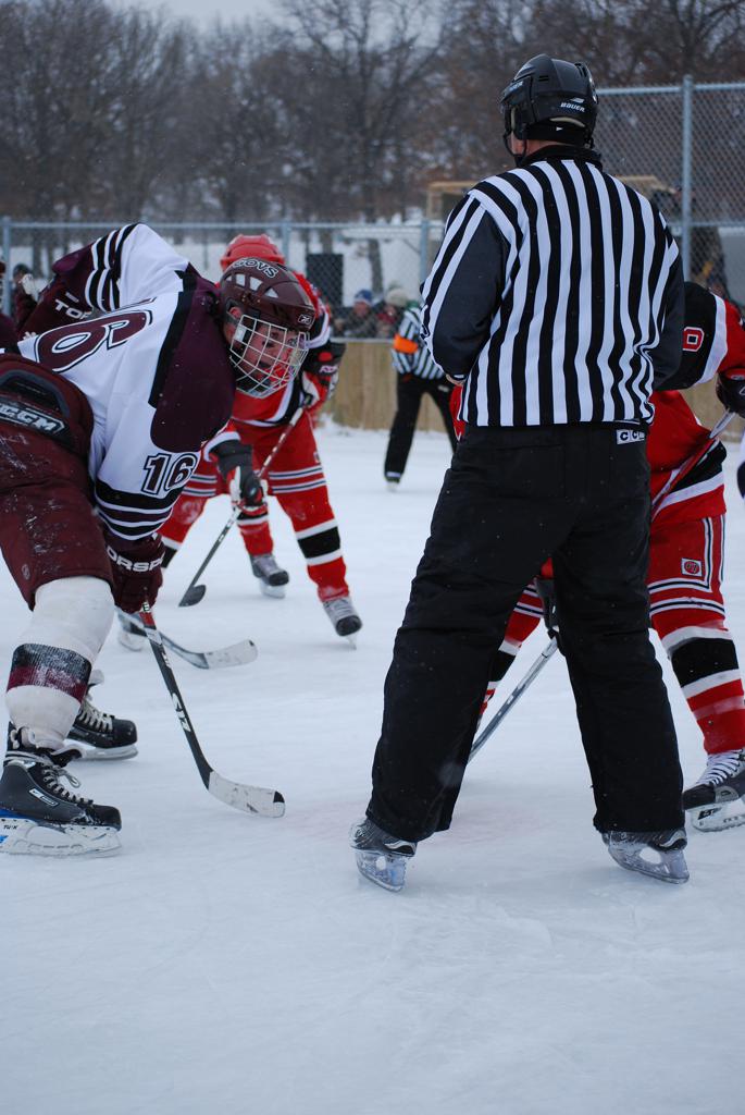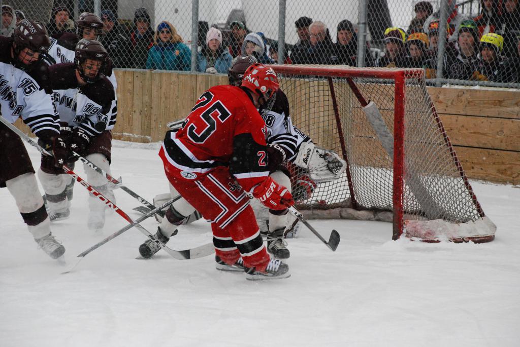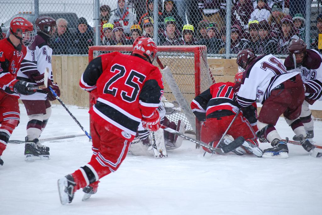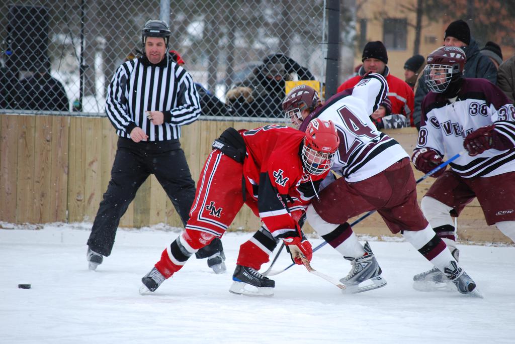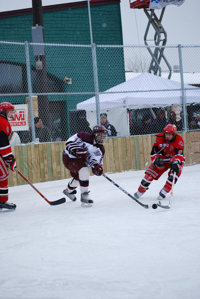 After northern Minnesota Baudette Bay was host to first x2 HDM, this was the perfect location for the Twin Cities first ever Hockey Day Minnesota, hosted at the beautiful outdoor refrigerated ice sheet within historic Phalen Park - where a young Herb Brooks learned to play hockey in eastside St. Paul. The beautiful warming house alongside the chain linked fence rink on the net ends added to the vintage nature of outdoor hockey, prior to the fully enclosed glass rinks now seen yearly at HDM. With light snow that fell during the games, and fans packing into the 'arena' for the marquee game featuring home-town St. Paul Johnson Governors vs. southern Minnesota Rochester John Marshall Rockets - it made for some amazing photos in stunning red (Rockets) and white/maroon (Governors) uniforms.