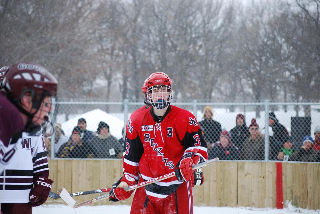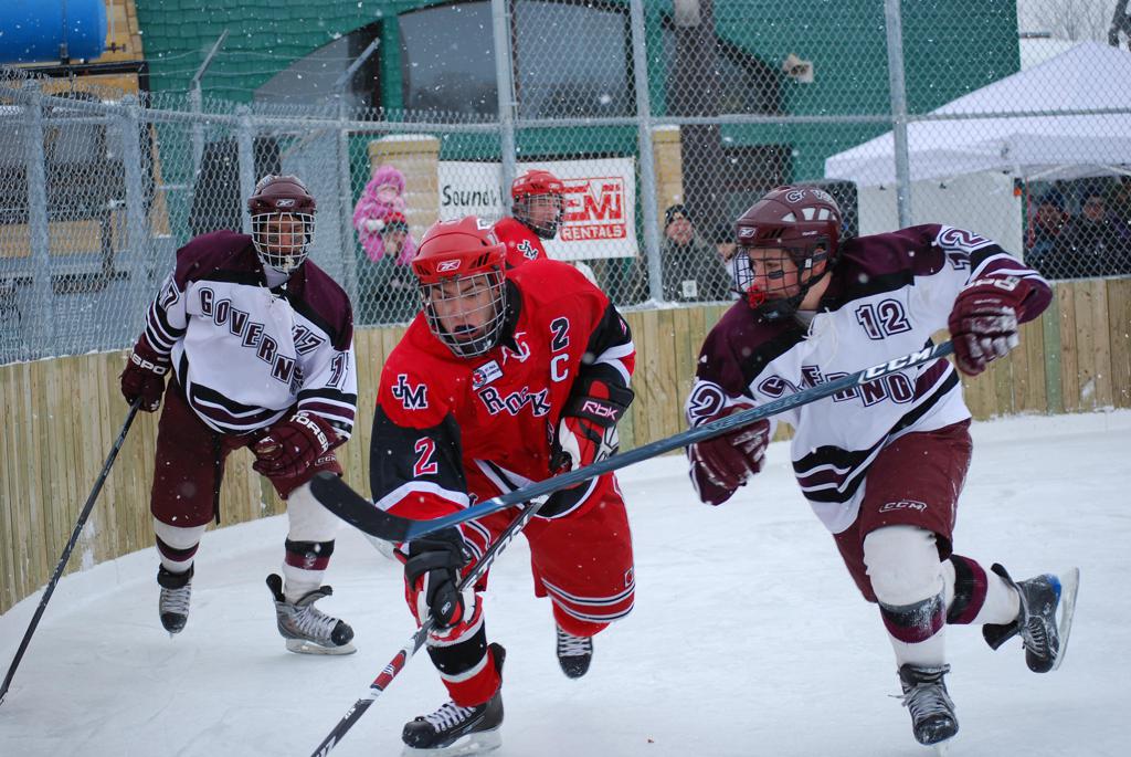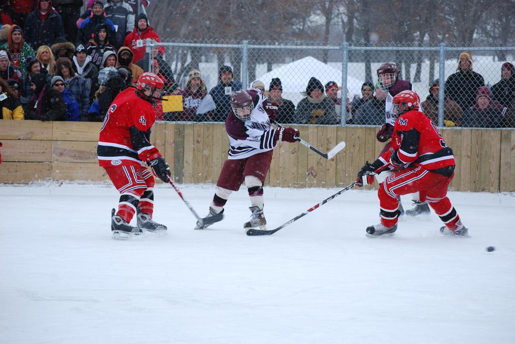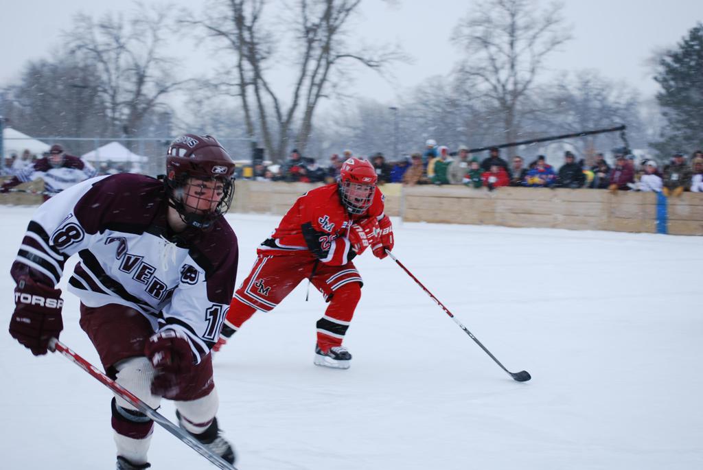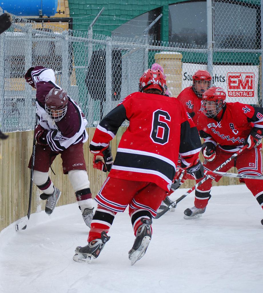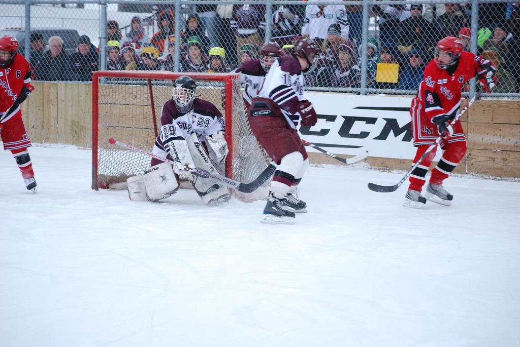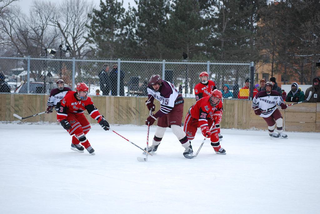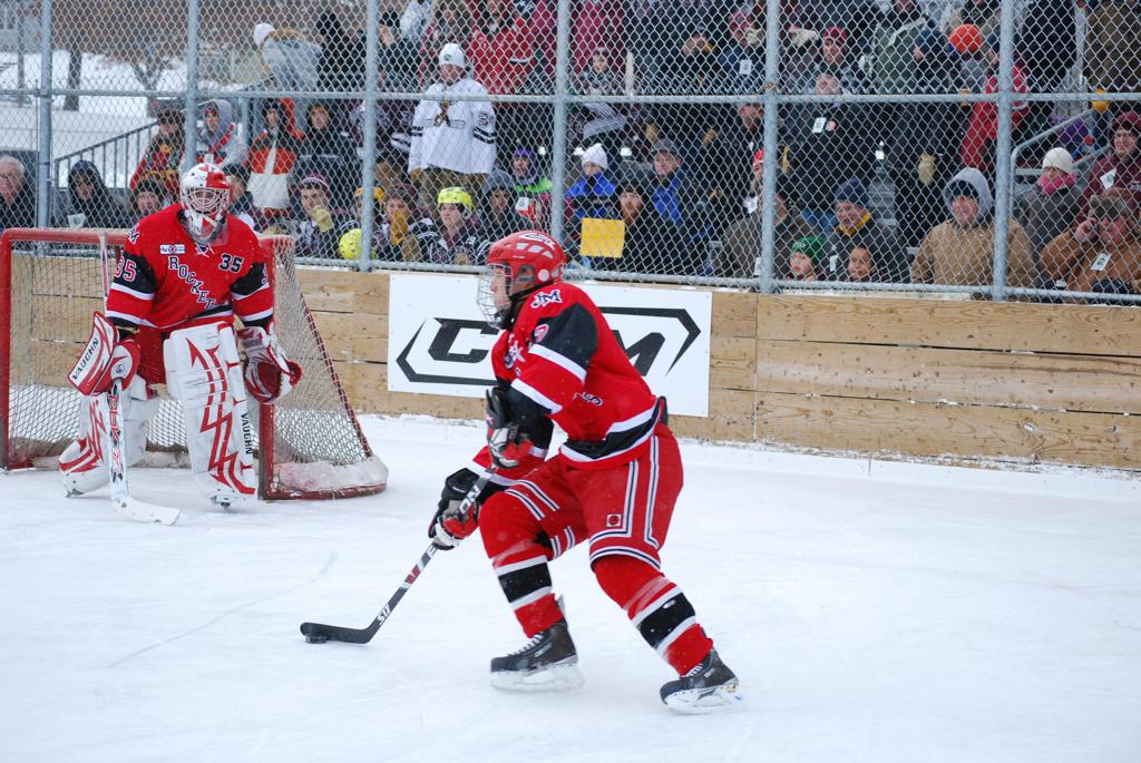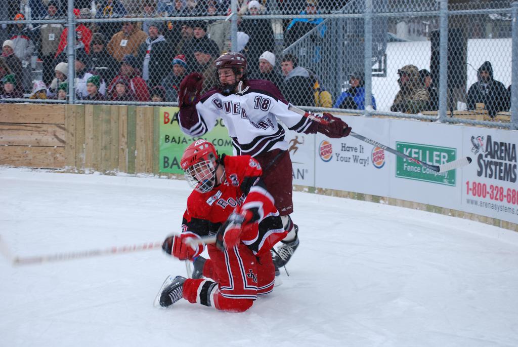 After northern Minnesota Baudette Bay was host to first x2 HDM, this was the perfect location for the Twin Cities first ever Hockey Day Minnesota, hosted at the beautiful outdoor refrigerated ice sheet within historic Phalen Park - where a young Herb Brooks learned to play hockey in eastside St. Paul. The beautiful warming house alongside the chain linked fence rink on the net ends added to the vintage nature of outdoor hockey, prior to the fully enclosed glass rinks now seen yearly at HDM. With light snow that fell during the games, and fans packing into the 'arena' for the marquee game featuring home-town St. Paul Johnson Governors vs. southern Minnesota Rochester John Marshall Rockets - it made for some amazing photos in stunning red (Rockets) and white/maroon (Governors) uniforms.