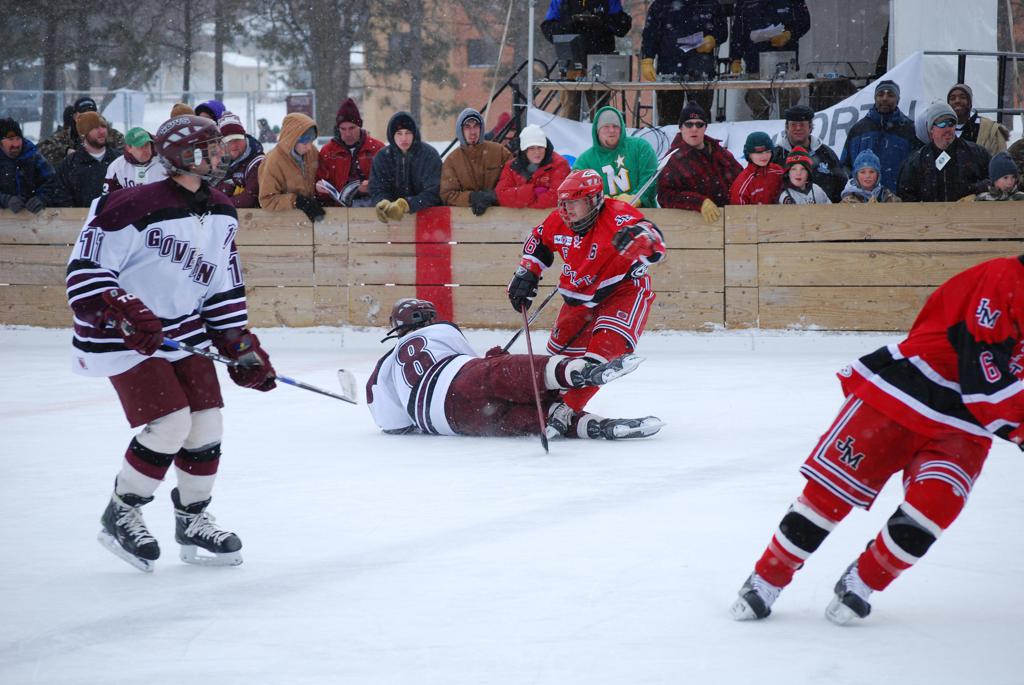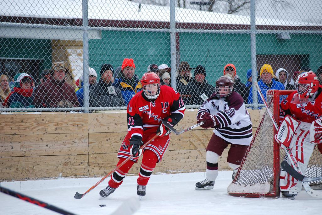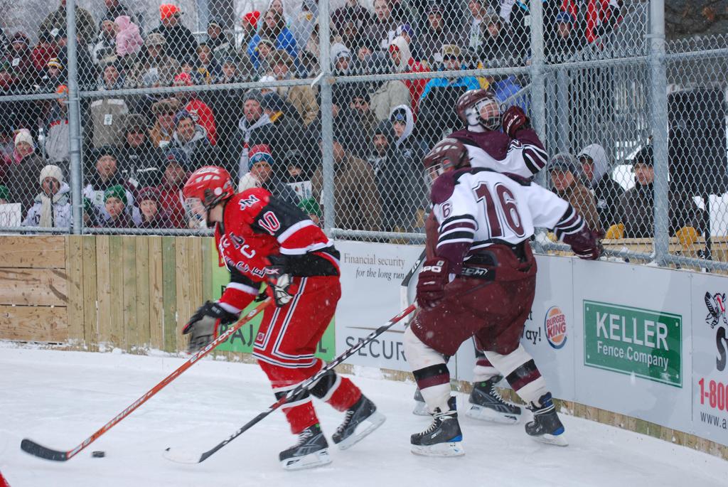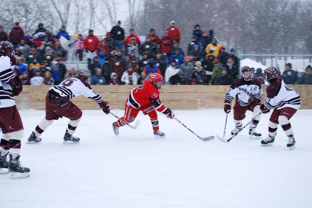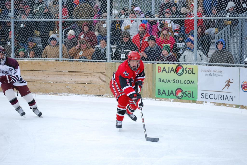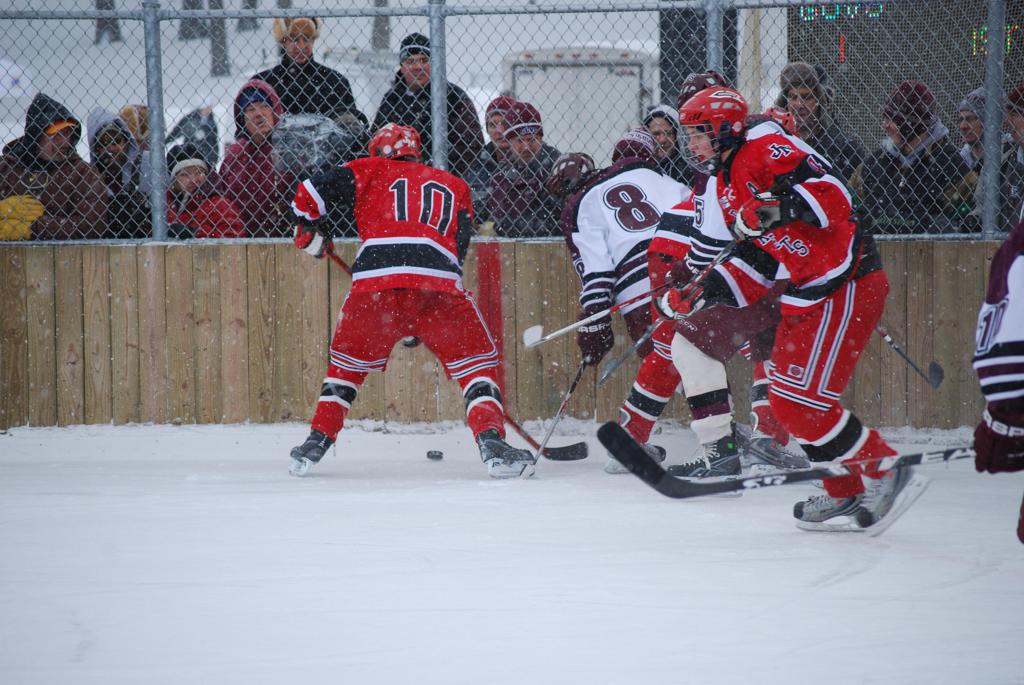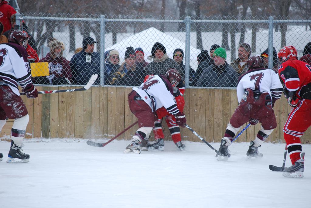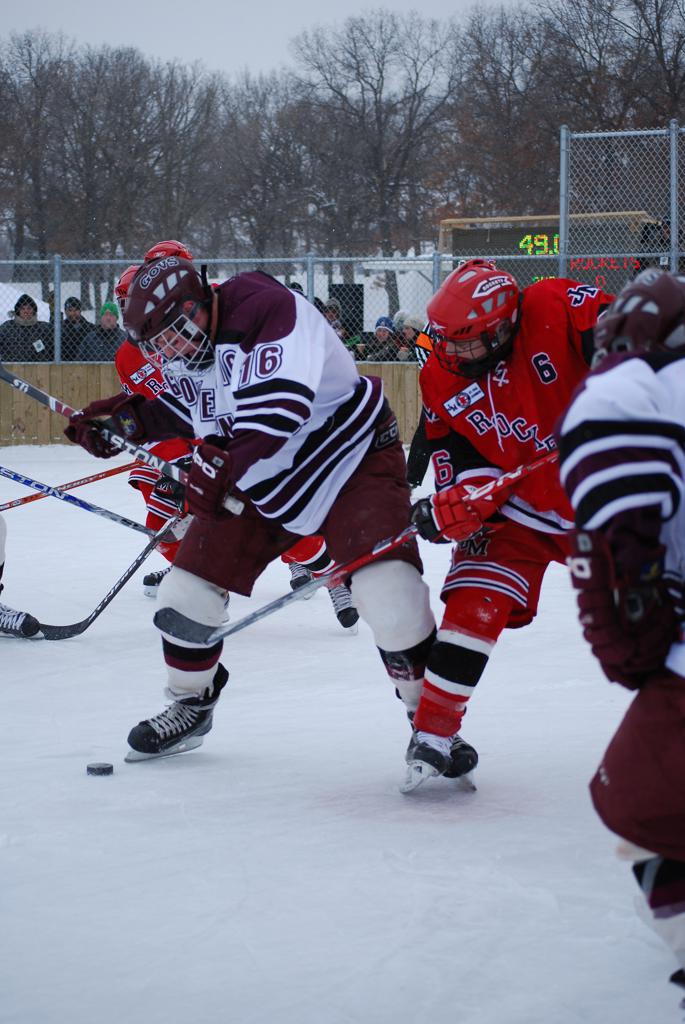 After northern Minnesota Baudette Bay was host to first x2 HDM, this was the perfect location for the Twin Cities first ever Hockey Day Minnesota, hosted at the beautiful outdoor refrigerated ice sheet within historic Phalen Park - where a young Herb Brooks learned to play hockey in eastside St. Paul. The beautiful warming house alongside the chain linked fence rink on the net ends added to the vintage nature of outdoor hockey, prior to the fully enclosed glass rinks now seen yearly at HDM. With light snow that fell during the games, and fans packing into the 'arena' for the marquee game featuring home-town St. Paul Johnson Governors vs. southern Minnesota Rochester John Marshall Rockets - it made for some amazing photos in stunning red (Rockets) and white/maroon (Governors) uniforms.