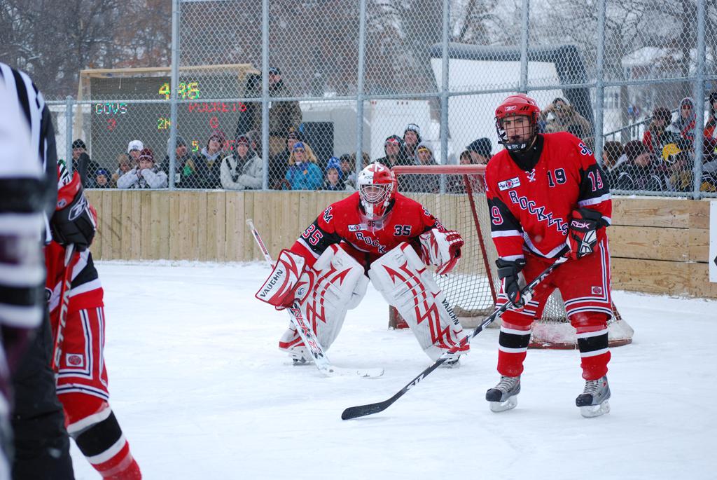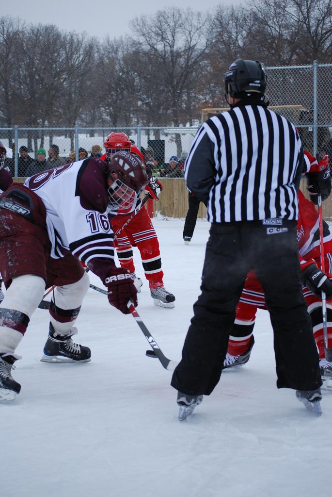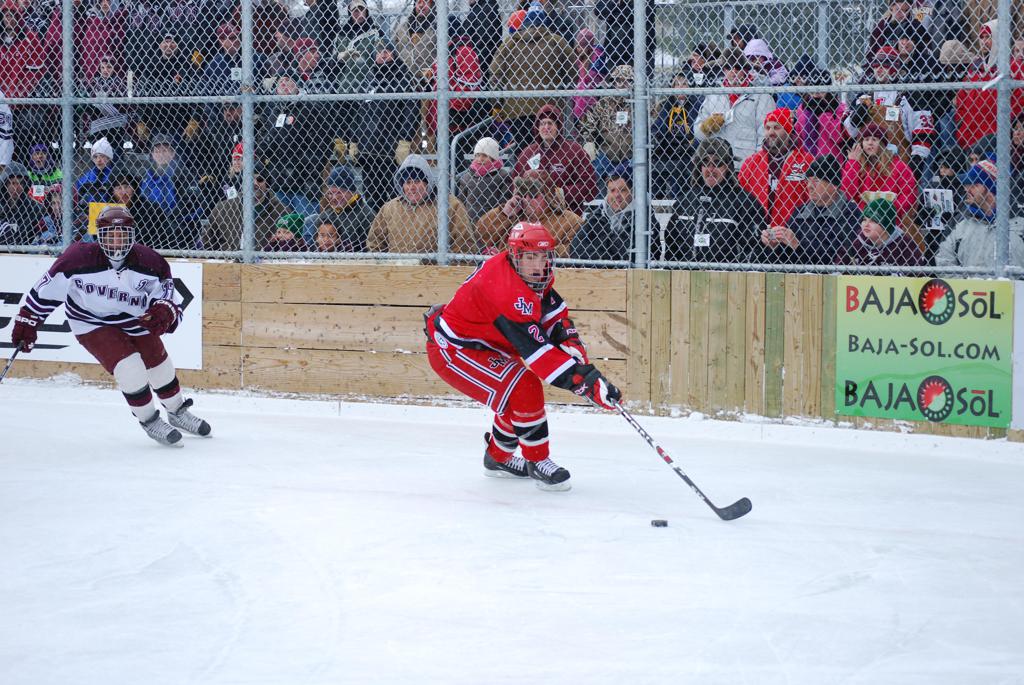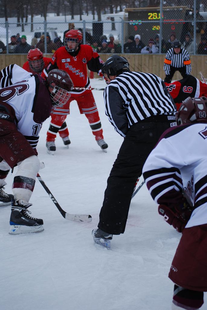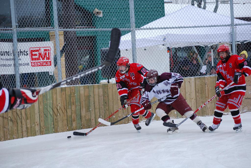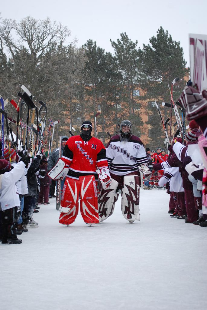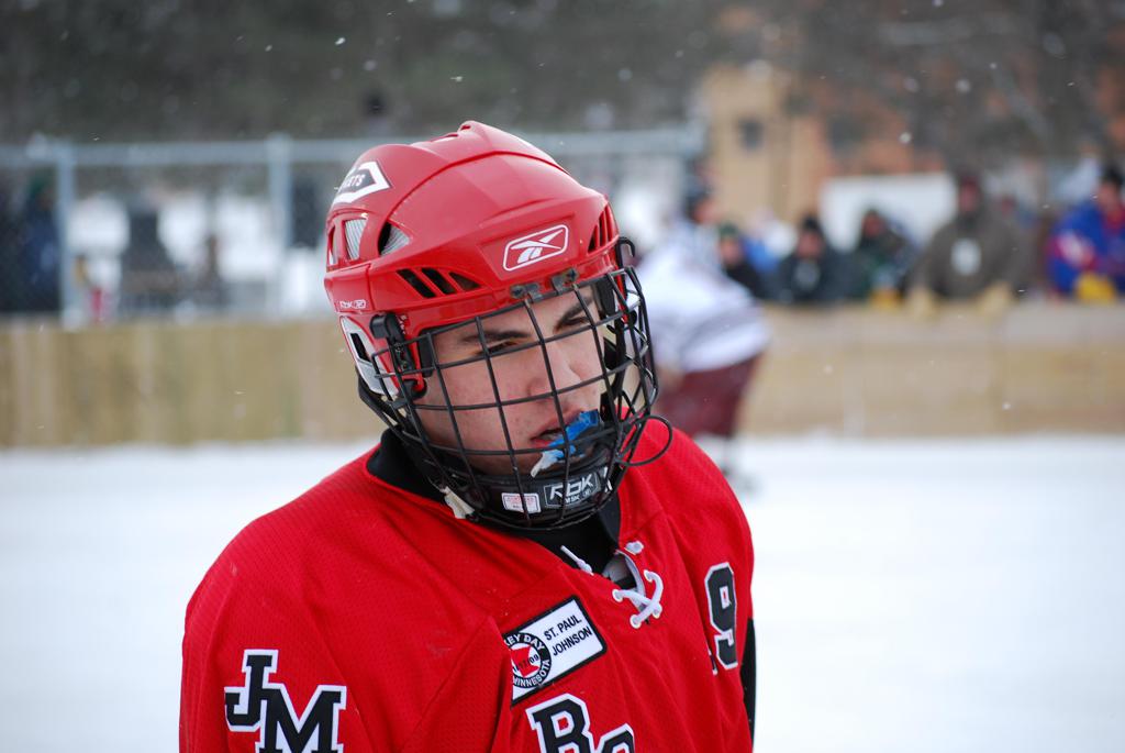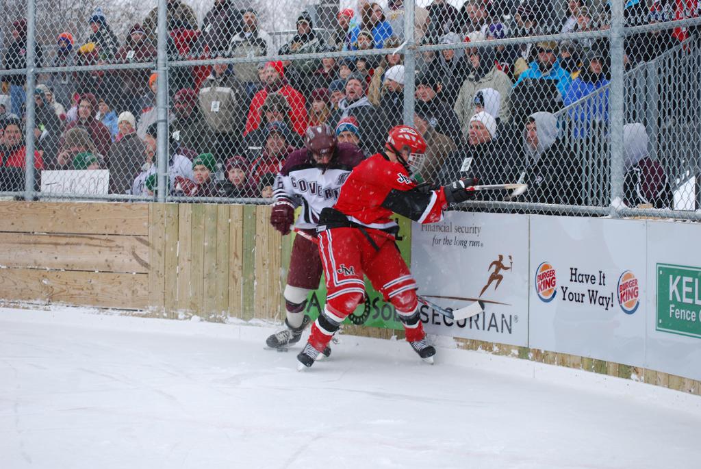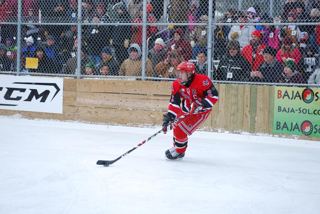 After northern Minnesota Baudette Bay was host to first x2 HDM, this was the perfect location for the Twin Cities first ever Hockey Day Minnesota, hosted at the beautiful outdoor refrigerated ice sheet within historic Phalen Park - where a young Herb Brooks learned to play hockey in eastside St. Paul. The beautiful warming house alongside the chain linked fence rink on the net ends added to the vintage nature of outdoor hockey, prior to the fully enclosed glass rinks now seen yearly at HDM. With light snow that fell during the games, and fans packing into the 'arena' for the marquee game featuring home-town St. Paul Johnson Governors vs. southern Minnesota Rochester John Marshall Rockets - it made for some amazing photos in stunning red (Rockets) and white/maroon (Governors) uniforms.