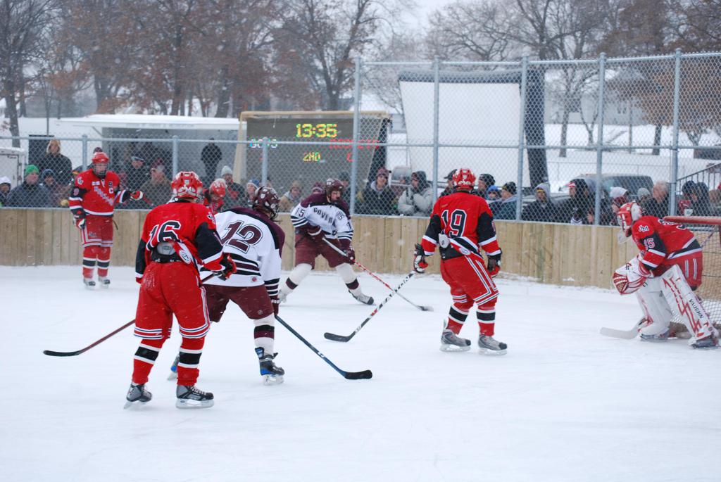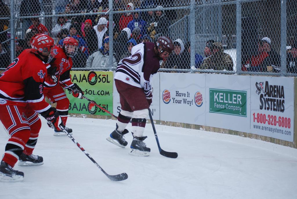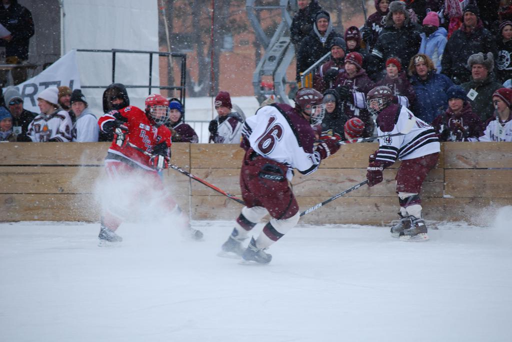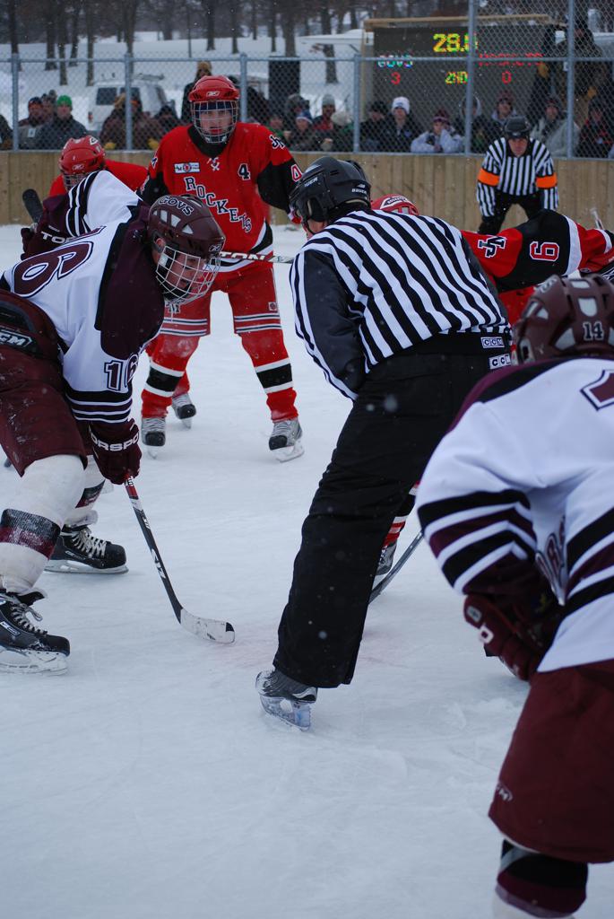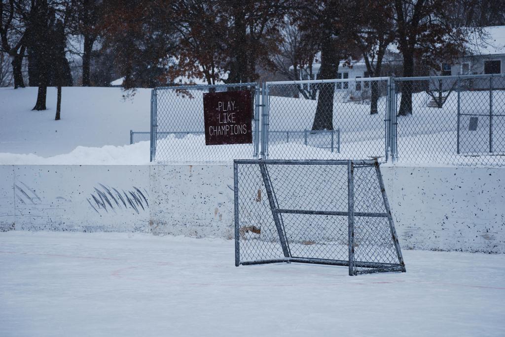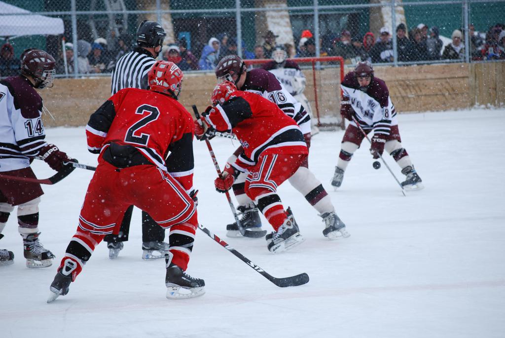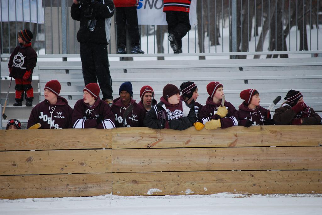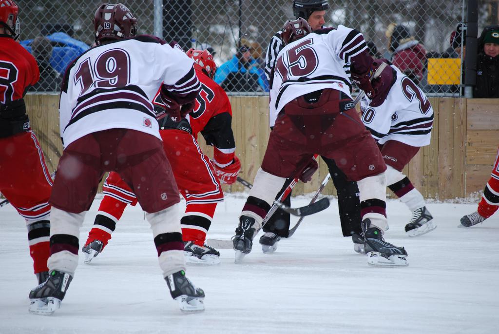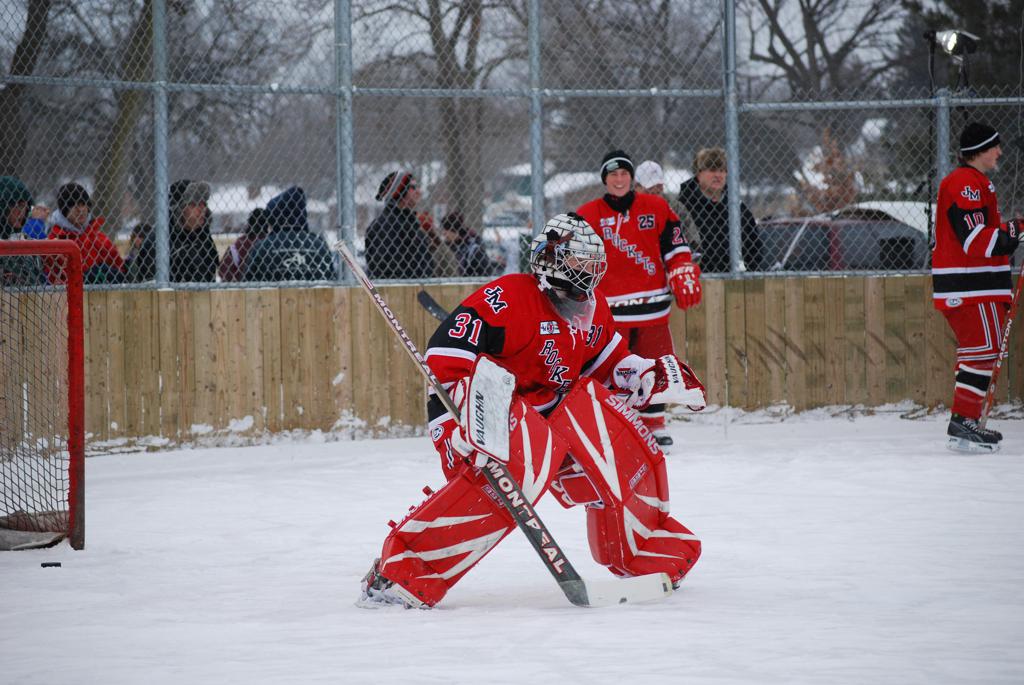 After northern Minnesota Baudette Bay was host to first x2 HDM, this was the perfect location for the Twin Cities first ever Hockey Day Minnesota, hosted at the beautiful outdoor refrigerated ice sheet within historic Phalen Park - where a young Herb Brooks learned to play hockey in eastside St. Paul. The beautiful warming house alongside the chain linked fence rink on the net ends added to the vintage nature of outdoor hockey, prior to the fully enclosed glass rinks now seen yearly at HDM. With light snow that fell during the games, and fans packing into the 'arena' for the marquee game featuring home-town St. Paul Johnson Governors vs. southern Minnesota Rochester John Marshall Rockets - it made for some amazing photos in stunning red (Rockets) and white/maroon (Governors) uniforms.