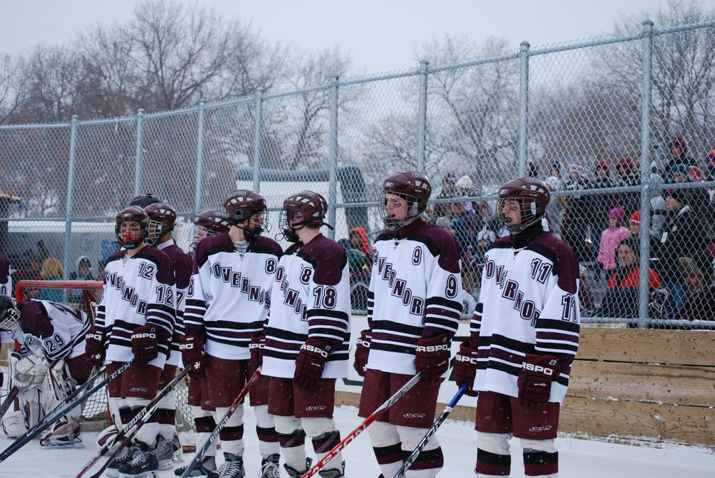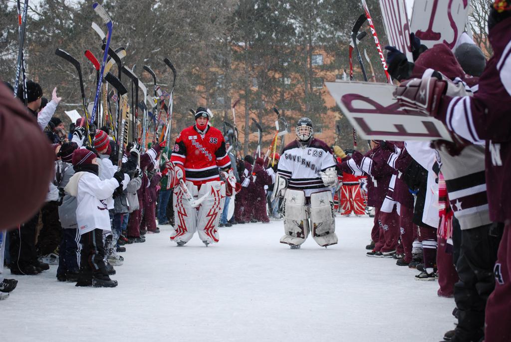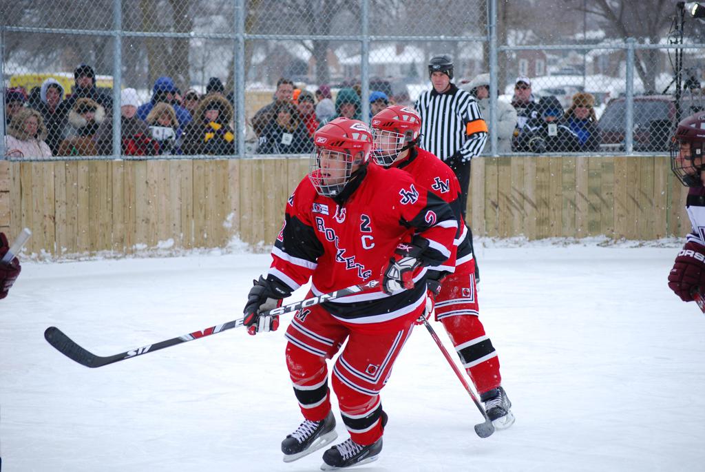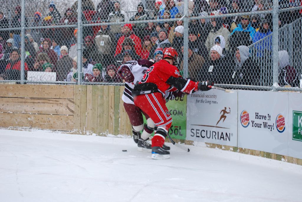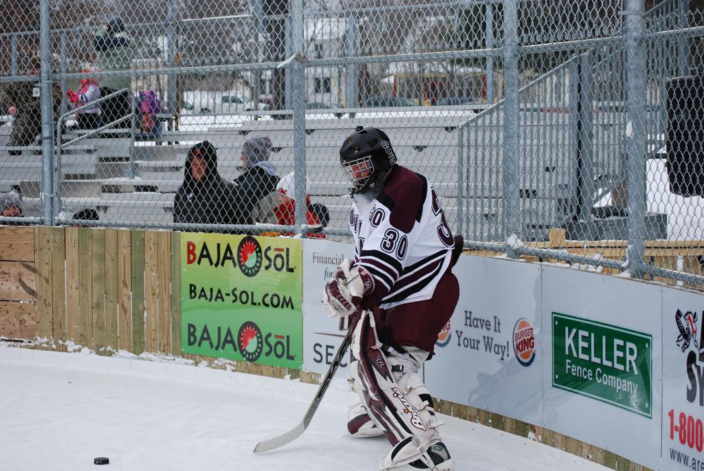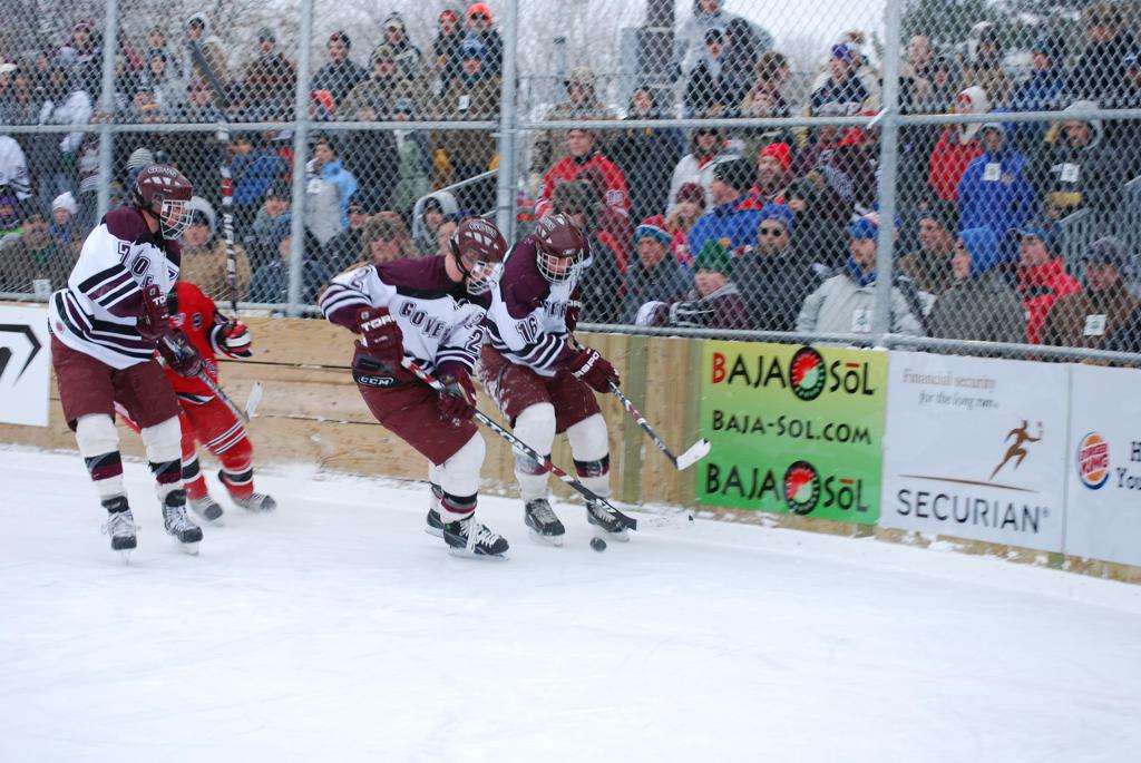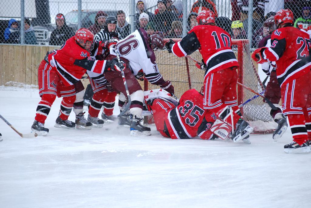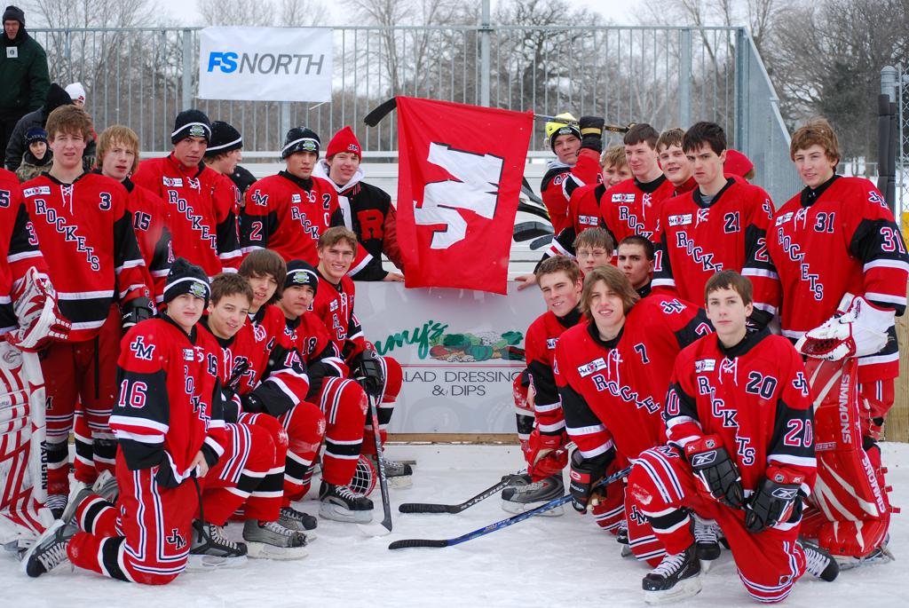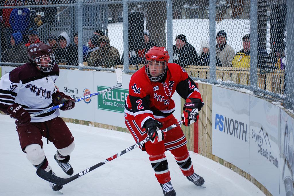 After northern Minnesota Baudette Bay was host to first x2 HDM, this was the perfect location for the Twin Cities first ever Hockey Day Minnesota, hosted at the beautiful outdoor refrigerated ice sheet within historic Phalen Park - where a young Herb Brooks learned to play hockey in eastside St. Paul. The beautiful warming house alongside the chain linked fence rink on the net ends added to the vintage nature of outdoor hockey, prior to the fully enclosed glass rinks now seen yearly at HDM. With light snow that fell during the games, and fans packing into the 'arena' for the marquee game featuring home-town St. Paul Johnson Governors vs. southern Minnesota Rochester John Marshall Rockets - it made for some amazing photos in stunning red (Rockets) and white/maroon (Governors) uniforms.