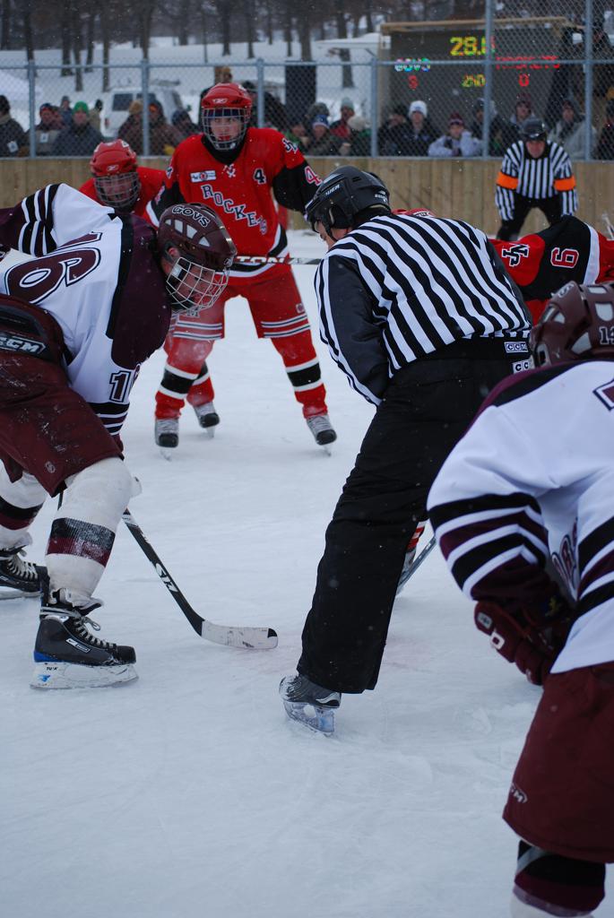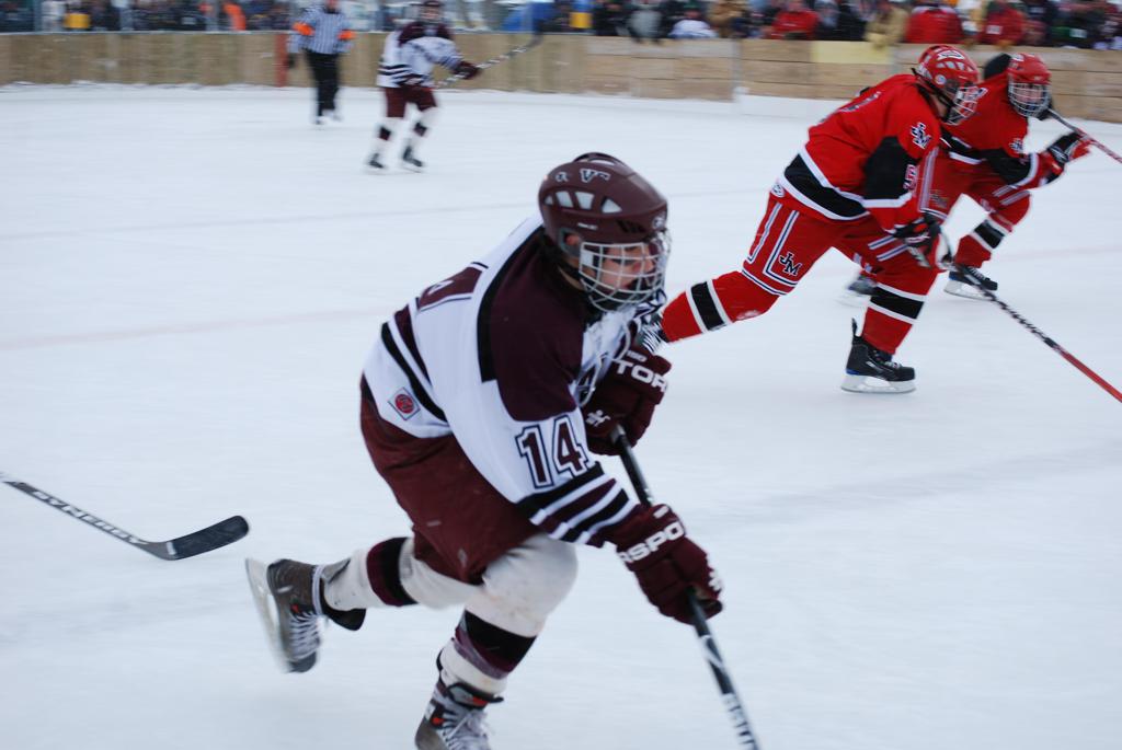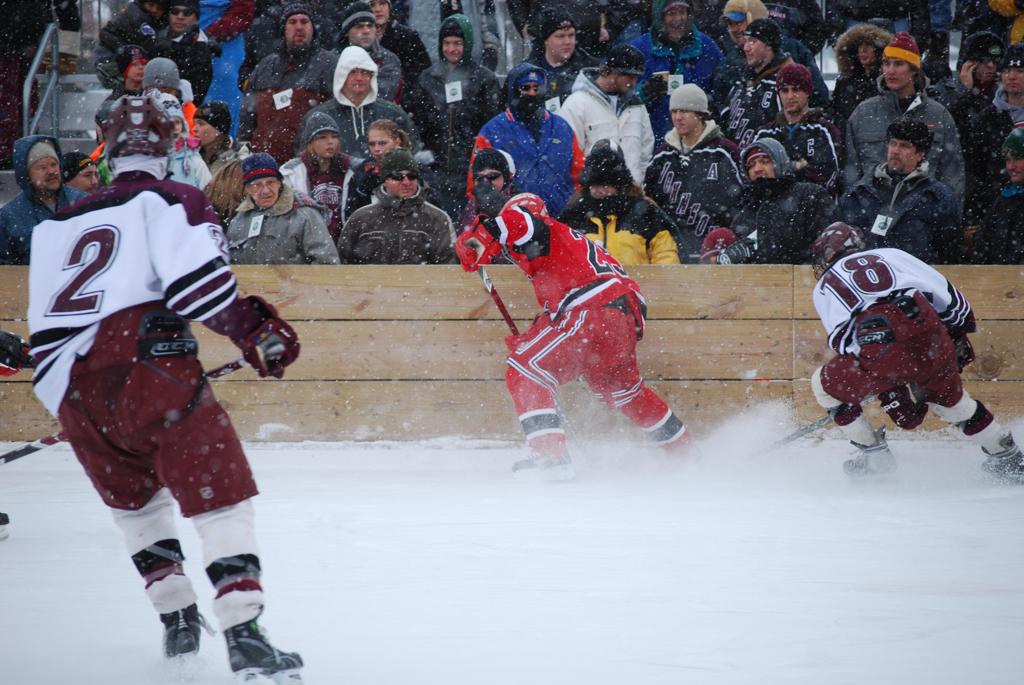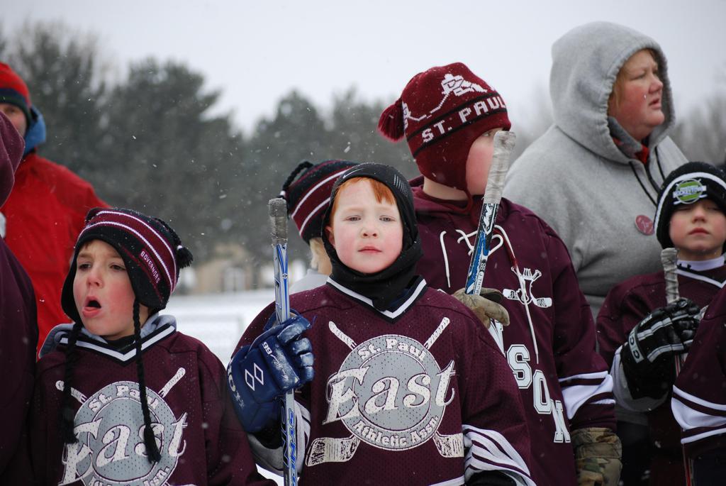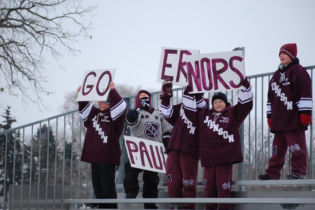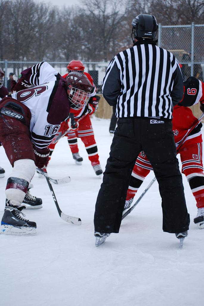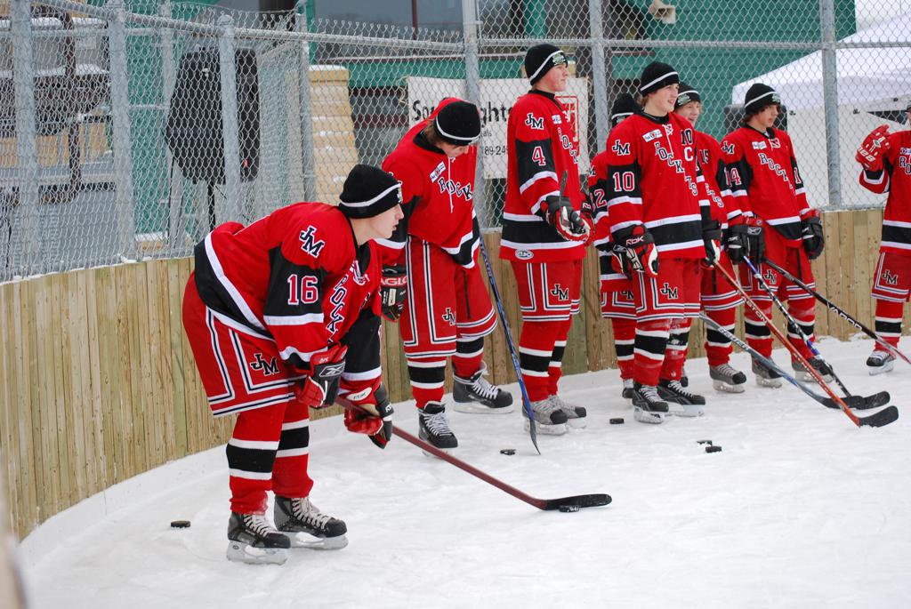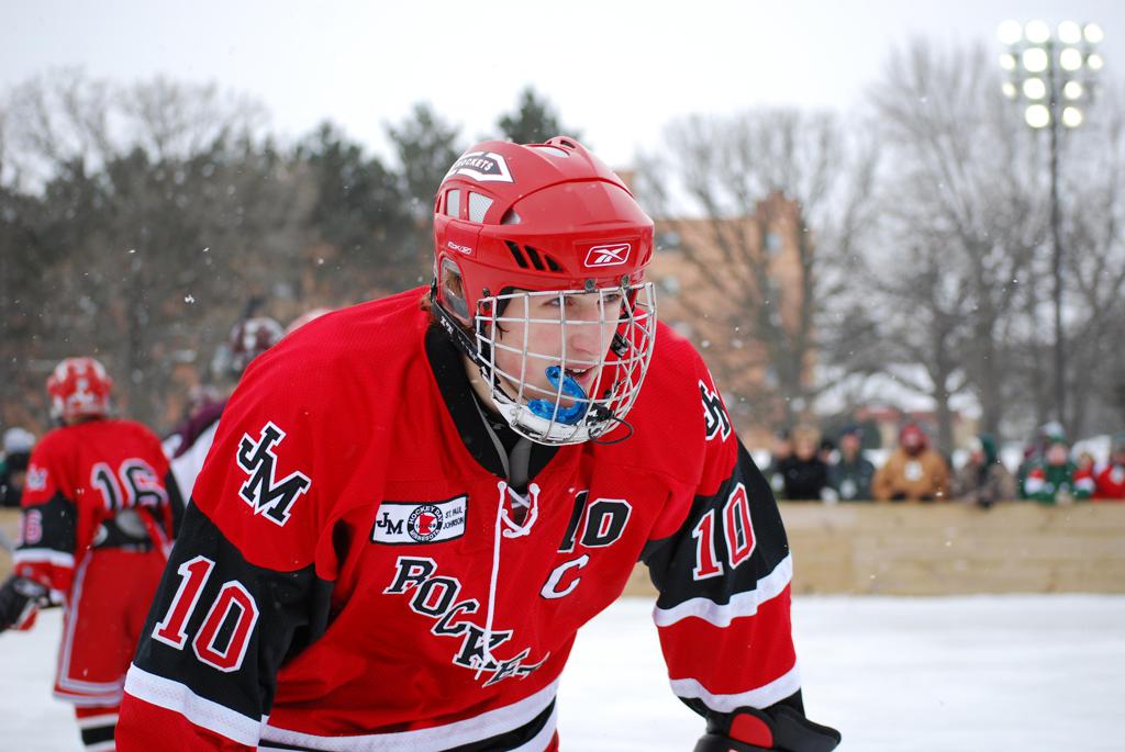 After northern Minnesota Baudette Bay was host to first x2 HDM, this was the perfect location for the Twin Cities first ever Hockey Day Minnesota, hosted at the beautiful outdoor refrigerated ice sheet within historic Phalen Park - where a young Herb Brooks learned to play hockey in eastside St. Paul. The beautiful warming house alongside the chain linked fence rink on the net ends added to the vintage nature of outdoor hockey, prior to the fully enclosed glass rinks now seen yearly at HDM. With light snow that fell during the games, and fans packing into the 'arena' for the marquee game featuring home-town St. Paul Johnson Governors vs. southern Minnesota Rochester John Marshall Rockets - it made for some amazing photos in stunning red (Rockets) and white/maroon (Governors) uniforms.
