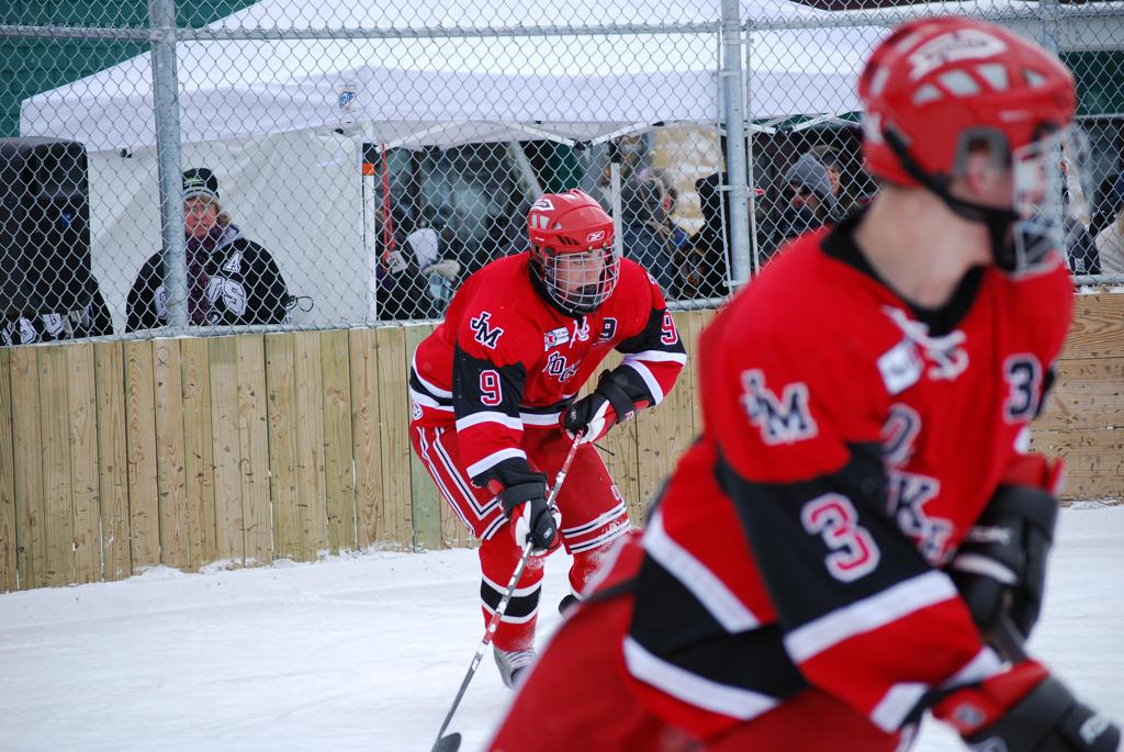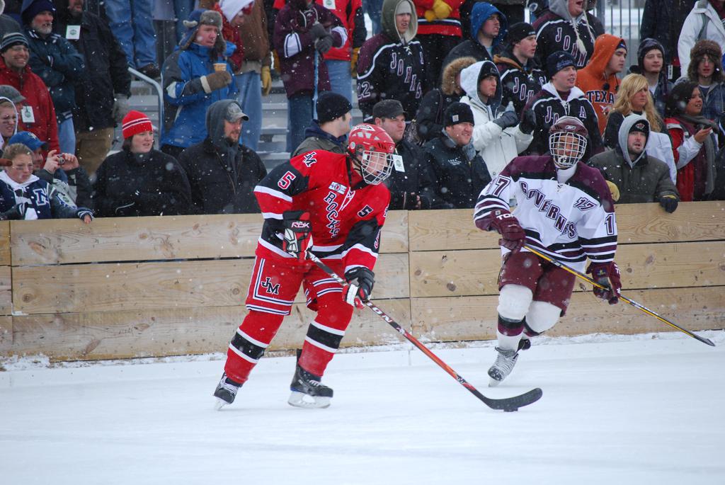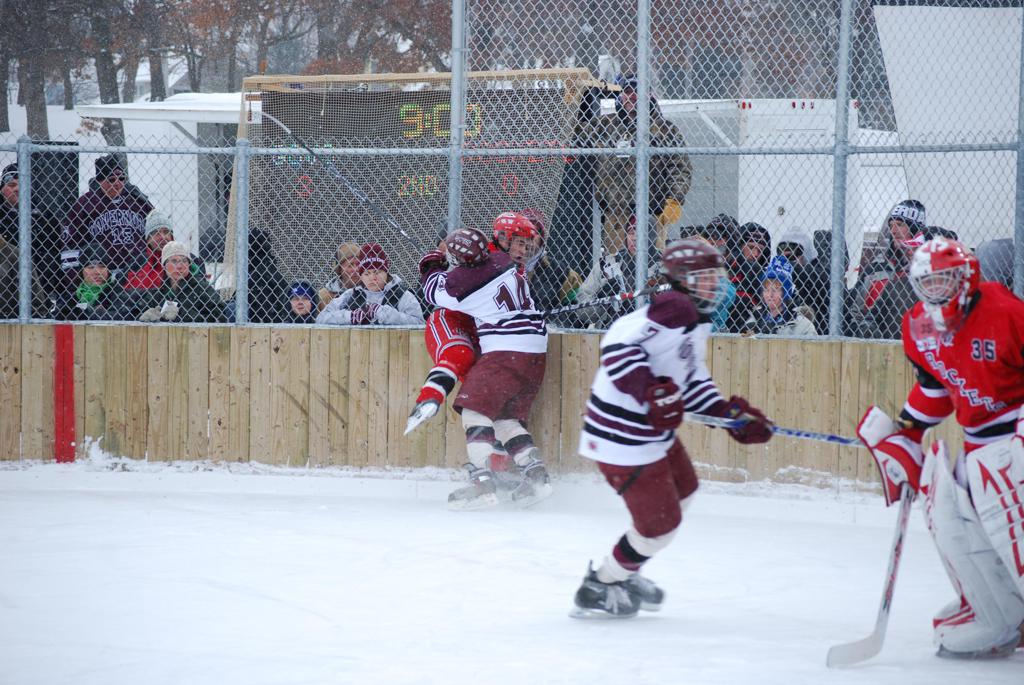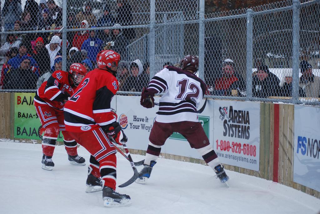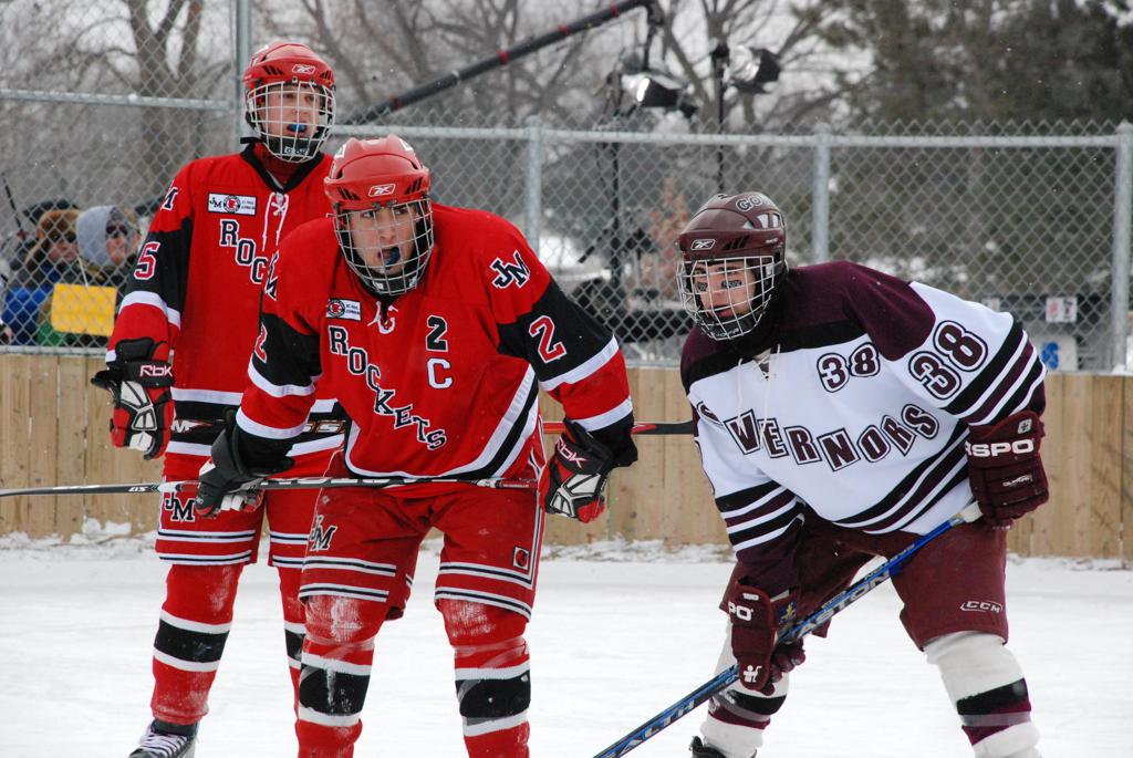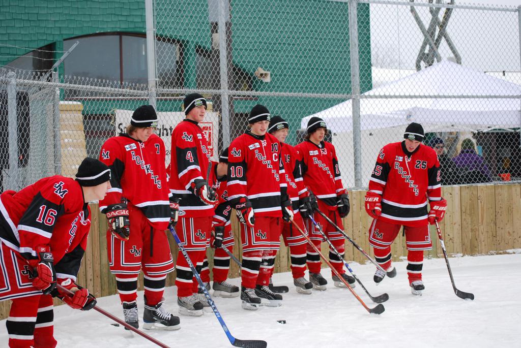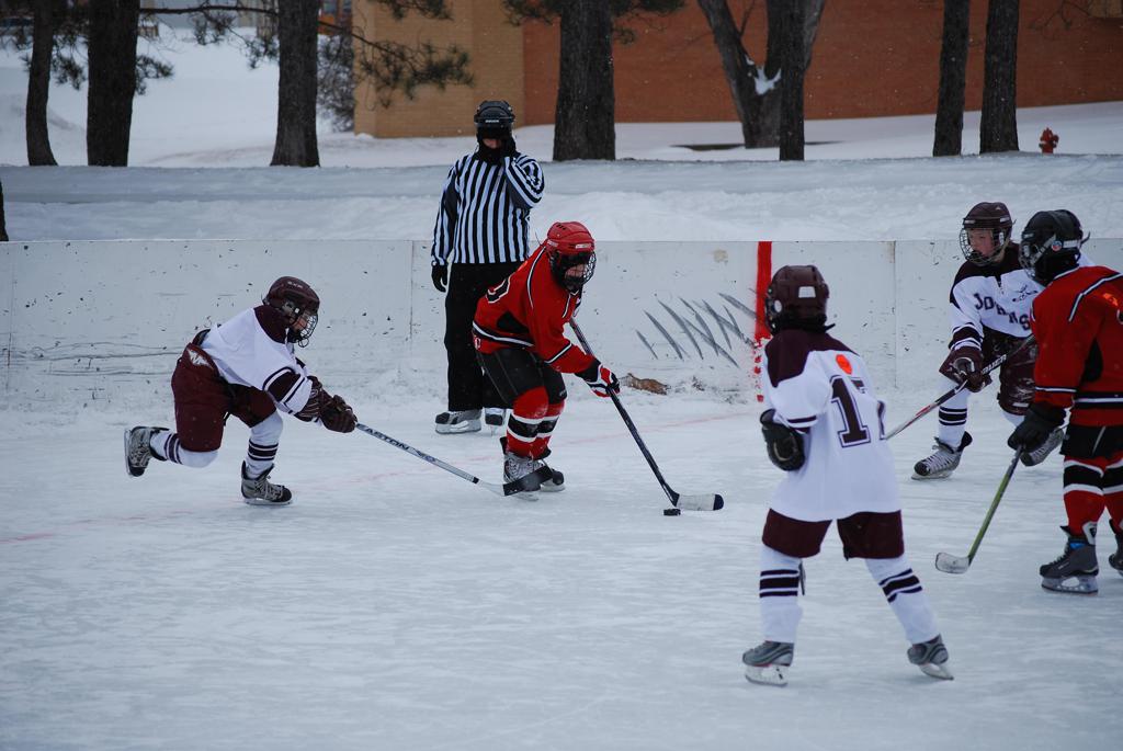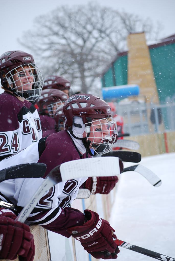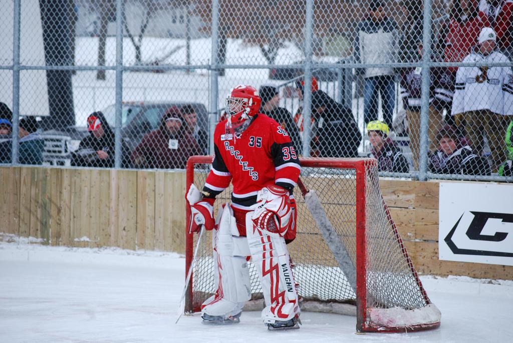 After northern Minnesota Baudette Bay was host to first x2 HDM, this was the perfect location for the Twin Cities first ever Hockey Day Minnesota, hosted at the beautiful outdoor refrigerated ice sheet within historic Phalen Park - where a young Herb Brooks learned to play hockey in eastside St. Paul. The beautiful warming house alongside the chain linked fence rink on the net ends added to the vintage nature of outdoor hockey, prior to the fully enclosed glass rinks now seen yearly at HDM. With light snow that fell during the games, and fans packing into the 'arena' for the marquee game featuring home-town St. Paul Johnson Governors vs. southern Minnesota Rochester John Marshall Rockets - it made for some amazing photos in stunning red (Rockets) and white/maroon (Governors) uniforms.