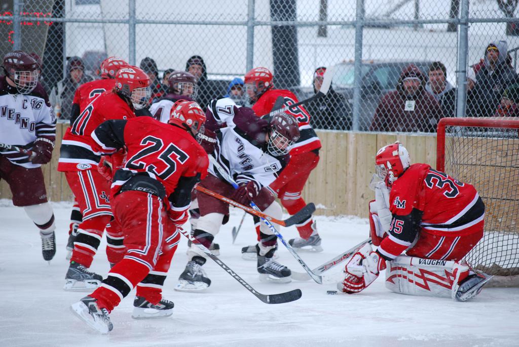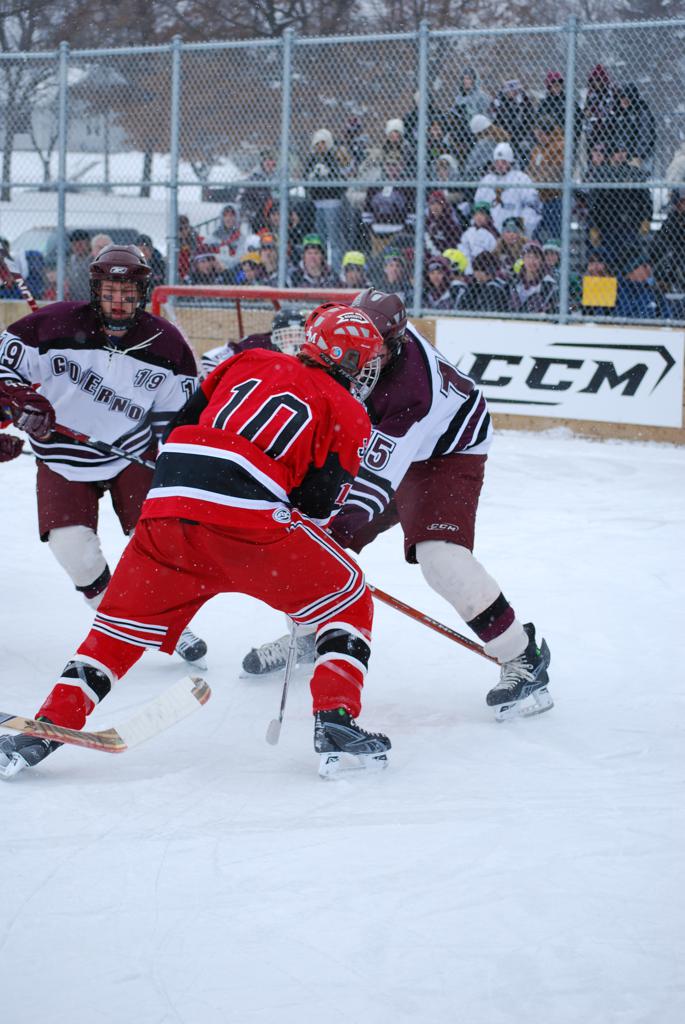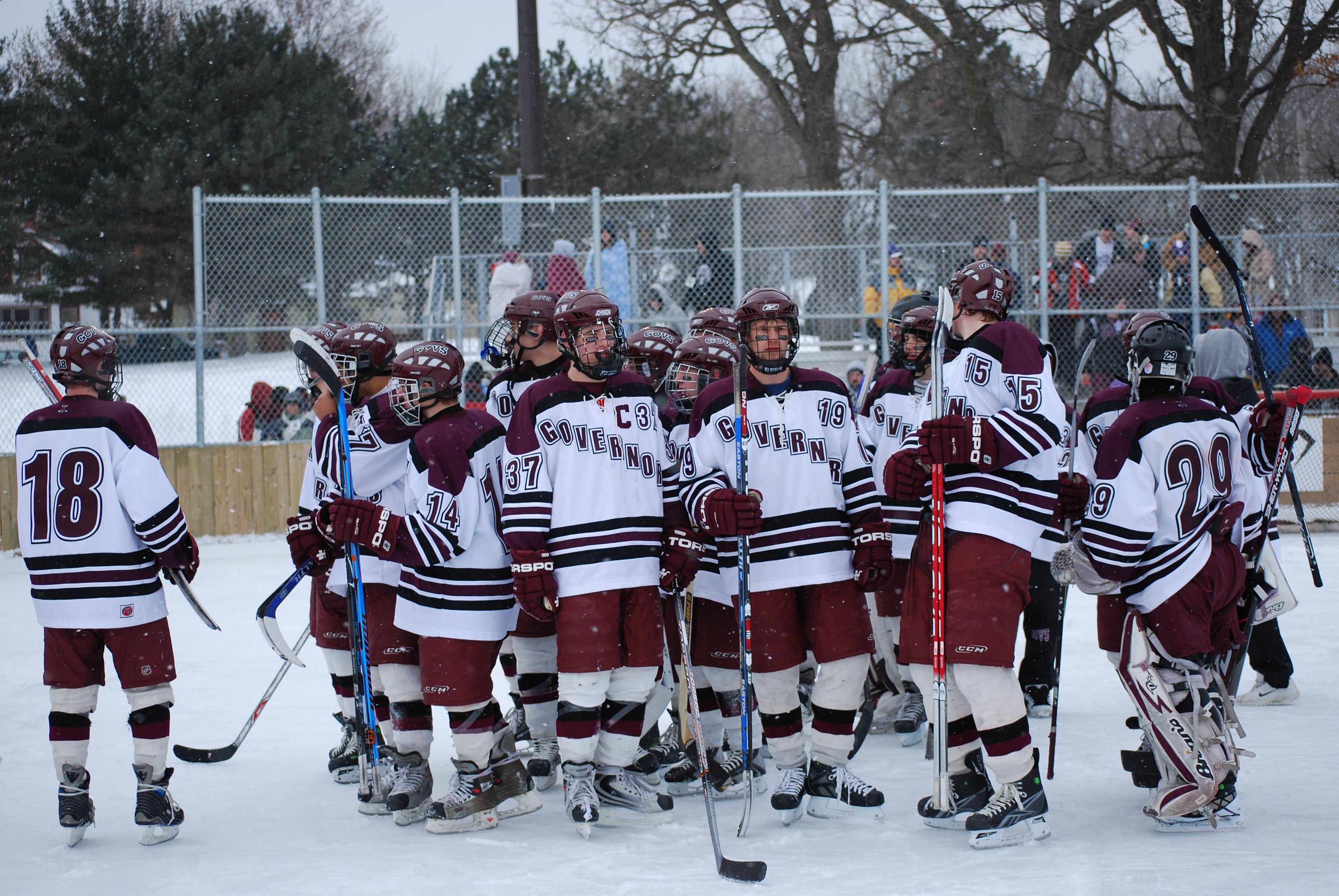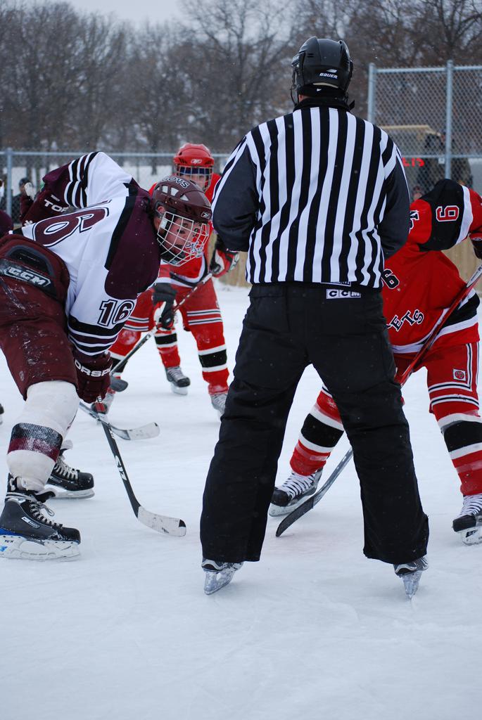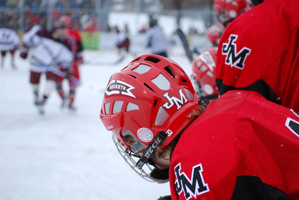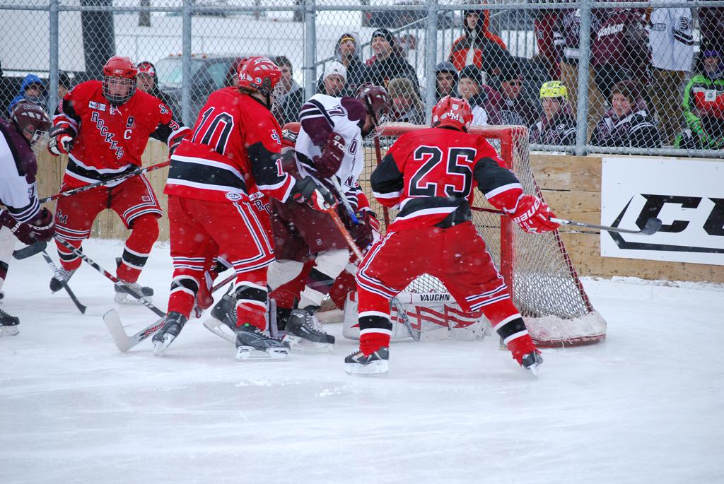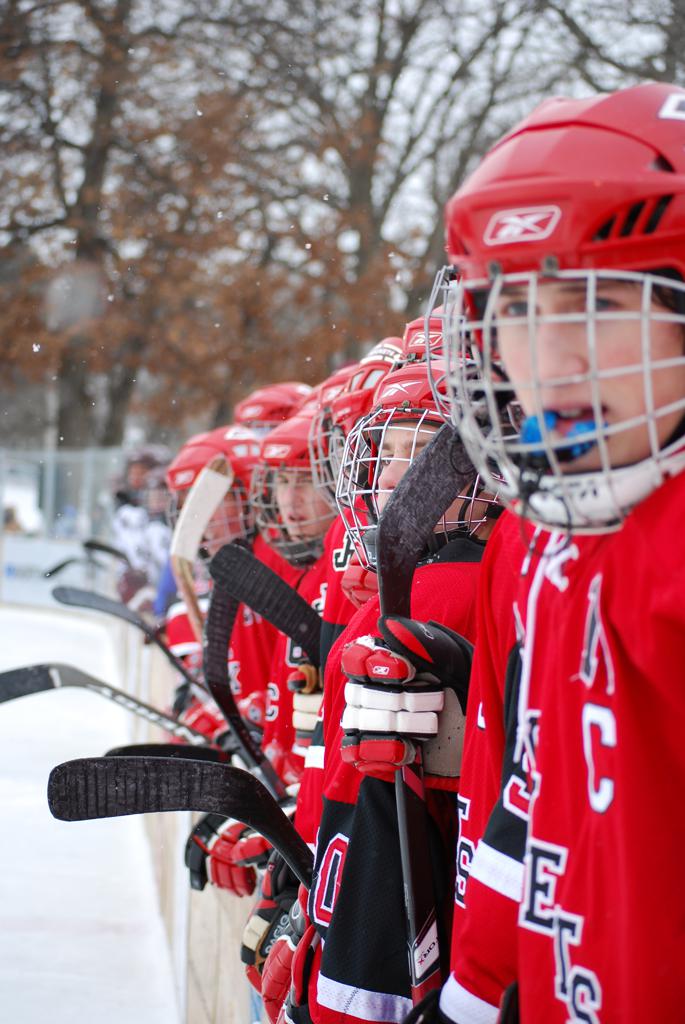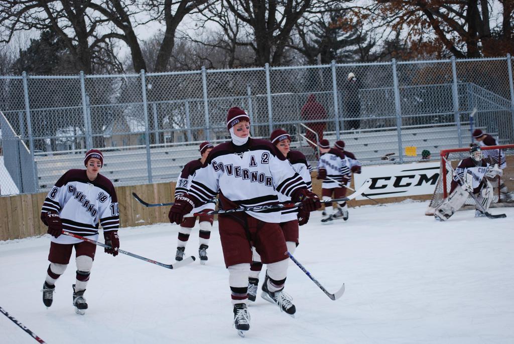 After northern Minnesota Baudette Bay was host to first x2 HDM, this was the perfect location for the Twin Cities first ever Hockey Day Minnesota, hosted at the beautiful outdoor refrigerated ice sheet within historic Phalen Park - where a young Herb Brooks learned to play hockey in eastside St. Paul. The beautiful warming house alongside the chain linked fence rink on the net ends added to the vintage nature of outdoor hockey, prior to the fully enclosed glass rinks now seen yearly at HDM. With light snow that fell during the games, and fans packing into the 'arena' for the marquee game featuring home-town St. Paul Johnson Governors vs. southern Minnesota Rochester John Marshall Rockets - it made for some amazing photos in stunning red (Rockets) and white/maroon (Governors) uniforms.