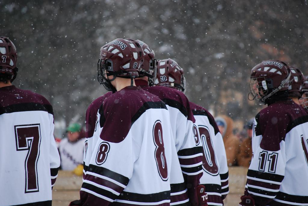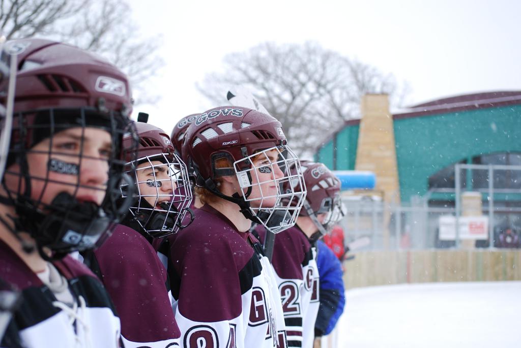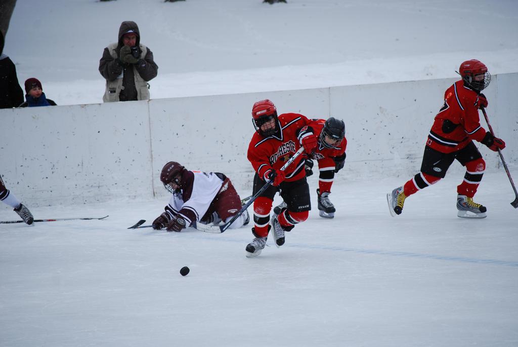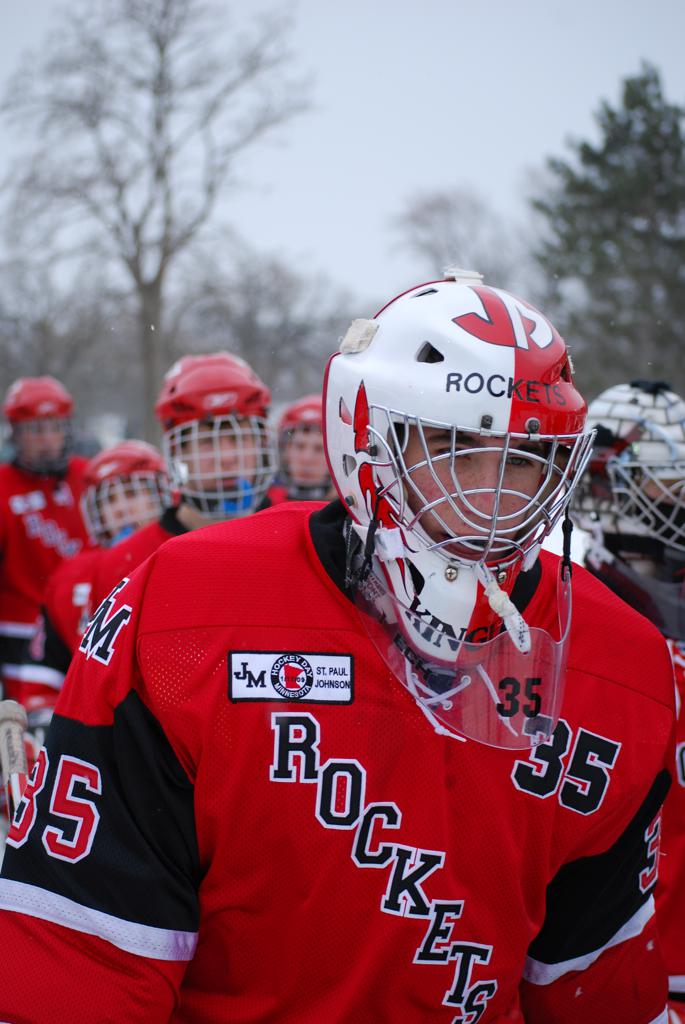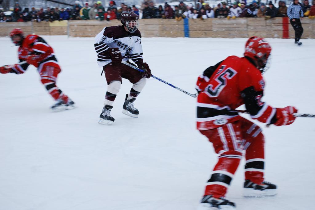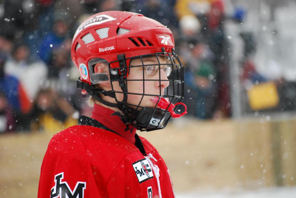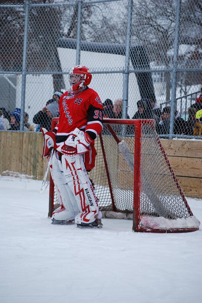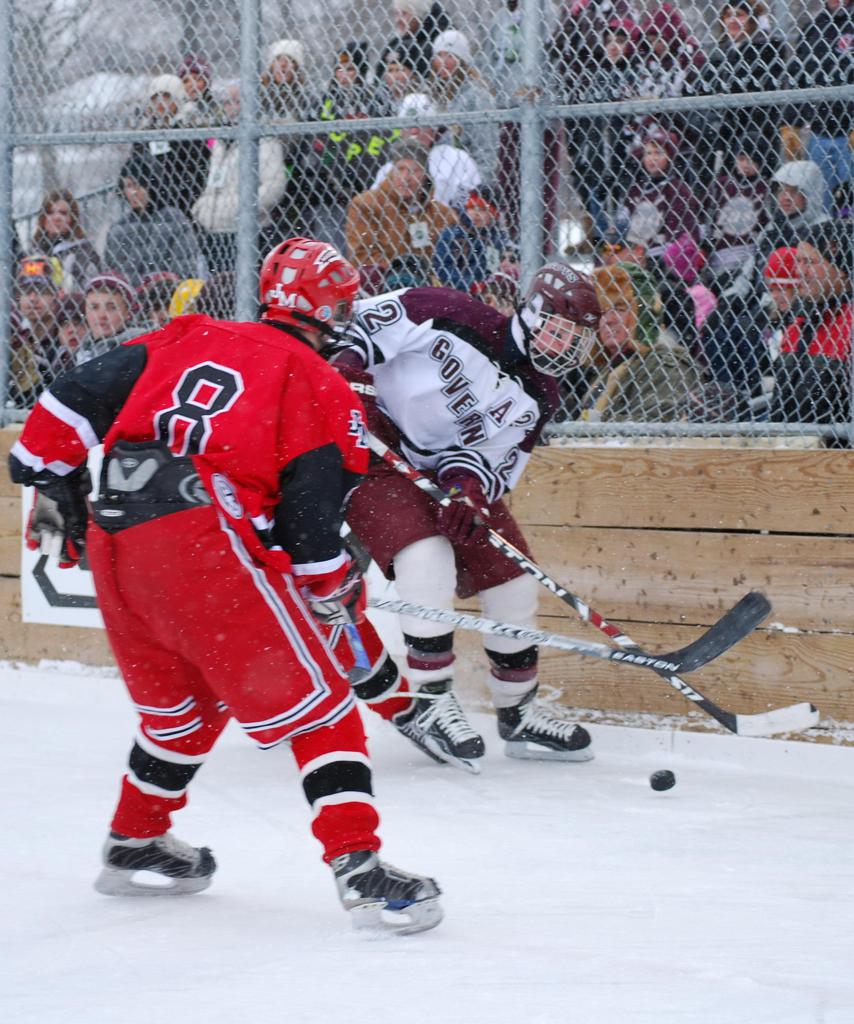 After northern Minnesota Baudette Bay was host to first x2 HDM, this was the perfect location for the Twin Cities first ever Hockey Day Minnesota, hosted at the beautiful outdoor refrigerated ice sheet within historic Phalen Park - where a young Herb Brooks learned to play hockey in eastside St. Paul. The beautiful warming house alongside the chain linked fence rink on the net ends added to the vintage nature of outdoor hockey, prior to the fully enclosed glass rinks now seen yearly at HDM. With light snow that fell during the games, and fans packing into the 'arena' for the marquee game featuring home-town St. Paul Johnson Governors vs. southern Minnesota Rochester John Marshall Rockets - it made for some amazing photos in stunning red (Rockets) and white/maroon (Governors) uniforms.