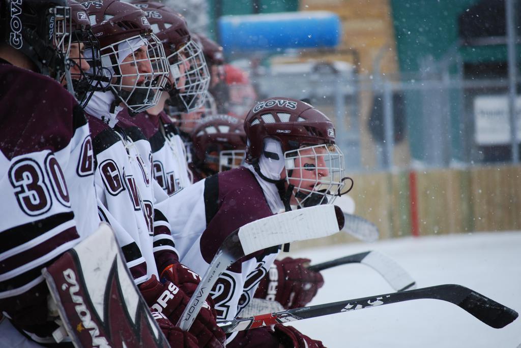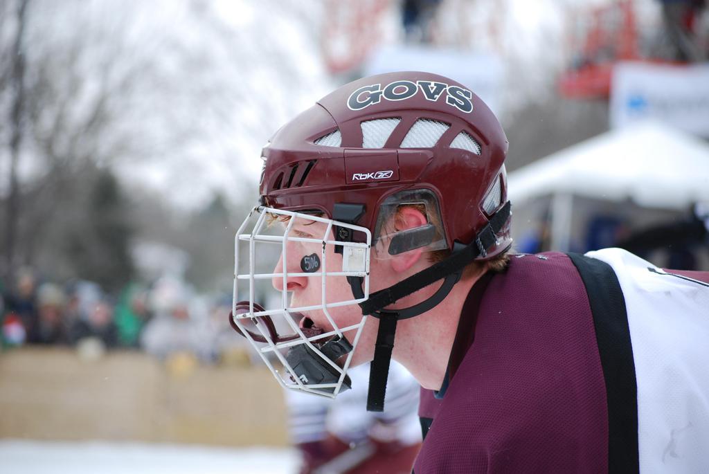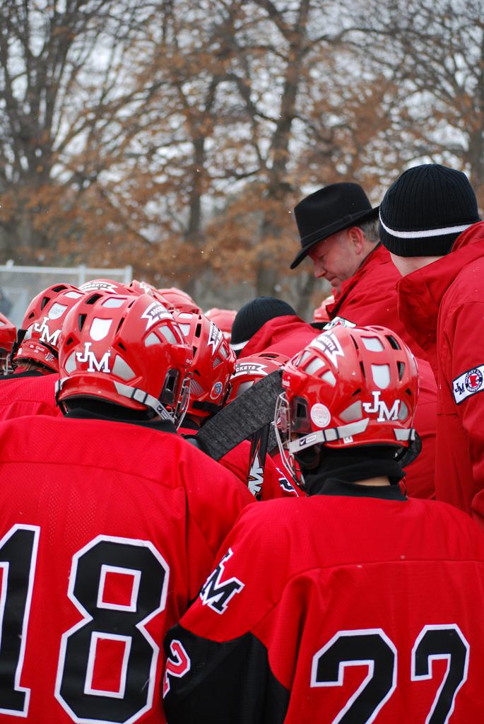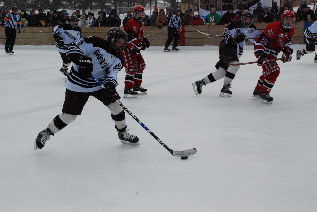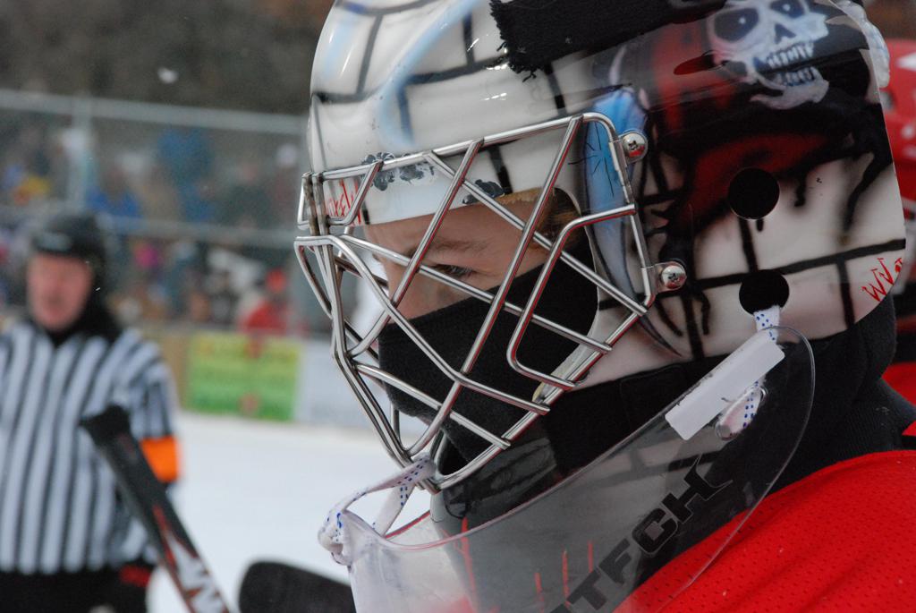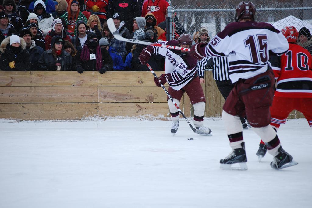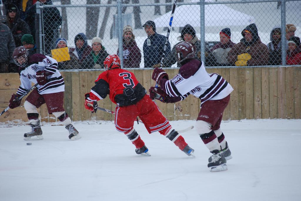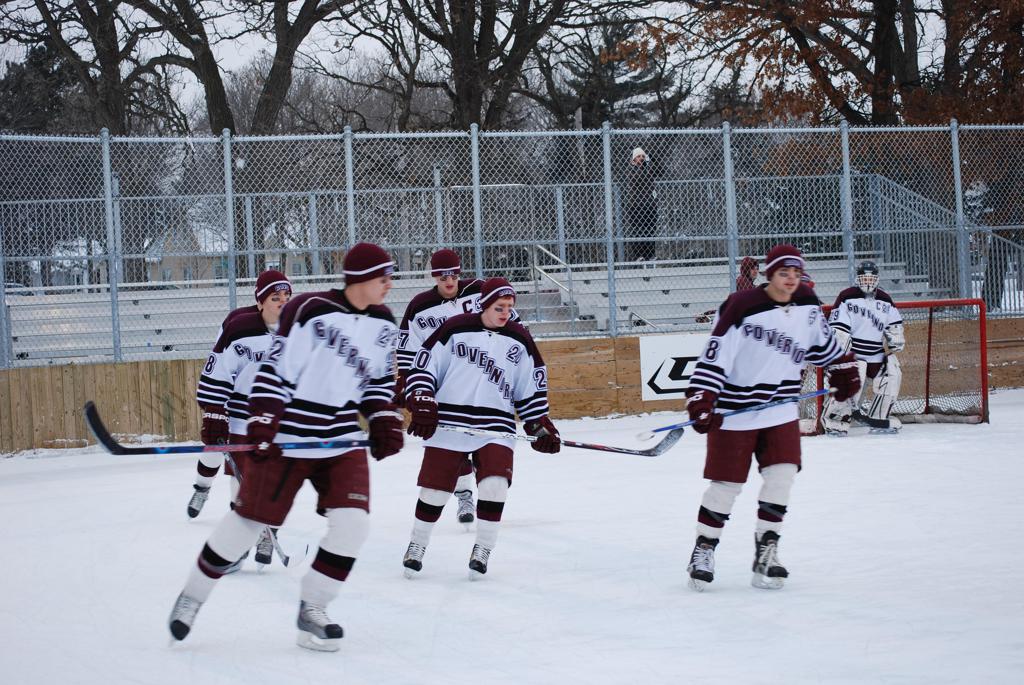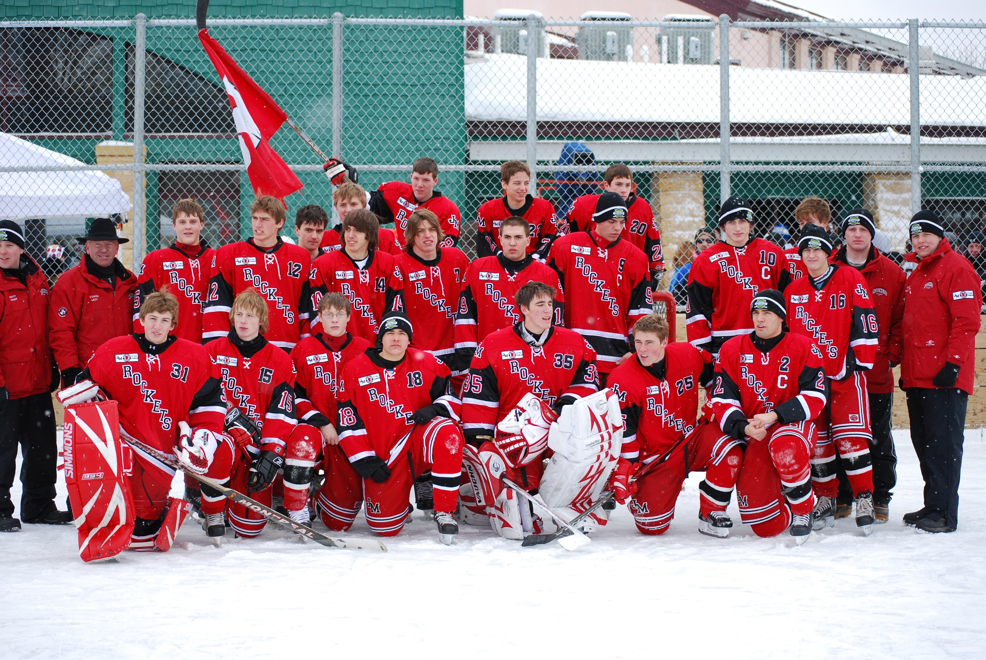 After northern Minnesota Baudette Bay was host to first x2 HDM, this was the perfect location for the Twin Cities first ever Hockey Day Minnesota, hosted at the beautiful outdoor refrigerated ice sheet within historic Phalen Park - where a young Herb Brooks learned to play hockey in eastside St. Paul. The beautiful warming house alongside the chain linked fence rink on the net ends added to the vintage nature of outdoor hockey, prior to the fully enclosed glass rinks now seen yearly at HDM. With light snow that fell during the games, and fans packing into the 'arena' for the marquee game featuring home-town St. Paul Johnson Governors vs. southern Minnesota Rochester John Marshall Rockets - it made for some amazing photos in stunning red (Rockets) and white/maroon (Governors) uniforms.