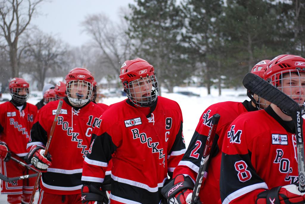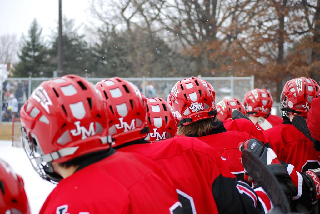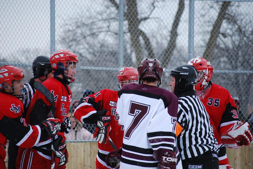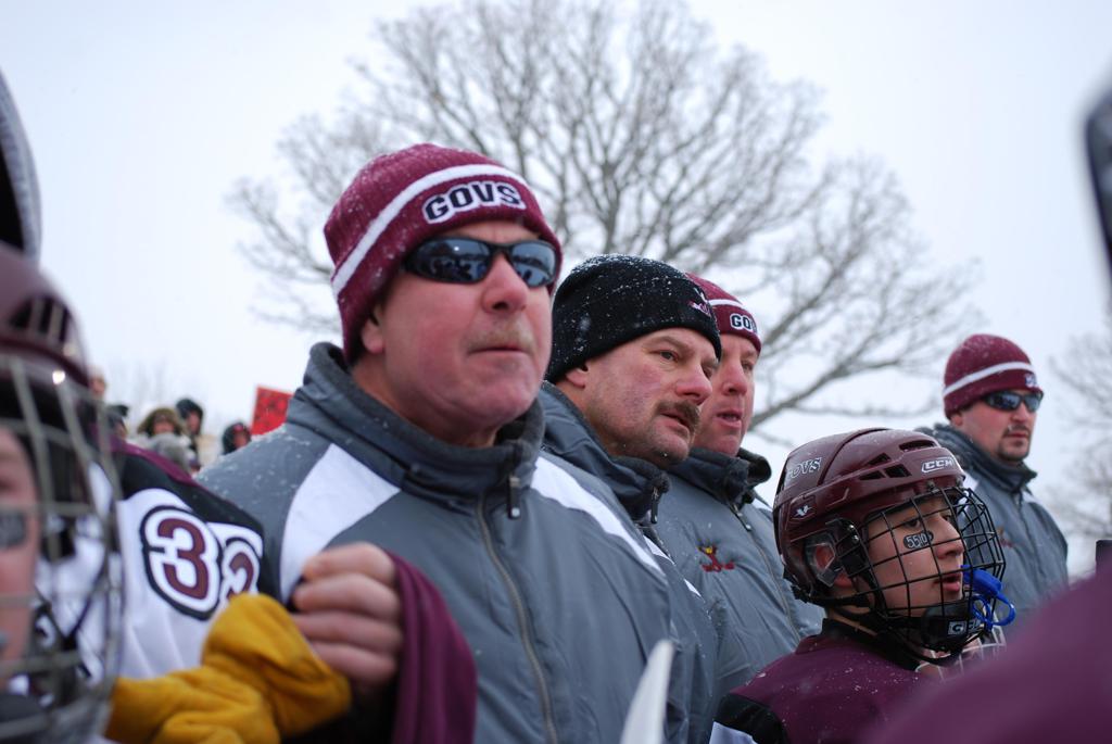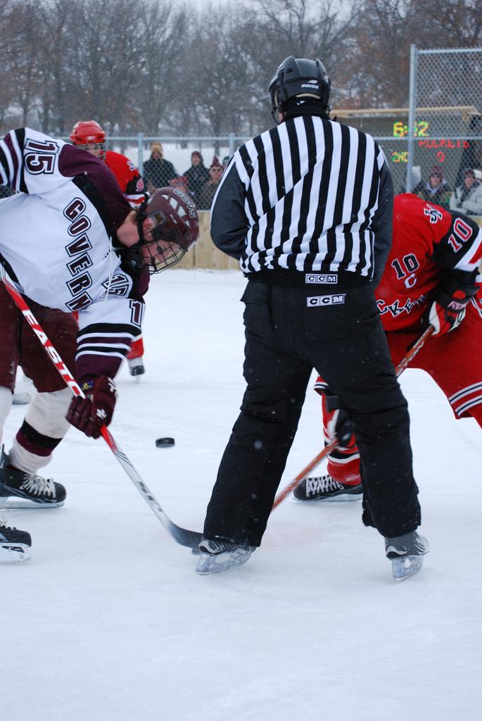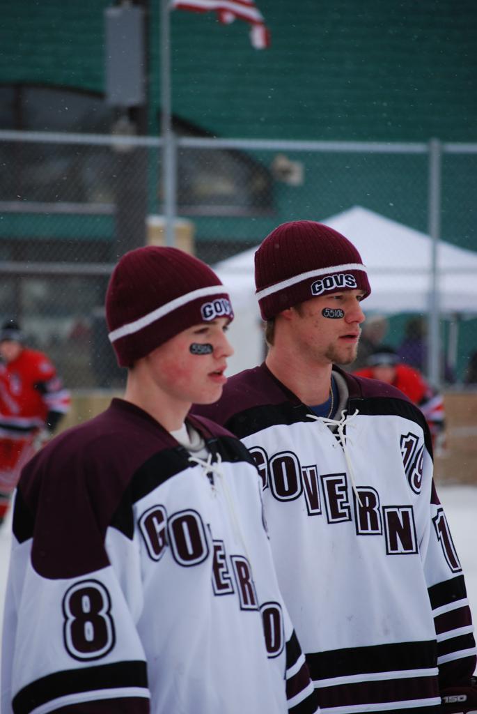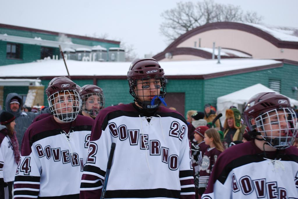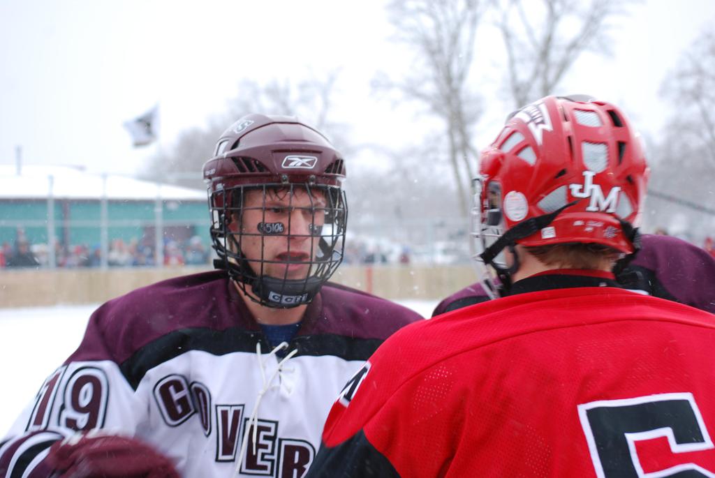 After northern Minnesota Baudette Bay was host to first x2 HDM, this was the perfect location for the Twin Cities first ever Hockey Day Minnesota, hosted at the beautiful outdoor refrigerated ice sheet within historic Phalen Park - where a young Herb Brooks learned to play hockey in eastside St. Paul. The beautiful warming house alongside the chain linked fence rink on the net ends added to the vintage nature of outdoor hockey, prior to the fully enclosed glass rinks now seen yearly at HDM. With light snow that fell during the games, and fans packing into the 'arena' for the marquee game featuring home-town St. Paul Johnson Governors vs. southern Minnesota Rochester John Marshall Rockets - it made for some amazing photos in stunning red (Rockets) and white/maroon (Governors) uniforms.