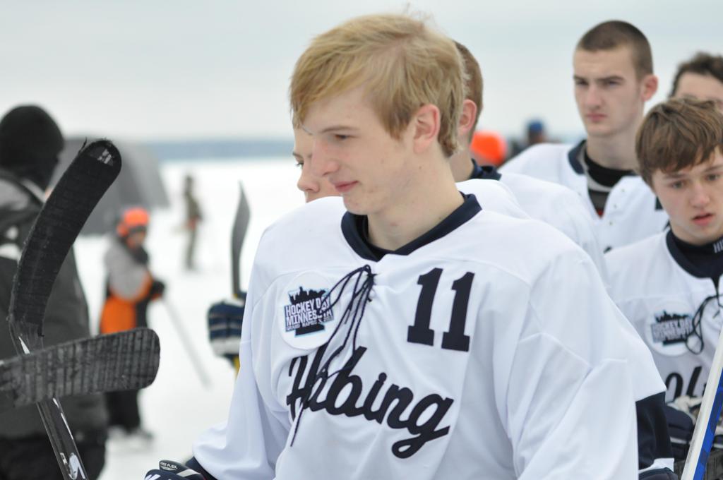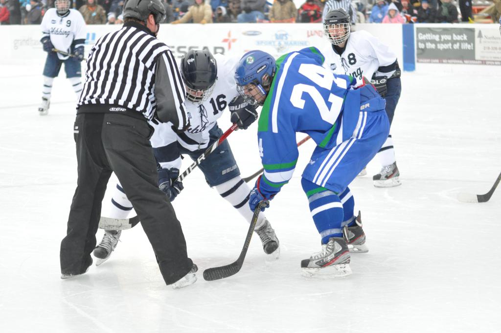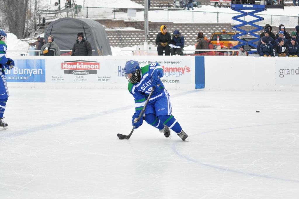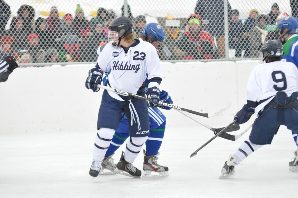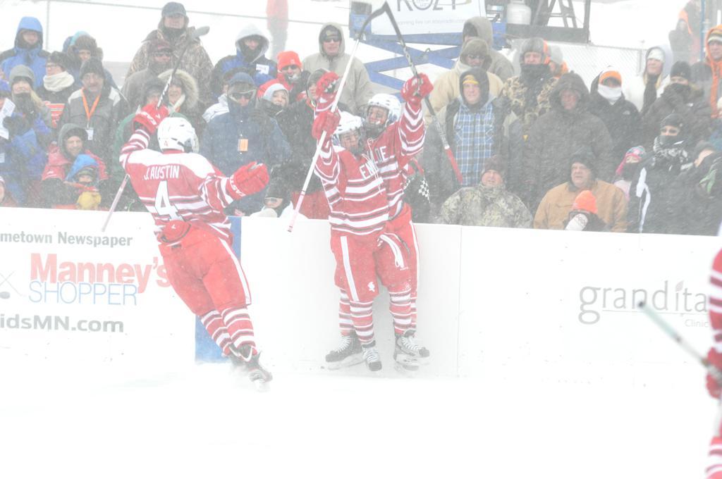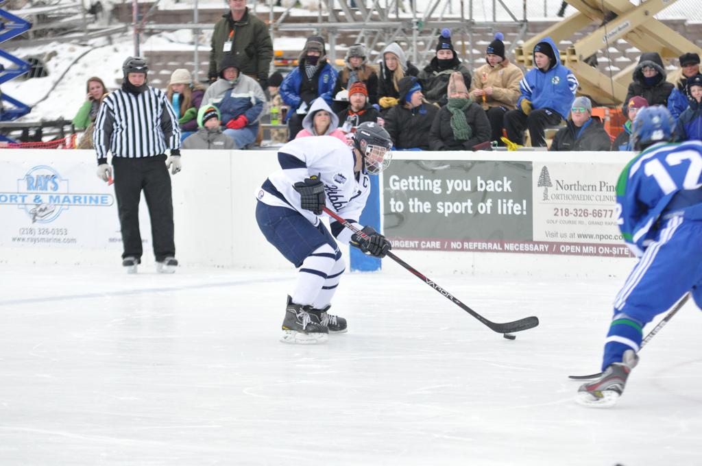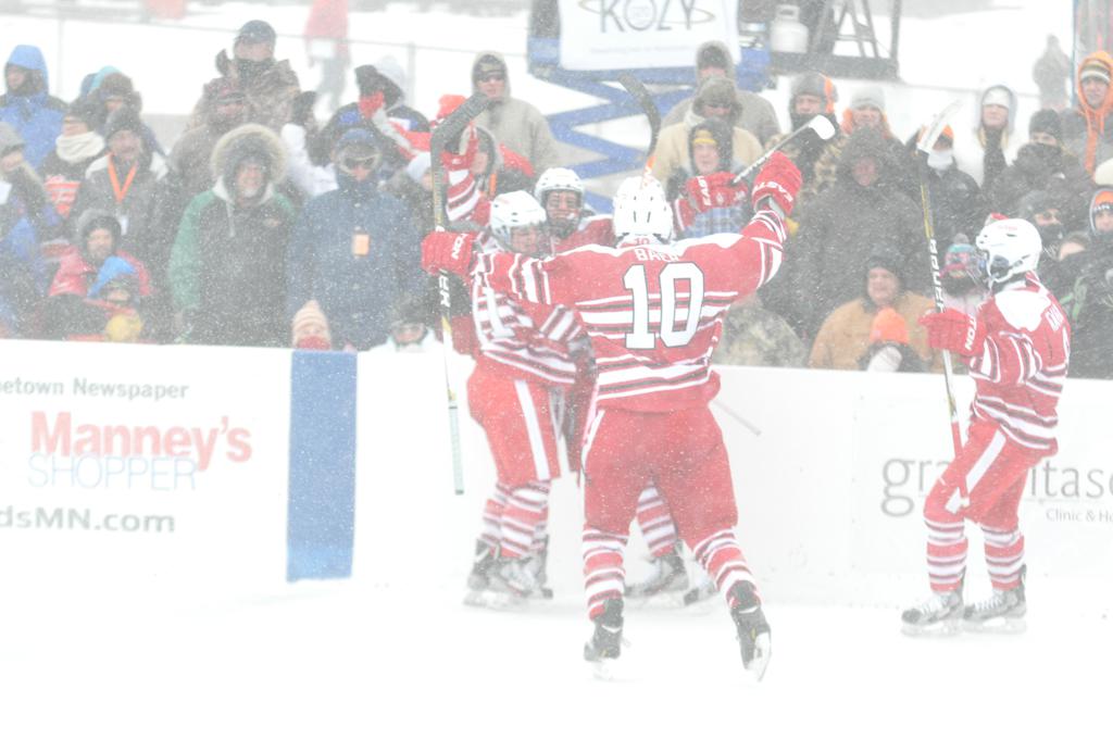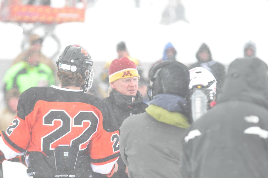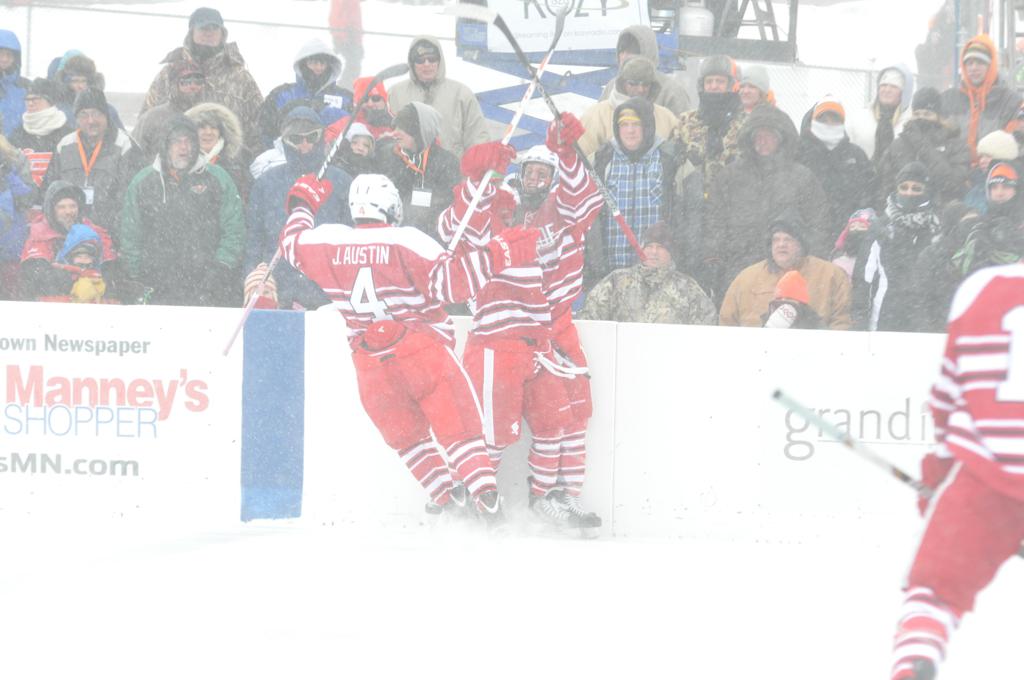 The day would start off with the girls Grand Rapids-Greenway team skunking Hibbing-Chisholm 6-0. Again, this game would not be seen on TV until much later in the evening. It was not a good day for Hibbing-Chisholm, as their boys team fell by a 9-2 margin to Eagan. It would be a good day for Grand Rapids, as the GR boys team was able to get past Benilde-St. Margaret’s with a 3-2 overtime victory. Jack Jablonski who was paralyzed in a game on December 30th, 2011, was on the bench as an assistant coach for the game.