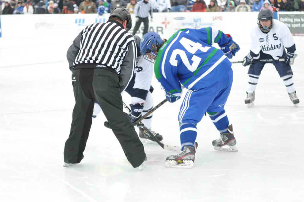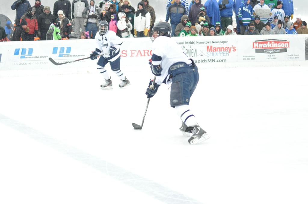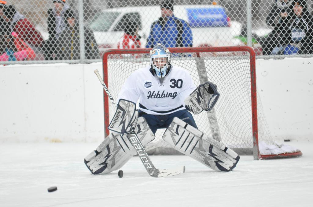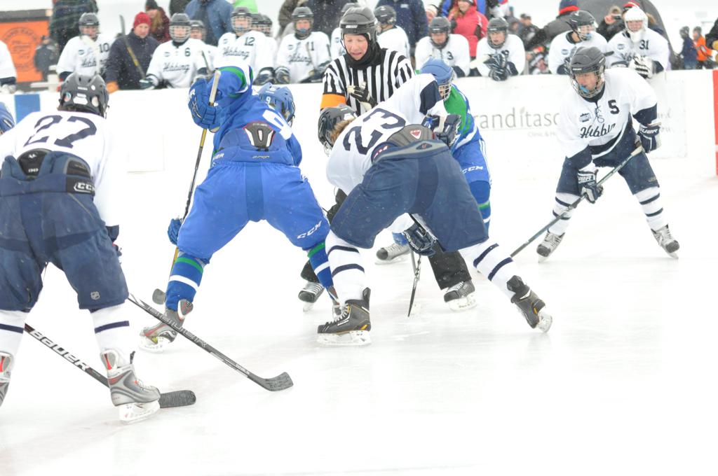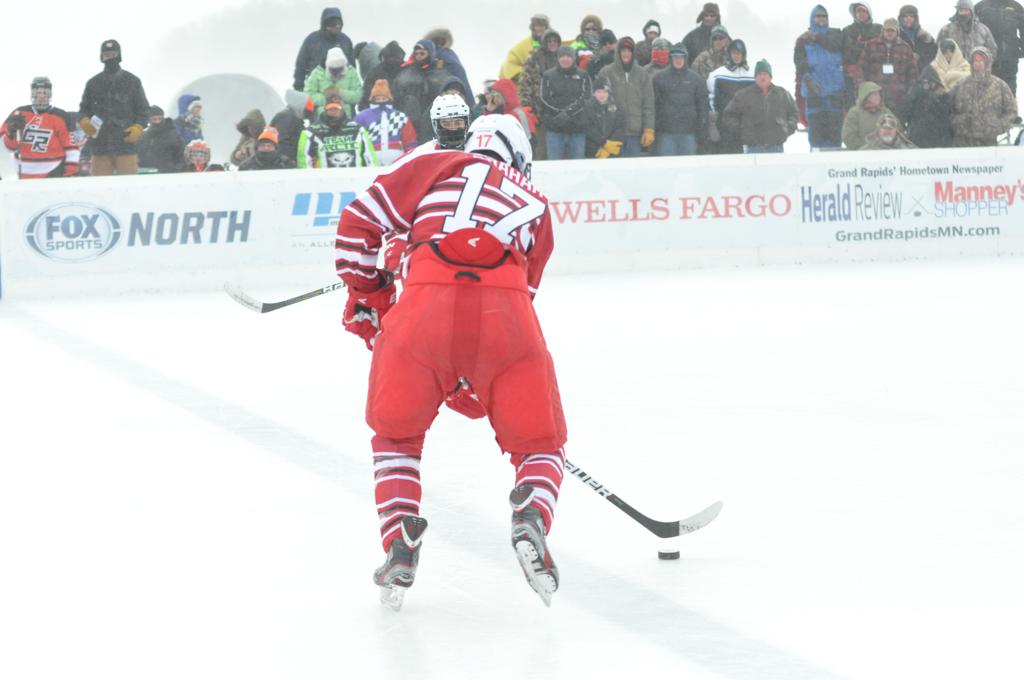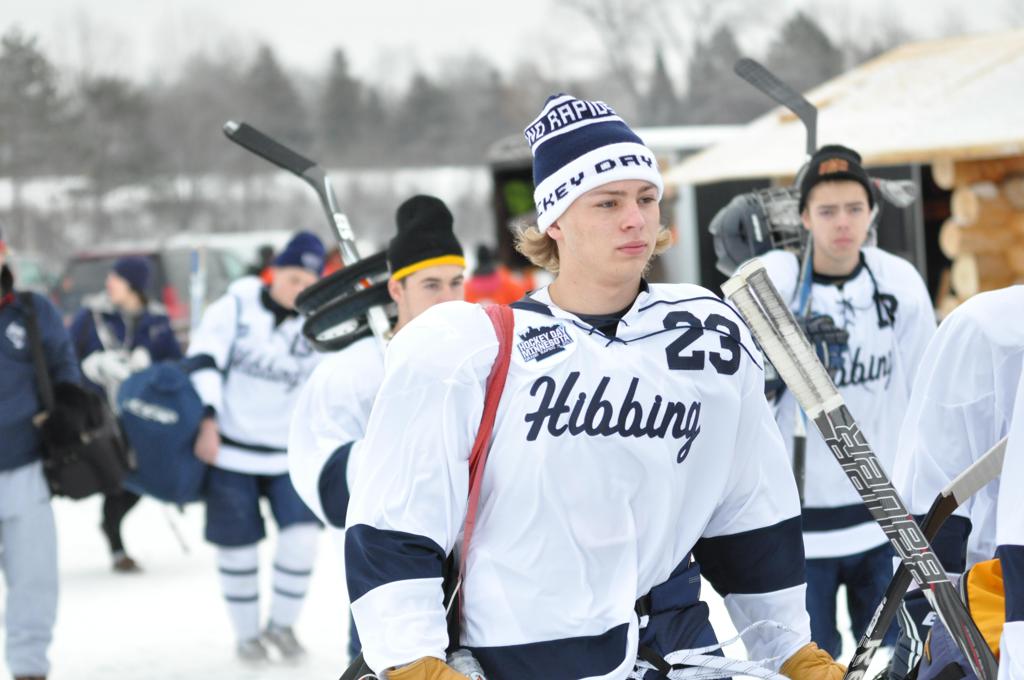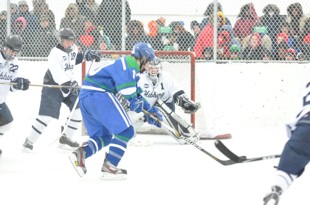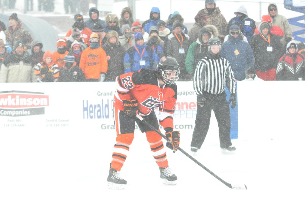 The day would start off with the girls Grand Rapids-Greenway team skunking Hibbing-Chisholm 6-0. Again, this game would not be seen on TV until much later in the evening. It was not a good day for Hibbing-Chisholm, as their boys team fell by a 9-2 margin to Eagan. It would be a good day for Grand Rapids, as the GR boys team was able to get past Benilde-St. Margaret’s with a 3-2 overtime victory. Jack Jablonski who was paralyzed in a game on December 30th, 2011, was on the bench as an assistant coach for the game.