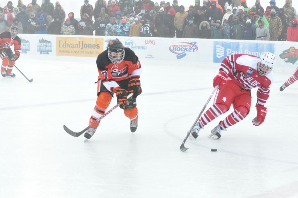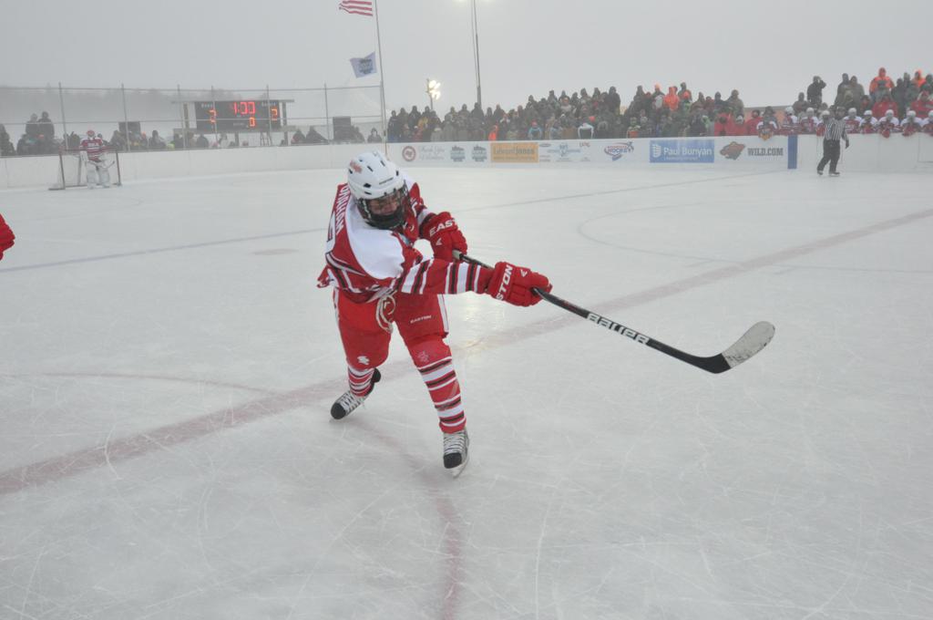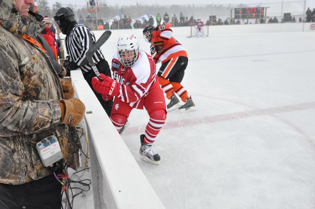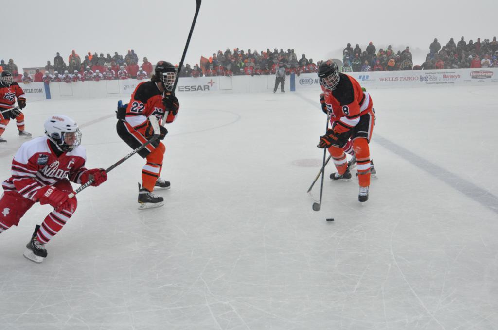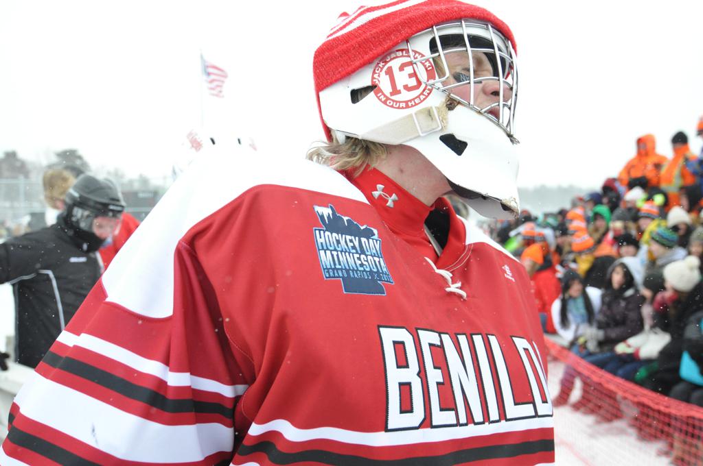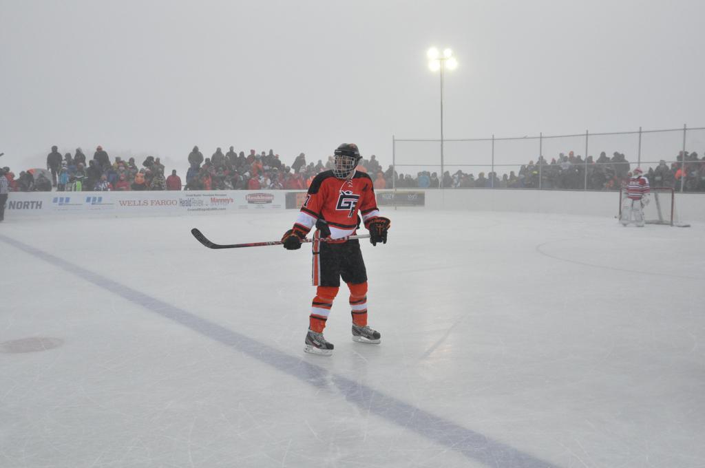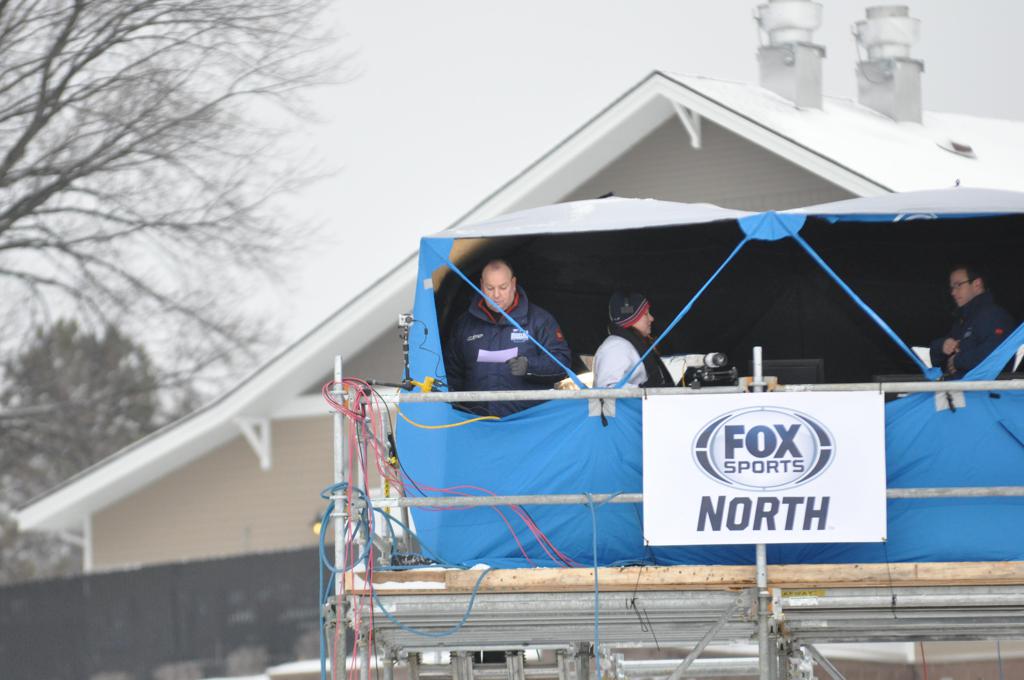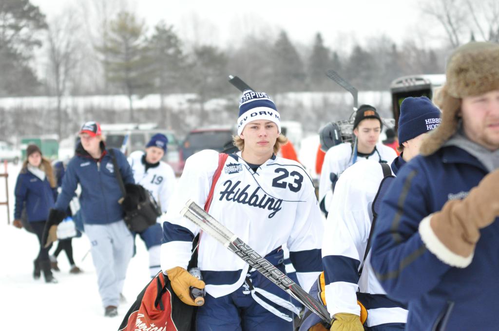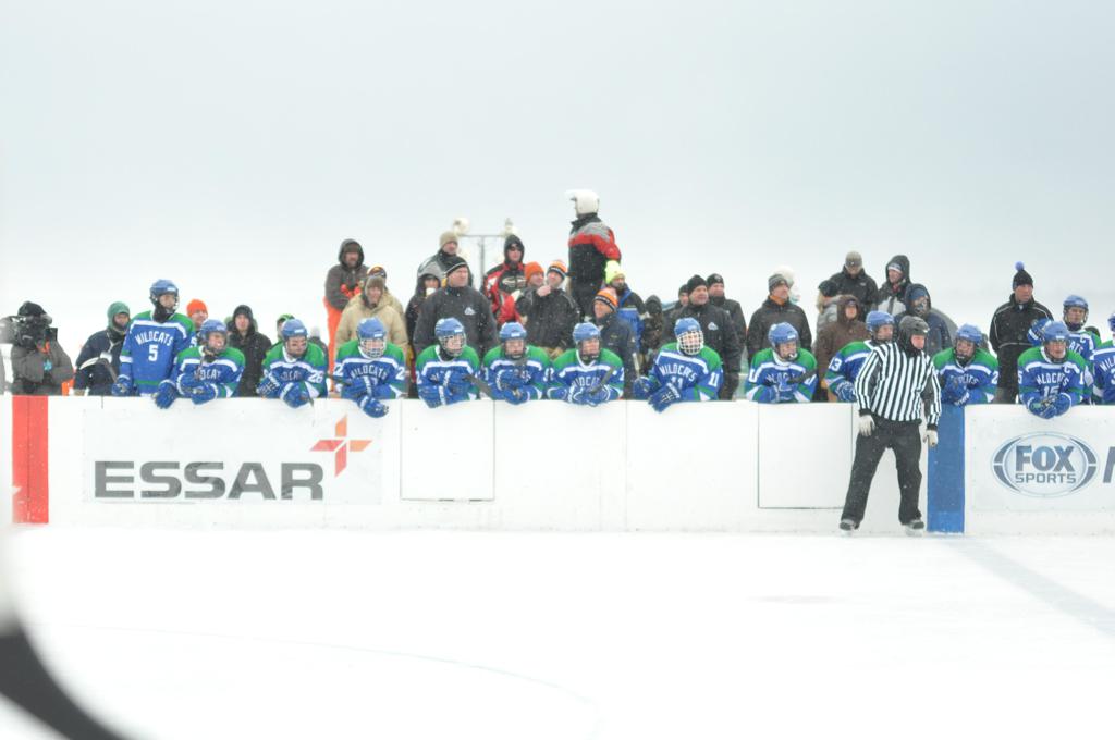The day would start off with the girls Grand Rapids-Greenway team skunking Hibbing-Chisholm 6-0. Again, this game would not be seen on TV until much later in the evening. It was not a good day for Hibbing-Chisholm, as their boys team fell by a 9-2 margin to Eagan. It would be a good day for Grand Rapids, as the GR boys team was able to get past Benilde-St. Margaret’s with a 3-2 overtime victory. Jack Jablonski who was paralyzed in a game on December 30th, 2011, was on the bench as an assistant coach for the game.