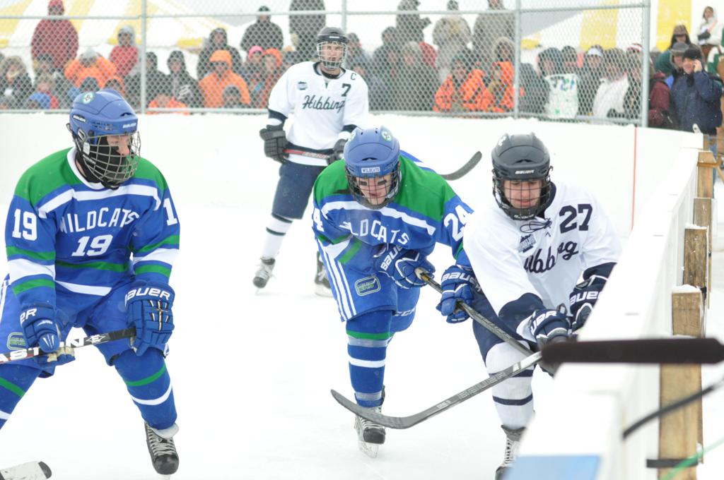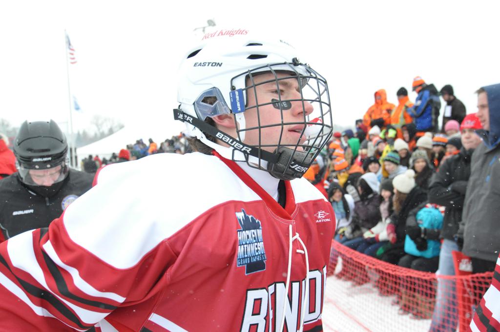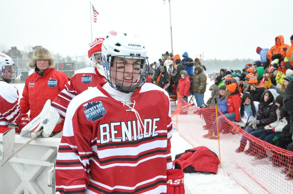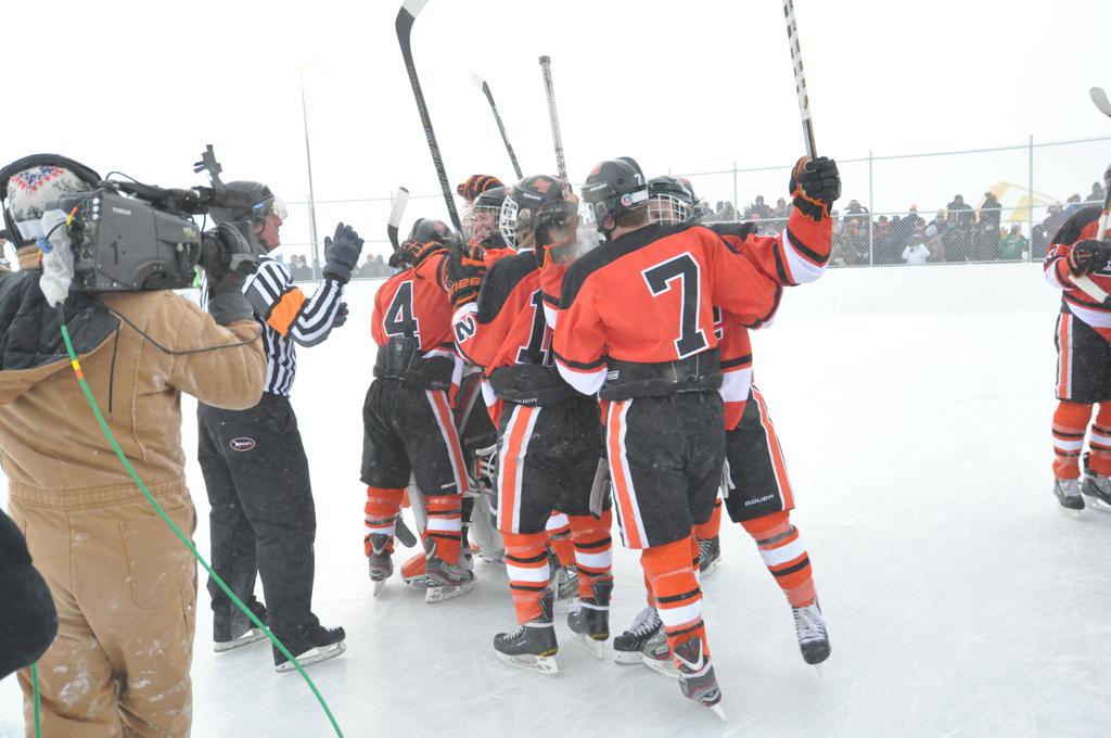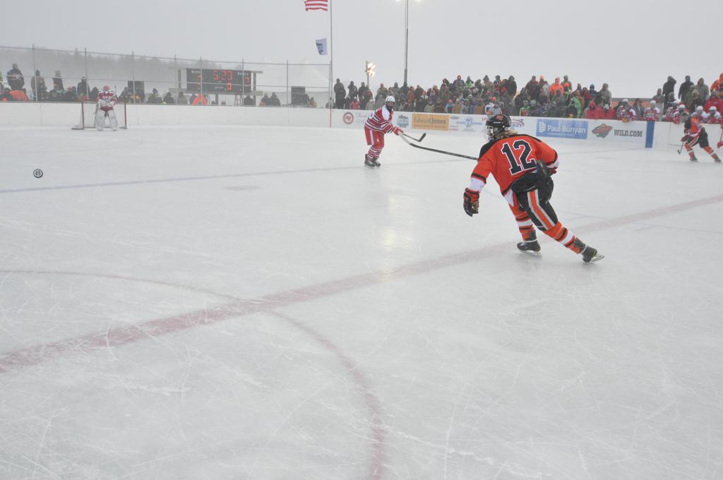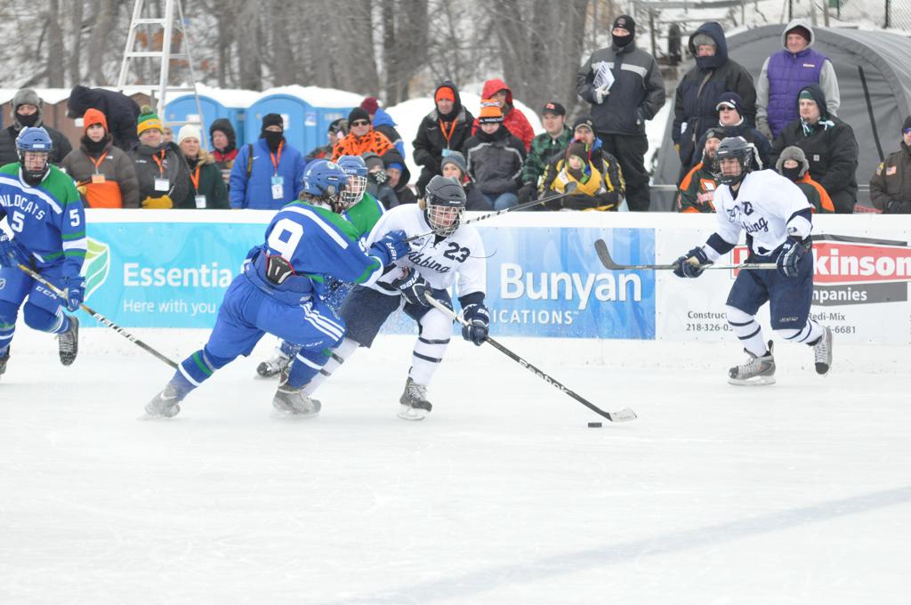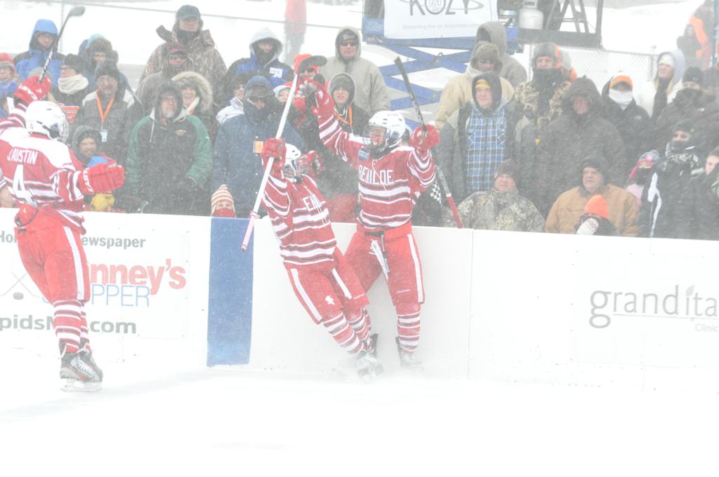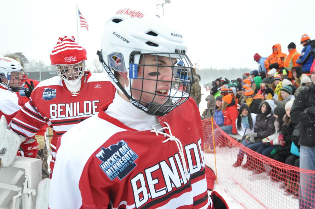 The day would start off with the girls Grand Rapids-Greenway team skunking Hibbing-Chisholm 6-0. Again, this game would not be seen on TV until much later in the evening. It was not a good day for Hibbing-Chisholm, as their boys team fell by a 9-2 margin to Eagan. It would be a good day for Grand Rapids, as the GR boys team was able to get past Benilde-St. Margaret’s with a 3-2 overtime victory. Jack Jablonski who was paralyzed in a game on December 30th, 2011, was on the bench as an assistant coach for the game.