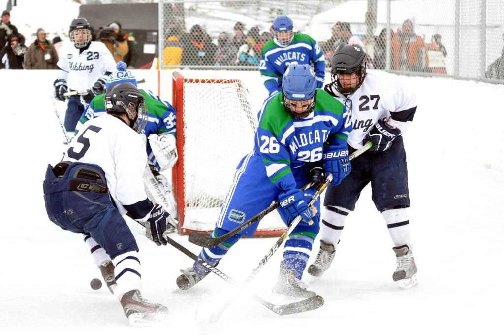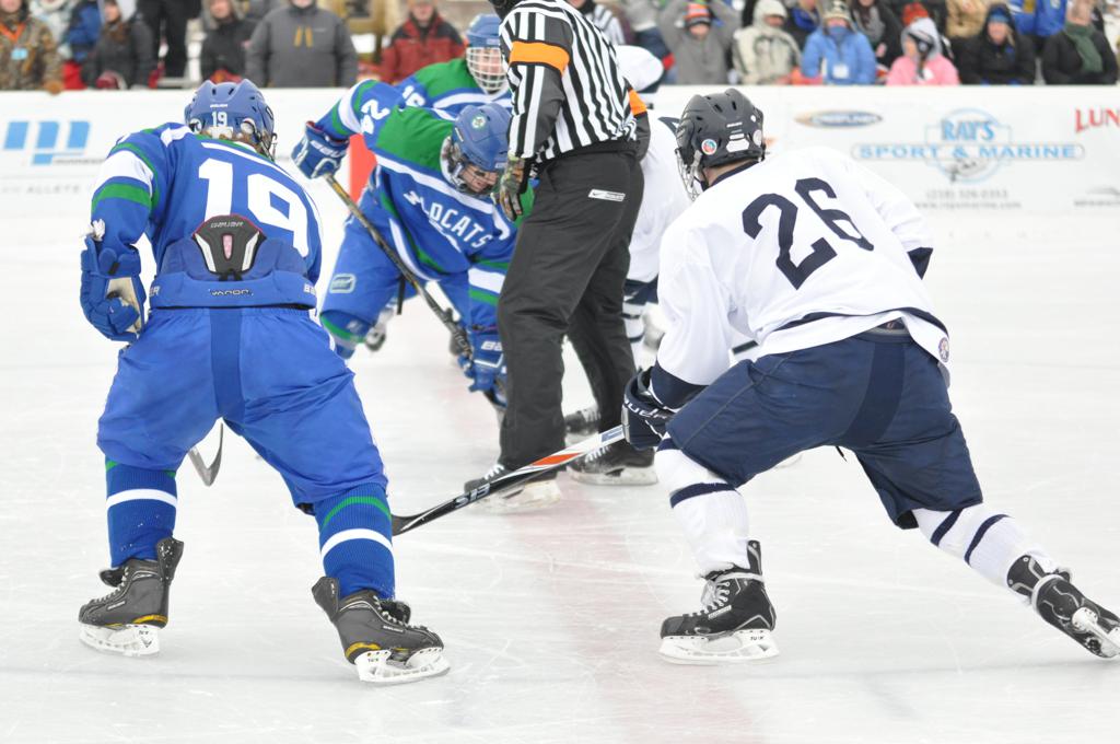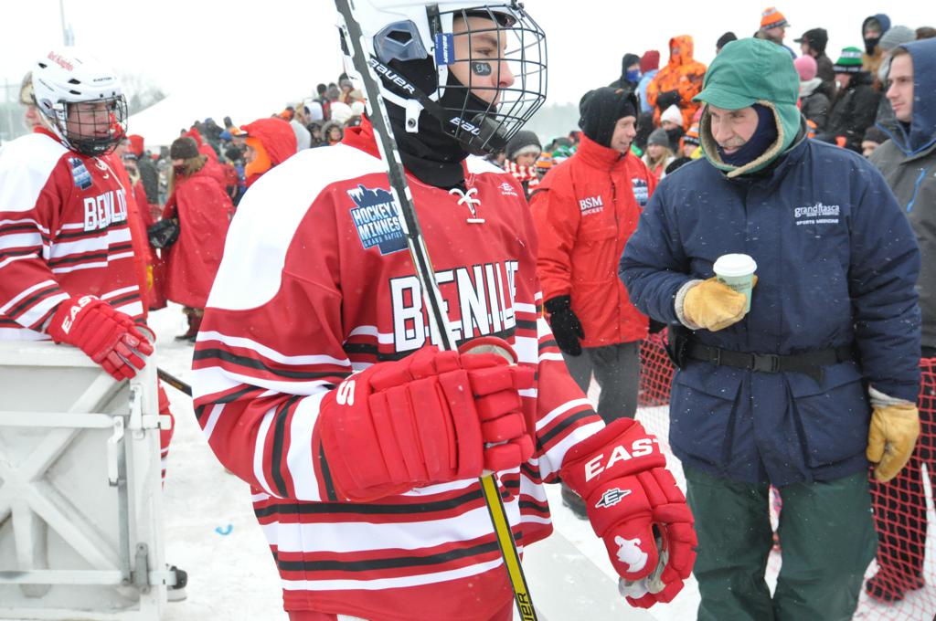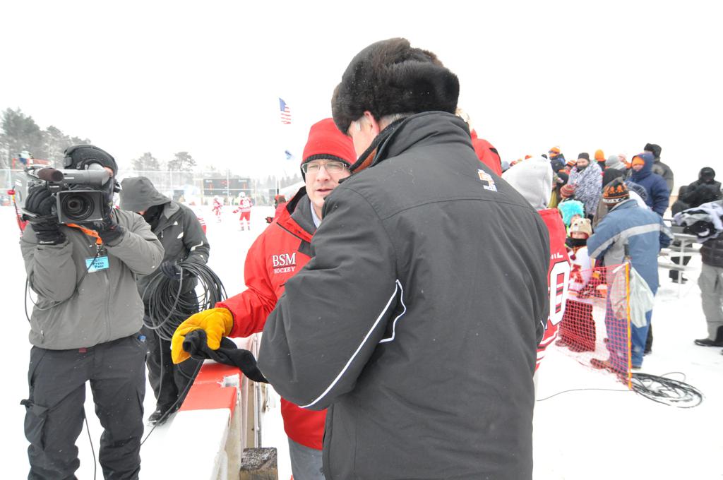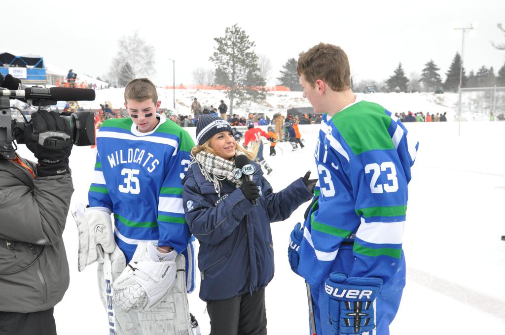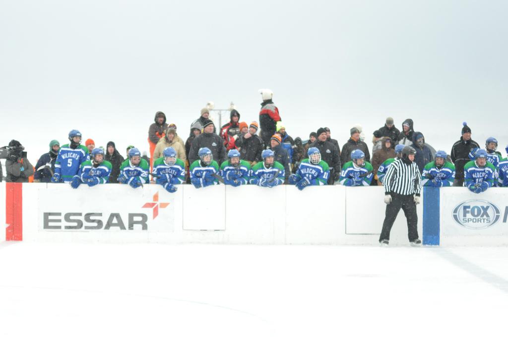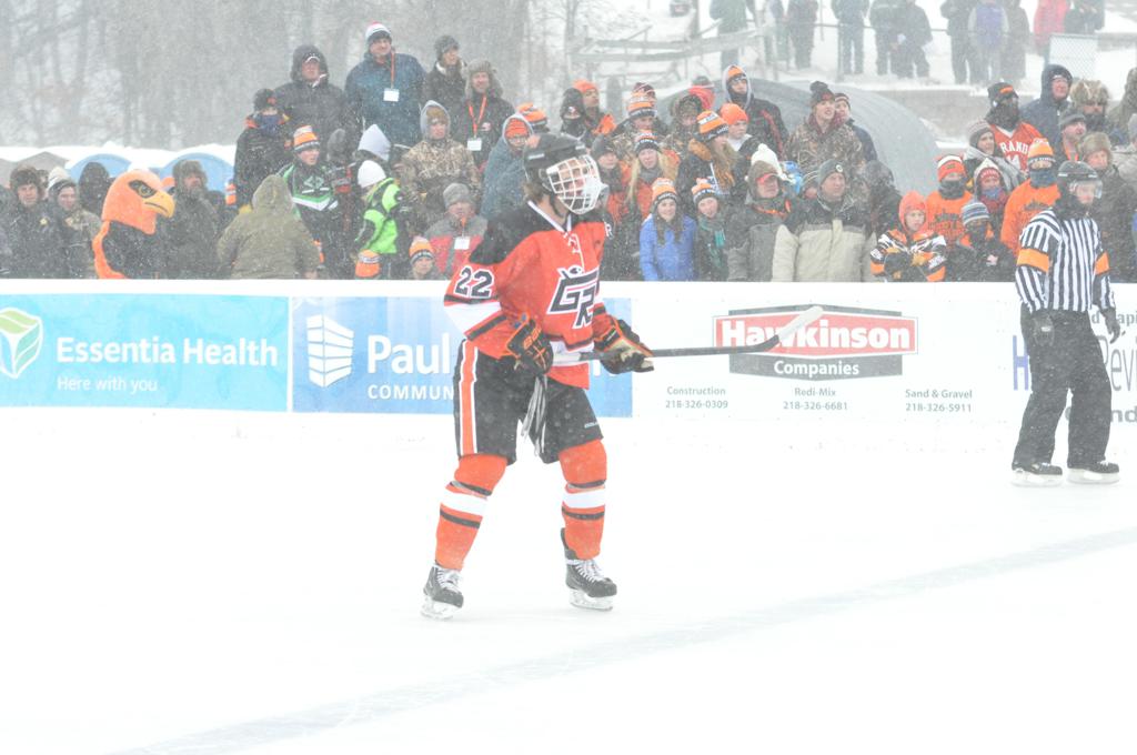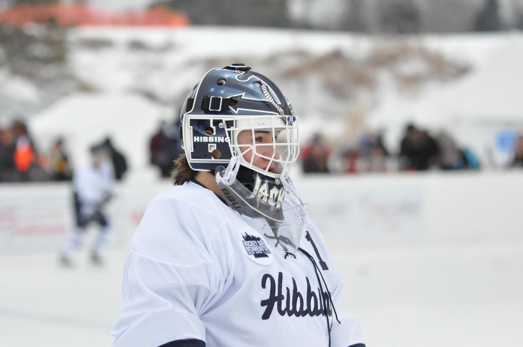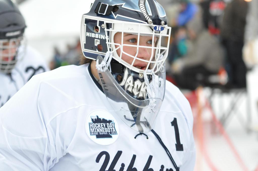 The day would start off with the girls Grand Rapids-Greenway team skunking Hibbing-Chisholm 6-0. Again, this game would not be seen on TV until much later in the evening. It was not a good day for Hibbing-Chisholm, as their boys team fell by a 9-2 margin to Eagan. It would be a good day for Grand Rapids, as the GR boys team was able to get past Benilde-St. Margaret’s with a 3-2 overtime victory. Jack Jablonski who was paralyzed in a game on December 30th, 2011, was on the bench as an assistant coach for the game.