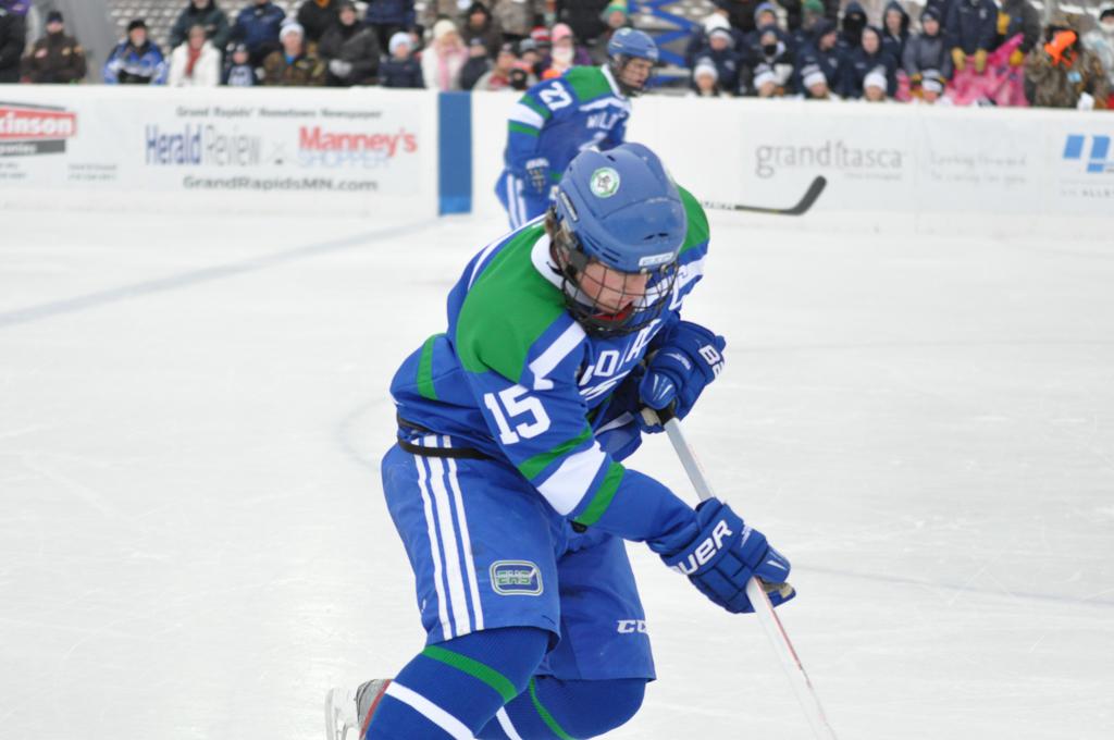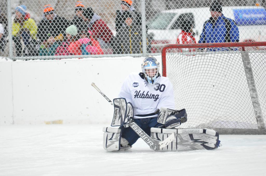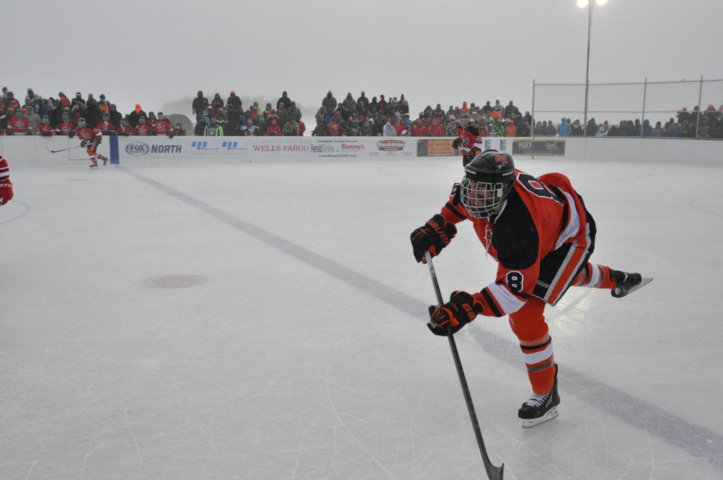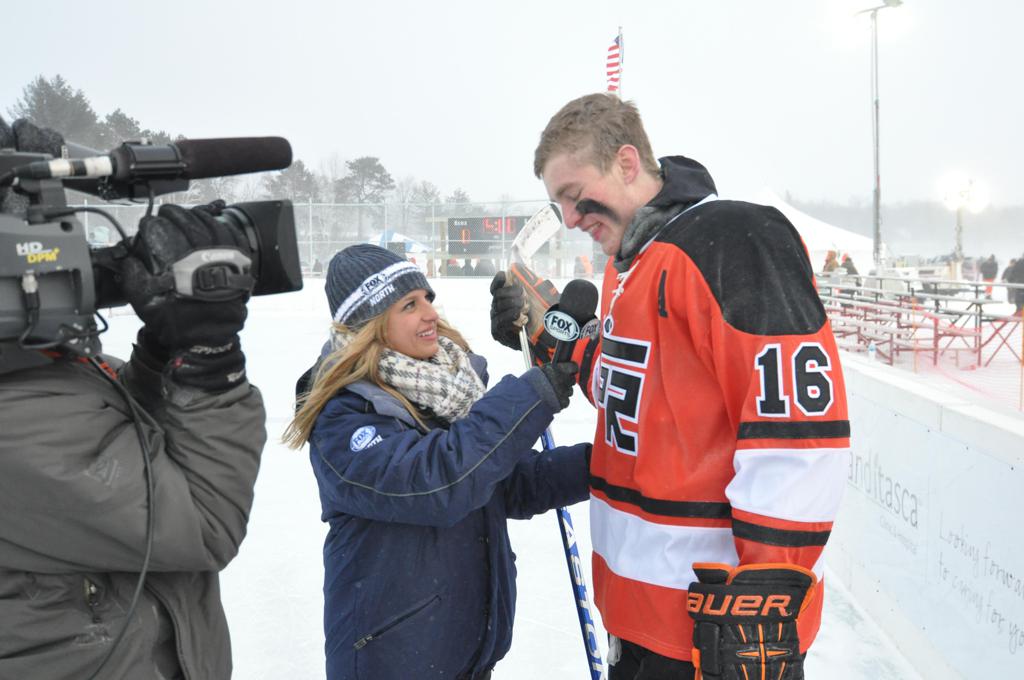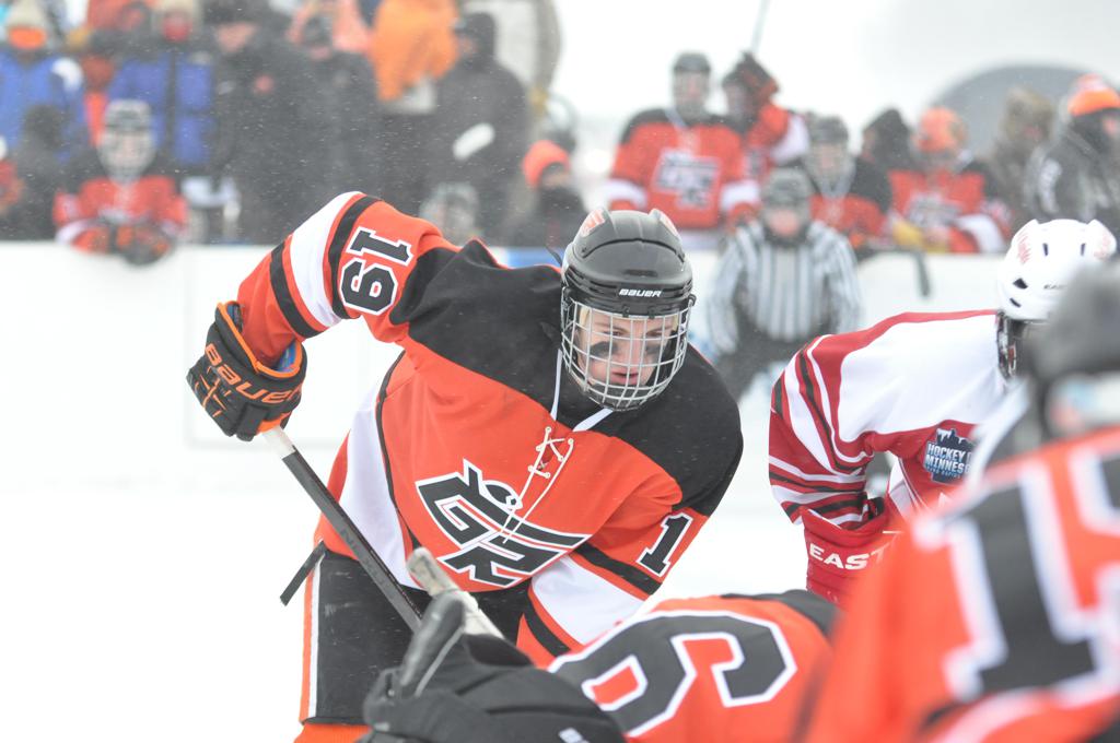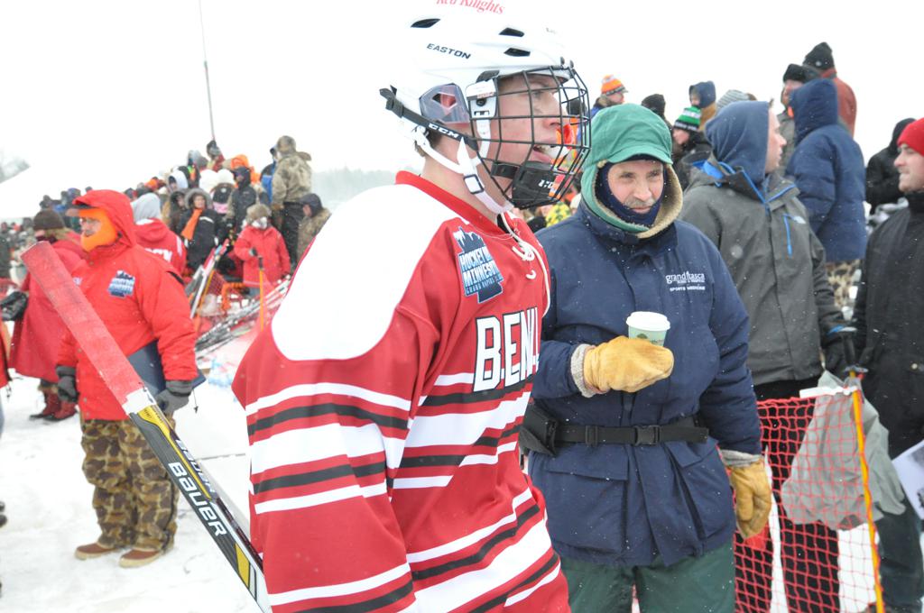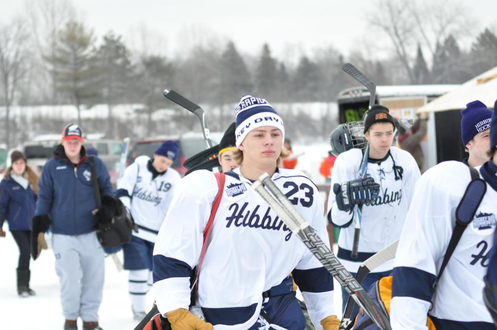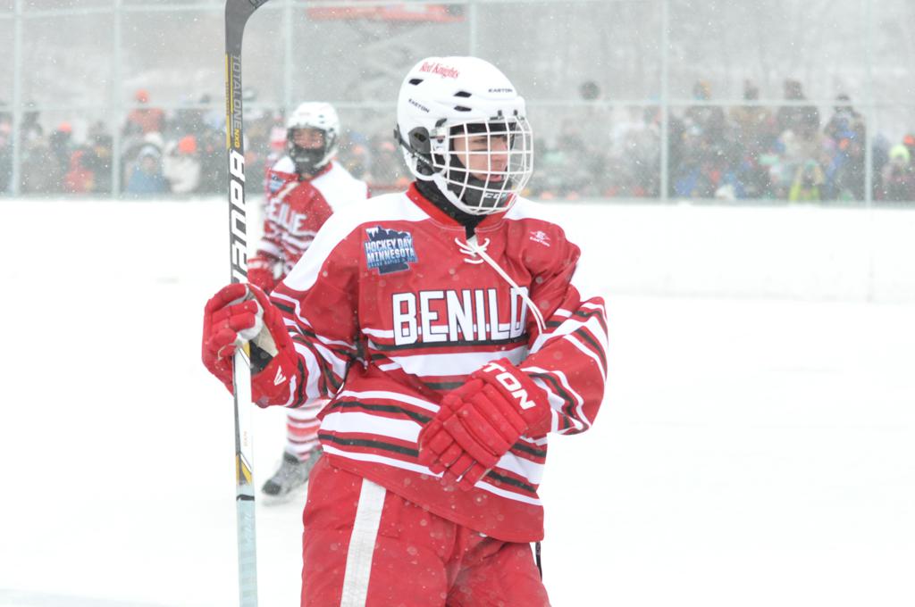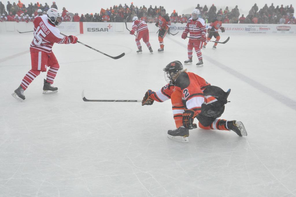 The day would start off with the girls Grand Rapids-Greenway team skunking Hibbing-Chisholm 6-0. Again, this game would not be seen on TV until much later in the evening. It was not a good day for Hibbing-Chisholm, as their boys team fell by a 9-2 margin to Eagan. It would be a good day for Grand Rapids, as the GR boys team was able to get past Benilde-St. Margaret’s with a 3-2 overtime victory. Jack Jablonski who was paralyzed in a game on December 30th, 2011, was on the bench as an assistant coach for the game.