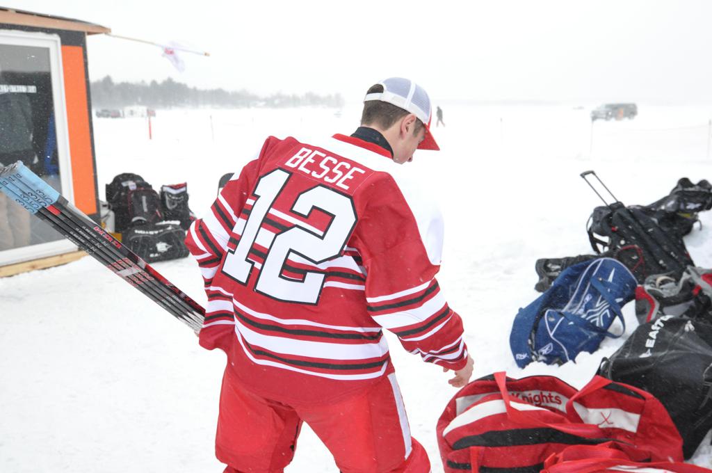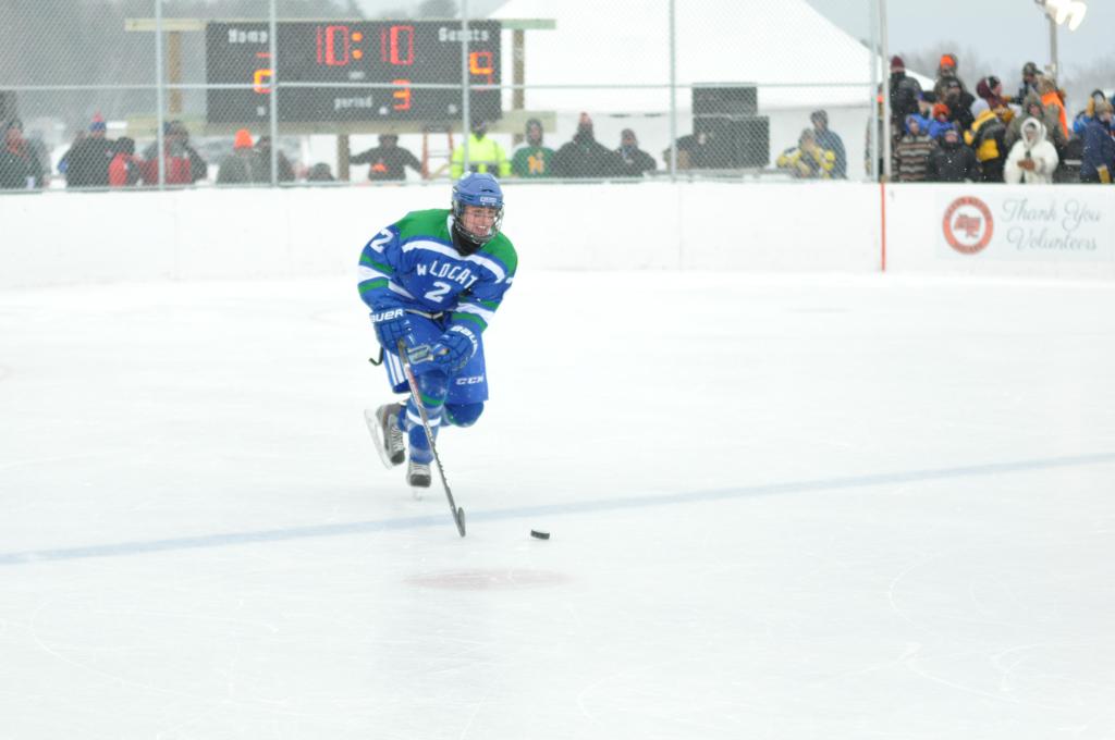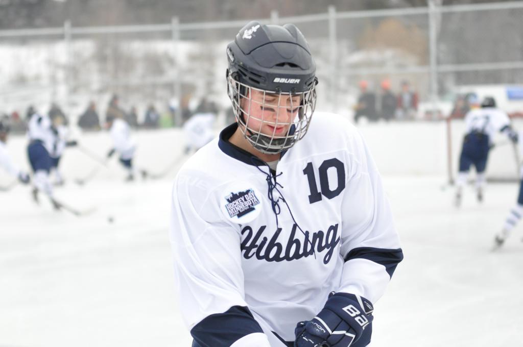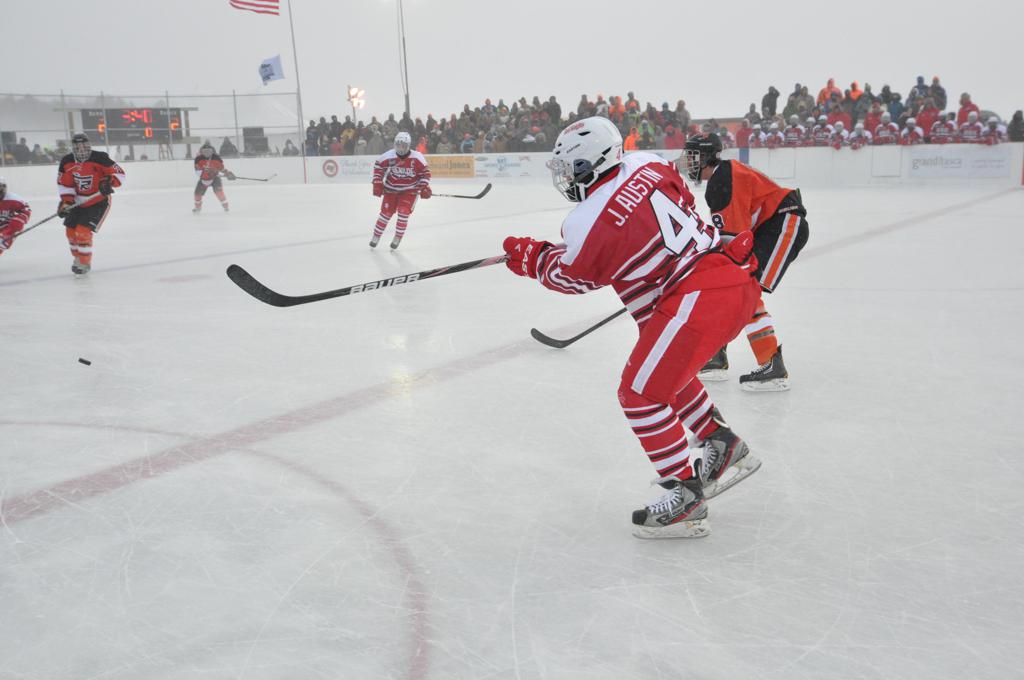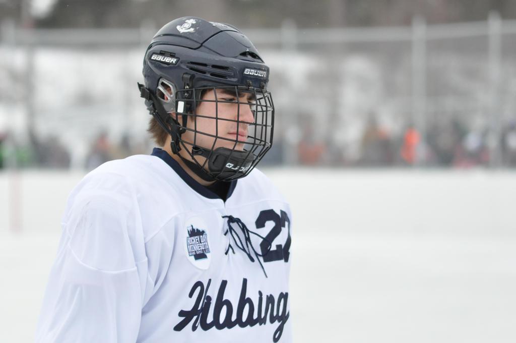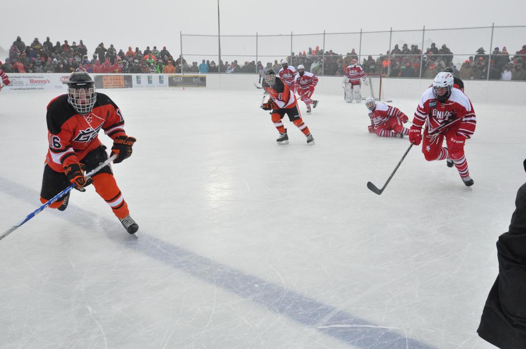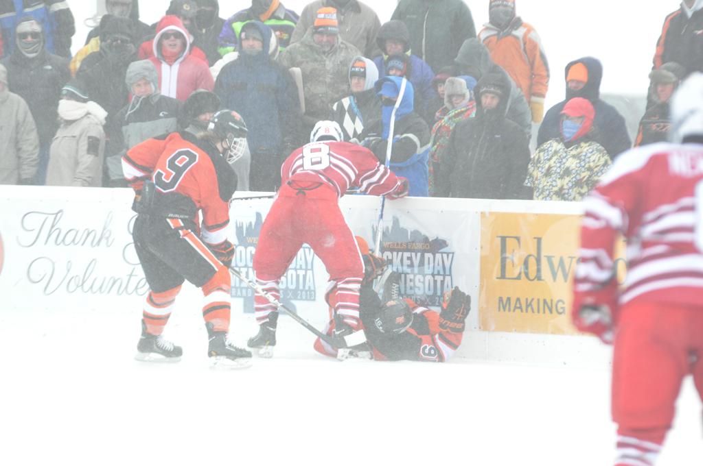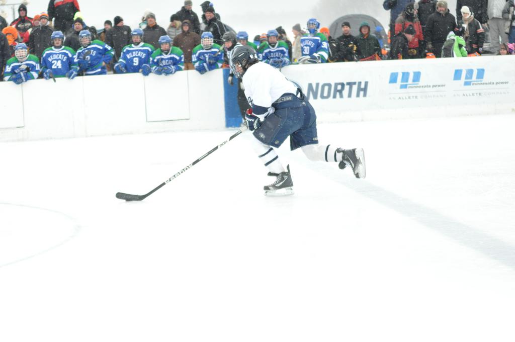 The day would start off with the girls Grand Rapids-Greenway team skunking Hibbing-Chisholm 6-0. Again, this game would not be seen on TV until much later in the evening. It was not a good day for Hibbing-Chisholm, as their boys team fell by a 9-2 margin to Eagan. It would be a good day for Grand Rapids, as the GR boys team was able to get past Benilde-St. Margaret’s with a 3-2 overtime victory. Jack Jablonski who was paralyzed in a game on December 30th, 2011, was on the bench as an assistant coach for the game.