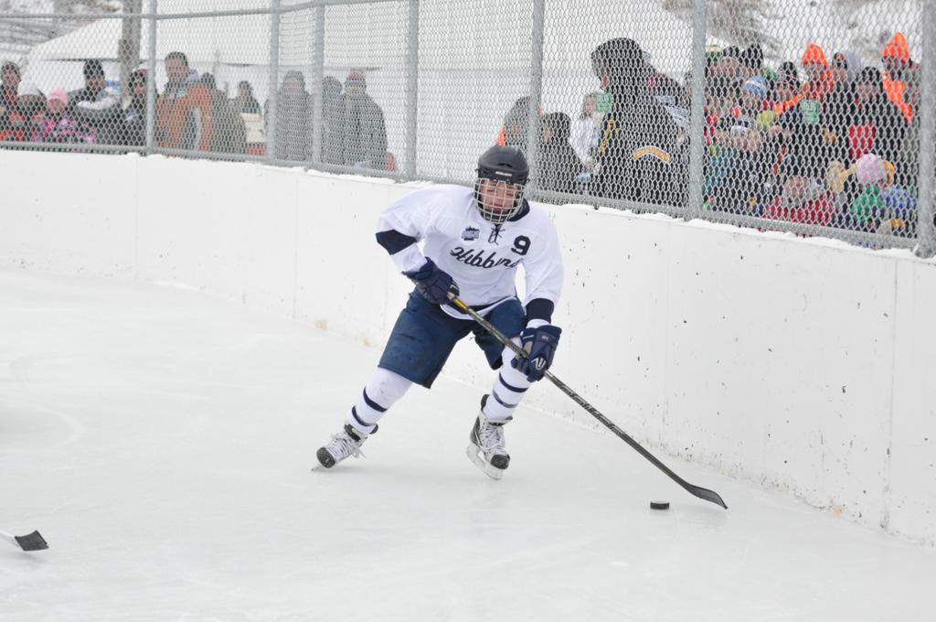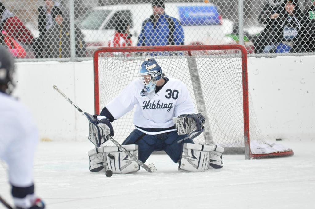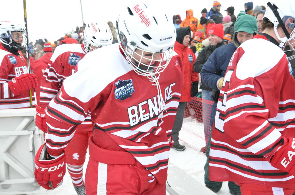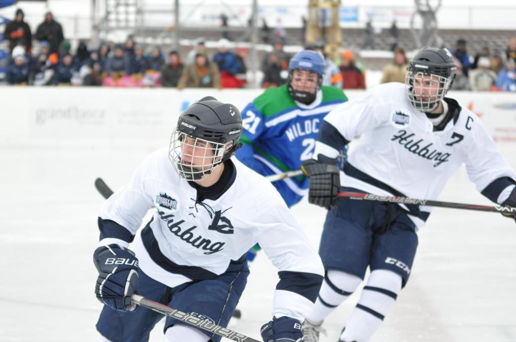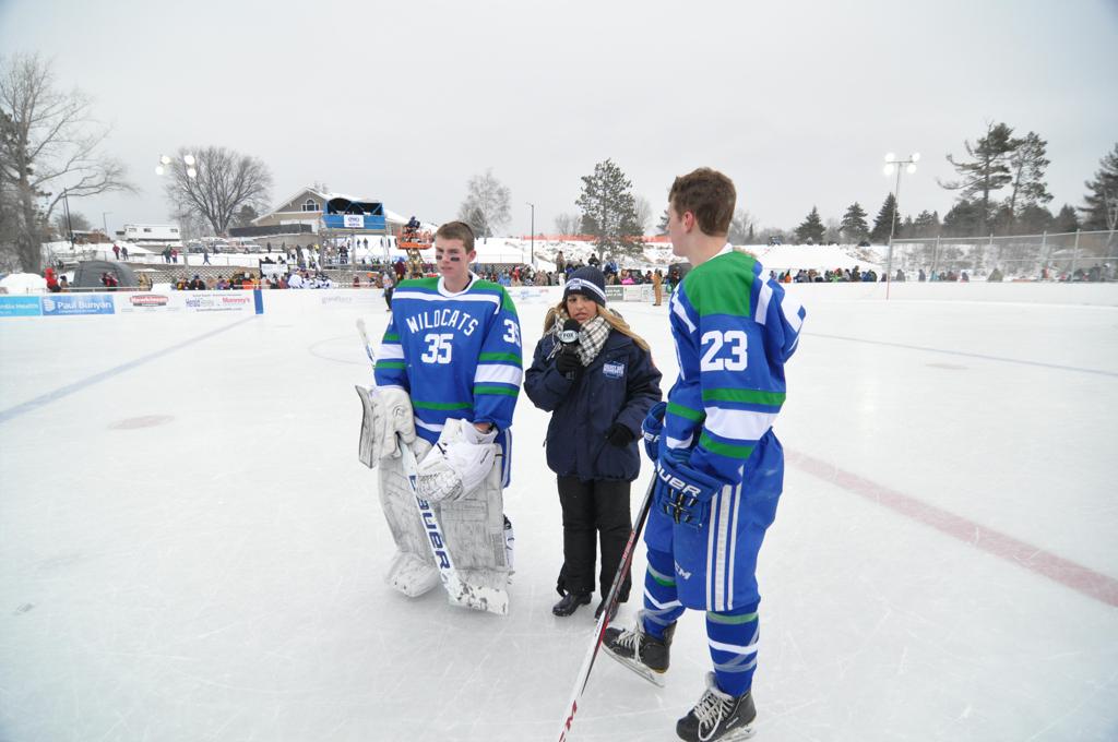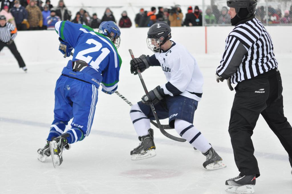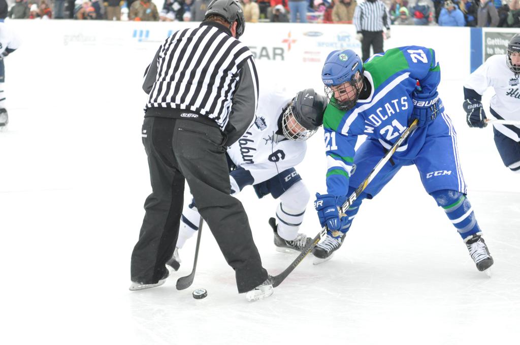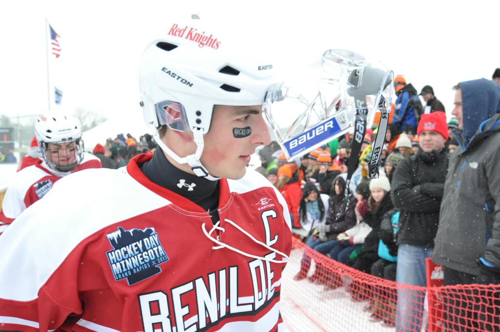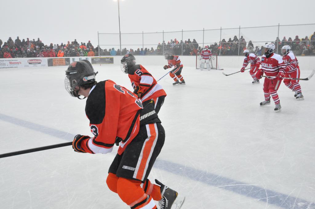 The day would start off with the girls Grand Rapids-Greenway team skunking Hibbing-Chisholm 6-0. Again, this game would not be seen on TV until much later in the evening. It was not a good day for Hibbing-Chisholm, as their boys team fell by a 9-2 margin to Eagan. It would be a good day for Grand Rapids, as the GR boys team was able to get past Benilde-St. Margaret’s with a 3-2 overtime victory. Jack Jablonski who was paralyzed in a game on December 30th, 2011, was on the bench as an assistant coach for the game.