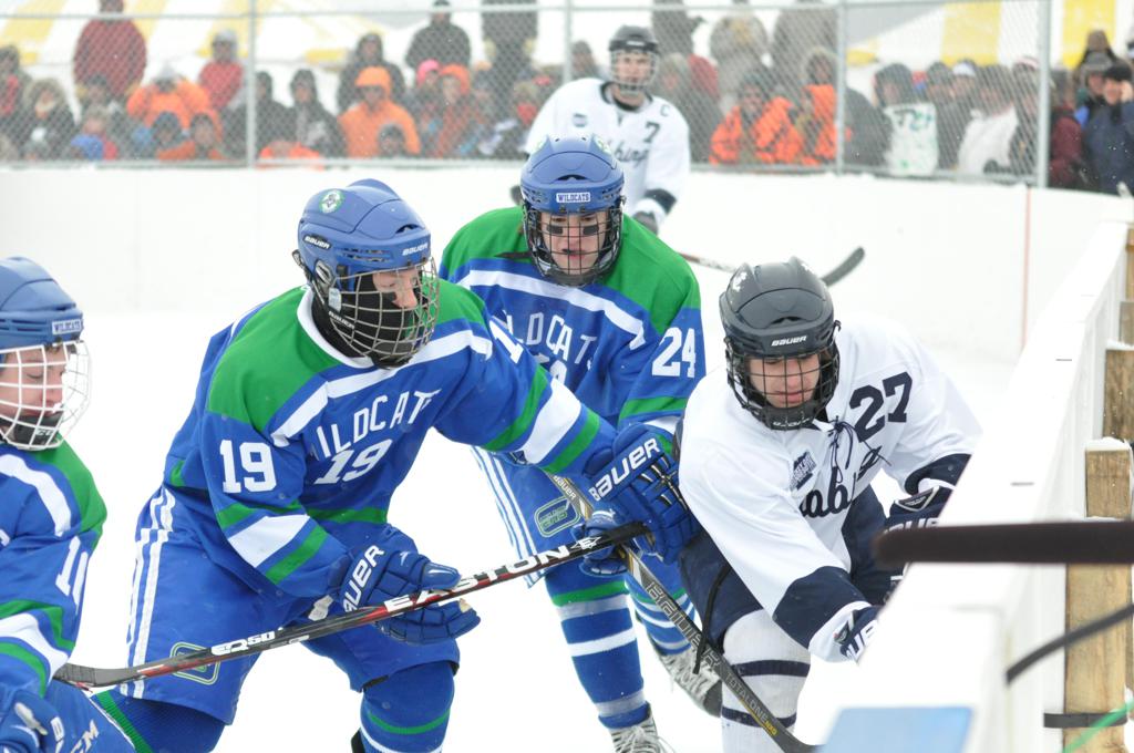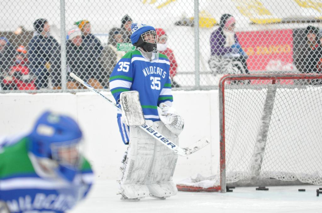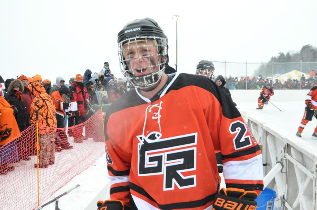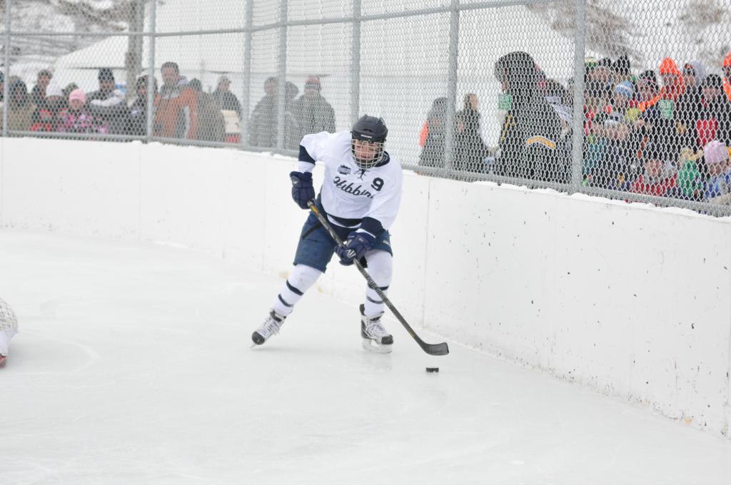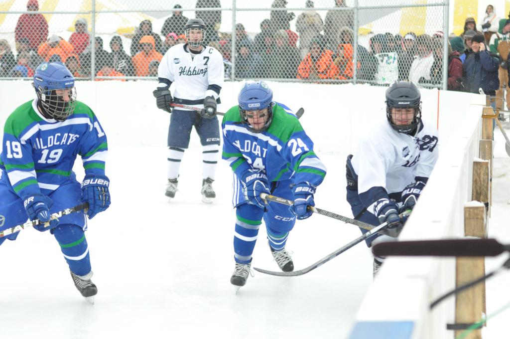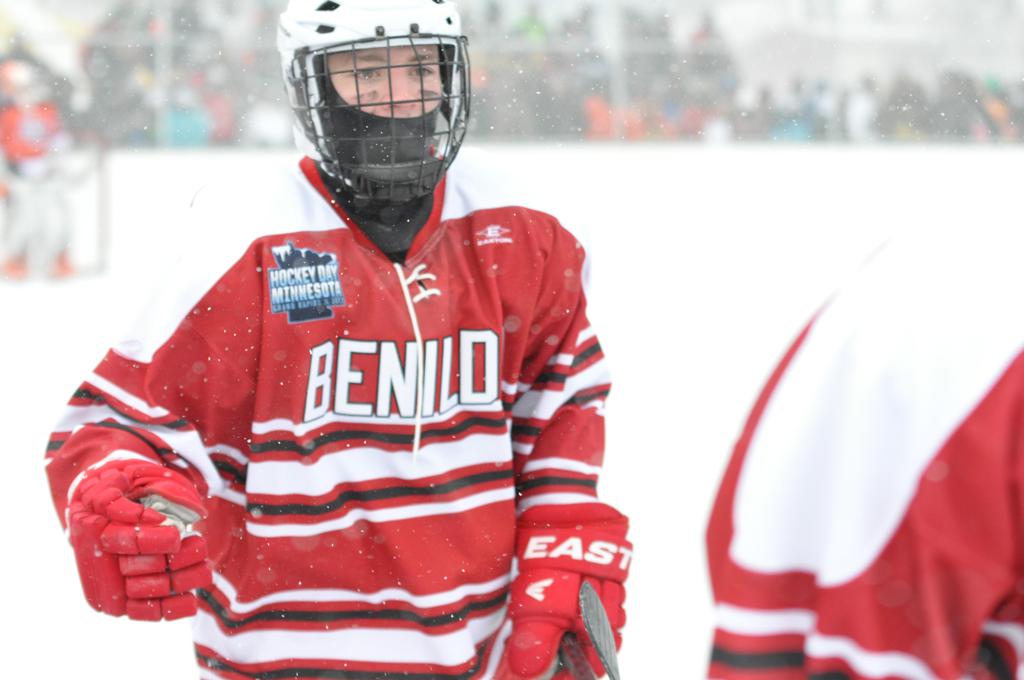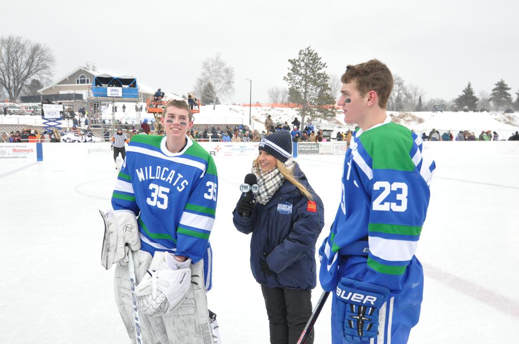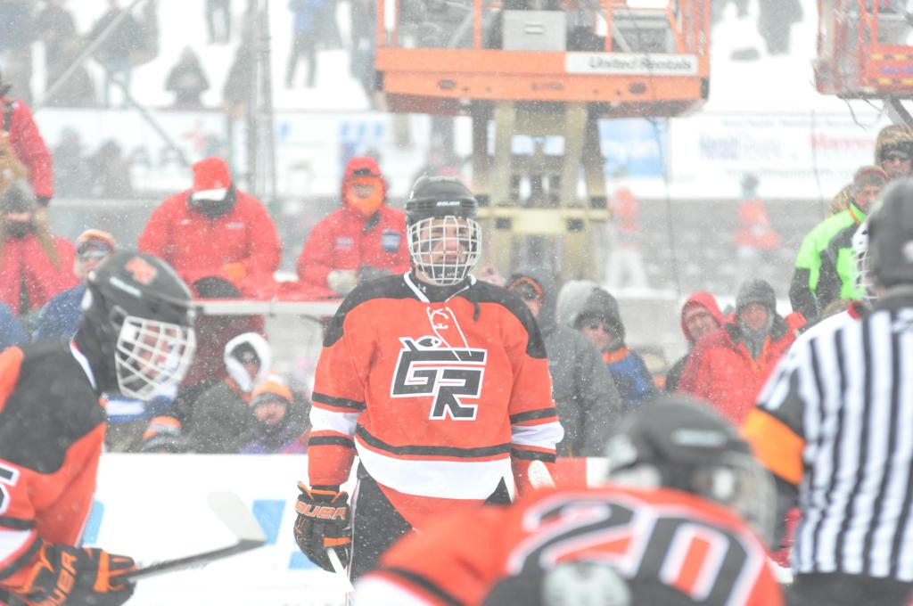 The day would start off with the girls Grand Rapids-Greenway team skunking Hibbing-Chisholm 6-0. Again, this game would not be seen on TV until much later in the evening. It was not a good day for Hibbing-Chisholm, as their boys team fell by a 9-2 margin to Eagan. It would be a good day for Grand Rapids, as the GR boys team was able to get past Benilde-St. Margaret’s with a 3-2 overtime victory. Jack Jablonski who was paralyzed in a game on December 30th, 2011, was on the bench as an assistant coach for the game.