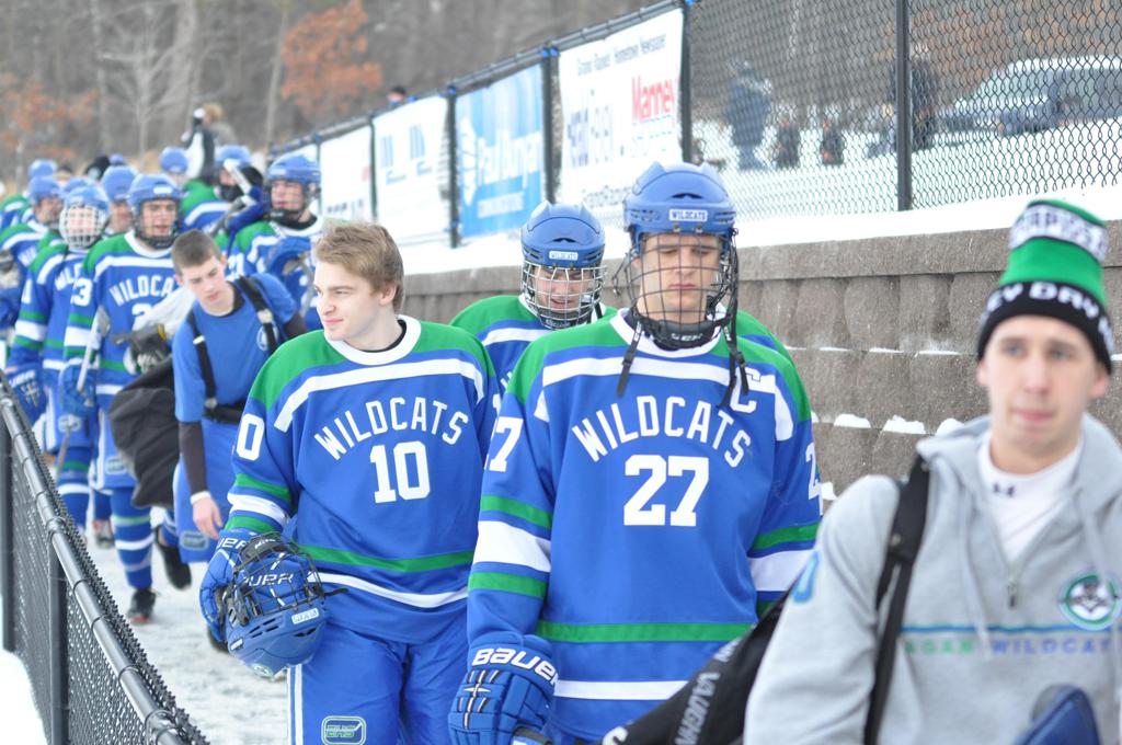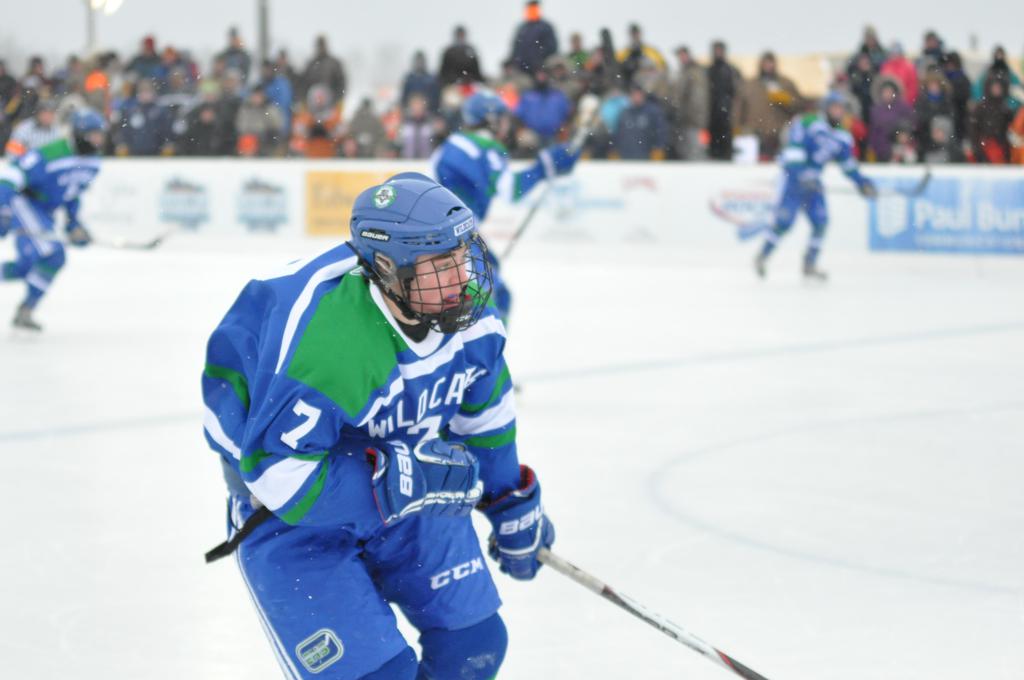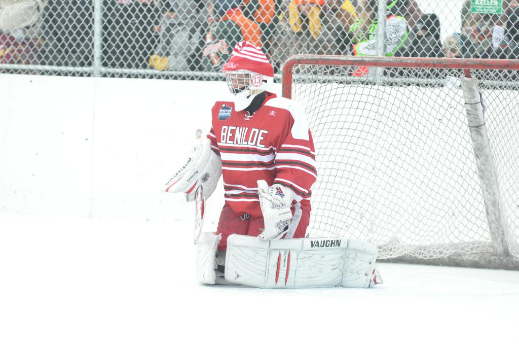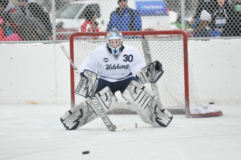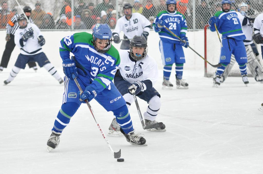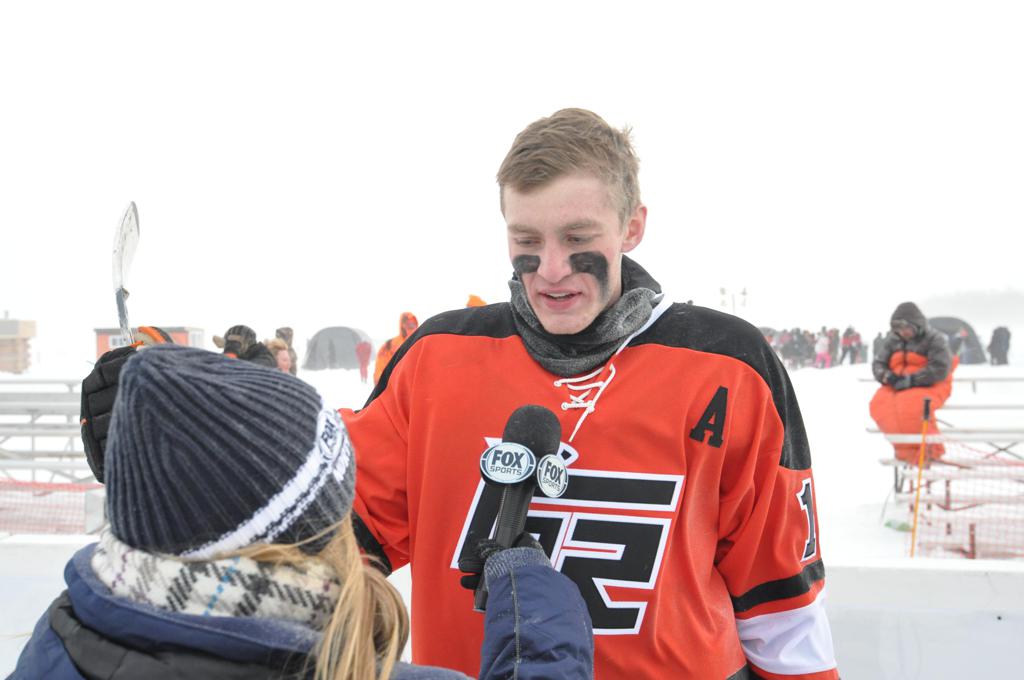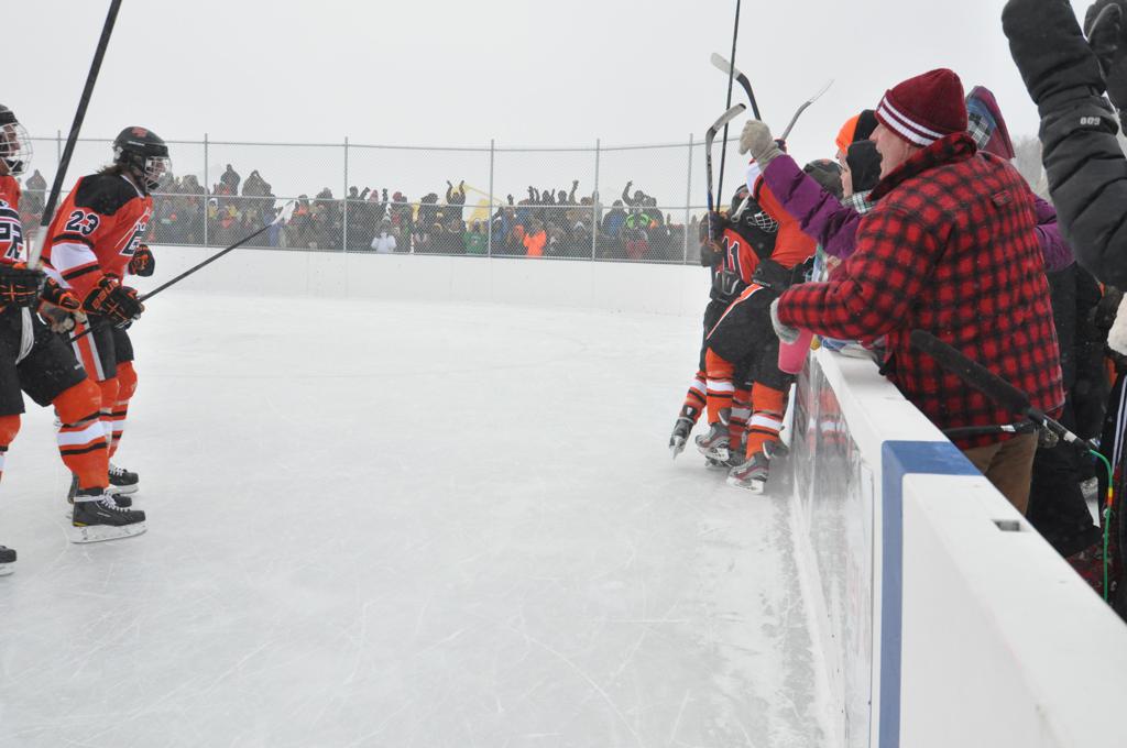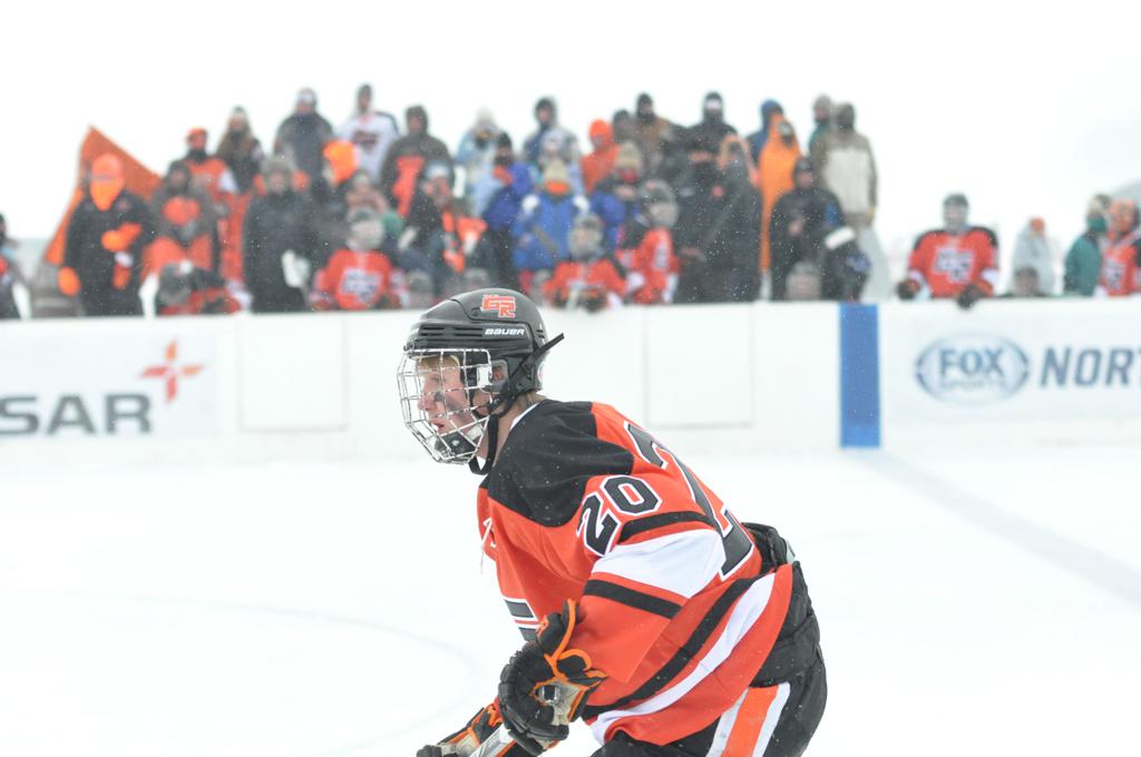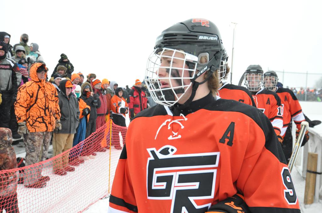 The day would start off with the girls Grand Rapids-Greenway team skunking Hibbing-Chisholm 6-0. Again, this game would not be seen on TV until much later in the evening. It was not a good day for Hibbing-Chisholm, as their boys team fell by a 9-2 margin to Eagan. It would be a good day for Grand Rapids, as the GR boys team was able to get past Benilde-St. Margaret’s with a 3-2 overtime victory. Jack Jablonski who was paralyzed in a game on December 30th, 2011, was on the bench as an assistant coach for the game.