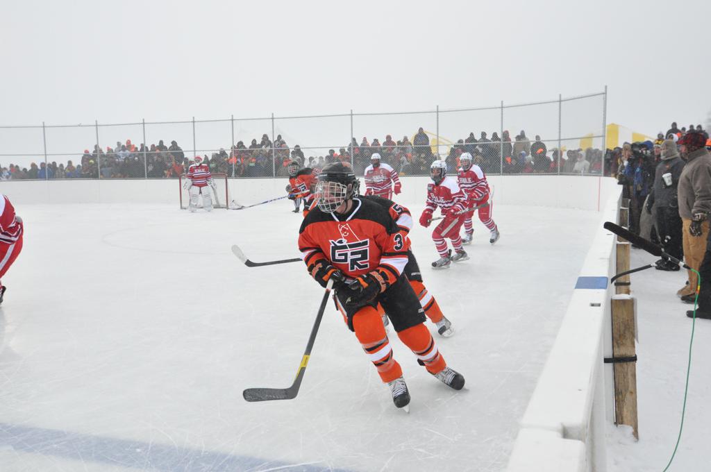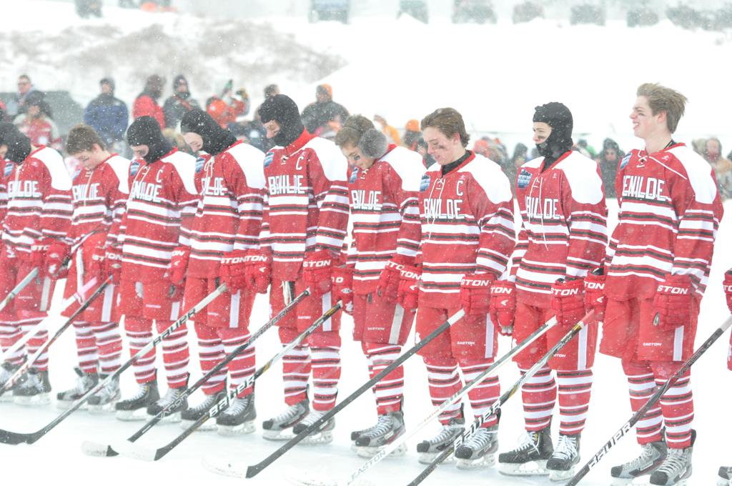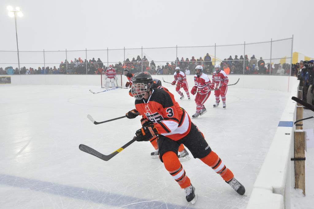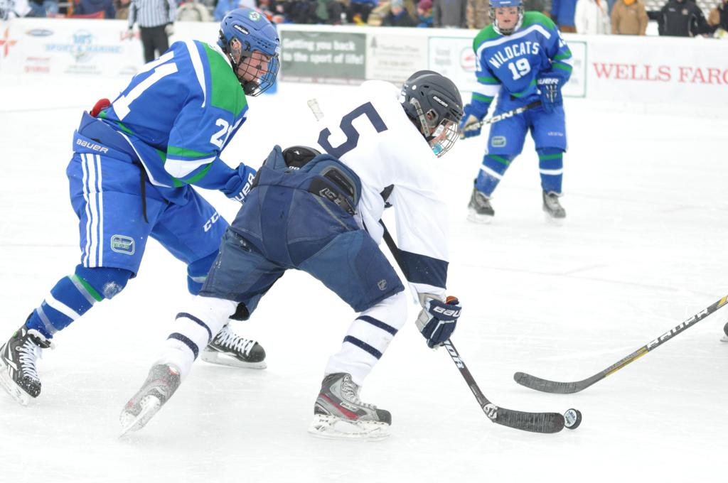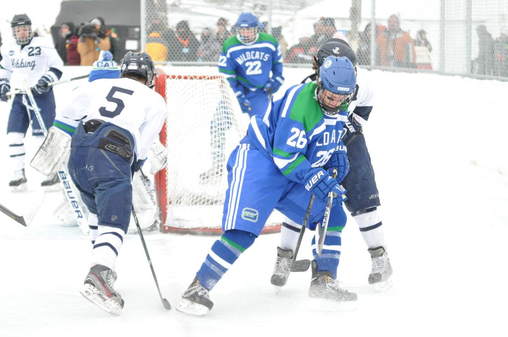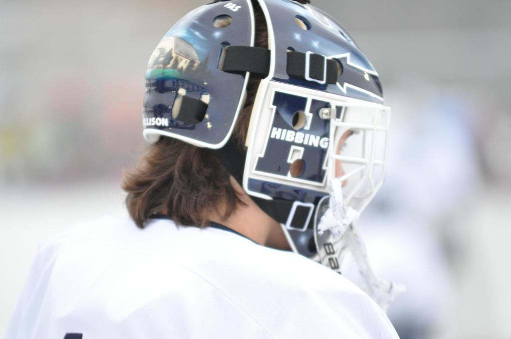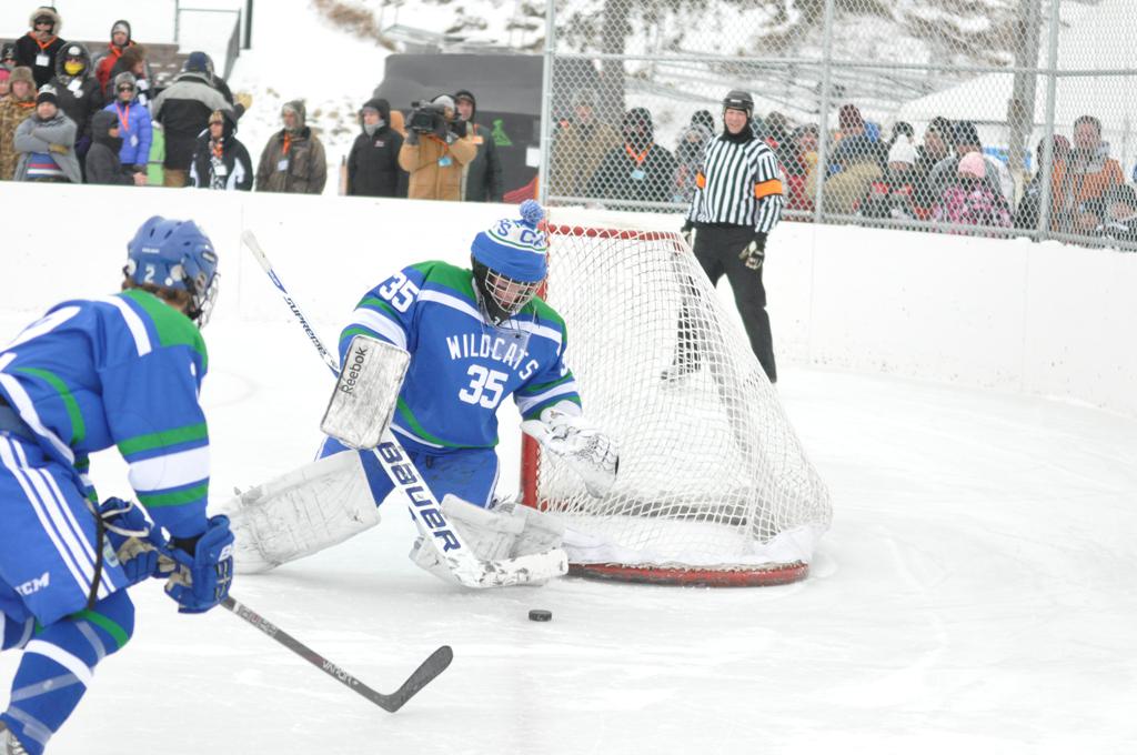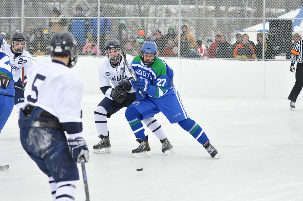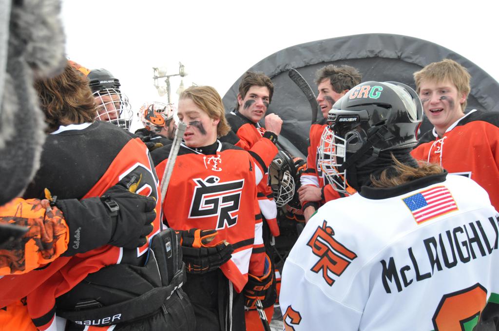 The day would start off with the girls Grand Rapids-Greenway team skunking Hibbing-Chisholm 6-0. Again, this game would not be seen on TV until much later in the evening. It was not a good day for Hibbing-Chisholm, as their boys team fell by a 9-2 margin to Eagan. It would be a good day for Grand Rapids, as the GR boys team was able to get past Benilde-St. Margaret’s with a 3-2 overtime victory. Jack Jablonski who was paralyzed in a game on December 30th, 2011, was on the bench as an assistant coach for the game.