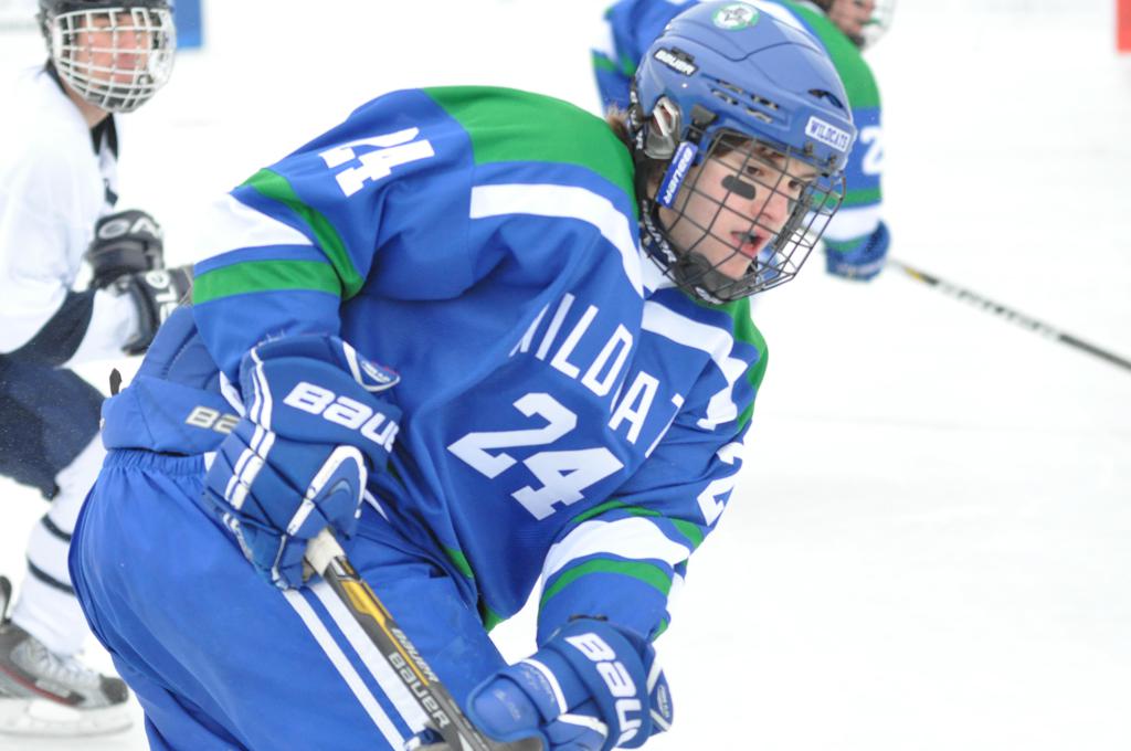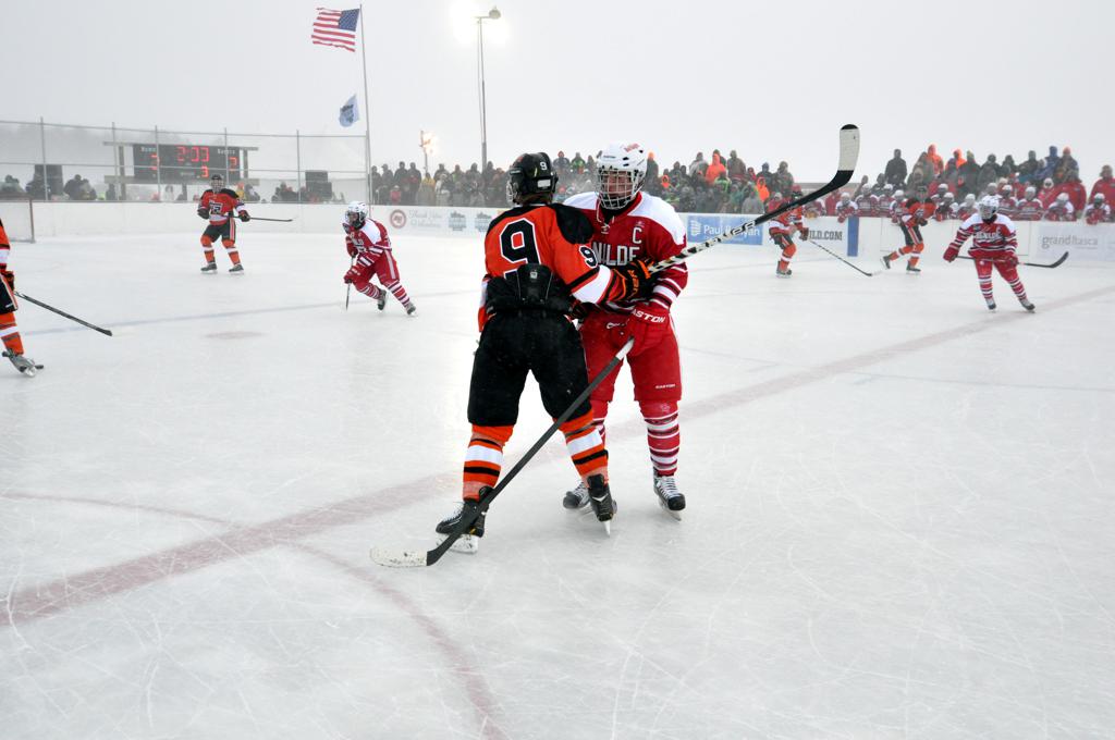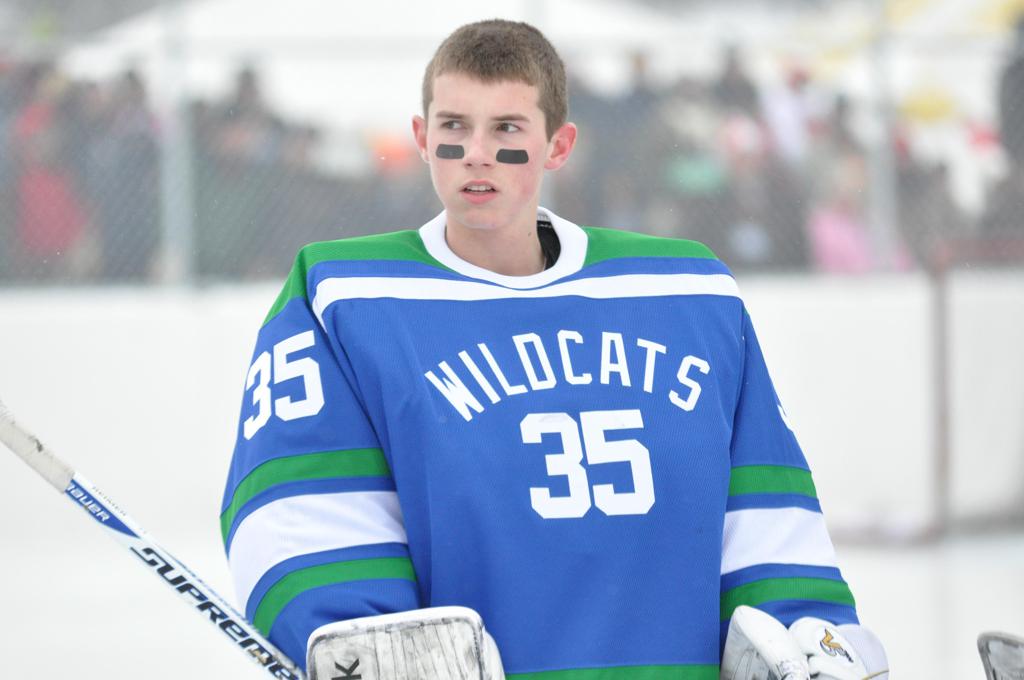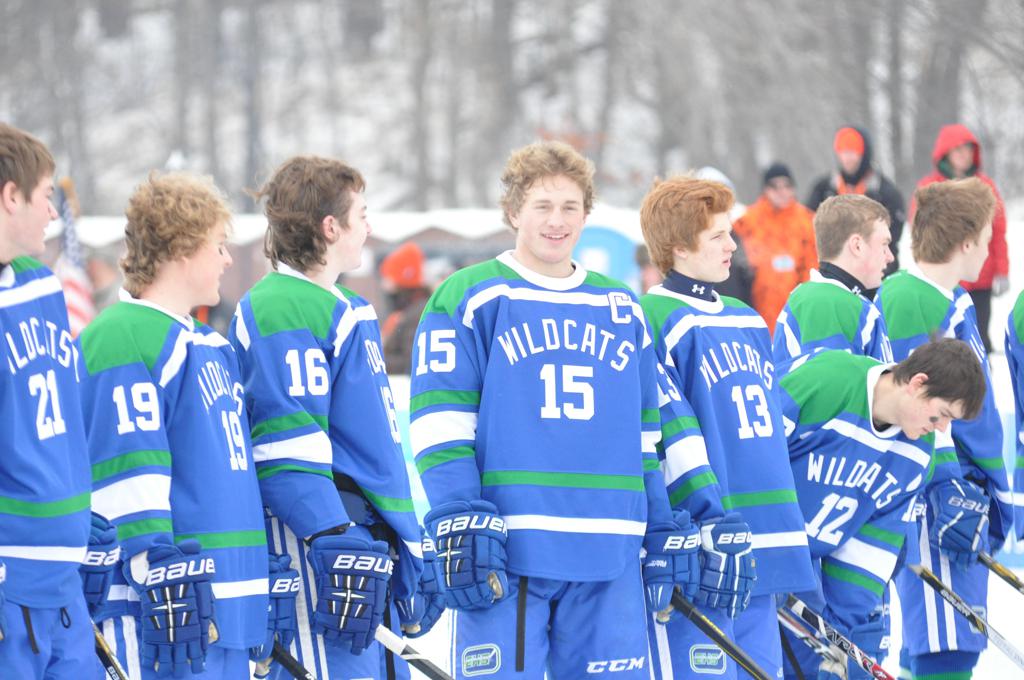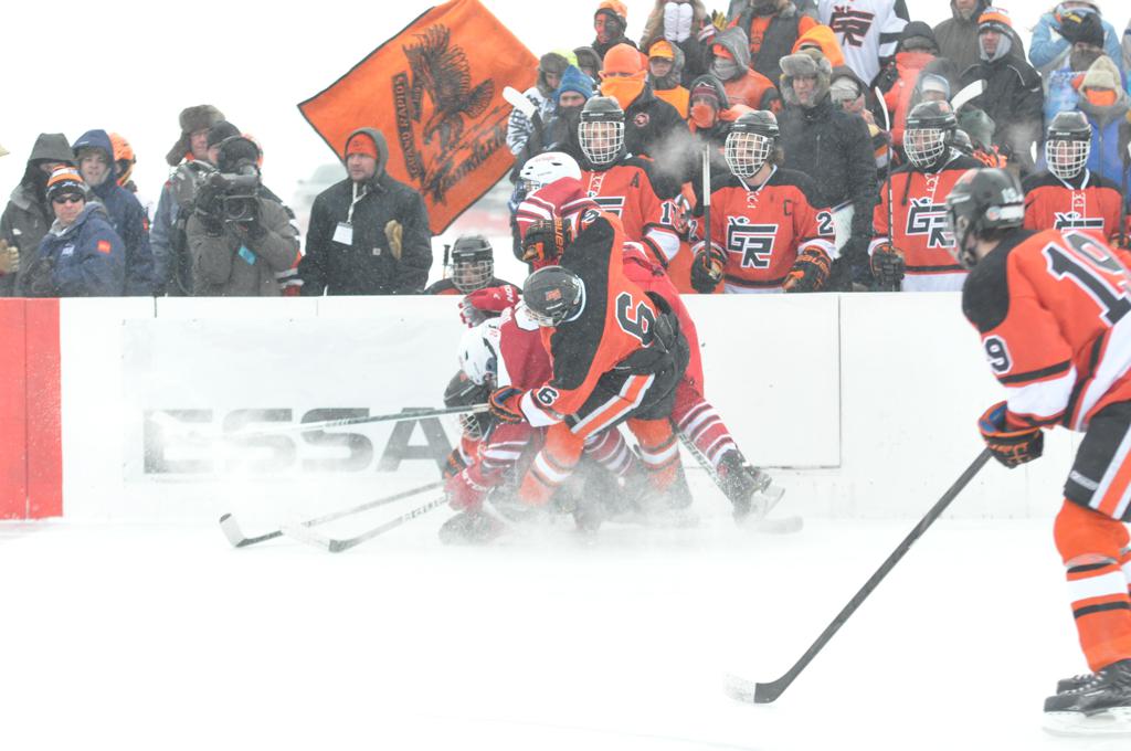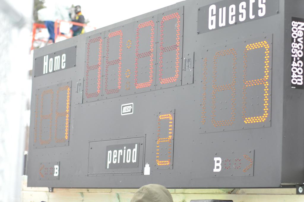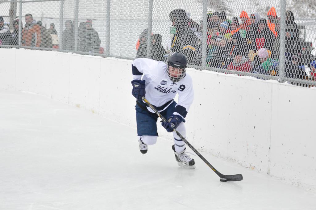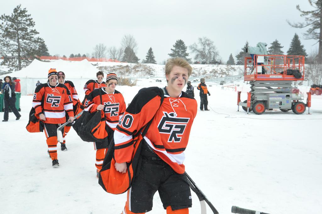 The day would start off with the girls Grand Rapids-Greenway team skunking Hibbing-Chisholm 6-0. Again, this game would not be seen on TV until much later in the evening. It was not a good day for Hibbing-Chisholm, as their boys team fell by a 9-2 margin to Eagan. It would be a good day for Grand Rapids, as the GR boys team was able to get past Benilde-St. Margaret’s with a 3-2 overtime victory. Jack Jablonski who was paralyzed in a game on December 30th, 2011, was on the bench as an assistant coach for the game.