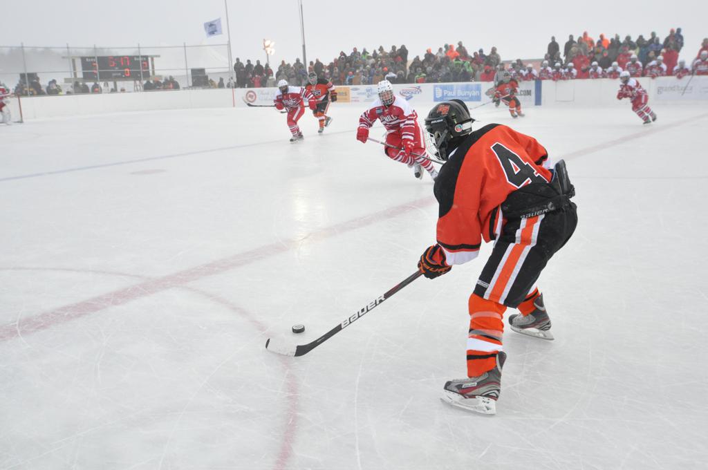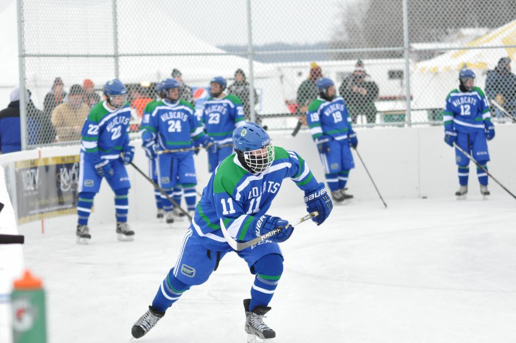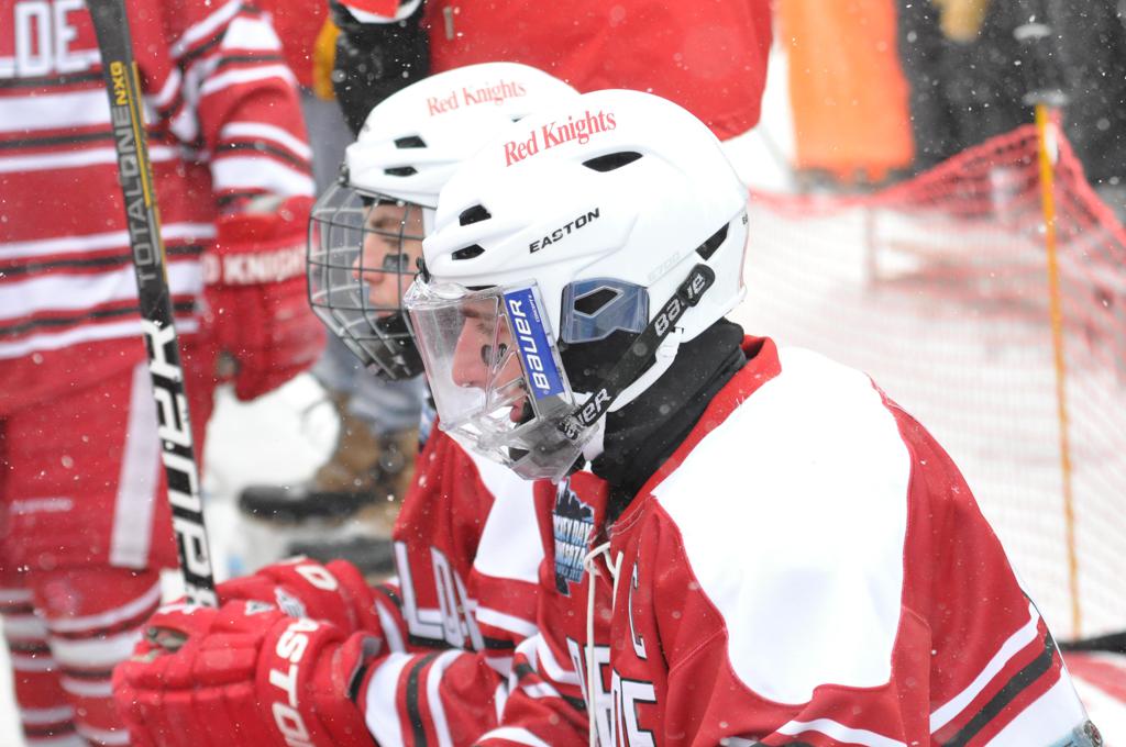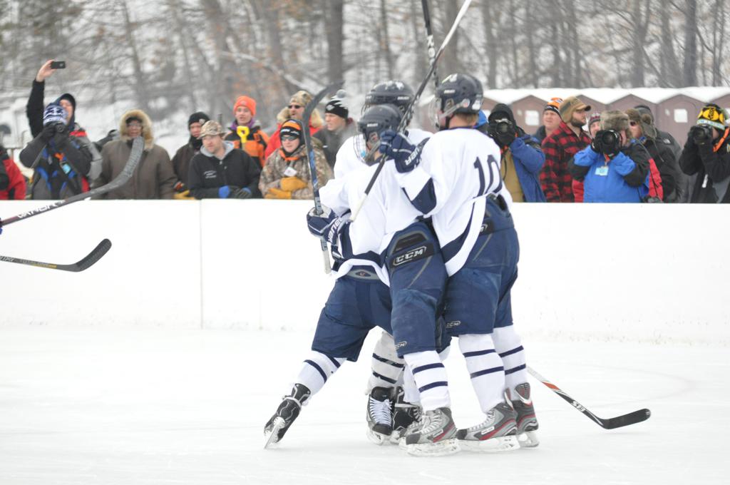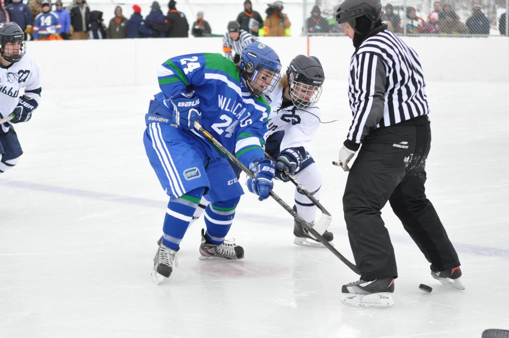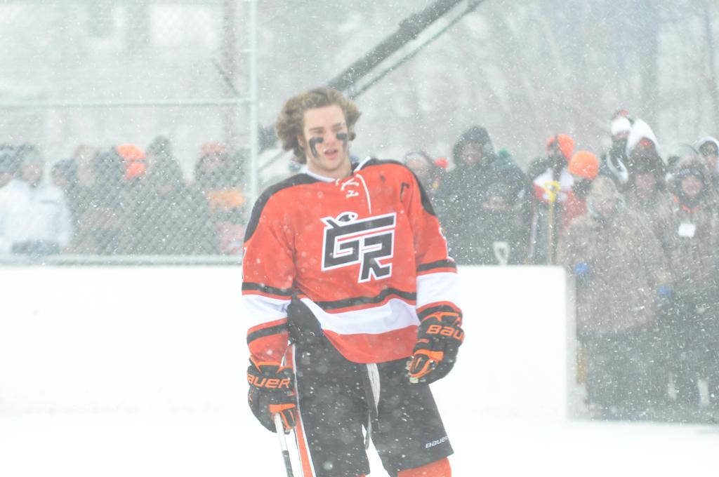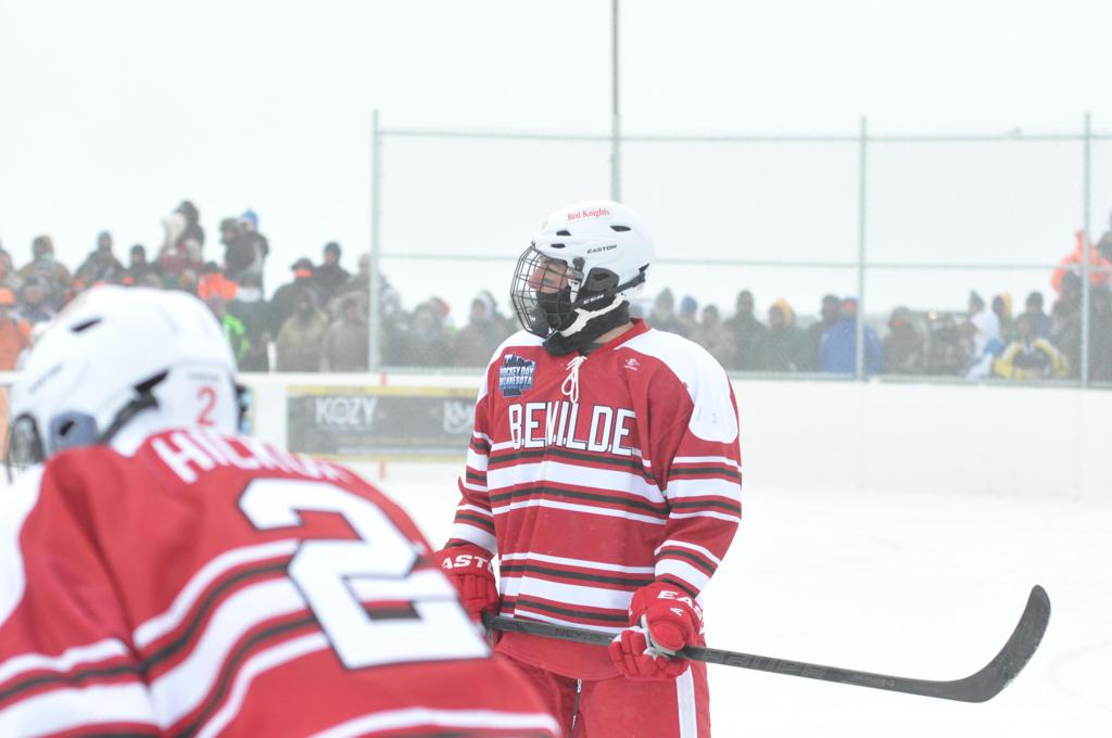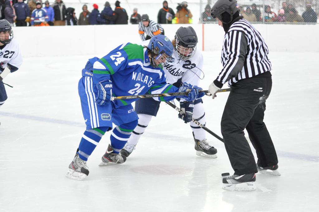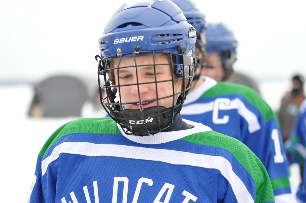 The day would start off with the girls Grand Rapids-Greenway team skunking Hibbing-Chisholm 6-0. Again, this game would not be seen on TV until much later in the evening. It was not a good day for Hibbing-Chisholm, as their boys team fell by a 9-2 margin to Eagan. It would be a good day for Grand Rapids, as the GR boys team was able to get past Benilde-St. Margaret’s with a 3-2 overtime victory. Jack Jablonski who was paralyzed in a game on December 30th, 2011, was on the bench as an assistant coach for the game.