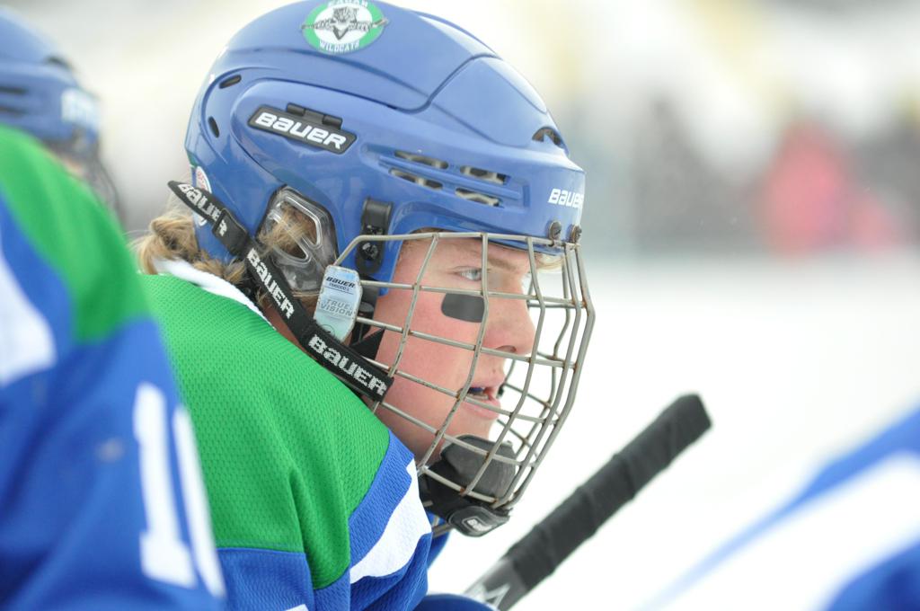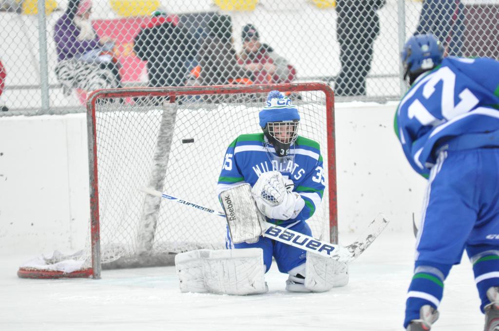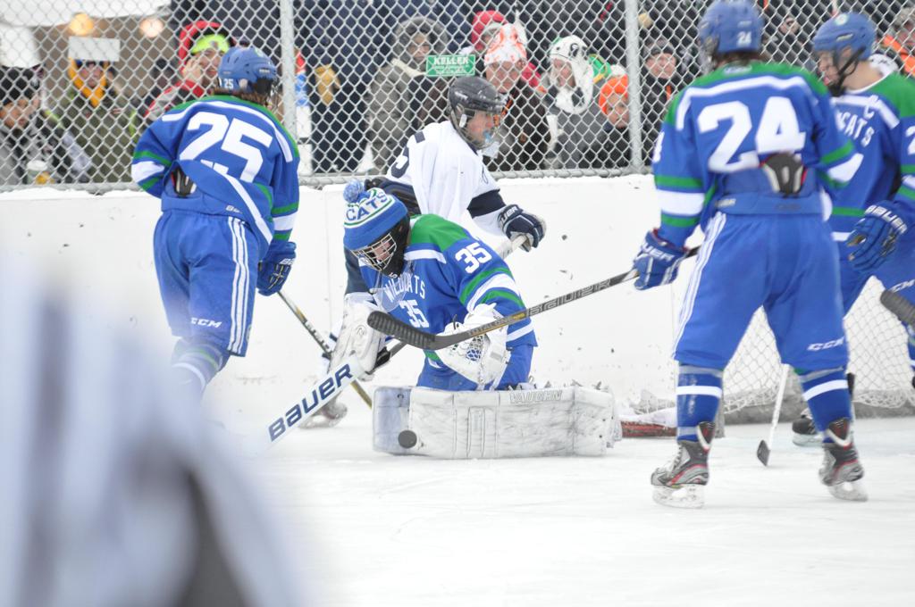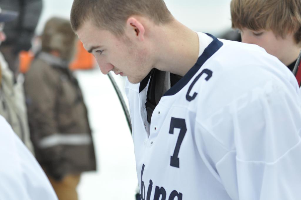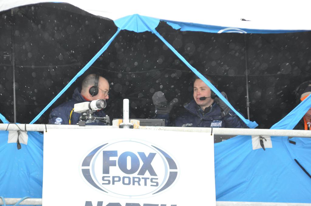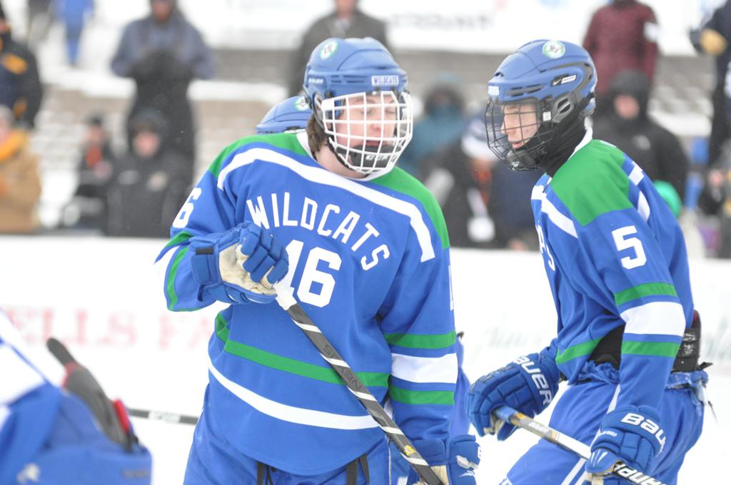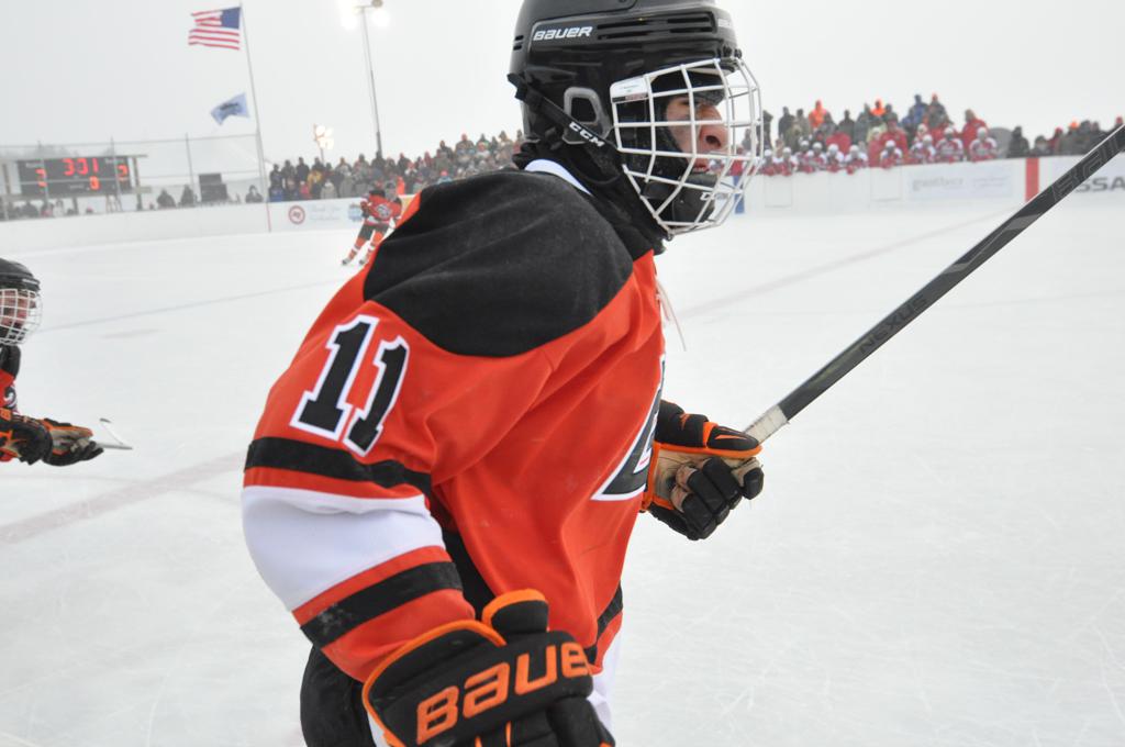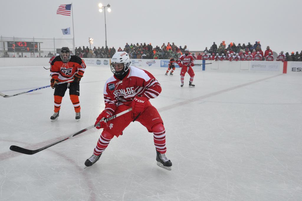 The day would start off with the girls Grand Rapids-Greenway team skunking Hibbing-Chisholm 6-0. Again, this game would not be seen on TV until much later in the evening. It was not a good day for Hibbing-Chisholm, as their boys team fell by a 9-2 margin to Eagan. It would be a good day for Grand Rapids, as the GR boys team was able to get past Benilde-St. Margaret’s with a 3-2 overtime victory. Jack Jablonski who was paralyzed in a game on December 30th, 2011, was on the bench as an assistant coach for the game.