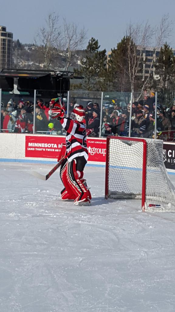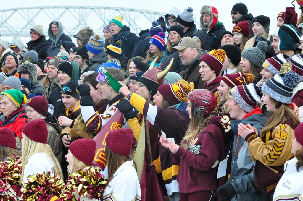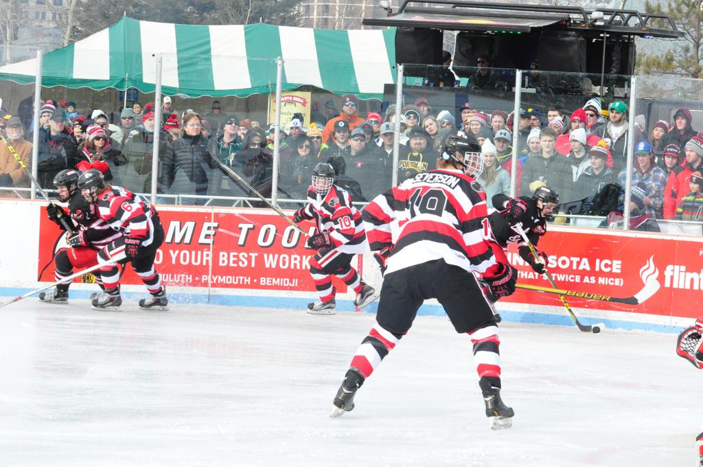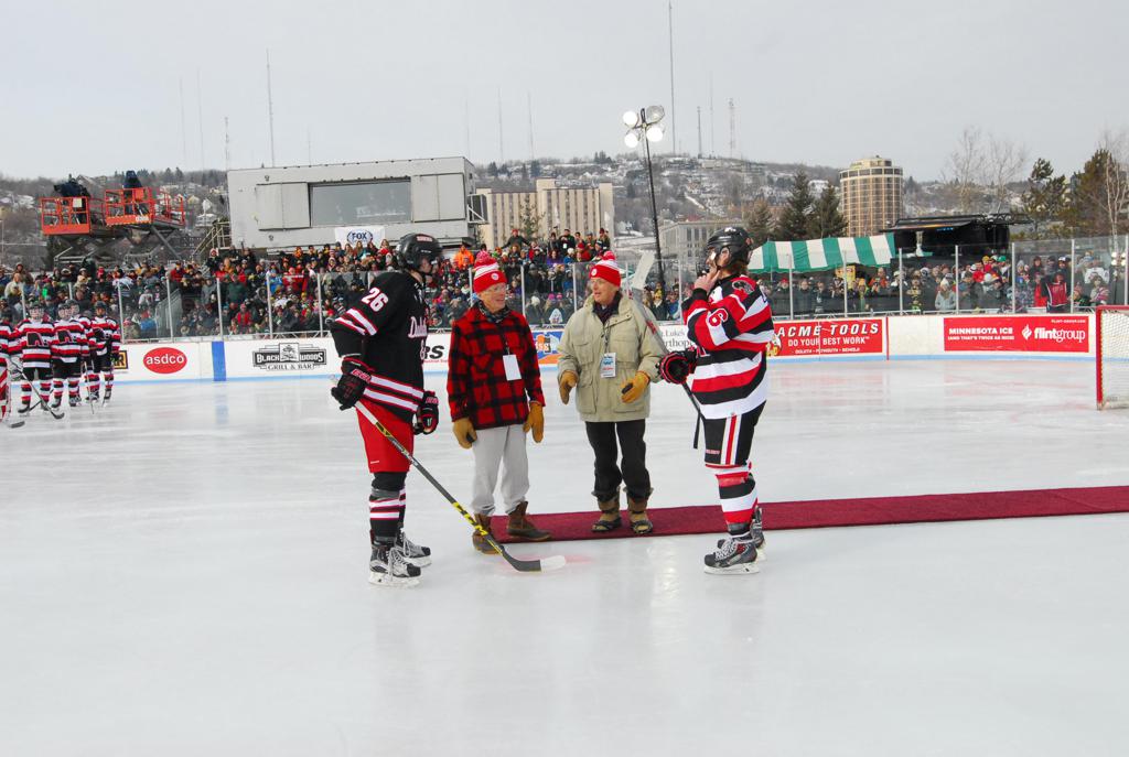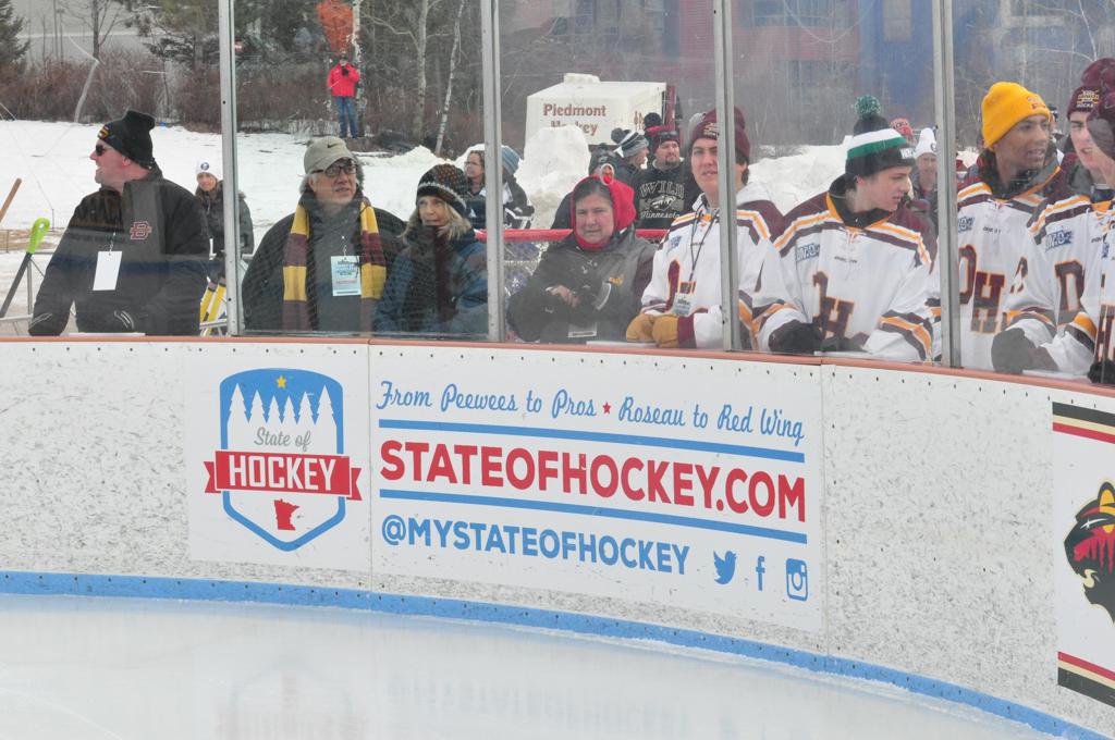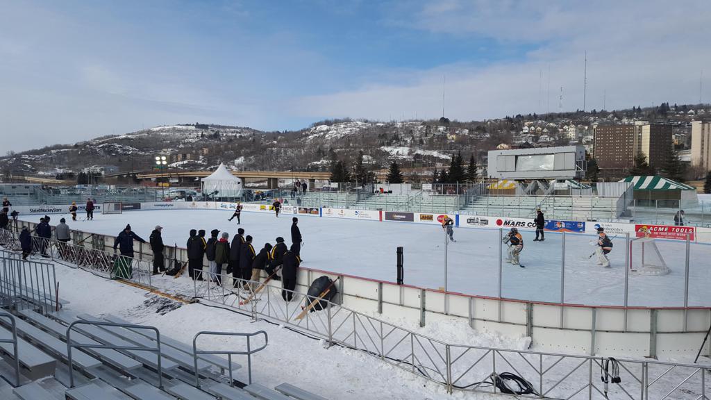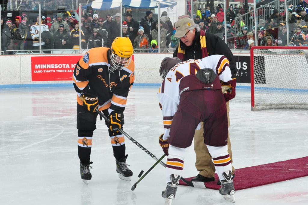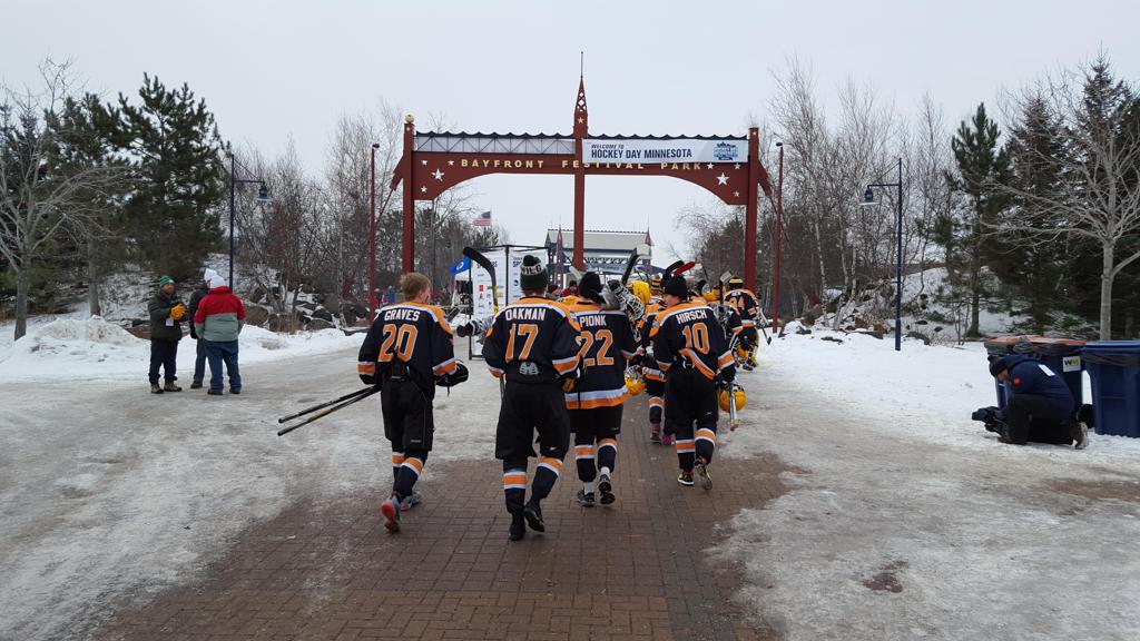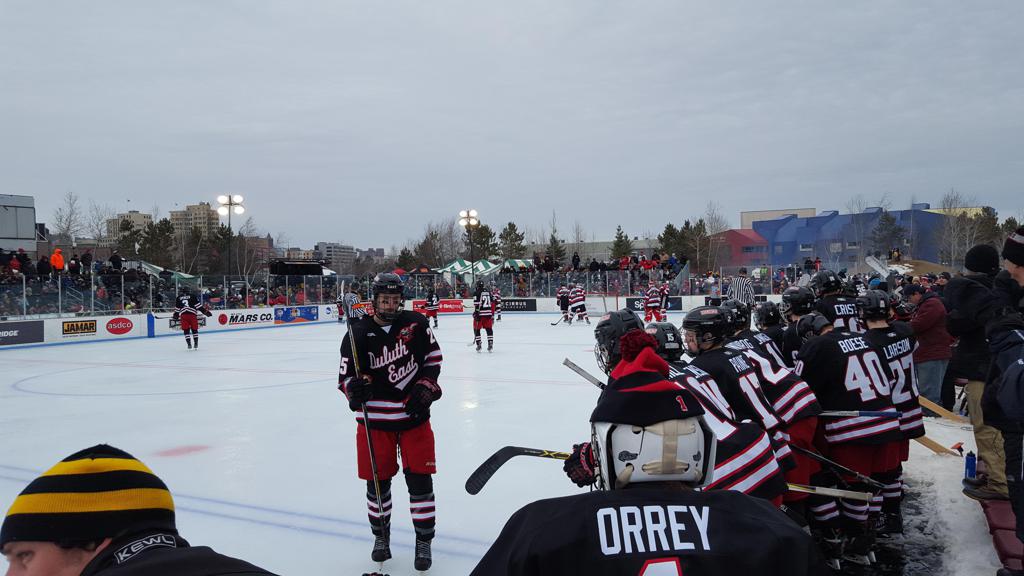 The afternoon marquee game between home-town Greyhounds of Duluth East vs. the visiting Panthers of Lakeville North began with Duluth hockey legends Jerry & Bob Fryberger dropping the ceremonial puck-drop. The game was quite the hard fought close game, between two Class AA powerful schools - both in striking red and black uniforms against the white ice - made for great images on the sunny day. Visiting Lakeville edged East by a close 3-2 regulation win. One thing that was quite odd and rather upsetting about HDM was the long LOUD hovering helicopter with camera man shooting footage through an open side door over the rink and crowd, it was so nousy on-site, spectators and players alike on the ice had a hard time hearing the referee whistles (fans on TV also had a hard time hearing the broadcast as the chopper blades were resonating through the microphones as well). Another quite upsetting thing, that led to collegiate changes going forward was - Duluth UMD Bulldogs Hockey team had a slated HOME game that afternoon - which Amsoil Arena was literally within eye site, and a few paces away by foot of the Duluth Bayfront Park, but were not apart of HDM. Fans at this time on social media started to gripe that this wasn't a Hockey Day Minnesota for all teams across the State - but was merely a Gophers Hockey Day, as the University of Minnesota had participated in every HDM to date. Things were about to change going forward in future years, to showcase ALL of the states Collegiate programs.