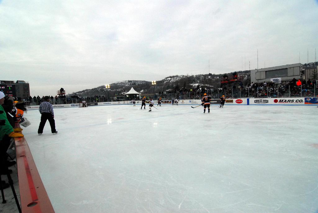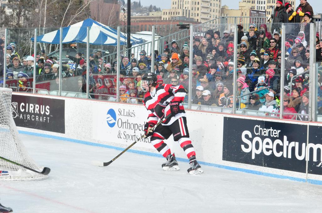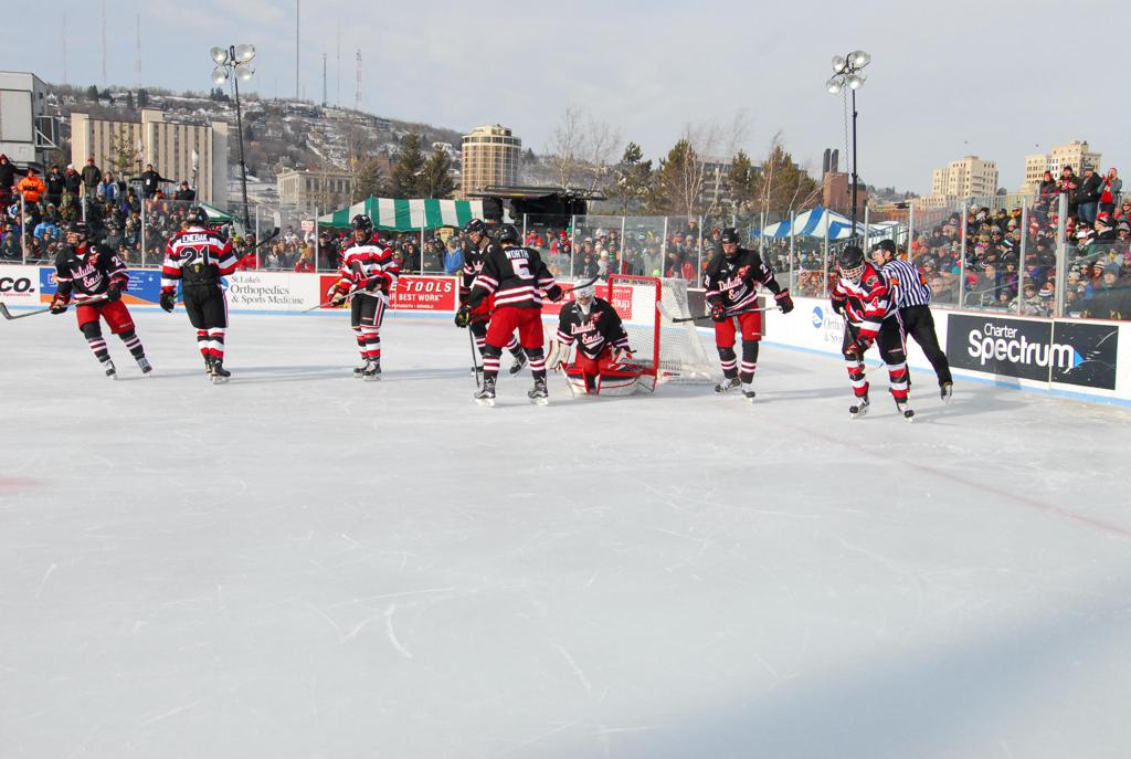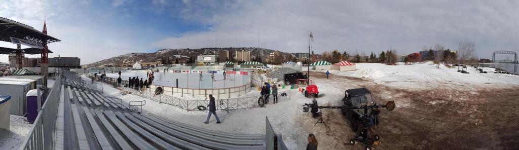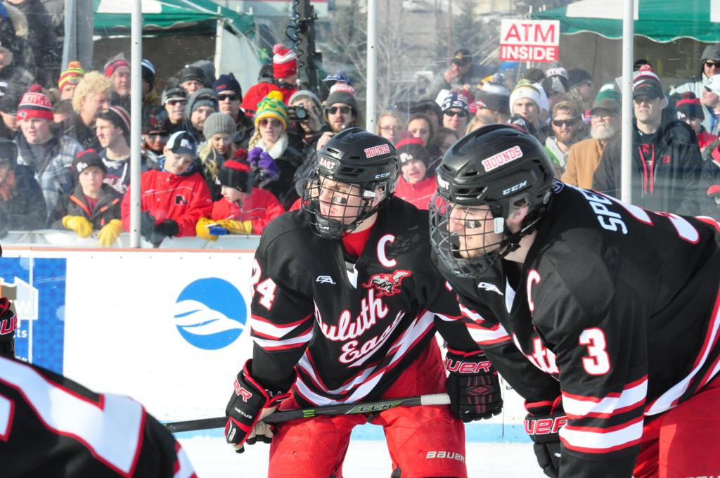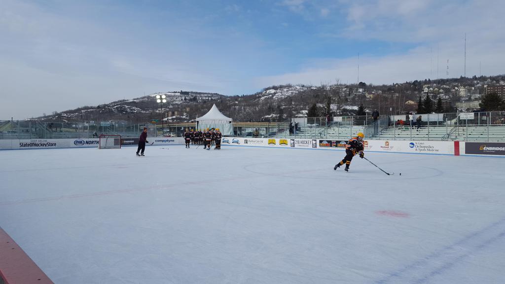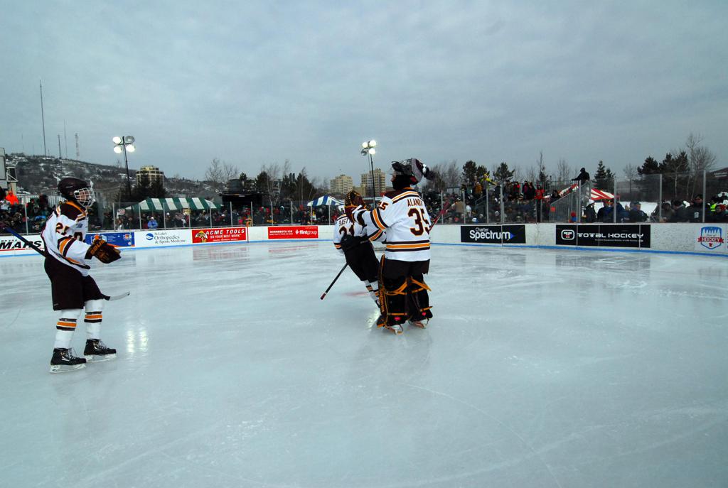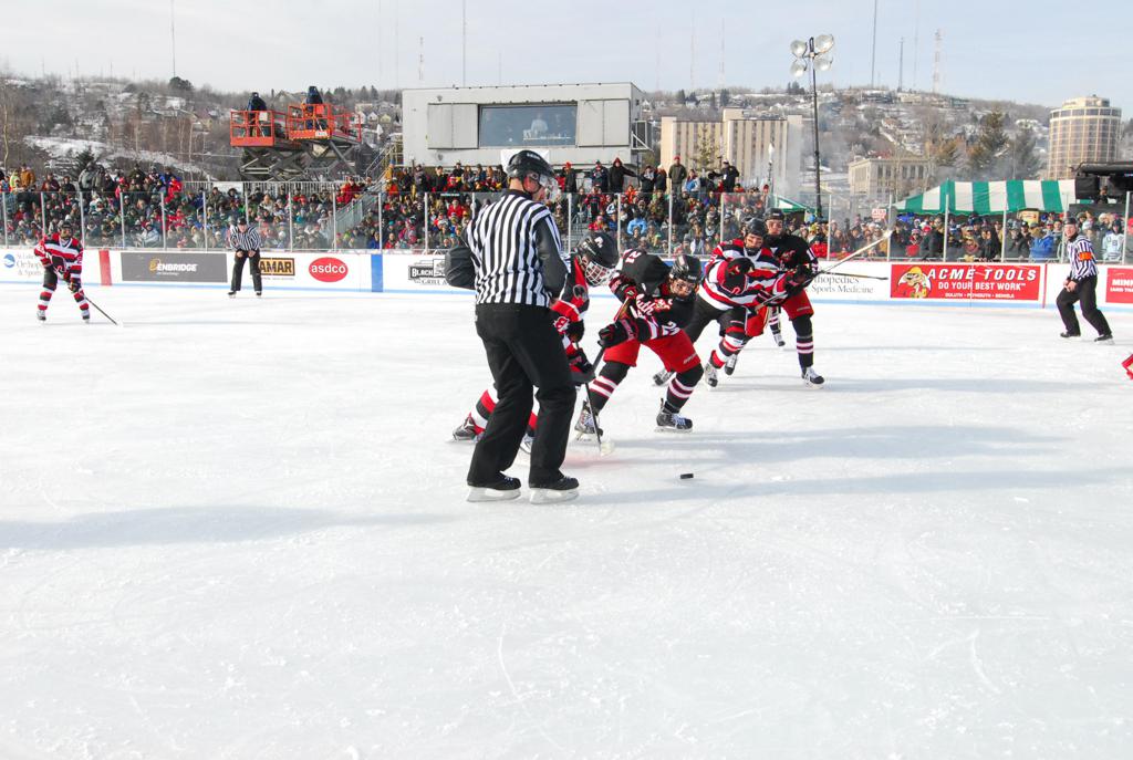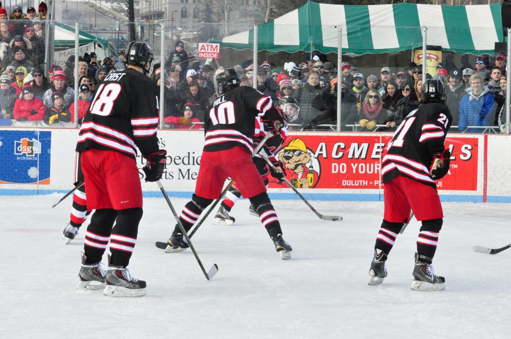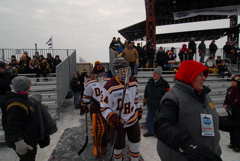 The afternoon marquee game between home-town Greyhounds of Duluth East vs. the visiting Panthers of Lakeville North began with Duluth hockey legends Jerry & Bob Fryberger dropping the ceremonial puck-drop. The game was quite the hard fought close game, between two Class AA powerful schools - both in striking red and black uniforms against the white ice - made for great images on the sunny day. Visiting Lakeville edged East by a close 3-2 regulation win. One thing that was quite odd and rather upsetting about HDM was the long LOUD hovering helicopter with camera man shooting footage through an open side door over the rink and crowd, it was so nousy on-site, spectators and players alike on the ice had a hard time hearing the referee whistles (fans on TV also had a hard time hearing the broadcast as the chopper blades were resonating through the microphones as well). Another quite upsetting thing, that led to collegiate changes going forward was - Duluth UMD Bulldogs Hockey team had a slated HOME game that afternoon - which Amsoil Arena was literally within eye site, and a few paces away by foot of the Duluth Bayfront Park, but were not apart of HDM. Fans at this time on social media started to gripe that this wasn't a Hockey Day Minnesota for all teams across the State - but was merely a Gophers Hockey Day, as the University of Minnesota had participated in every HDM to date. Things were about to change going forward in future years, to showcase ALL of the states Collegiate programs.