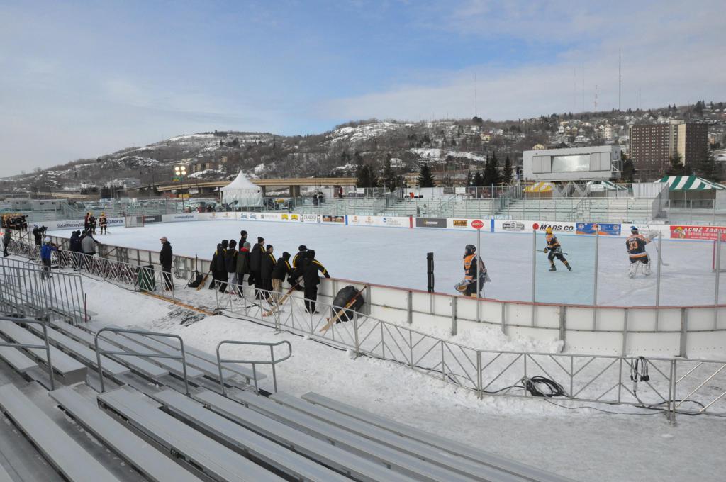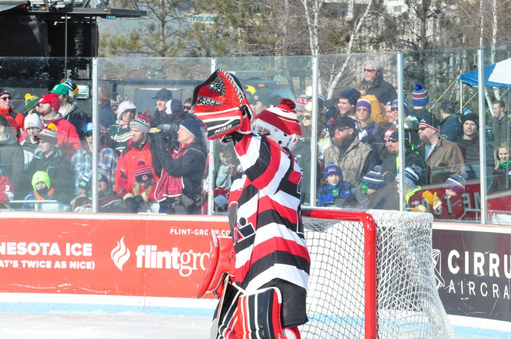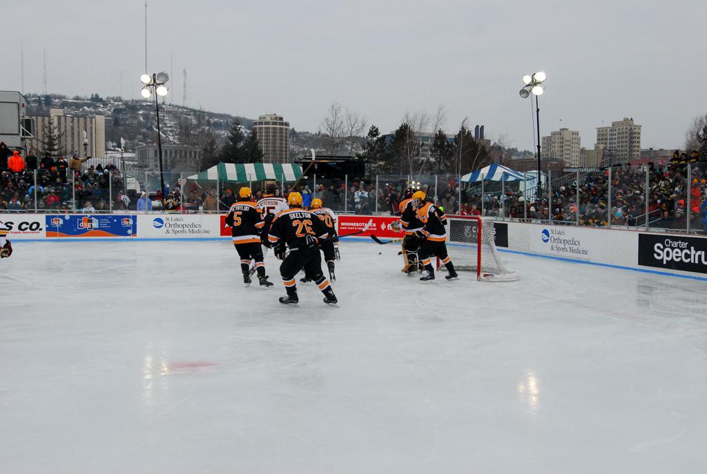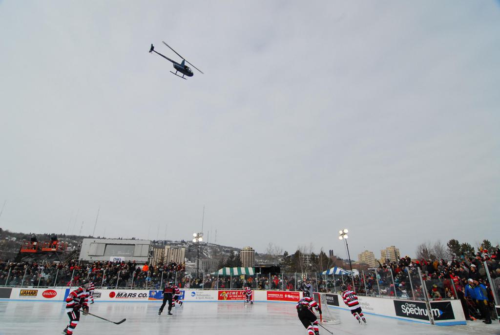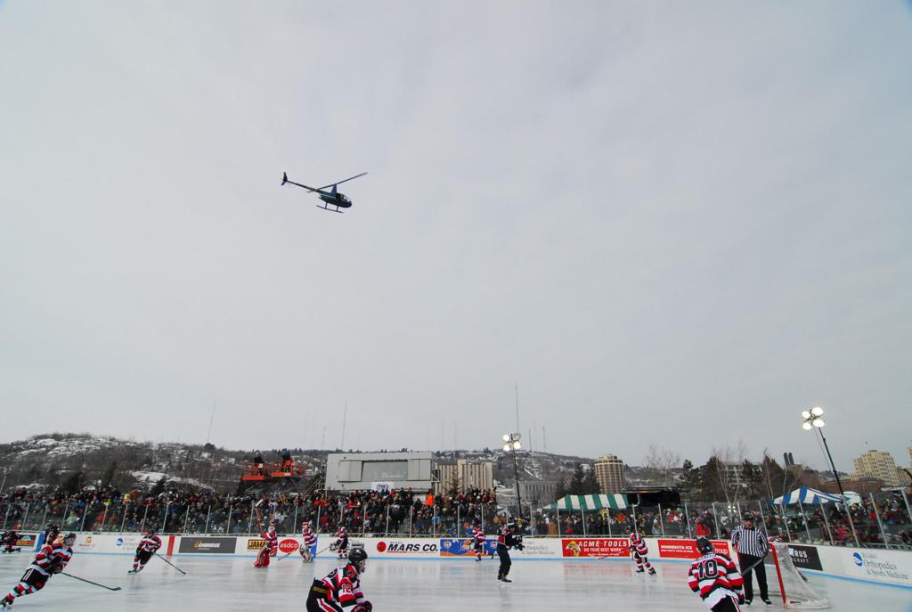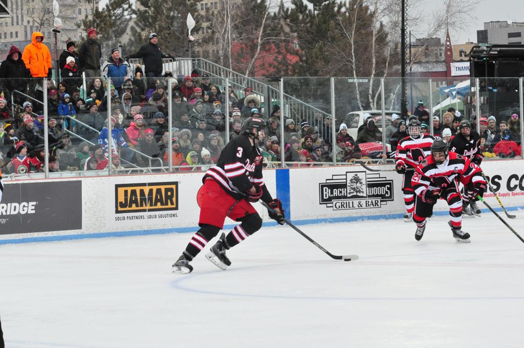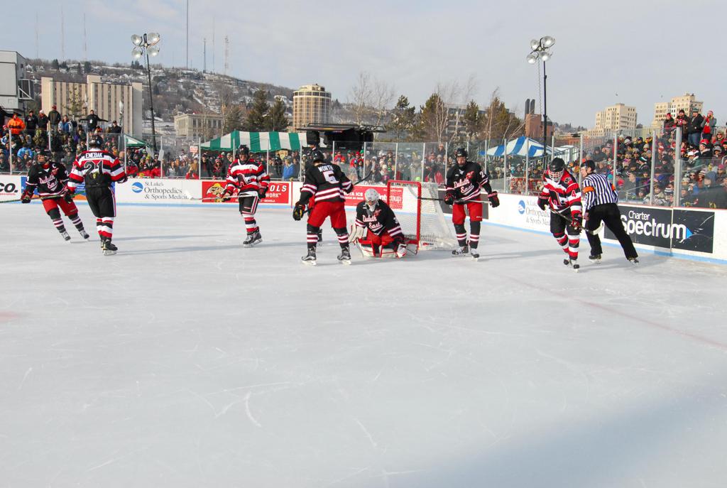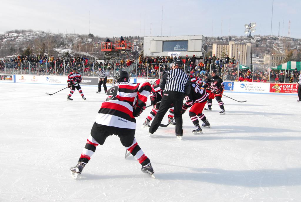 The afternoon marquee game between home-town Greyhounds of Duluth East vs. the visiting Panthers of Lakeville North began with Duluth hockey legends Jerry & Bob Fryberger dropping the ceremonial puck-drop. The game was quite the hard fought close game, between two Class AA powerful schools - both in striking red and black uniforms against the white ice - made for great images on the sunny day. Visiting Lakeville edged East by a close 3-2 regulation win. One thing that was quite odd and rather upsetting about HDM was the long LOUD hovering helicopter with camera man shooting footage through an open side door over the rink and crowd, it was so nousy on-site, spectators and players alike on the ice had a hard time hearing the referee whistles (fans on TV also had a hard time hearing the broadcast as the chopper blades were resonating through the microphones as well). Another quite upsetting thing, that led to collegiate changes going forward was - Duluth UMD Bulldogs Hockey team had a slated HOME game that afternoon - which Amsoil Arena was literally within eye site, and a few paces away by foot of the Duluth Bayfront Park, but were not apart of HDM. Fans at this time on social media started to gripe that this wasn't a Hockey Day Minnesota for all teams across the State - but was merely a Gophers Hockey Day, as the University of Minnesota had participated in every HDM to date. Things were about to change going forward in future years, to showcase ALL of the states Collegiate programs.