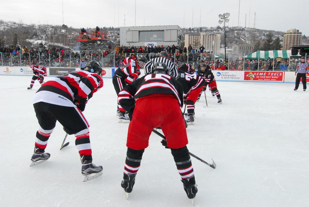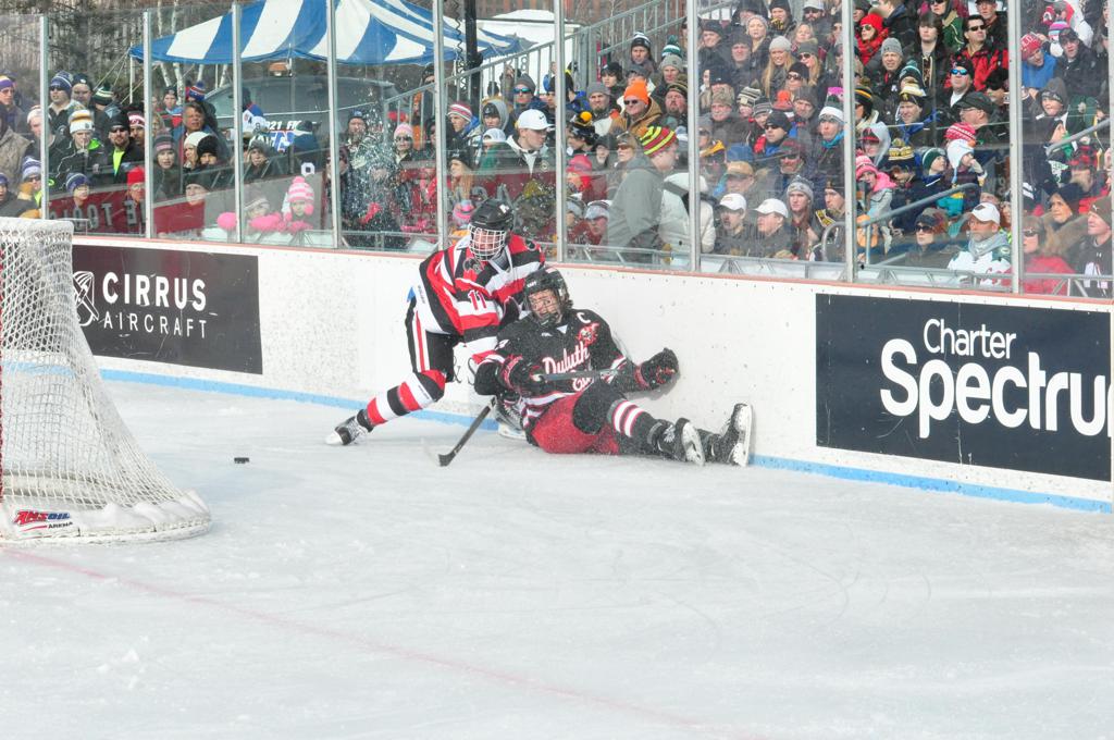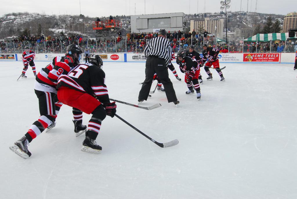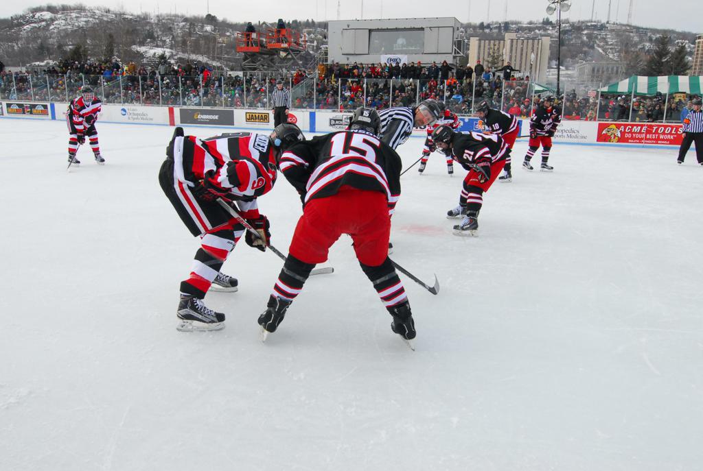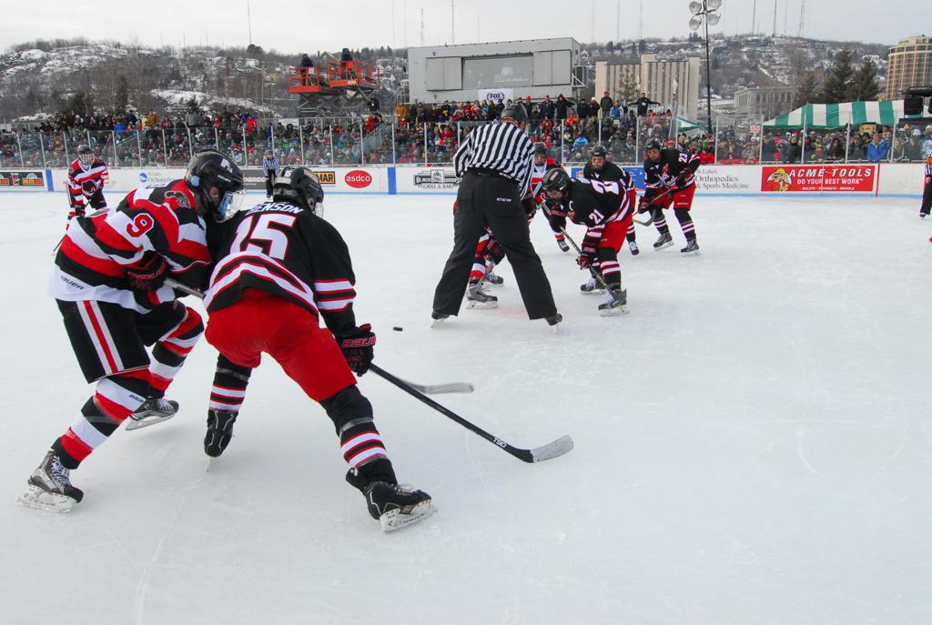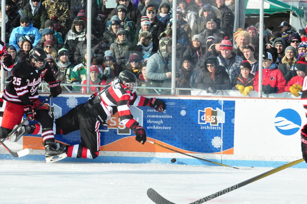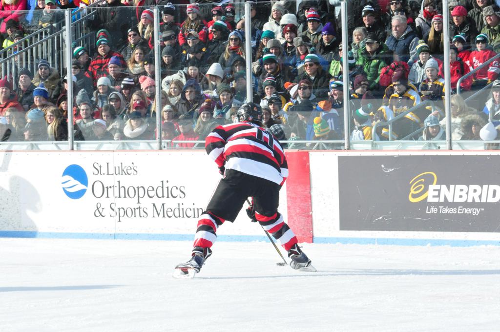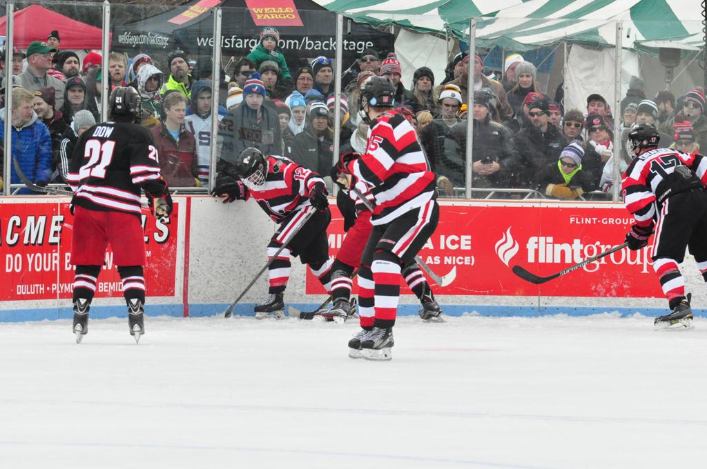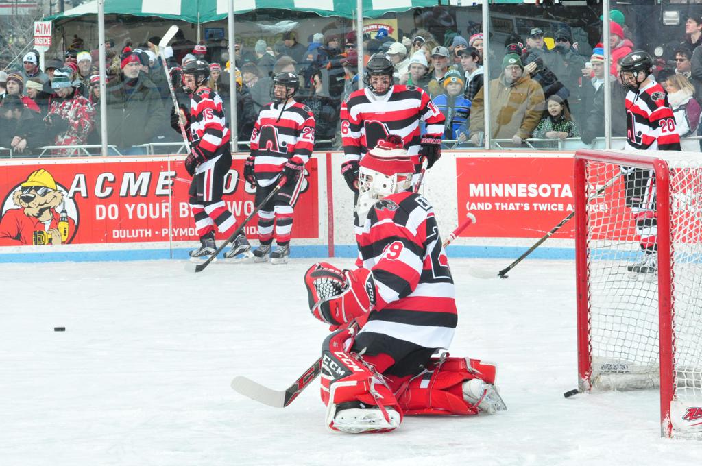 The afternoon marquee game between home-town Greyhounds of Duluth East vs. the visiting Panthers of Lakeville North began with Duluth hockey legends Jerry & Bob Fryberger dropping the ceremonial puck-drop. The game was quite the hard fought close game, between two Class AA powerful schools - both in striking red and black uniforms against the white ice - made for great images on the sunny day. Visiting Lakeville edged East by a close 3-2 regulation win. One thing that was quite odd and rather upsetting about HDM was the long LOUD hovering helicopter with camera man shooting footage through an open side door over the rink and crowd, it was so nousy on-site, spectators and players alike on the ice had a hard time hearing the referee whistles (fans on TV also had a hard time hearing the broadcast as the chopper blades were resonating through the microphones as well). Another quite upsetting thing, that led to collegiate changes going forward was - Duluth UMD Bulldogs Hockey team had a slated HOME game that afternoon - which Amsoil Arena was literally within eye site, and a few paces away by foot of the Duluth Bayfront Park, but were not apart of HDM. Fans at this time on social media started to gripe that this wasn't a Hockey Day Minnesota for all teams across the State - but was merely a Gophers Hockey Day, as the University of Minnesota had participated in every HDM to date. Things were about to change going forward in future years, to showcase ALL of the states Collegiate programs.