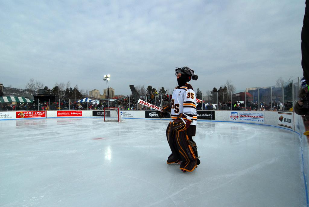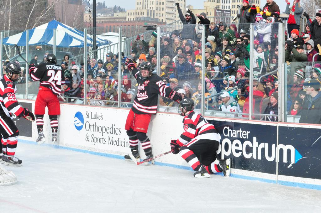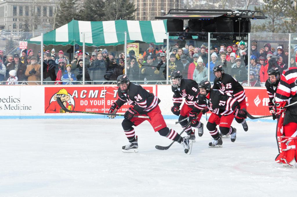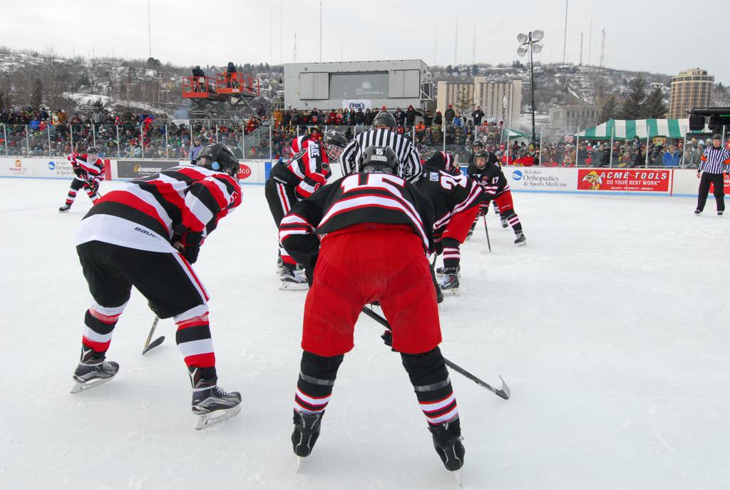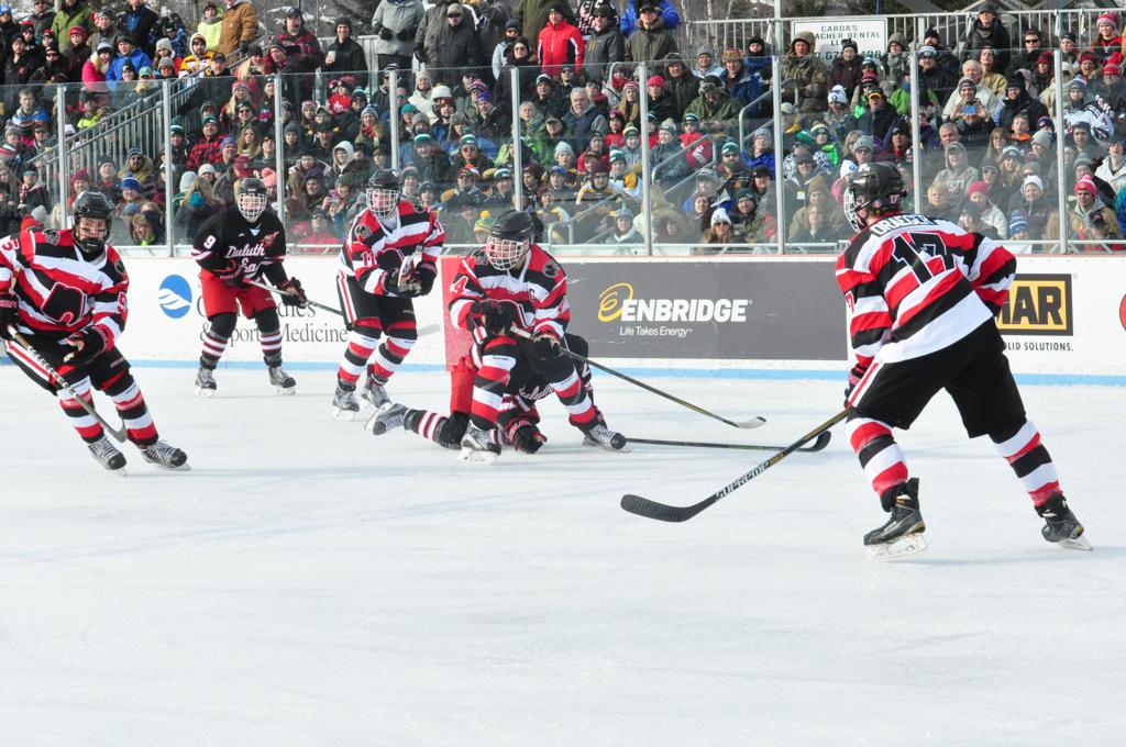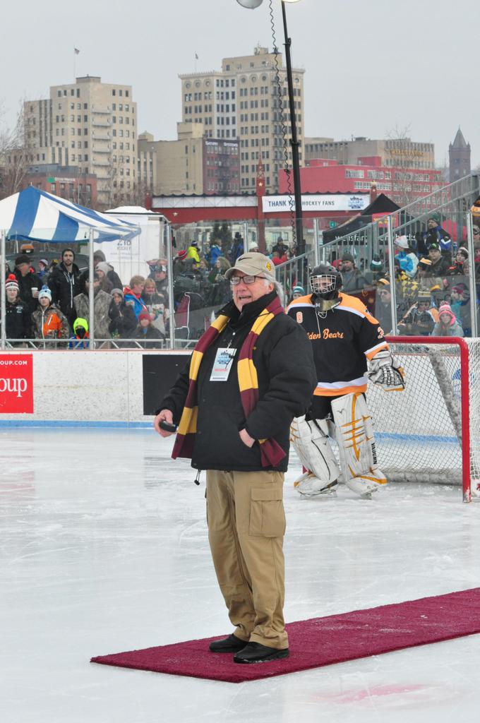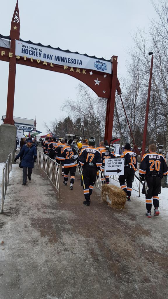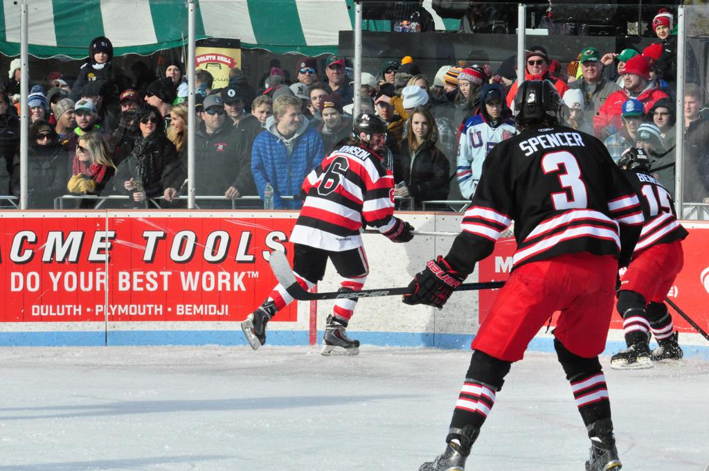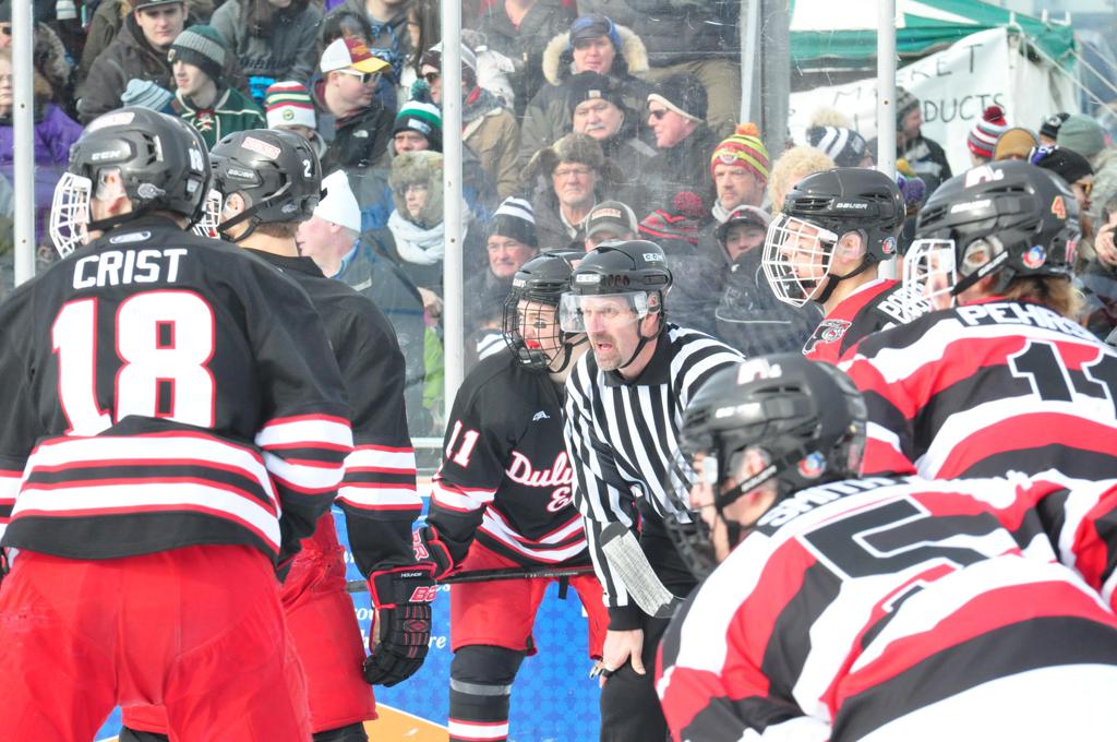 The afternoon marquee game between home-town Greyhounds of Duluth East vs. the visiting Panthers of Lakeville North began with Duluth hockey legends Jerry & Bob Fryberger dropping the ceremonial puck-drop. The game was quite the hard fought close game, between two Class AA powerful schools - both in striking red and black uniforms against the white ice - made for great images on the sunny day. Visiting Lakeville edged East by a close 3-2 regulation win. One thing that was quite odd and rather upsetting about HDM was the long LOUD hovering helicopter with camera man shooting footage through an open side door over the rink and crowd, it was so nousy on-site, spectators and players alike on the ice had a hard time hearing the referee whistles (fans on TV also had a hard time hearing the broadcast as the chopper blades were resonating through the microphones as well). Another quite upsetting thing, that led to collegiate changes going forward was - Duluth UMD Bulldogs Hockey team had a slated HOME game that afternoon - which Amsoil Arena was literally within eye site, and a few paces away by foot of the Duluth Bayfront Park, but were not apart of HDM. Fans at this time on social media started to gripe that this wasn't a Hockey Day Minnesota for all teams across the State - but was merely a Gophers Hockey Day, as the University of Minnesota had participated in every HDM to date. Things were about to change going forward in future years, to showcase ALL of the states Collegiate programs.