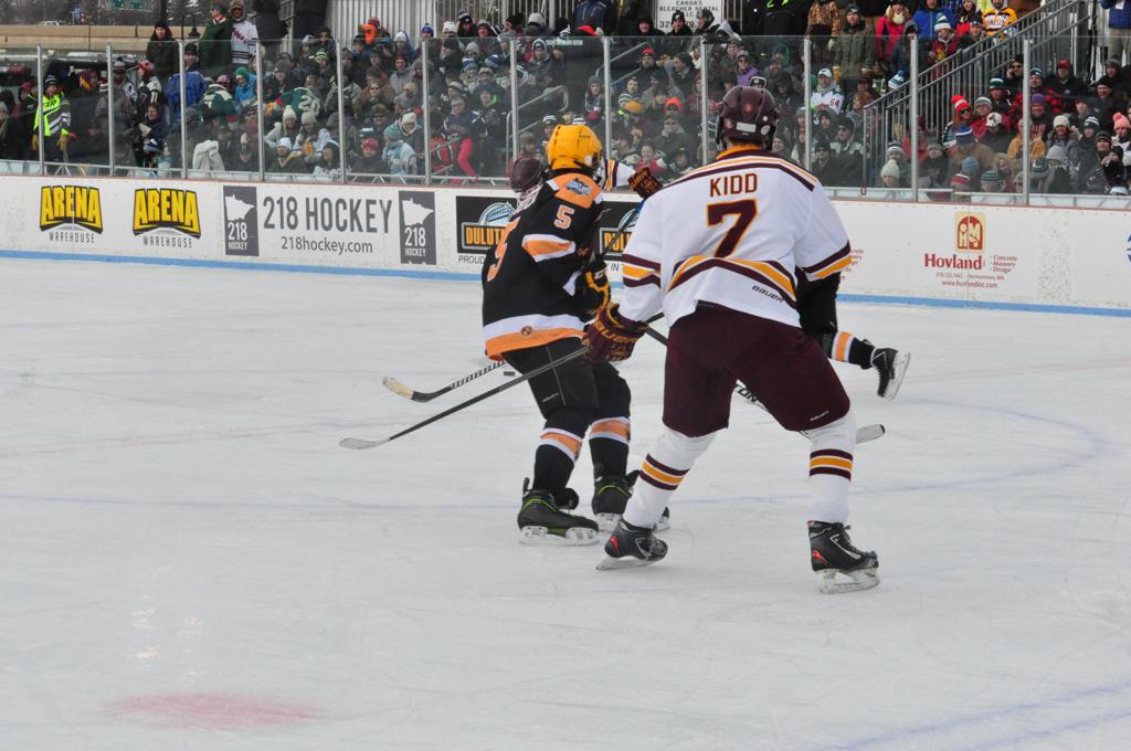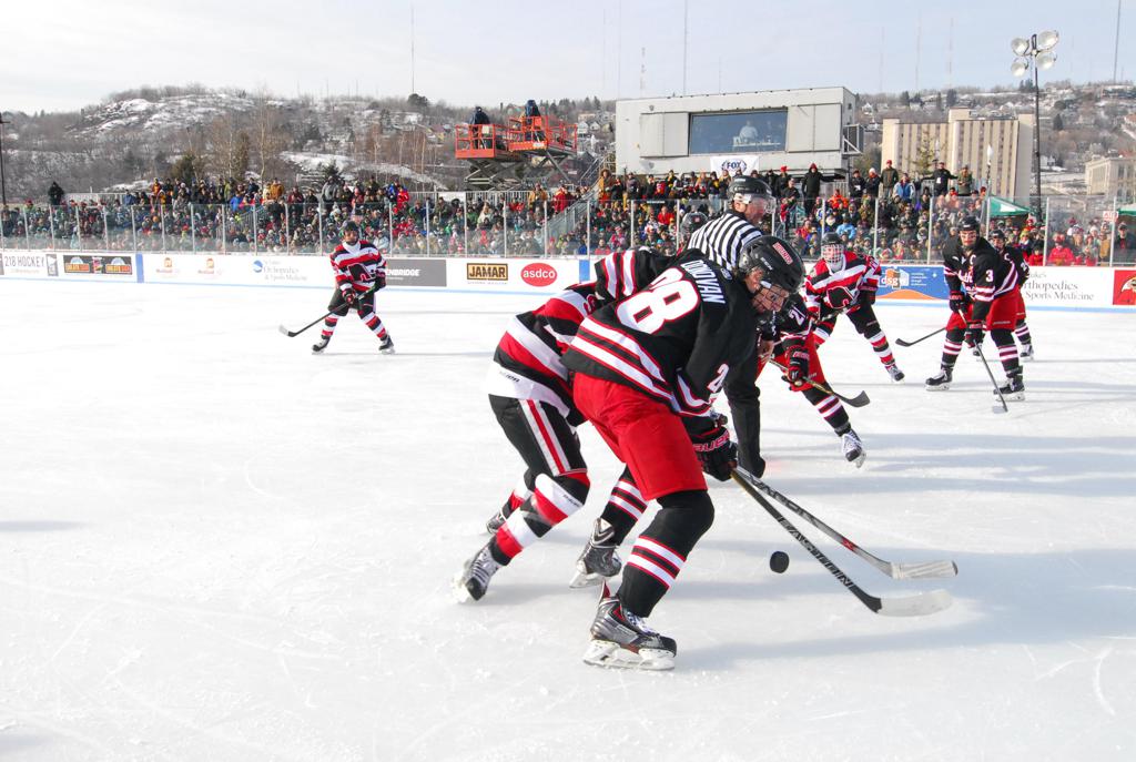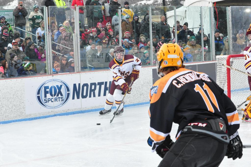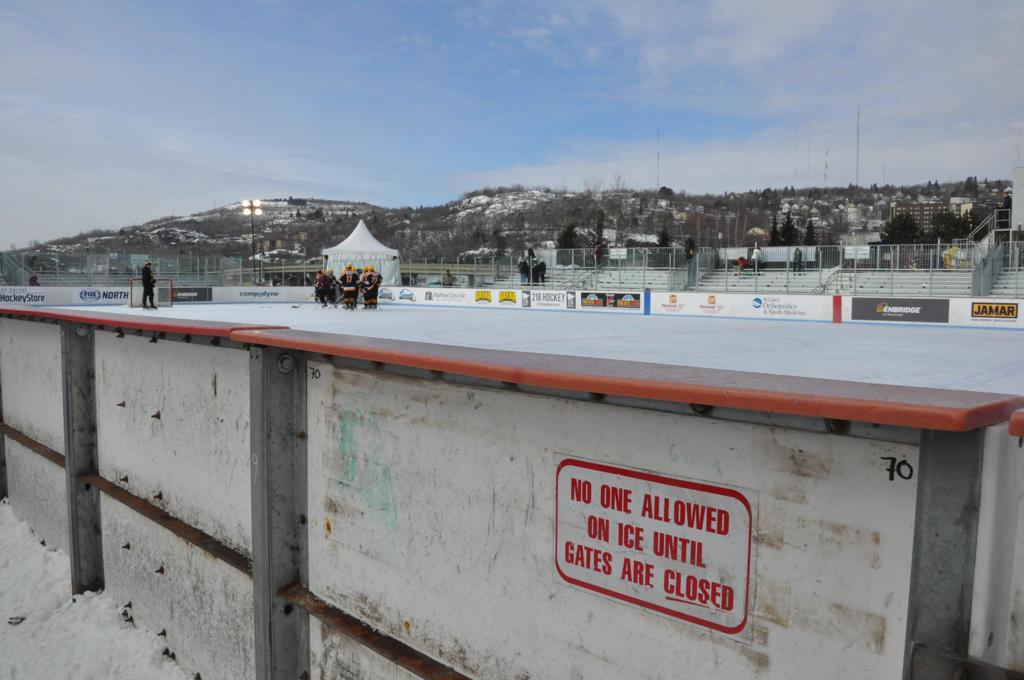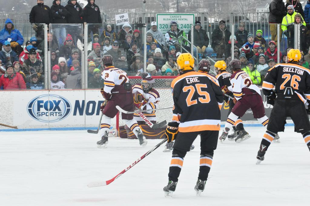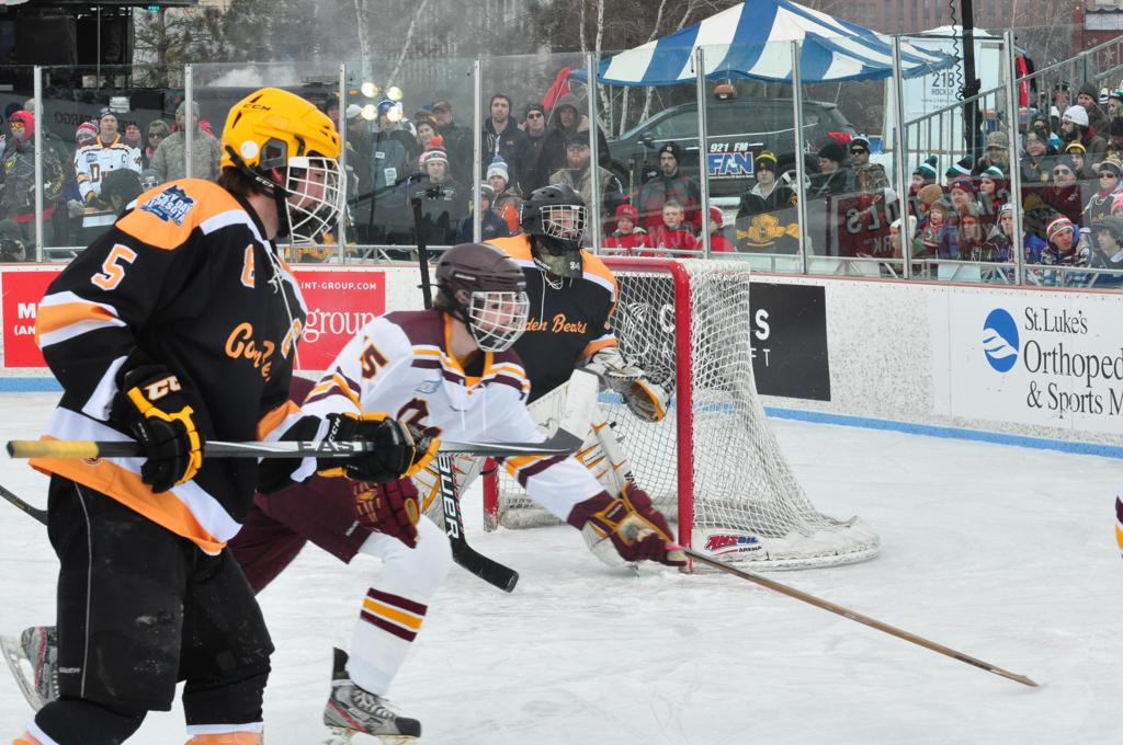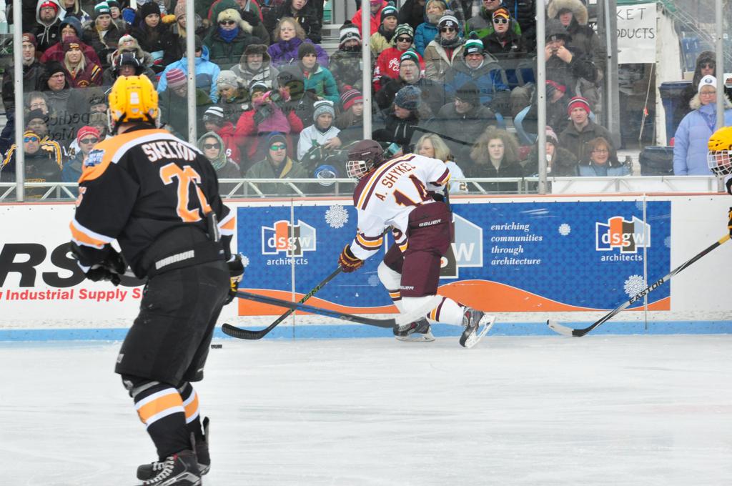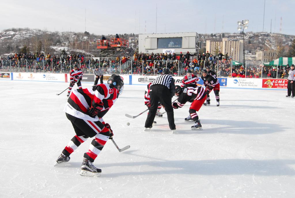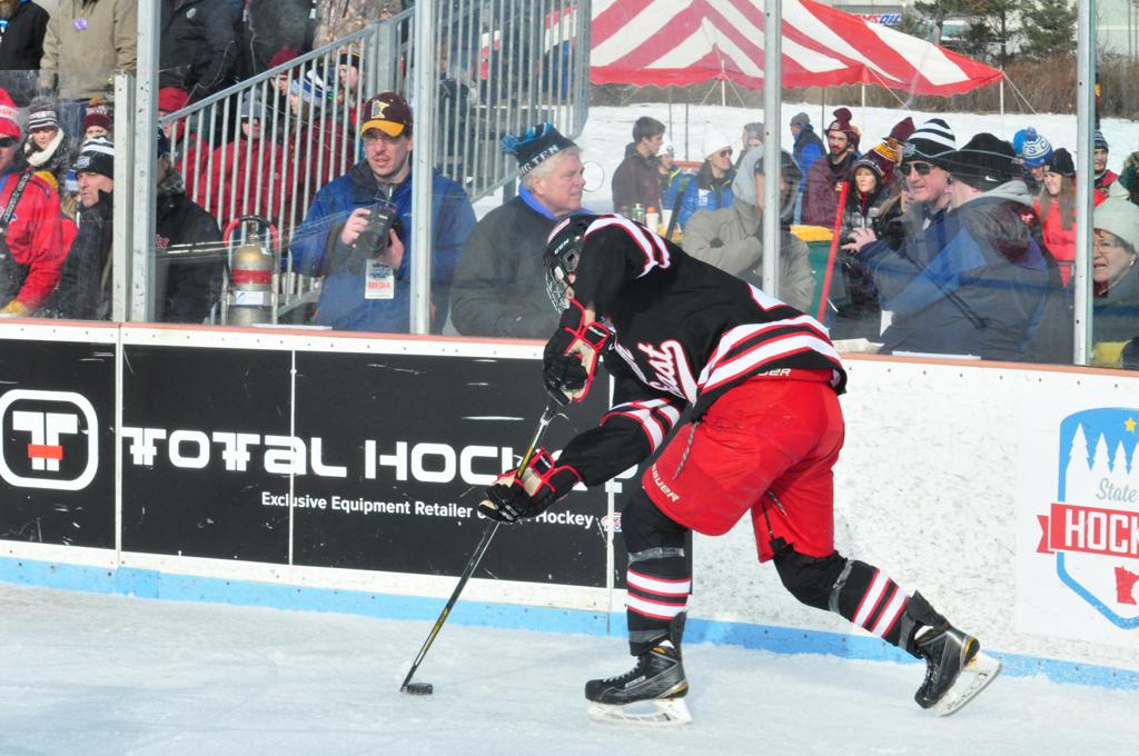 The afternoon marquee game between home-town Greyhounds of Duluth East vs. the visiting Panthers of Lakeville North began with Duluth hockey legends Jerry & Bob Fryberger dropping the ceremonial puck-drop. The game was quite the hard fought close game, between two Class AA powerful schools - both in striking red and black uniforms against the white ice - made for great images on the sunny day. Visiting Lakeville edged East by a close 3-2 regulation win. One thing that was quite odd and rather upsetting about HDM was the long LOUD hovering helicopter with camera man shooting footage through an open side door over the rink and crowd, it was so nousy on-site, spectators and players alike on the ice had a hard time hearing the referee whistles (fans on TV also had a hard time hearing the broadcast as the chopper blades were resonating through the microphones as well). Another quite upsetting thing, that led to collegiate changes going forward was - Duluth UMD Bulldogs Hockey team had a slated HOME game that afternoon - which Amsoil Arena was literally within eye site, and a few paces away by foot of the Duluth Bayfront Park, but were not apart of HDM. Fans at this time on social media started to gripe that this wasn't a Hockey Day Minnesota for all teams across the State - but was merely a Gophers Hockey Day, as the University of Minnesota had participated in every HDM to date. Things were about to change going forward in future years, to showcase ALL of the states Collegiate programs.