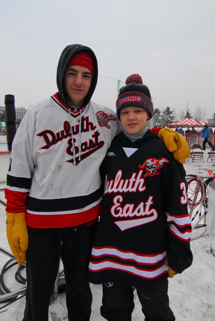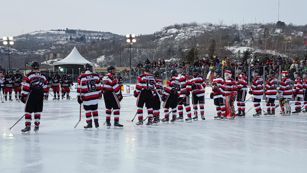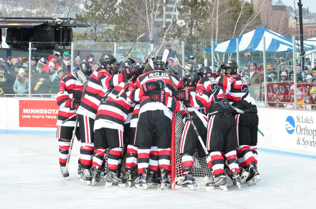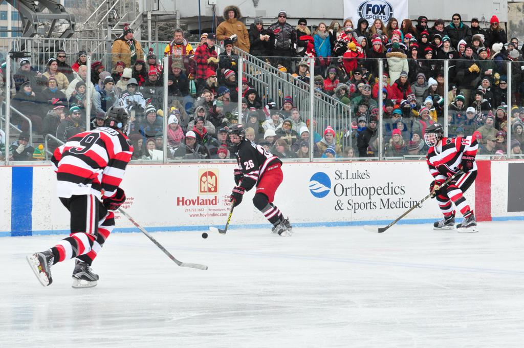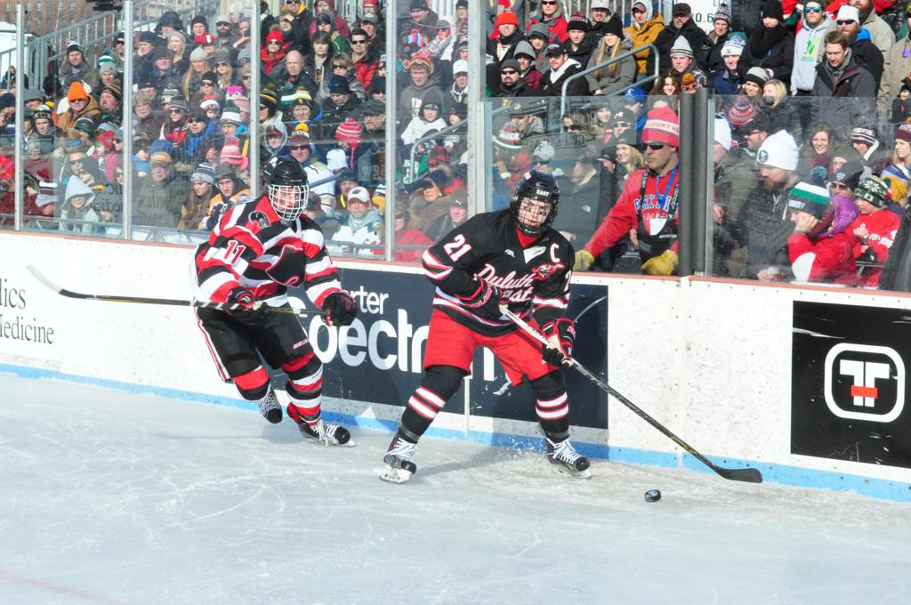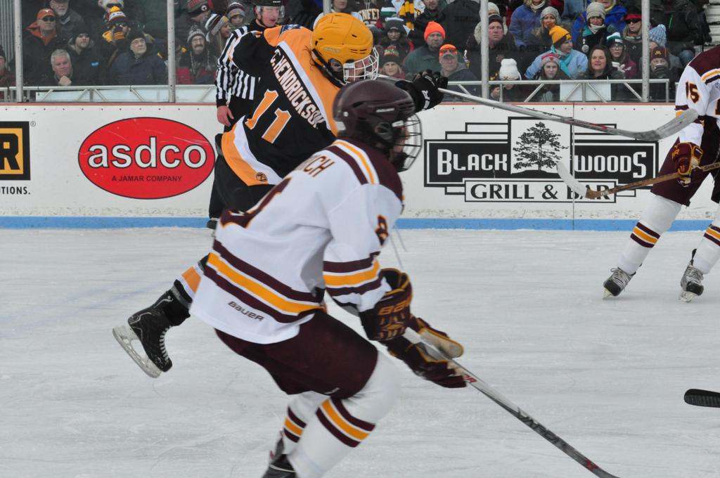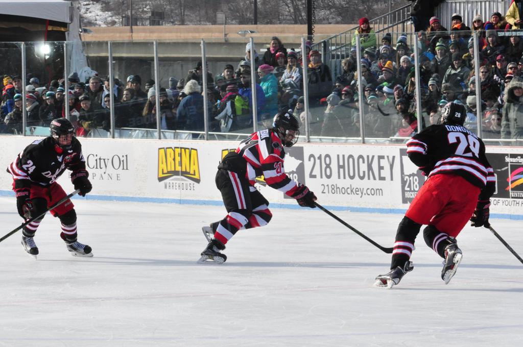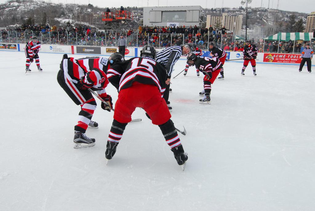 The afternoon marquee game between home-town Greyhounds of Duluth East vs. the visiting Panthers of Lakeville North began with Duluth hockey legends Jerry & Bob Fryberger dropping the ceremonial puck-drop. The game was quite the hard fought close game, between two Class AA powerful schools - both in striking red and black uniforms against the white ice - made for great images on the sunny day. Visiting Lakeville edged East by a close 3-2 regulation win. One thing that was quite odd and rather upsetting about HDM was the long LOUD hovering helicopter with camera man shooting footage through an open side door over the rink and crowd, it was so nousy on-site, spectators and players alike on the ice had a hard time hearing the referee whistles (fans on TV also had a hard time hearing the broadcast as the chopper blades were resonating through the microphones as well). Another quite upsetting thing, that led to collegiate changes going forward was - Duluth UMD Bulldogs Hockey team had a slated HOME game that afternoon - which Amsoil Arena was literally within eye site, and a few paces away by foot of the Duluth Bayfront Park, but were not apart of HDM. Fans at this time on social media started to gripe that this wasn't a Hockey Day Minnesota for all teams across the State - but was merely a Gophers Hockey Day, as the University of Minnesota had participated in every HDM to date. Things were about to change going forward in future years, to showcase ALL of the states Collegiate programs.