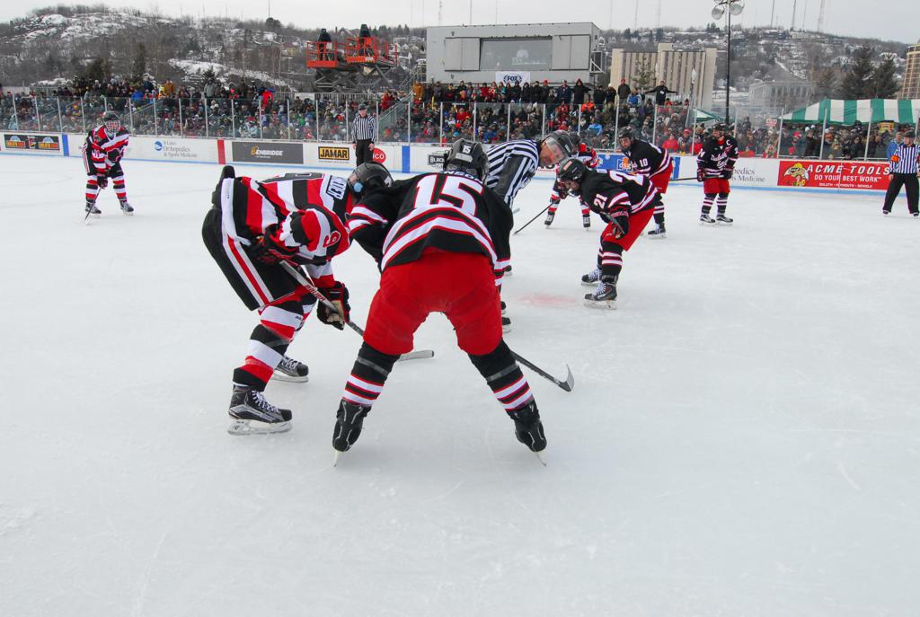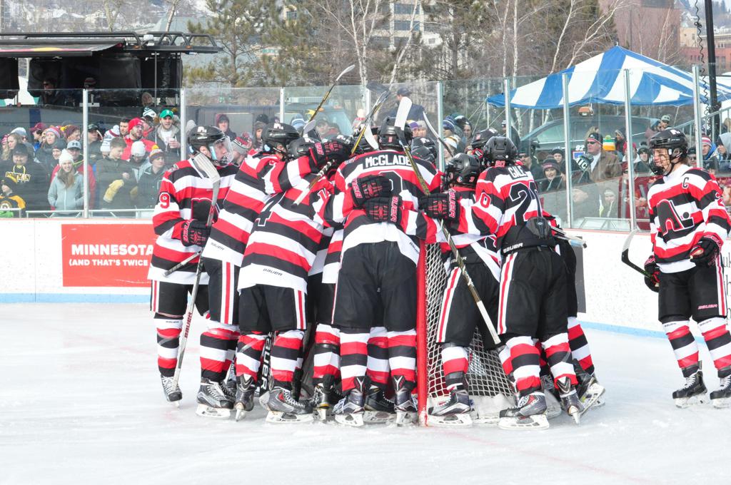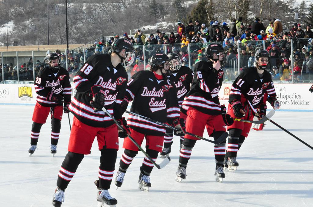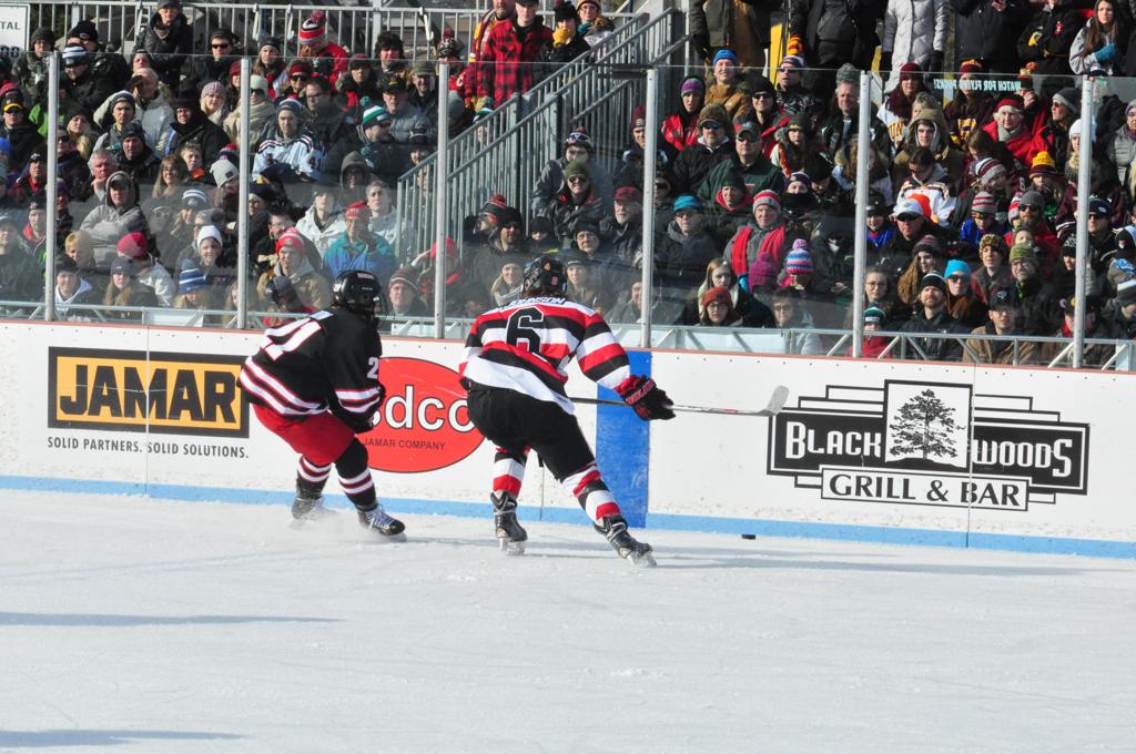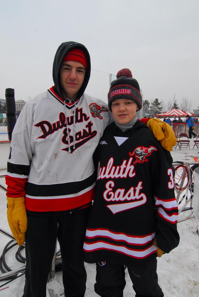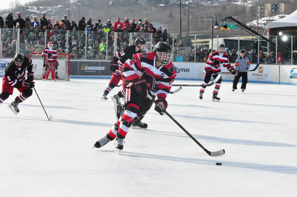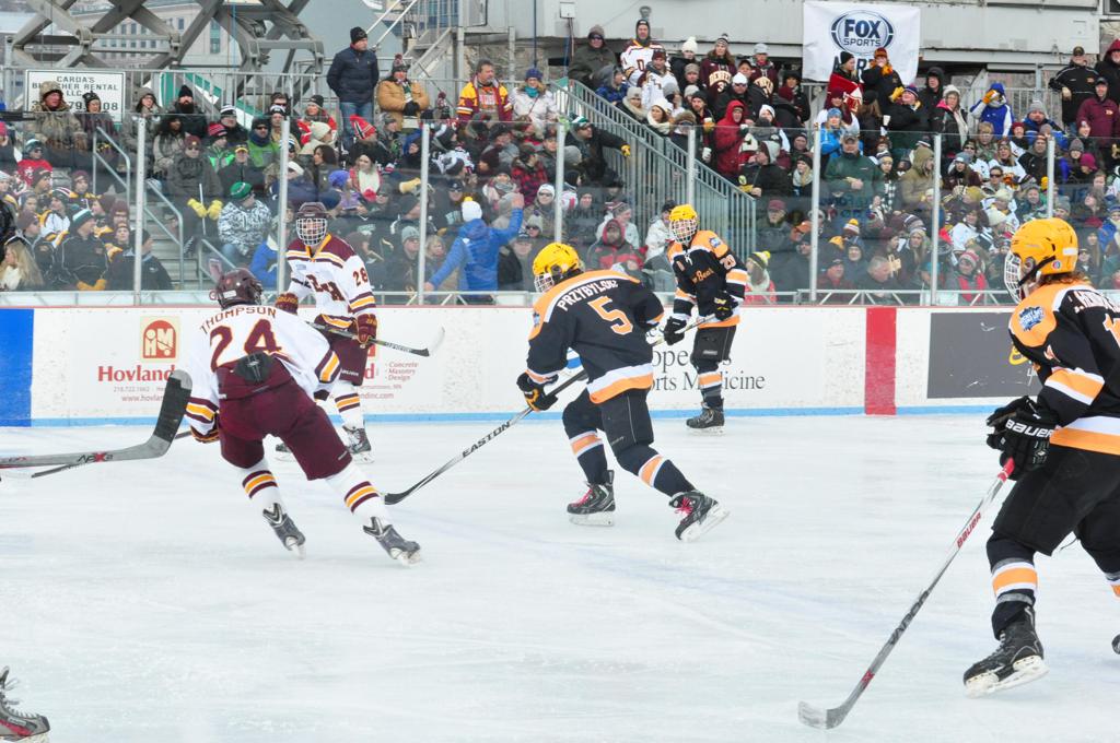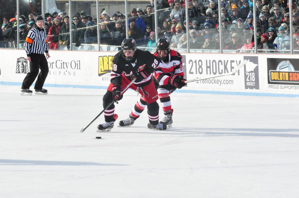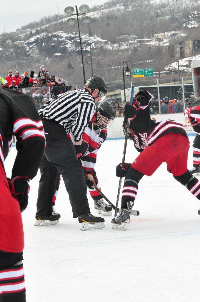 The afternoon marquee game between home-town Greyhounds of Duluth East vs. the visiting Panthers of Lakeville North began with Duluth hockey legends Jerry & Bob Fryberger dropping the ceremonial puck-drop. The game was quite the hard fought close game, between two Class AA powerful schools - both in striking red and black uniforms against the white ice - made for great images on the sunny day. Visiting Lakeville edged East by a close 3-2 regulation win. One thing that was quite odd and rather upsetting about HDM was the long LOUD hovering helicopter with camera man shooting footage through an open side door over the rink and crowd, it was so nousy on-site, spectators and players alike on the ice had a hard time hearing the referee whistles (fans on TV also had a hard time hearing the broadcast as the chopper blades were resonating through the microphones as well). Another quite upsetting thing, that led to collegiate changes going forward was - Duluth UMD Bulldogs Hockey team had a slated HOME game that afternoon - which Amsoil Arena was literally within eye site, and a few paces away by foot of the Duluth Bayfront Park, but were not apart of HDM. Fans at this time on social media started to gripe that this wasn't a Hockey Day Minnesota for all teams across the State - but was merely a Gophers Hockey Day, as the University of Minnesota had participated in every HDM to date. Things were about to change going forward in future years, to showcase ALL of the states Collegiate programs.