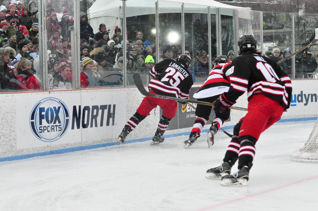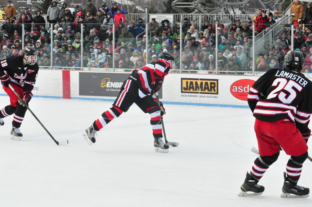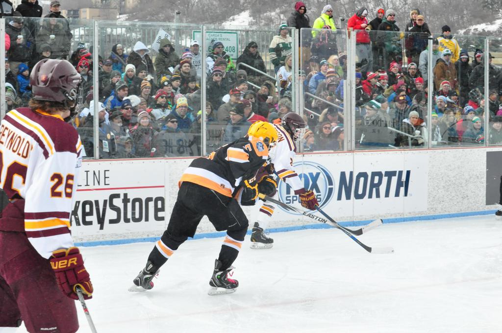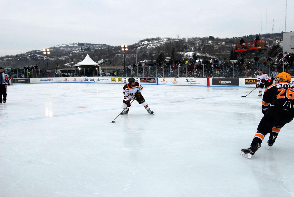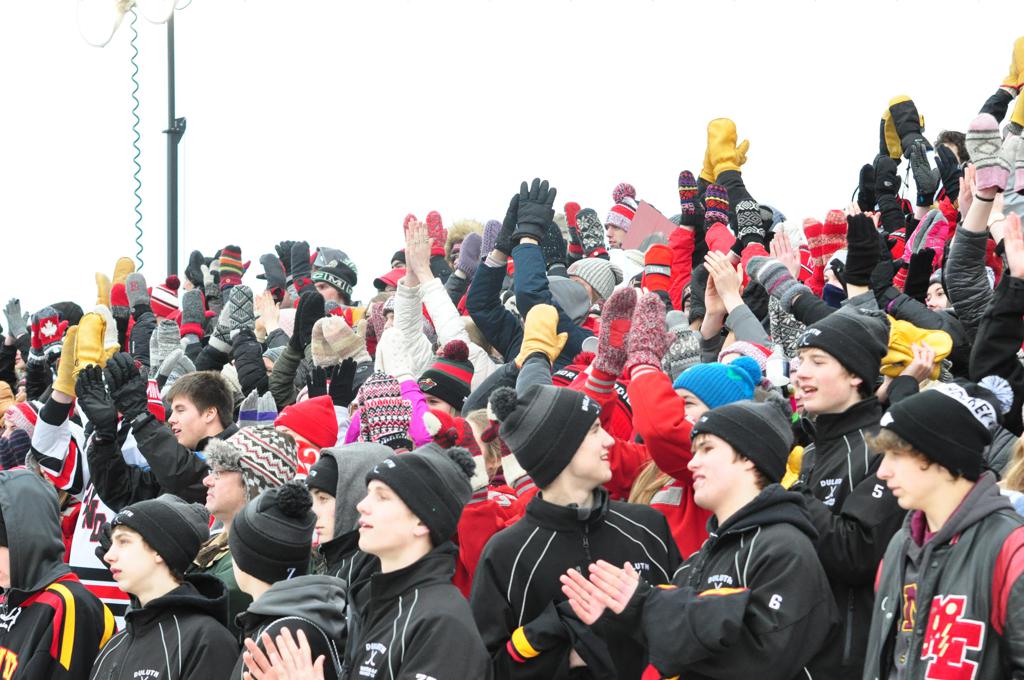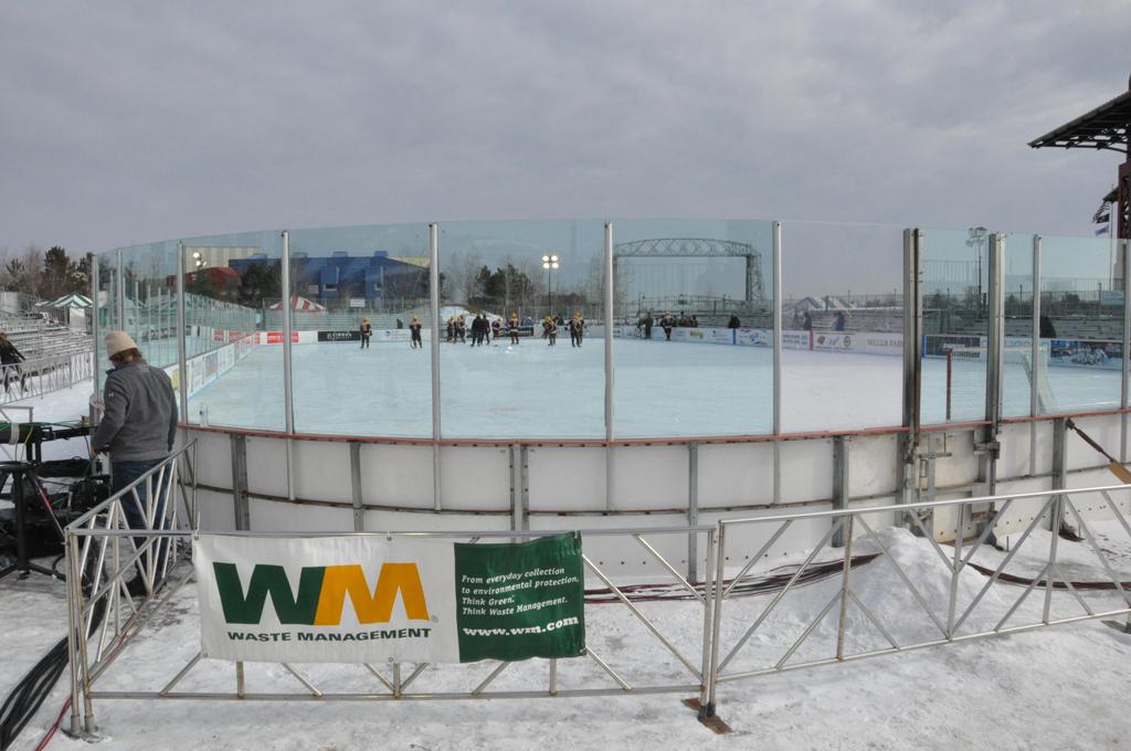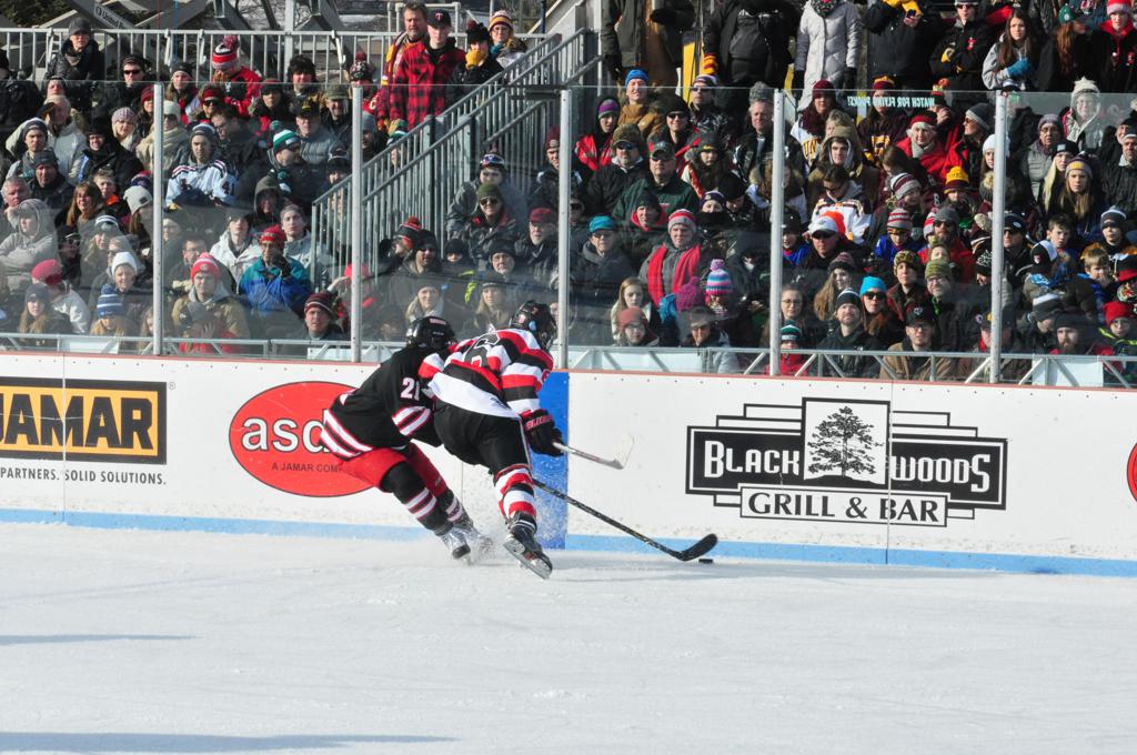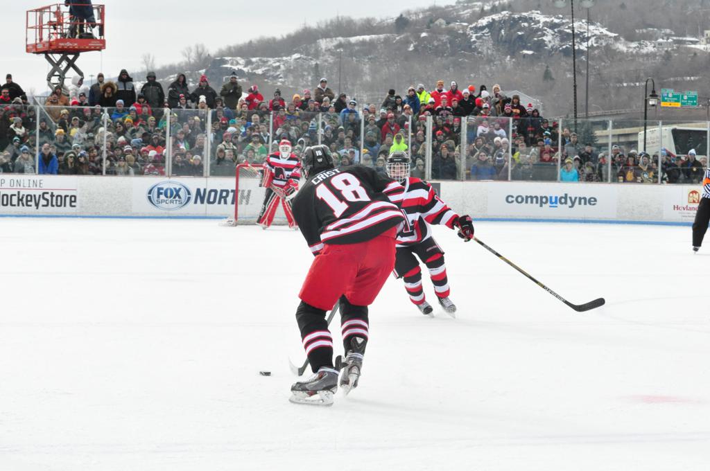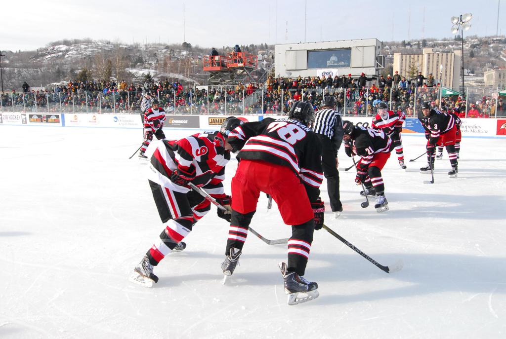 The afternoon marquee game between home-town Greyhounds of Duluth East vs. the visiting Panthers of Lakeville North began with Duluth hockey legends Jerry & Bob Fryberger dropping the ceremonial puck-drop. The game was quite the hard fought close game, between two Class AA powerful schools - both in striking red and black uniforms against the white ice - made for great images on the sunny day. Visiting Lakeville edged East by a close 3-2 regulation win. One thing that was quite odd and rather upsetting about HDM was the long LOUD hovering helicopter with camera man shooting footage through an open side door over the rink and crowd, it was so nousy on-site, spectators and players alike on the ice had a hard time hearing the referee whistles (fans on TV also had a hard time hearing the broadcast as the chopper blades were resonating through the microphones as well). Another quite upsetting thing, that led to collegiate changes going forward was - Duluth UMD Bulldogs Hockey team had a slated HOME game that afternoon - which Amsoil Arena was literally within eye site, and a few paces away by foot of the Duluth Bayfront Park, but were not apart of HDM. Fans at this time on social media started to gripe that this wasn't a Hockey Day Minnesota for all teams across the State - but was merely a Gophers Hockey Day, as the University of Minnesota had participated in every HDM to date. Things were about to change going forward in future years, to showcase ALL of the states Collegiate programs.