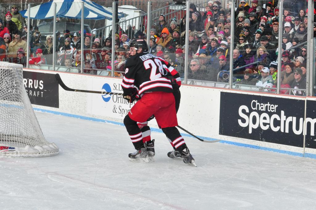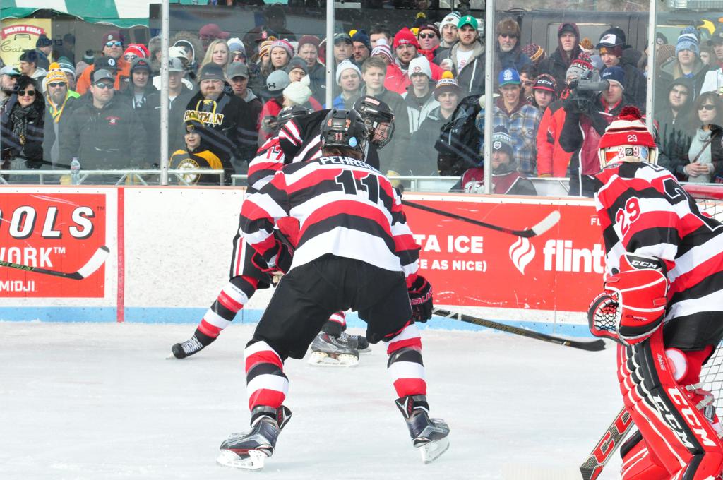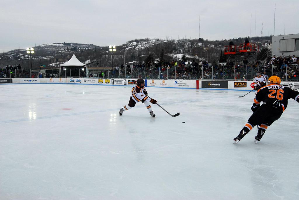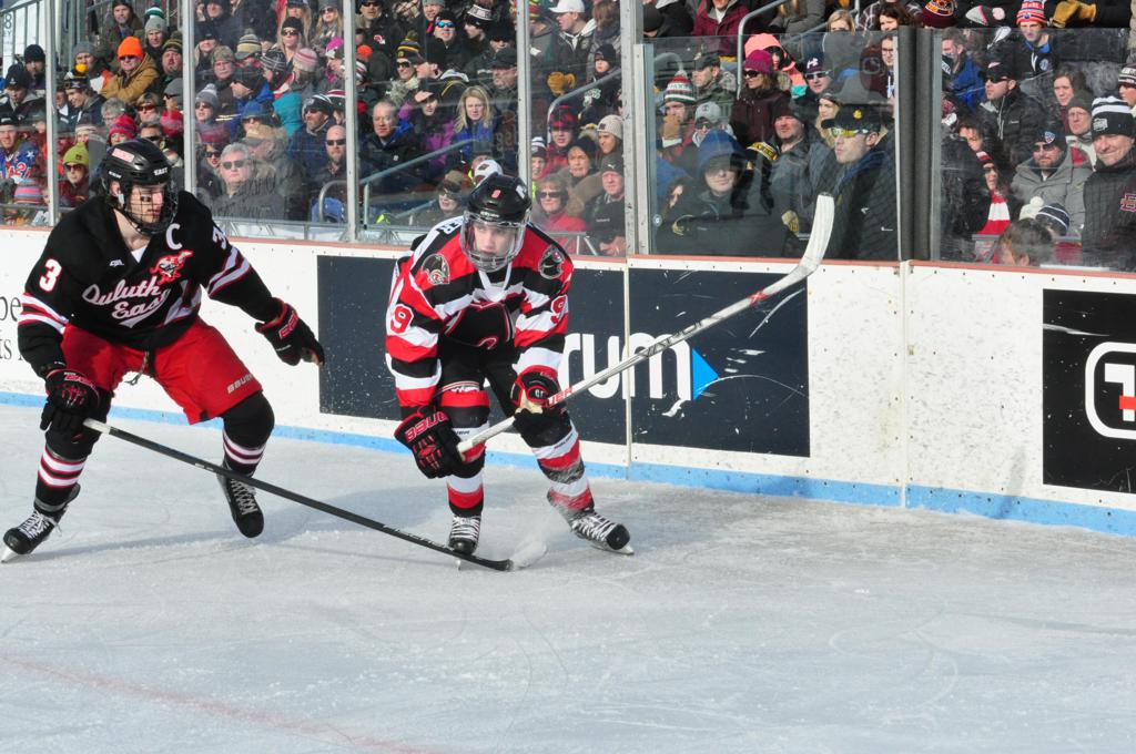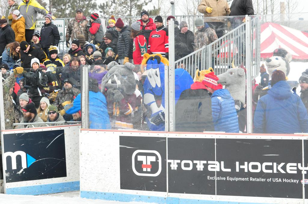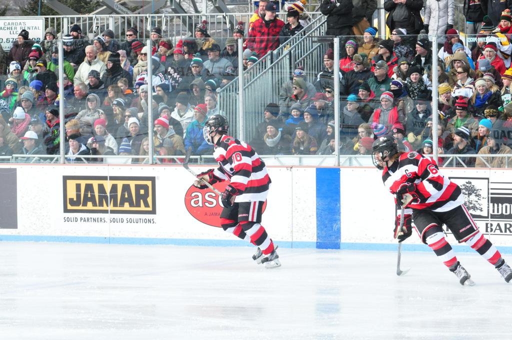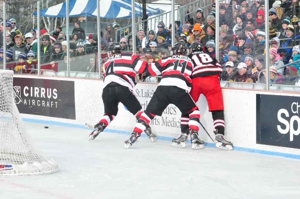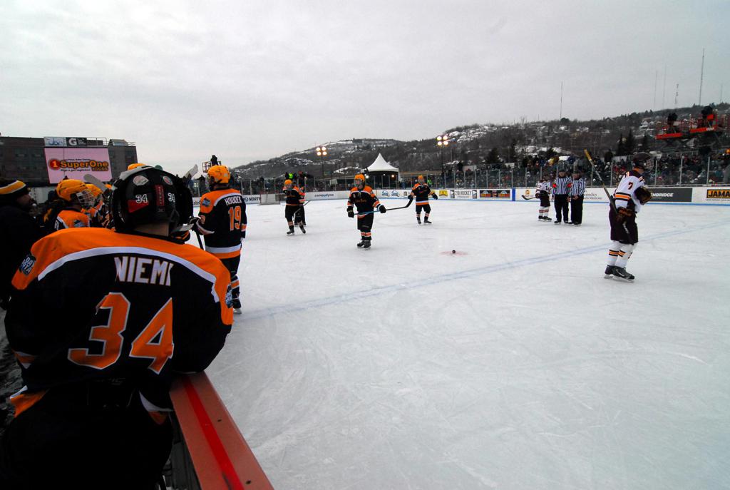 The afternoon marquee game between home-town Greyhounds of Duluth East vs. the visiting Panthers of Lakeville North began with Duluth hockey legends Jerry & Bob Fryberger dropping the ceremonial puck-drop. The game was quite the hard fought close game, between two Class AA powerful schools - both in striking red and black uniforms against the white ice - made for great images on the sunny day. Visiting Lakeville edged East by a close 3-2 regulation win. One thing that was quite odd and rather upsetting about HDM was the long LOUD hovering helicopter with camera man shooting footage through an open side door over the rink and crowd, it was so nousy on-site, spectators and players alike on the ice had a hard time hearing the referee whistles (fans on TV also had a hard time hearing the broadcast as the chopper blades were resonating through the microphones as well). Another quite upsetting thing, that led to collegiate changes going forward was - Duluth UMD Bulldogs Hockey team had a slated HOME game that afternoon - which Amsoil Arena was literally within eye site, and a few paces away by foot of the Duluth Bayfront Park, but were not apart of HDM. Fans at this time on social media started to gripe that this wasn't a Hockey Day Minnesota for all teams across the State - but was merely a Gophers Hockey Day, as the University of Minnesota had participated in every HDM to date. Things were about to change going forward in future years, to showcase ALL of the states Collegiate programs.