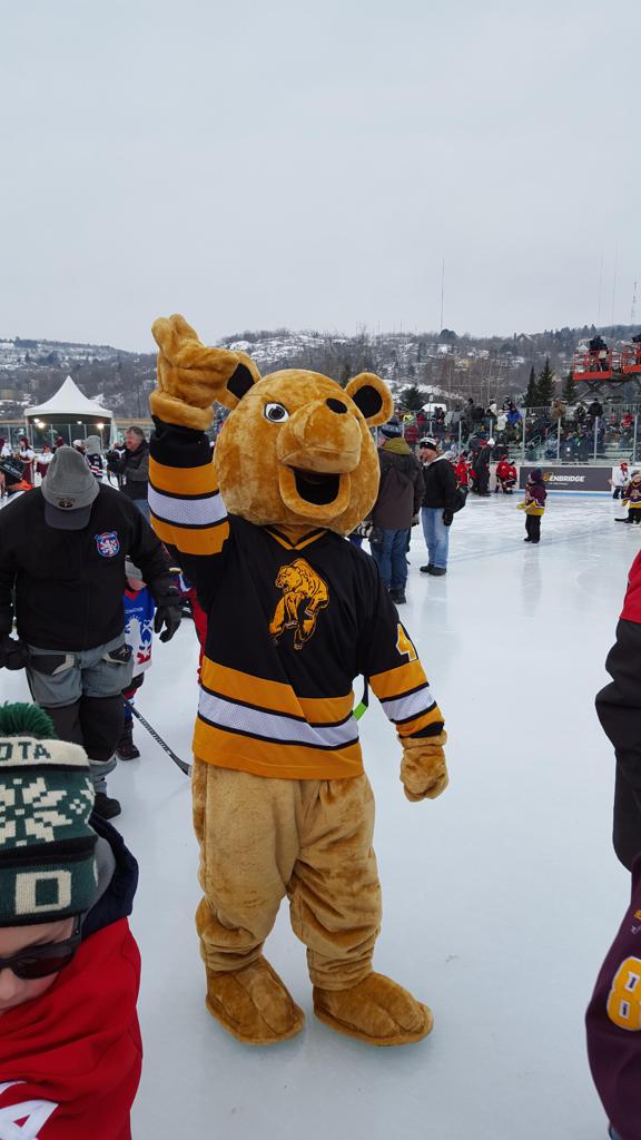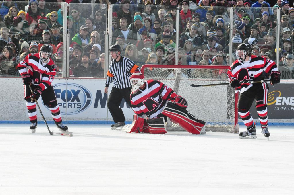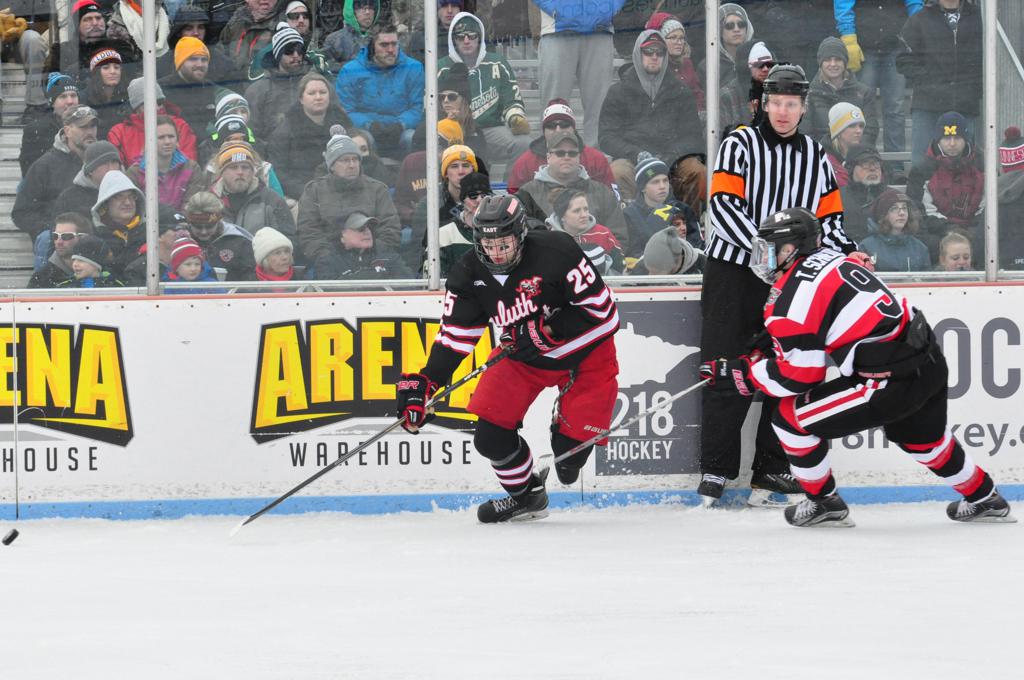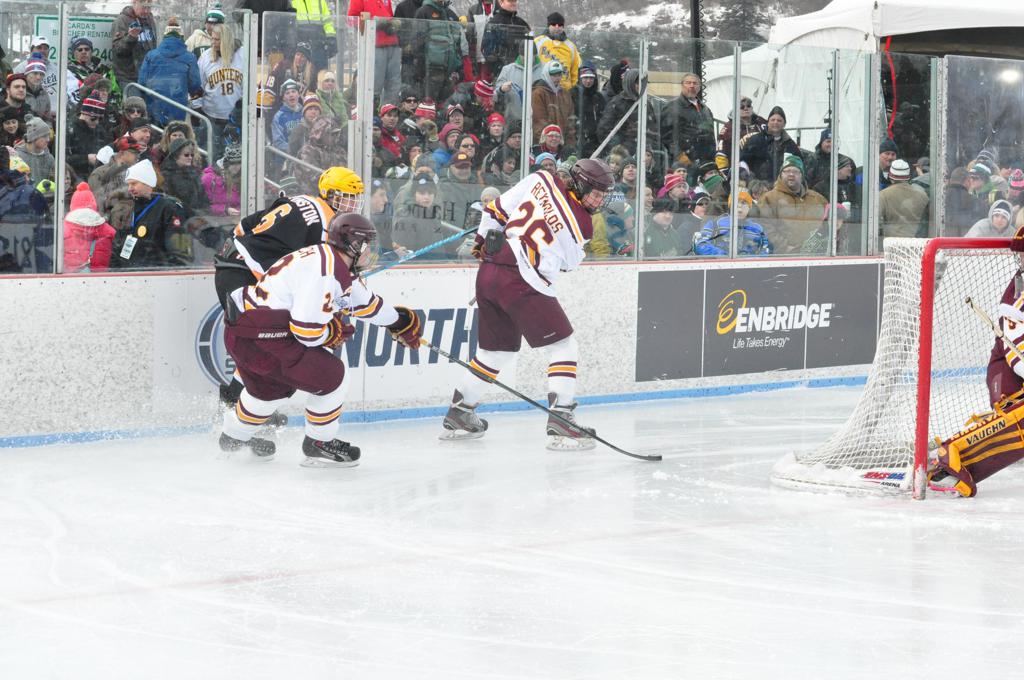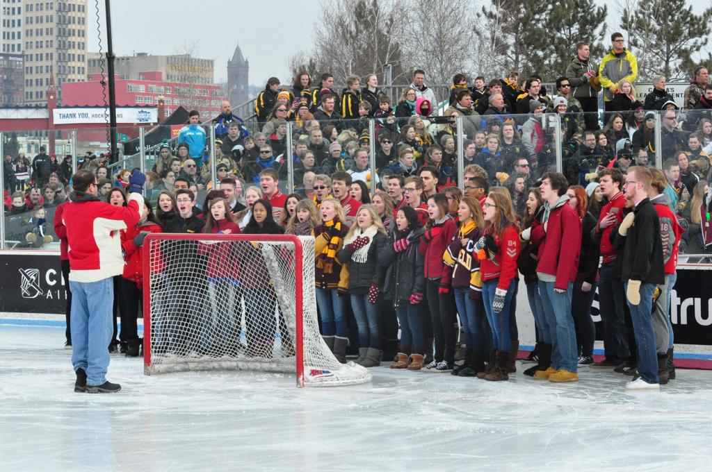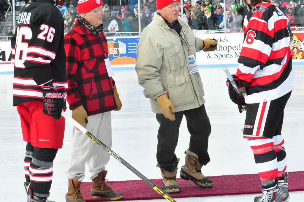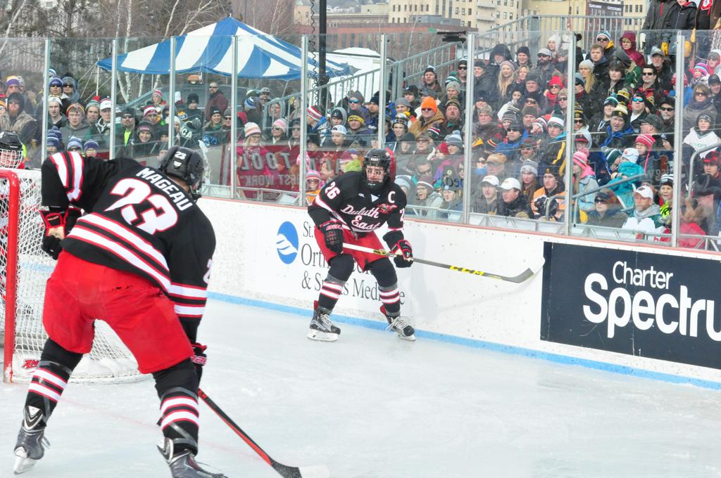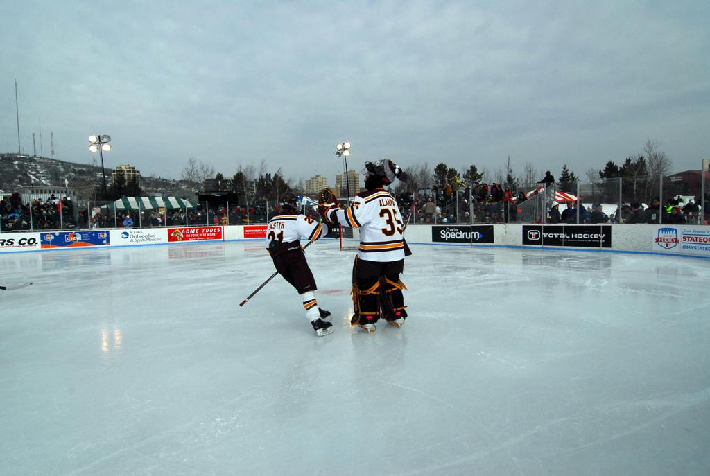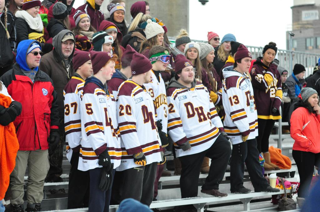 The afternoon marquee game between home-town Greyhounds of Duluth East vs. the visiting Panthers of Lakeville North began with Duluth hockey legends Jerry & Bob Fryberger dropping the ceremonial puck-drop. The game was quite the hard fought close game, between two Class AA powerful schools - both in striking red and black uniforms against the white ice - made for great images on the sunny day. Visiting Lakeville edged East by a close 3-2 regulation win. One thing that was quite odd and rather upsetting about HDM was the long LOUD hovering helicopter with camera man shooting footage through an open side door over the rink and crowd, it was so nousy on-site, spectators and players alike on the ice had a hard time hearing the referee whistles (fans on TV also had a hard time hearing the broadcast as the chopper blades were resonating through the microphones as well). Another quite upsetting thing, that led to collegiate changes going forward was - Duluth UMD Bulldogs Hockey team had a slated HOME game that afternoon - which Amsoil Arena was literally within eye site, and a few paces away by foot of the Duluth Bayfront Park, but were not apart of HDM. Fans at this time on social media started to gripe that this wasn't a Hockey Day Minnesota for all teams across the State - but was merely a Gophers Hockey Day, as the University of Minnesota had participated in every HDM to date. Things were about to change going forward in future years, to showcase ALL of the states Collegiate programs.