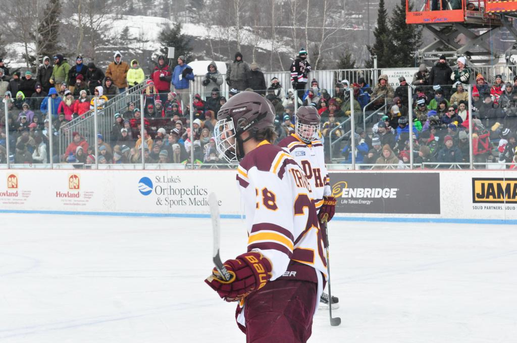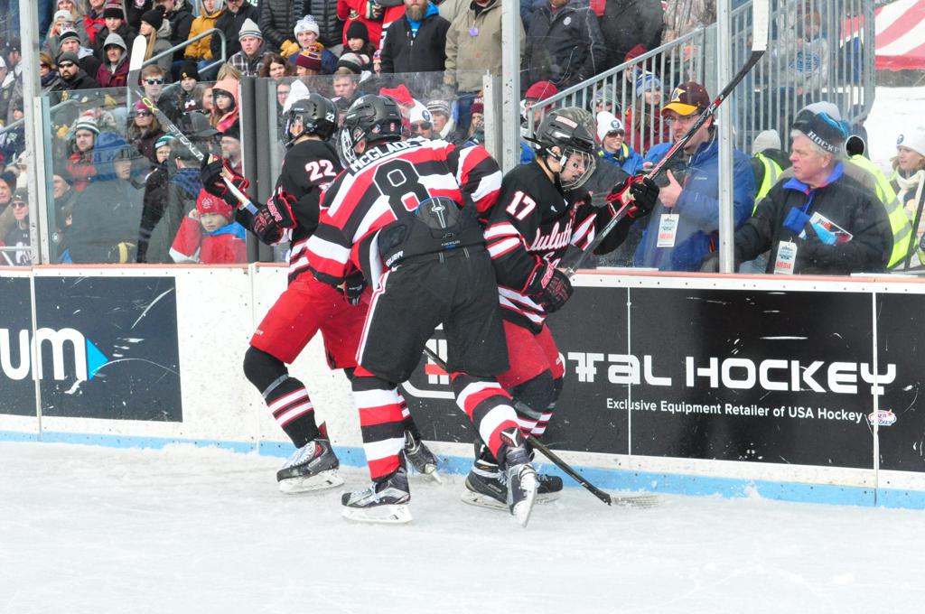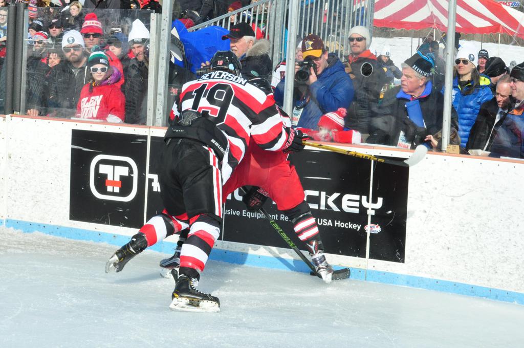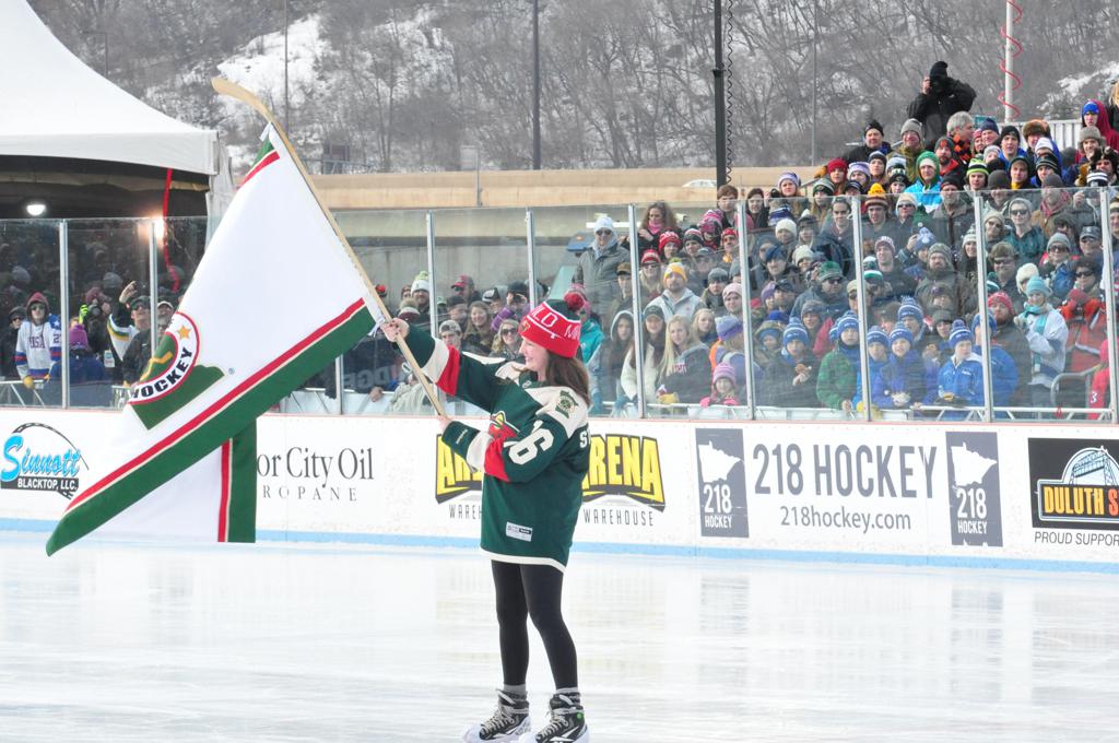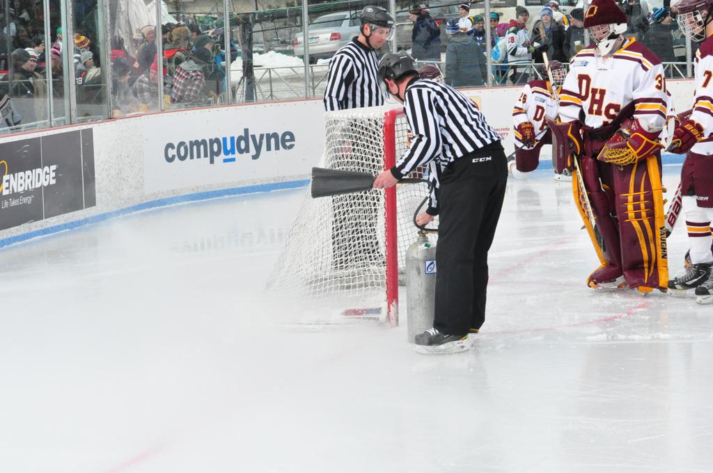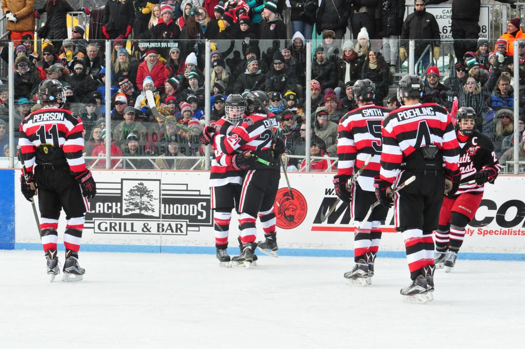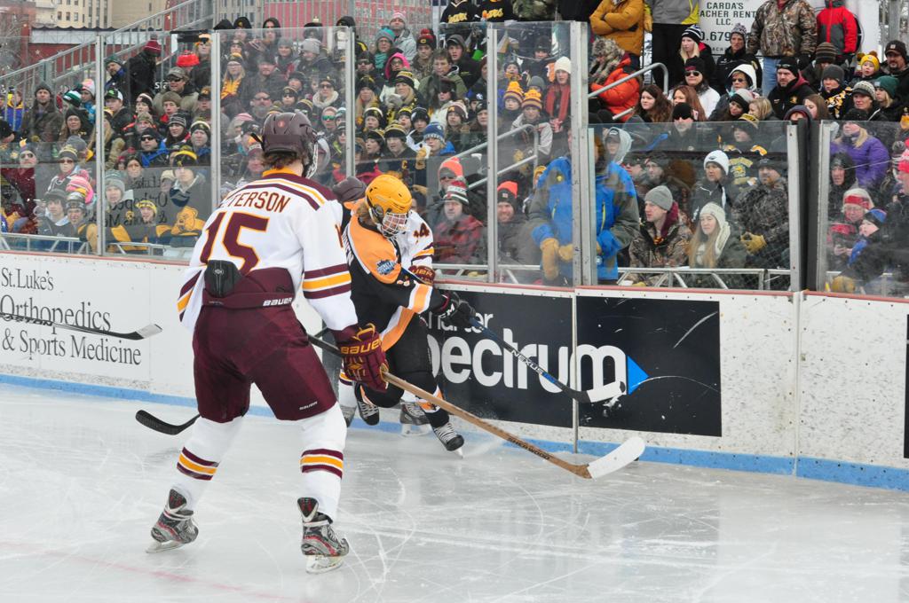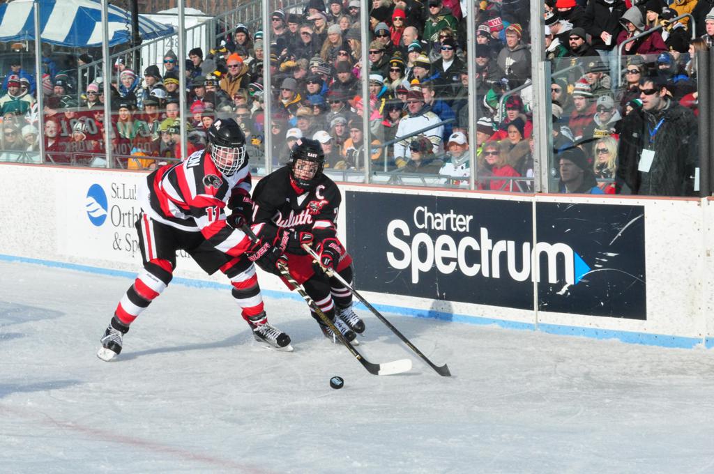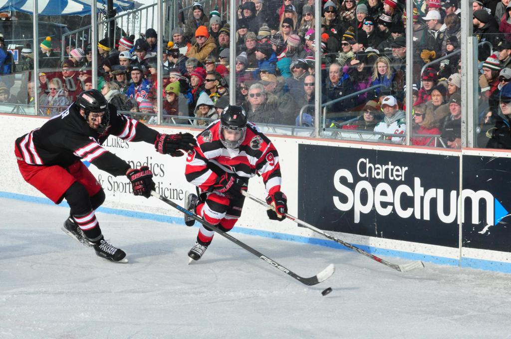 The afternoon marquee game between home-town Greyhounds of Duluth East vs. the visiting Panthers of Lakeville North began with Duluth hockey legends Jerry & Bob Fryberger dropping the ceremonial puck-drop. The game was quite the hard fought close game, between two Class AA powerful schools - both in striking red and black uniforms against the white ice - made for great images on the sunny day. Visiting Lakeville edged East by a close 3-2 regulation win. One thing that was quite odd and rather upsetting about HDM was the long LOUD hovering helicopter with camera man shooting footage through an open side door over the rink and crowd, it was so nousy on-site, spectators and players alike on the ice had a hard time hearing the referee whistles (fans on TV also had a hard time hearing the broadcast as the chopper blades were resonating through the microphones as well). Another quite upsetting thing, that led to collegiate changes going forward was - Duluth UMD Bulldogs Hockey team had a slated HOME game that afternoon - which Amsoil Arena was literally within eye site, and a few paces away by foot of the Duluth Bayfront Park, but were not apart of HDM. Fans at this time on social media started to gripe that this wasn't a Hockey Day Minnesota for all teams across the State - but was merely a Gophers Hockey Day, as the University of Minnesota had participated in every HDM to date. Things were about to change going forward in future years, to showcase ALL of the states Collegiate programs.
