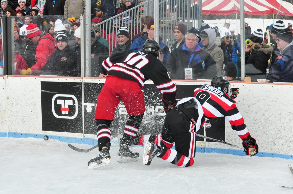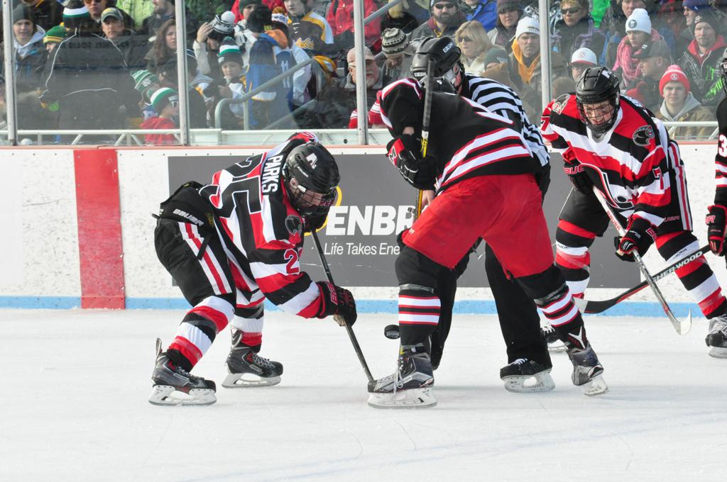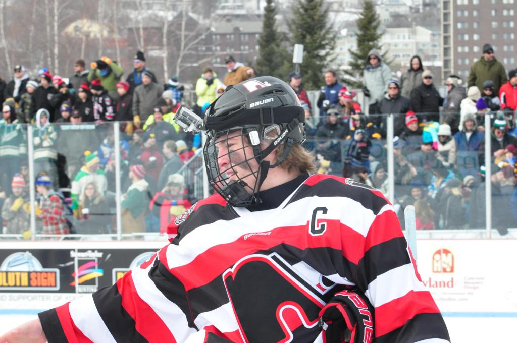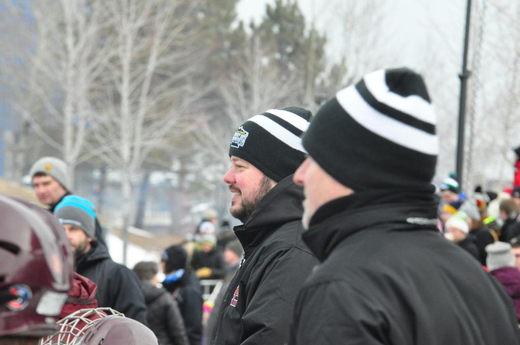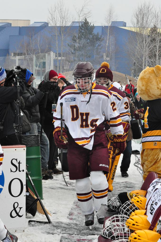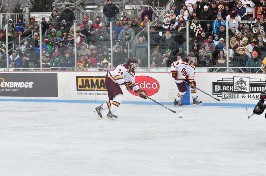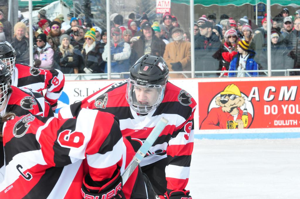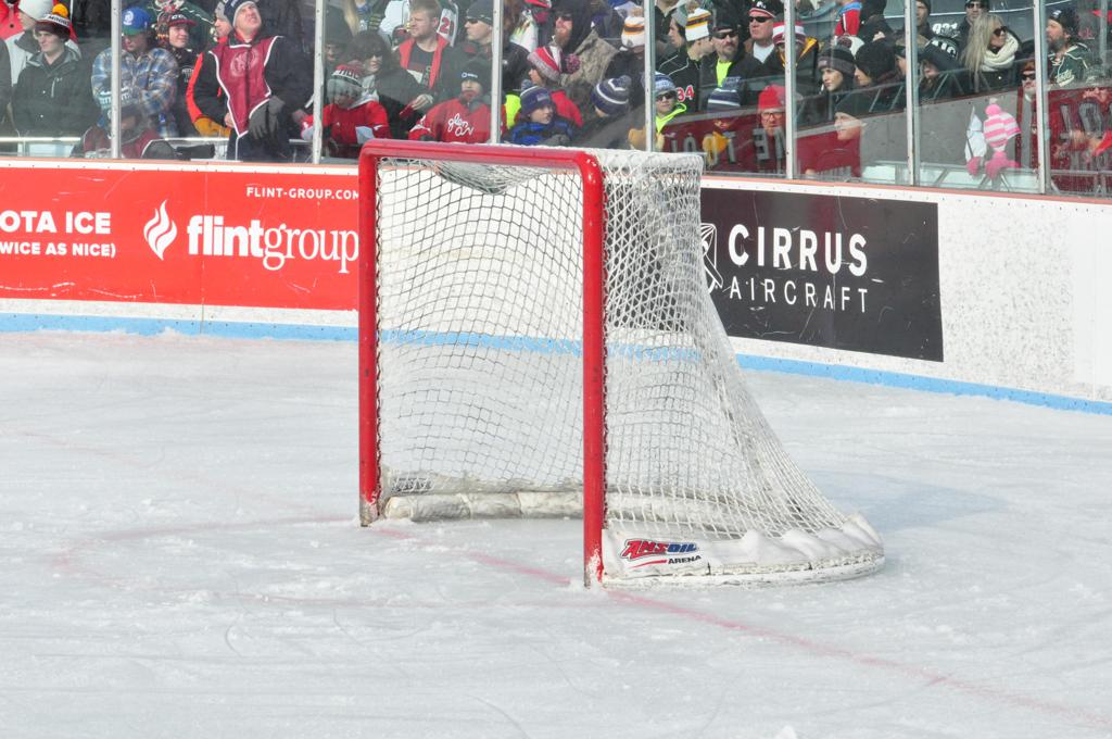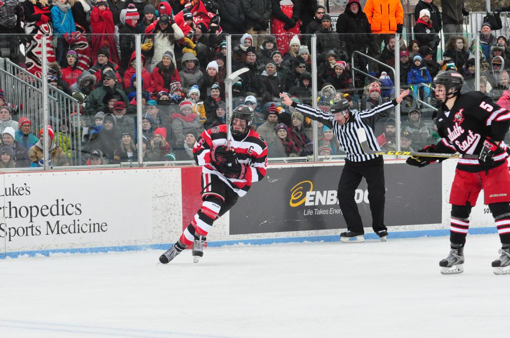 The afternoon marquee game between home-town Greyhounds of Duluth East vs. the visiting Panthers of Lakeville North began with Duluth hockey legends Jerry & Bob Fryberger dropping the ceremonial puck-drop. The game was quite the hard fought close game, between two Class AA powerful schools - both in striking red and black uniforms against the white ice - made for great images on the sunny day. Visiting Lakeville edged East by a close 3-2 regulation win. One thing that was quite odd and rather upsetting about HDM was the long LOUD hovering helicopter with camera man shooting footage through an open side door over the rink and crowd, it was so nousy on-site, spectators and players alike on the ice had a hard time hearing the referee whistles (fans on TV also had a hard time hearing the broadcast as the chopper blades were resonating through the microphones as well). Another quite upsetting thing, that led to collegiate changes going forward was - Duluth UMD Bulldogs Hockey team had a slated HOME game that afternoon - which Amsoil Arena was literally within eye site, and a few paces away by foot of the Duluth Bayfront Park, but were not apart of HDM. Fans at this time on social media started to gripe that this wasn't a Hockey Day Minnesota for all teams across the State - but was merely a Gophers Hockey Day, as the University of Minnesota had participated in every HDM to date. Things were about to change going forward in future years, to showcase ALL of the states Collegiate programs.