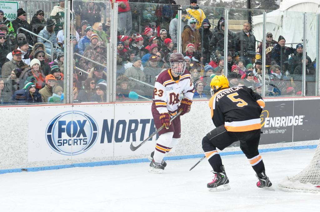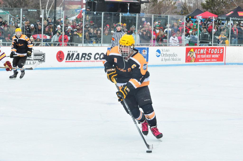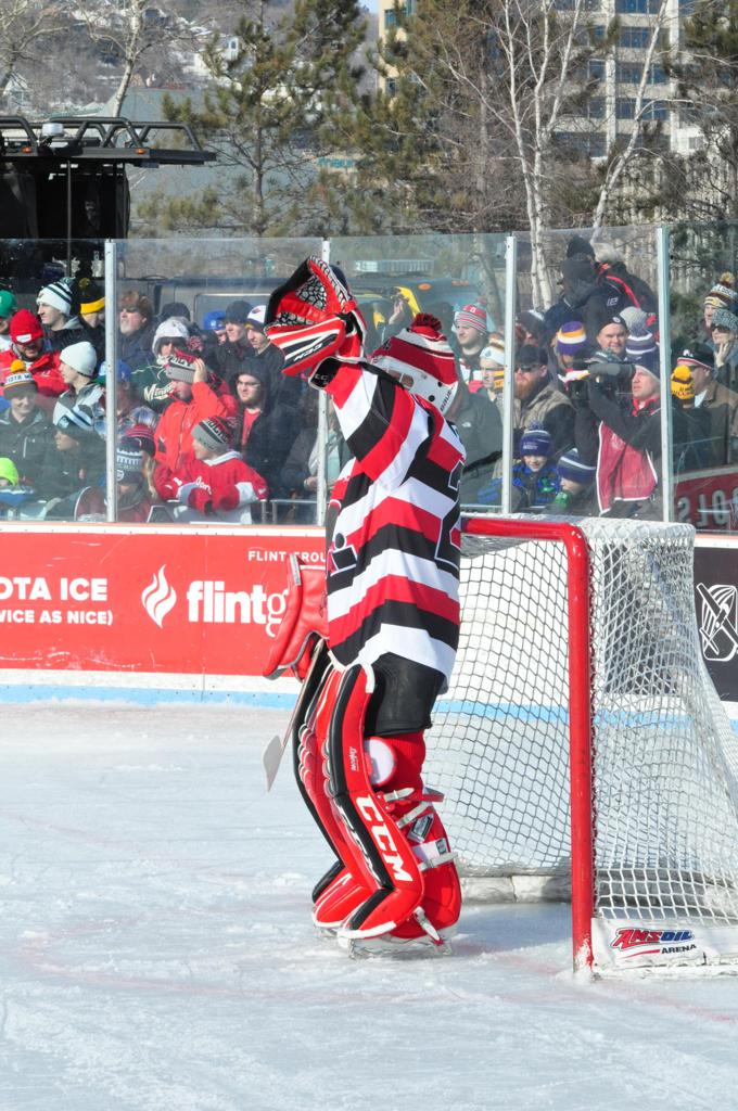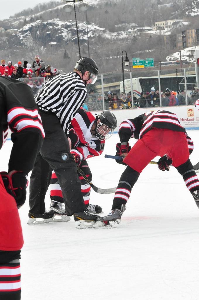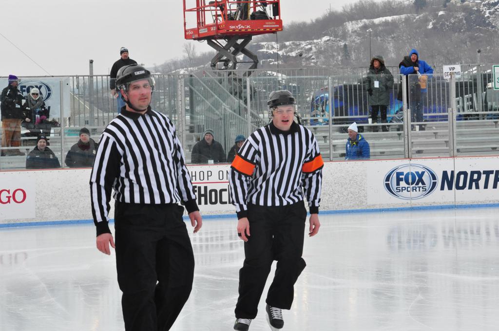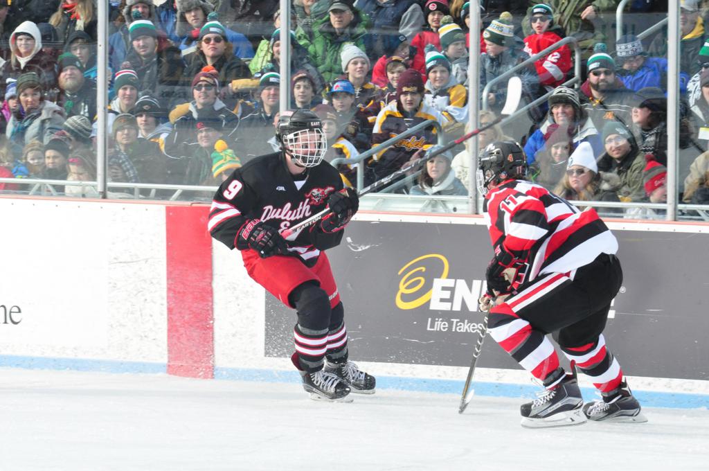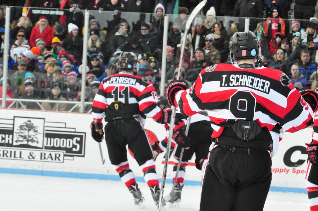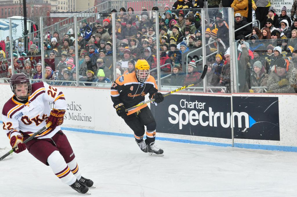 The afternoon marquee game between home-town Greyhounds of Duluth East vs. the visiting Panthers of Lakeville North began with Duluth hockey legends Jerry & Bob Fryberger dropping the ceremonial puck-drop. The game was quite the hard fought close game, between two Class AA powerful schools - both in striking red and black uniforms against the white ice - made for great images on the sunny day. Visiting Lakeville edged East by a close 3-2 regulation win. One thing that was quite odd and rather upsetting about HDM was the long LOUD hovering helicopter with camera man shooting footage through an open side door over the rink and crowd, it was so nousy on-site, spectators and players alike on the ice had a hard time hearing the referee whistles (fans on TV also had a hard time hearing the broadcast as the chopper blades were resonating through the microphones as well). Another quite upsetting thing, that led to collegiate changes going forward was - Duluth UMD Bulldogs Hockey team had a slated HOME game that afternoon - which Amsoil Arena was literally within eye site, and a few paces away by foot of the Duluth Bayfront Park, but were not apart of HDM. Fans at this time on social media started to gripe that this wasn't a Hockey Day Minnesota for all teams across the State - but was merely a Gophers Hockey Day, as the University of Minnesota had participated in every HDM to date. Things were about to change going forward in future years, to showcase ALL of the states Collegiate programs.